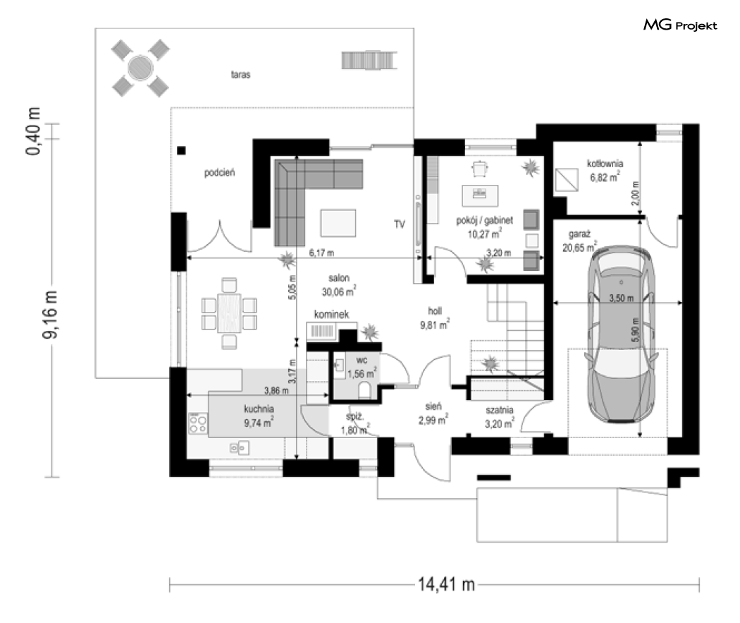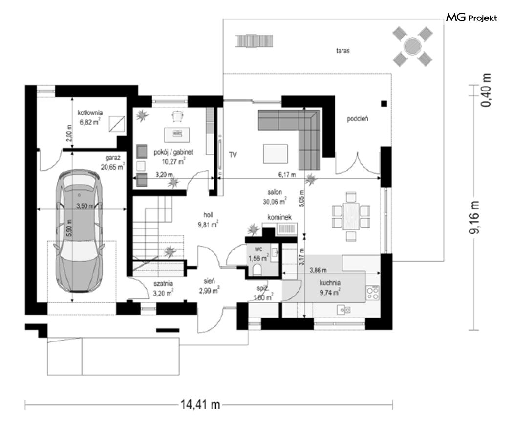 Projekt domu Samba mimo niedużej powierzchni użytkowej 125,67 m2 jest bardzo komfortowym domem dla pełnej rodziny. Atrakcyjny wygląd projektu Samba, funkcjonalne wnętrze, energooszczędne rozwiązania, oraz niski koszt budowy i późniejszej eksploatacji, powinny przekonać niejednego Inwestora do tego projektu domu. Projekt domu Samba można zamówić również w wersji odbicia lustrzanego. Zapraszamy do zapoznania się z całą serią "roztańczonych domów": https://www.mgprojekt.com.pl/makarena, https://www.mgprojekt.com.pl/bolero, https://www.mgprojekt.com.pl/lambada, https://www.mgprojekt.com.pl/party, https://www.mgprojekt.com.pl/party-2, https://www.mgprojekt.com.pl/biba, https://www.mgprojekt.com.pl/tango, https://www.mgprojekt.com.pl/salsa, https://www.mgprojekt.com.pl/rumba, https://www.mgprojekt.com.pl/mambo, https://www.mgprojekt.com.pl/mambo, https://www.mgprojekt.com.pl/fokstrot, https://www.mgprojekt.com.pl/samba.