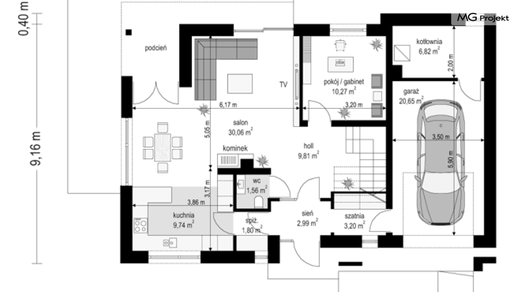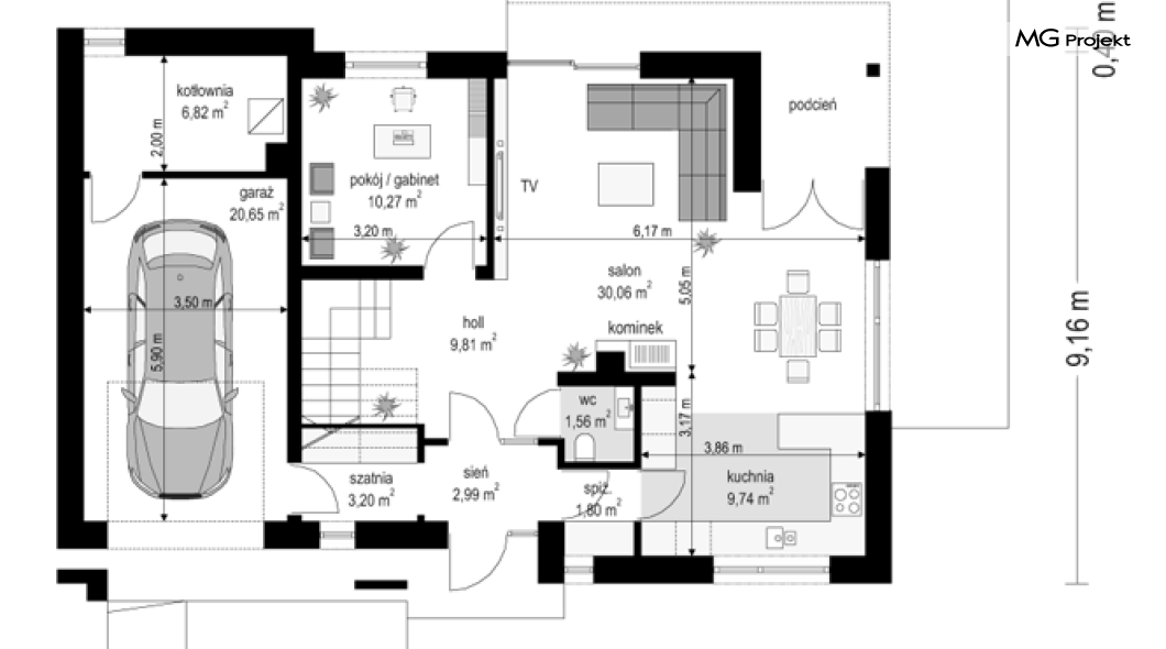 Centralnym miejscem wnętrza projektu Samba jest ściana z kominkiem, wokół którego zaprojektowano pomieszczenia. W salonie mamy też ścianę TV, miejsce na meble wypoczynkowe, jadalnię z wyjściem na taras i ogród, oraz ładną kuchnię oddzieloną półwyspem, połączoną ze spiżarnią projektu Samba. Za garażem projektu Samba umieszczono pomieszczenie kotłowni.