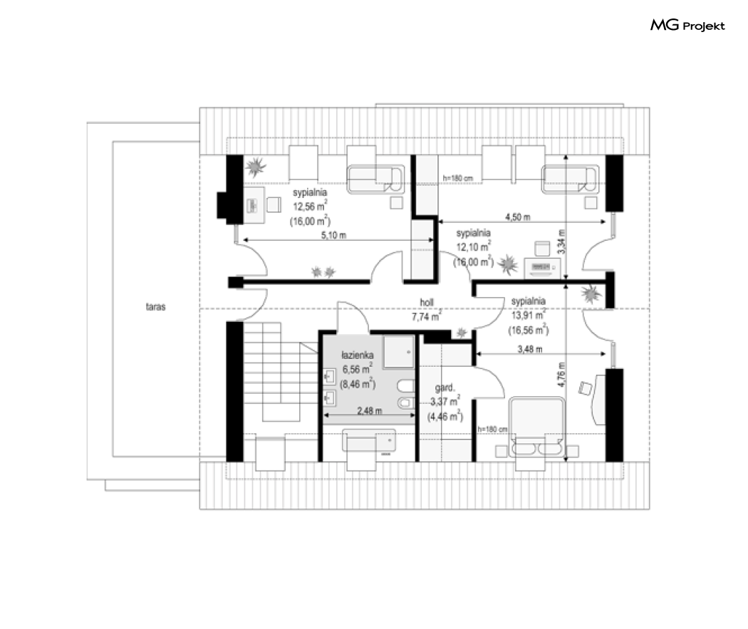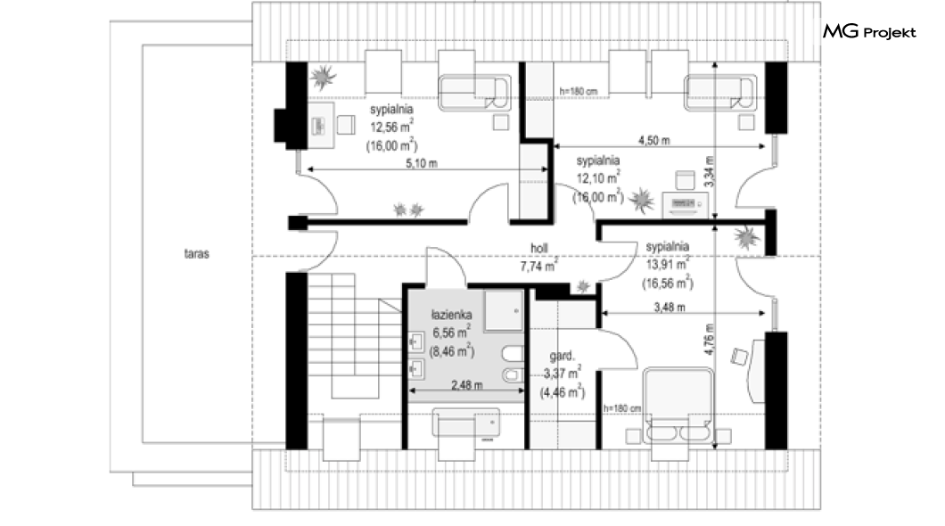 W projekcie domku Samba na poddaszu zaprojektowane zostały trzy sypialnie, oraz ładna łazienka z wanną i prysznicem. Sypialnia rodziców ma własną garderobę - sypialnie dziecięce mają wbudowane szafy.