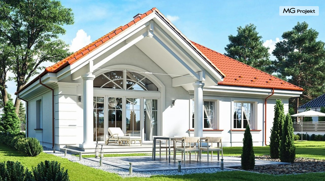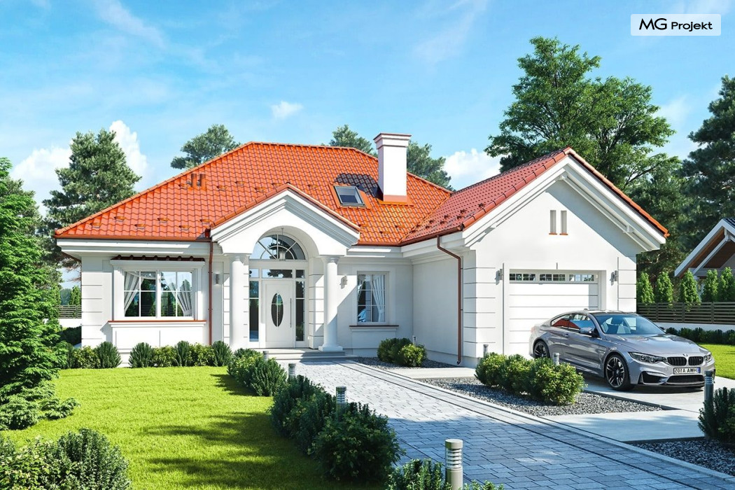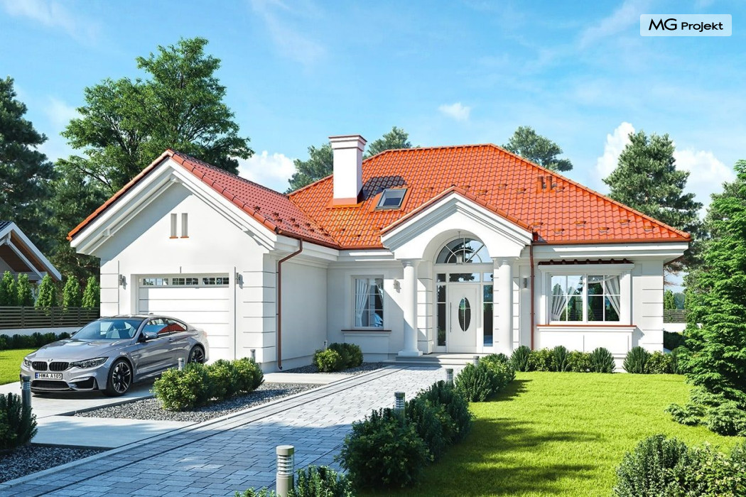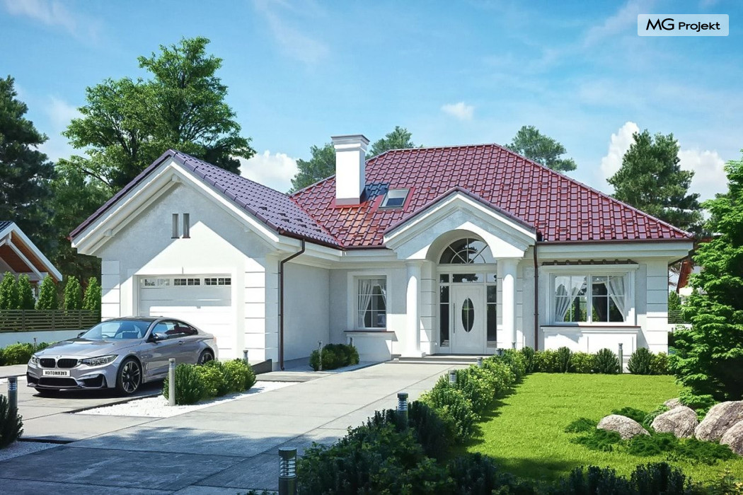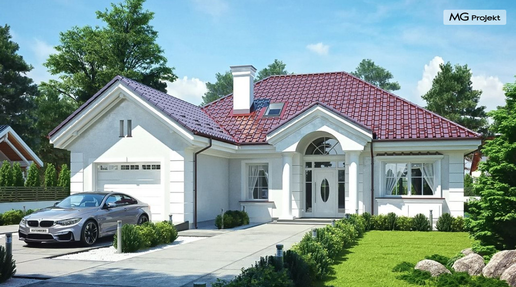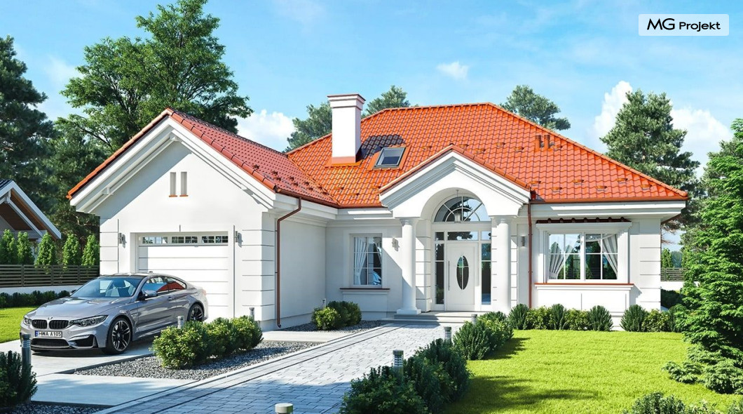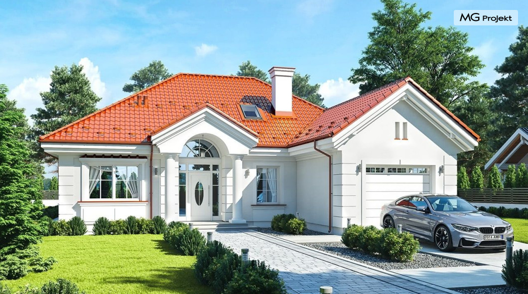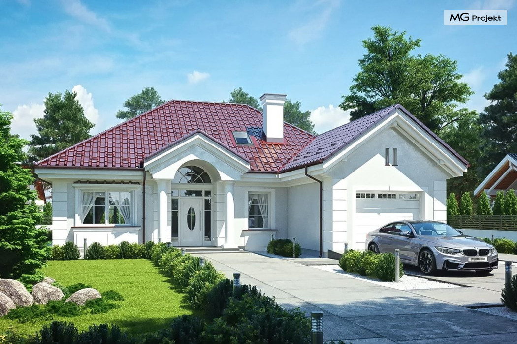 Projekt domu Dom na parkowej 5 jest to kolejny projekt z popularnej serii „Domów na parkowej”, czyli wersja z dachem o większym kącie nachylenia, oraz węższej bryle i pojedynczym garażu. Dom na parkowej 5 jest mniejszy od wersji bazowej i nadaje się na węższą działkę. Dach o kącie 35 stopni z kolei pozwoli sprostać ostrzejszym warunkom zabudowy, a poza tym uzyskujemy nad parterem większe poddasze użytkowe (właściwie strych, który można zaadaptować na poddasze użytkowe jeśli jest taka potrzeba). Architektura domu to nawiązanie do amerykańskich willi z przedmieść, oraz do polskiego dworku, ale w nowocześniejszym ujęciu. Bryła budynku jest prostokątna, przekryta czterospadowym dachem, z dobudowanym wystającym nieco do przodu garażem. W ten sposób przed domem tworzy się większa i bardziej reprezentacyjna część frontowa. Wejście domu zostało podkreślone pięknym frontowym portalem z szerokimi drzwiami z naświetlami po bokach. Od strony ogrodowej mamy z kolei duży zadaszony taras, oraz szerokie przeszklenie łączące salon z tarasem i ogrodem. Wnętrze domu podzielono funkcjonalnie na trzy części: dzienną, nocną i gospodarczo-garażową. Z ładnego przedsionka przechodzimy szerokimi drzwiami na wprost do części dziennej, z salonem, kuchnią i holem. Z części dziennej przechodzimy do sypialni - mamy tutaj trzy sypialnie oraz łazienkę. Sypialnie dzieci mają wbudowane szafy, sypialnia rodziców – garderobę. Z przedsionka możemy też przedostać się do pomieszczenia gospodarczego i garażu. Na strychu mamy miejsce do zaadaptowania na poddasze składające się z dwóch pokoi i łazienki. Projekt domu Dom na parkowej 5 to doskonała propozycja dla osób planujących niewielki dom, ale nie chcących rezygnować z urody, ani godzić się na maksymalne uproszczenie detalu architektonicznego. Projekt domu Dom na parkowej 5 dzięki prostej bryle i konstrukcji będzie niedrogi w realizacji, a dom dzięki zastosowaniu nowoczesnych i energooszczędnych materiałów, oraz instalacji, będzie też tani w późniejszej eksploatacji. Zapraszamy do zapoznania się z pełną ofertą pracowni MG Projekt: projekt domu Dom na parkowej, projekt domu Dom na parkowej 2, projekt domu Dom na parkowej 3, projekt domu Dom na parkowej 4, projekt domu Dom na parkowej 6, projekt domu Dom na parkowej 7 A, projekt domu Dom na parkowej 7 B.