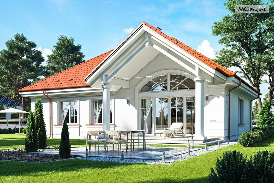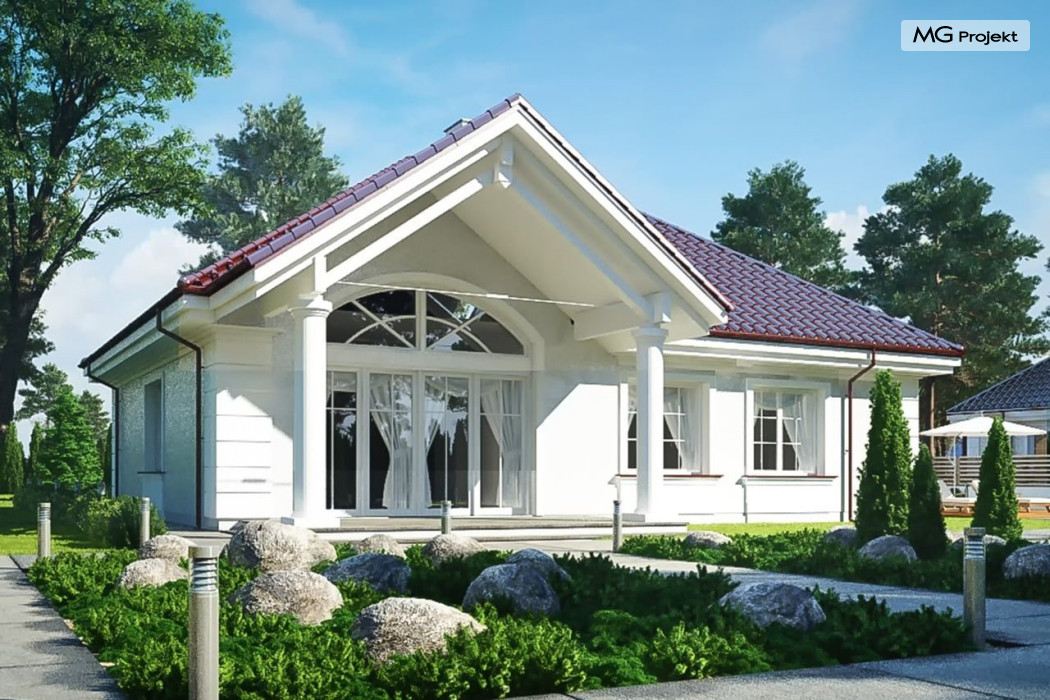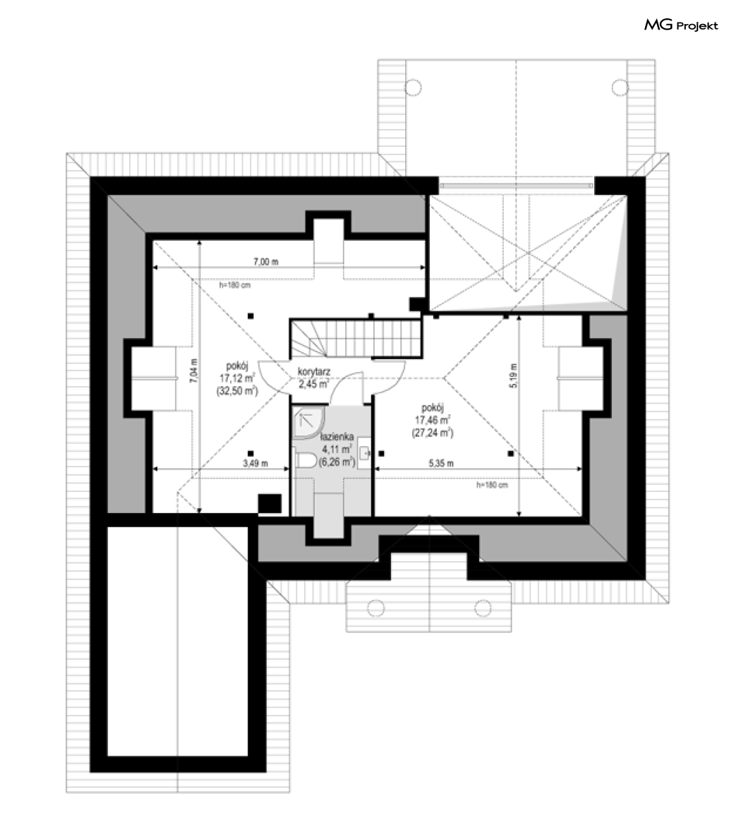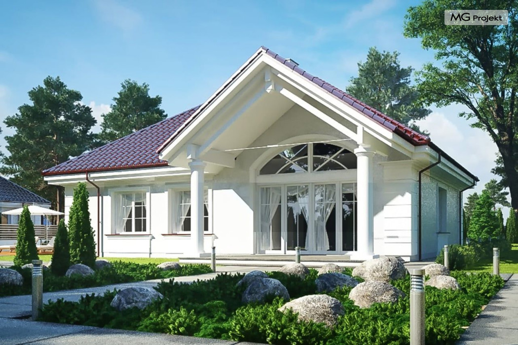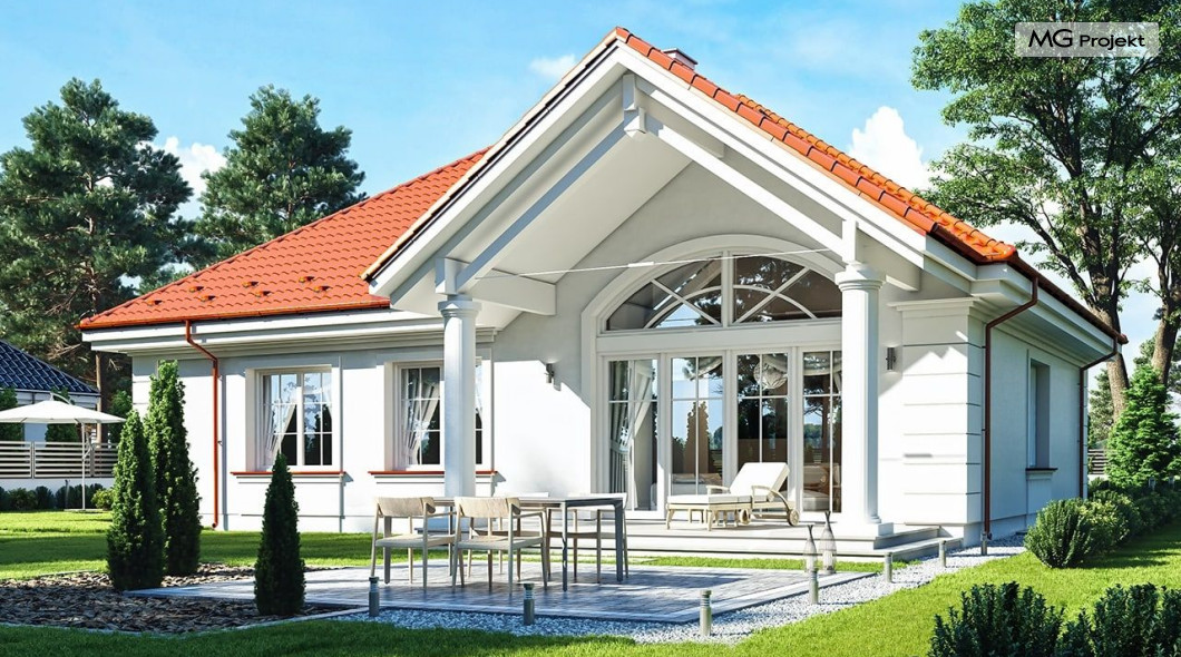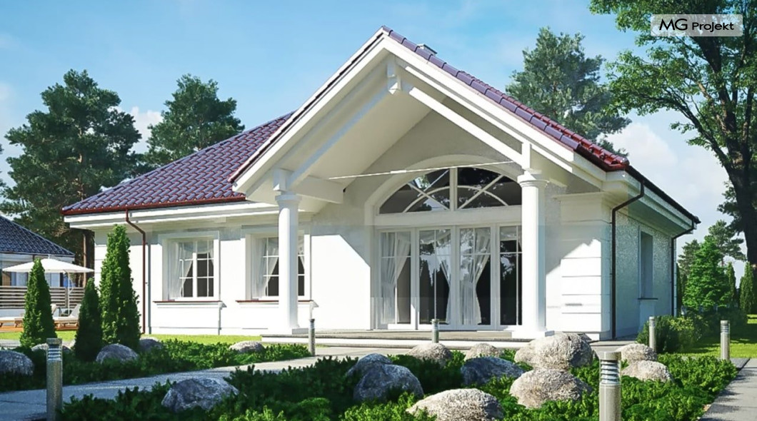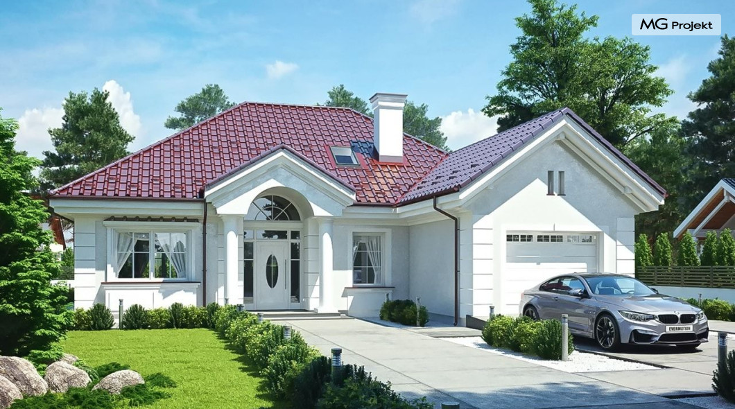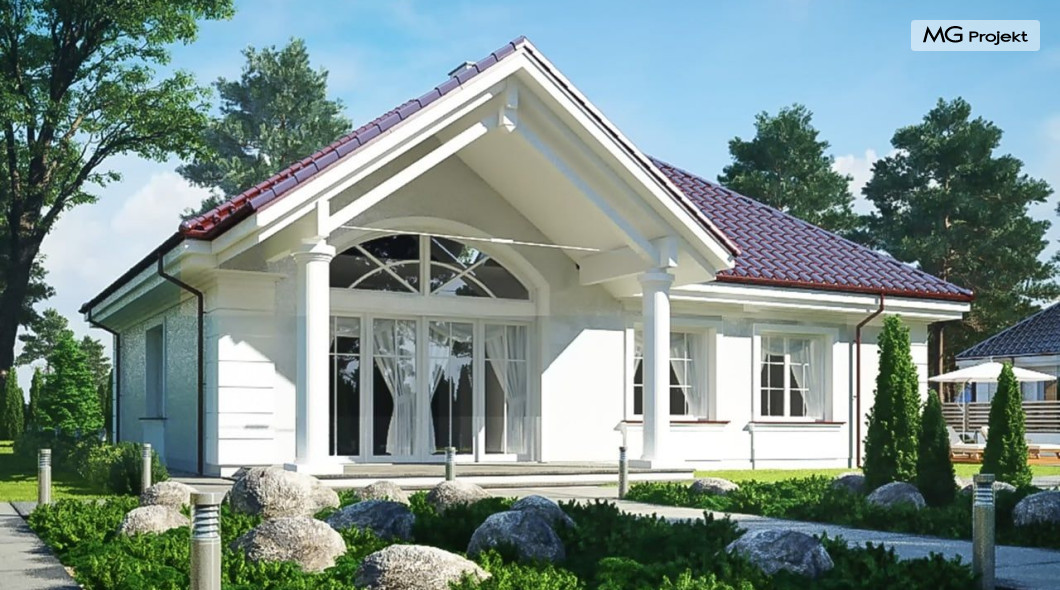 Projekt domu Dom na parkowej 5 jest to kolejny projekt z popularnej serii „Domów na parkowej”, czyli wersja z dachem o większym kącie nachylenia, oraz węższej bryle i pojedynczym garażu. Dom na parkowej 5 jest mniejszy od wersji bazowej i nadaje się na węższą działkę. Dach o kącie 35 stopni z kolei pozwoli sprostać ostrzejszym warunkom zabudowy, a poza tym uzyskujemy nad parterem większe poddasze użytkowe (właściwie strych, który można zaadaptować na poddasze użytkowe jeśli jest taka potrzeba). Architektura domu to nawiązanie do amerykańskich willi z przedmieść, oraz do polskiego dworku, ale w nowocześniejszym ujęciu. Bryła budynku jest prostokątna, przekryta czterospadowym dachem, z dobudowanym wystającym nieco do przodu garażem. W ten sposób przed domem tworzy się większa i bardziej reprezentacyjna część frontowa. Wejście domu zostało podkreślone pięknym frontowym portalem z szerokimi drzwiami z naświetlami po bokach. Od strony ogrodowej mamy z kolei duży zadaszony taras, oraz szerokie przeszklenie łączące salon z tarasem i ogrodem. Wnętrze domu podzielono funkcjonalnie na trzy części: dzienną, nocną i gospodarczo-garażową. Z ładnego przedsionka przechodzimy szerokimi drzwiami na wprost do części dziennej, z salonem, kuchnią i holem. Z części dziennej przechodzimy do sypialni - mamy tutaj trzy sypialnie oraz łazienkę. Sypialnie dzieci mają wbudowane szafy, sypialnia rodziców – garderobę. Z przedsionka możemy też przedostać się do pomieszczenia gospodarczego i garażu. Na strychu mamy miejsce do zaadaptowania na poddasze składające się z dwóch pokoi i łazienki. Projekt domu Dom na parkowej 5 to doskonała propozycja dla osób planujących niewielki dom, ale nie chcących rezygnować z urody, ani godzić się na maksymalne uproszczenie detalu architektonicznego. Projekt domu Dom na parkowej 5 dzięki prostej bryle i konstrukcji będzie niedrogi w realizacji, a dom dzięki zastosowaniu nowoczesnych i energooszczędnych materiałów, oraz instalacji, będzie też tani w późniejszej eksploatacji. Zapraszamy do zapoznania się z pełną ofertą pracowni MG Projekt: projekt domu Dom na parkowej, projekt domu Dom na parkowej 2, projekt domu Dom na parkowej 3, projekt domu Dom na parkowej 4, projekt domu Dom na parkowej 6, projekt domu Dom na parkowej 7 A, projekt domu Dom na parkowej 7 B.