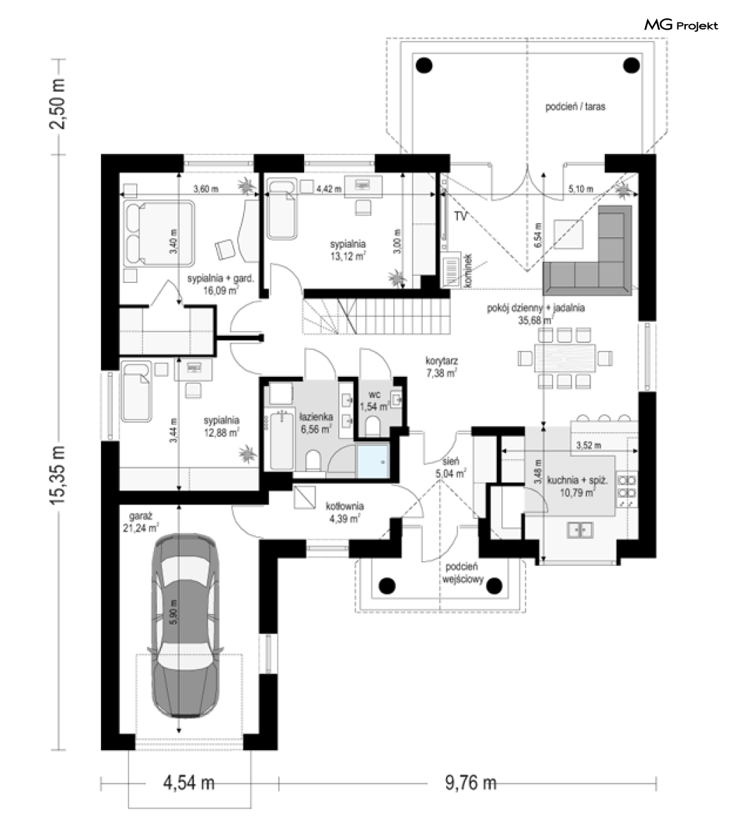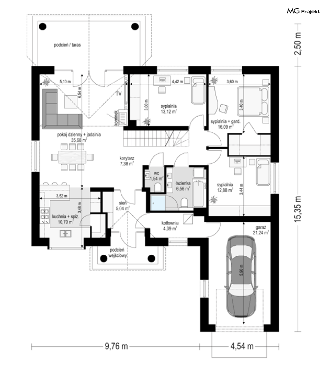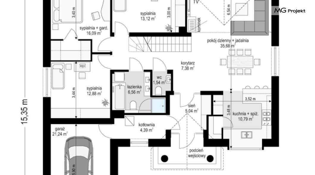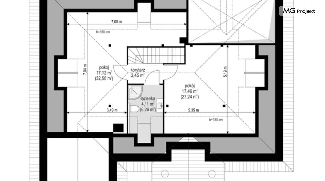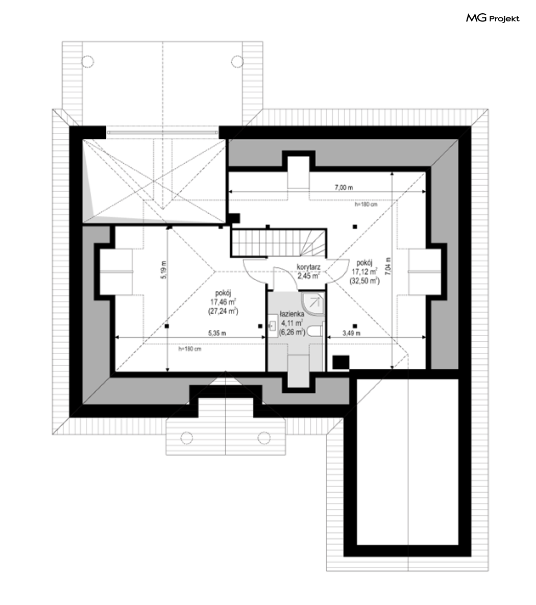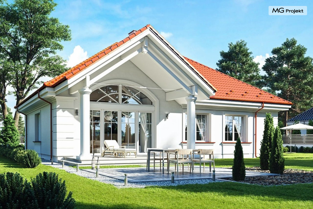 Projekt domu Dom na parkowej 5 jest to kolejny projekt z popularnej serii „Domów na parkowej”, czyli wersja z dachem o większym kącie nachylenia, oraz węższej bryle i pojedynczym garażu. Dom na parkowej 5 jest mniejszy od wersji bazowej i nadaje się na węższą działkę. Dach o kącie 35 stopni z kolei pozwoli sprostać ostrzejszym warunkom zabudowy, a poza tym uzyskujemy nad parterem większe poddasze użytkowe (właściwie strych, który można zaadaptować na poddasze użytkowe jeśli jest taka potrzeba). Architektura domu to nawiązanie do amerykańskich willi z przedmieść, oraz do polskiego dworku, ale w nowocześniejszym ujęciu. Bryła budynku jest prostokątna, przekryta czterospadowym dachem, z dobudowanym wystającym nieco do przodu garażem. W ten sposób przed domem tworzy się większa i bardziej reprezentacyjna część frontowa. Wejście domu zostało podkreślone pięknym frontowym portalem z szerokimi drzwiami z naświetlami po bokach. Od strony ogrodowej mamy z kolei duży zadaszony taras, oraz szerokie przeszklenie łączące salon z tarasem i ogrodem. Wnętrze domu podzielono funkcjonalnie na trzy części: dzienną, nocną i gospodarczo-garażową. Z ładnego przedsionka przechodzimy szerokimi drzwiami na wprost do części dziennej, z salonem, kuchnią i holem. Z części dziennej przechodzimy do sypialni - mamy tutaj trzy sypialnie oraz łazienkę. Sypialnie dzieci mają wbudowane szafy, sypialnia rodziców – garderobę. Z przedsionka możemy też przedostać się do pomieszczenia gospodarczego i garażu. Na strychu mamy miejsce do zaadaptowania na poddasze składające się z dwóch pokoi i łazienki. Projekt domu Dom na parkowej 5 to doskonała propozycja dla osób planujących niewielki dom, ale nie chcących rezygnować z urody, ani godzić się na maksymalne uproszczenie detalu architektonicznego. Projekt domu Dom na parkowej 5 dzięki prostej bryle i konstrukcji będzie niedrogi w realizacji, a dom dzięki zastosowaniu nowoczesnych i energooszczędnych materiałów, oraz instalacji, będzie też tani w późniejszej eksploatacji. Zapraszamy do zapoznania się z pełną ofertą pracowni MG Projekt: projekt domu Dom na parkowej, projekt domu Dom na parkowej 2, projekt domu Dom na parkowej 3, projekt domu Dom na parkowej 4, projekt domu Dom na parkowej 6, projekt domu Dom na parkowej 7 A, projekt domu Dom na parkowej 7 B.