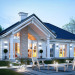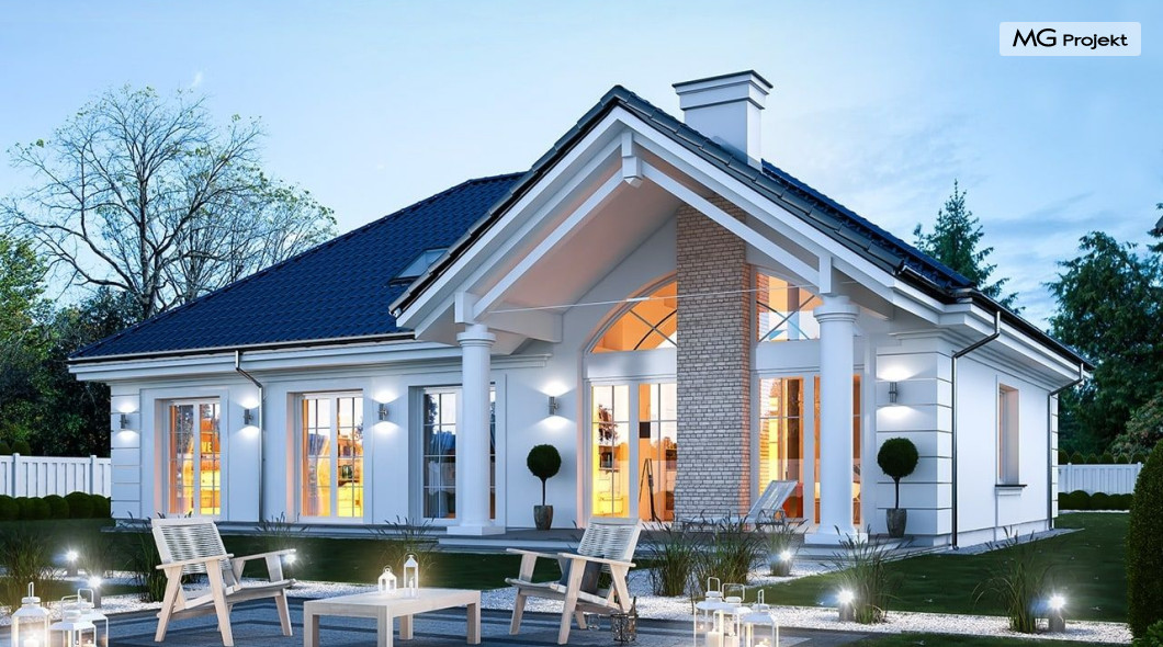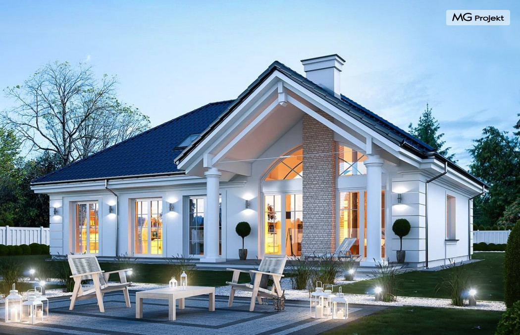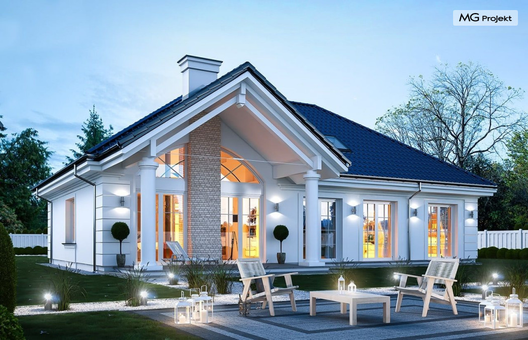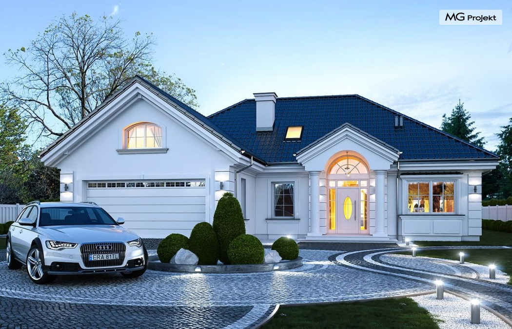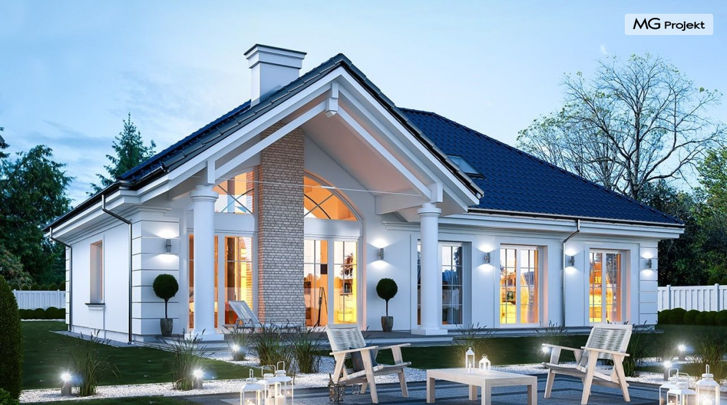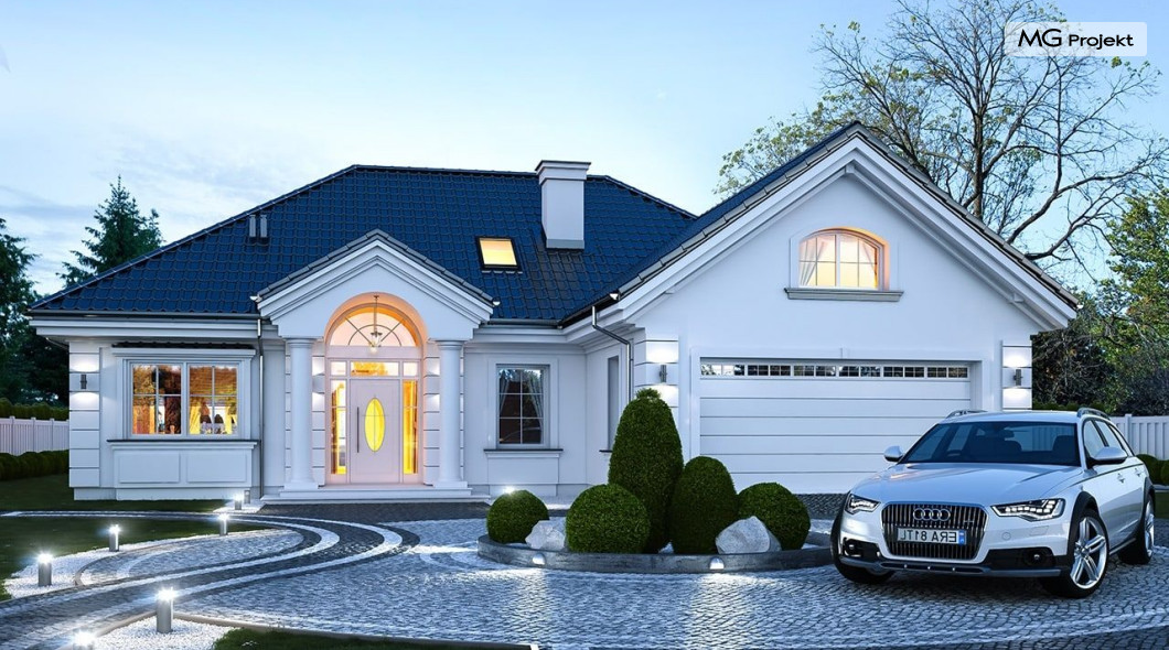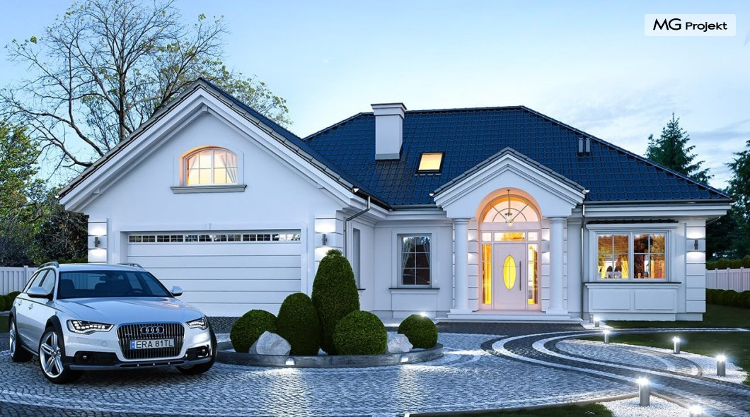 Projekt domu Dom na parkowej 6 to kolejny projekt z kolekcji Domów na Parkowej - tym razem większą wersję tego projektu: Dom na Parkowej 6. Dom jednorodzinny dla 3-6 osobowej rodziny, parterowy, ze strychem, który można zaadaptować łatwo i wykorzystać na poddasze użytkowe. Budynek ma prostokątną bryłę, przykrytą cztero spadowym dachem. Od strony elewacji frontowej dobudowany jest do niej garaż dwustanowiskowy. Reprezentacyjny front domu, przywołujący na myśl amerykańskie rezydencje z bogatych przedmieści, ozdobiony jest pięknym, wspartym na kolumnach zadaszeniem nad drzwiami wejściowymi. Jest to centralny element elewacji frontowej skupiający całą uwagę. Podobnie od strony ogrodu: głównym elementem ozdabiającym elewację jest piękne zadaszenie nad tarasem, oraz duże przeszklenia salonu. Architektura domu nasycona klasycznymi detalami, acz stonowana, tworzy elegancki dom o ponadczasowym wyglądzie.