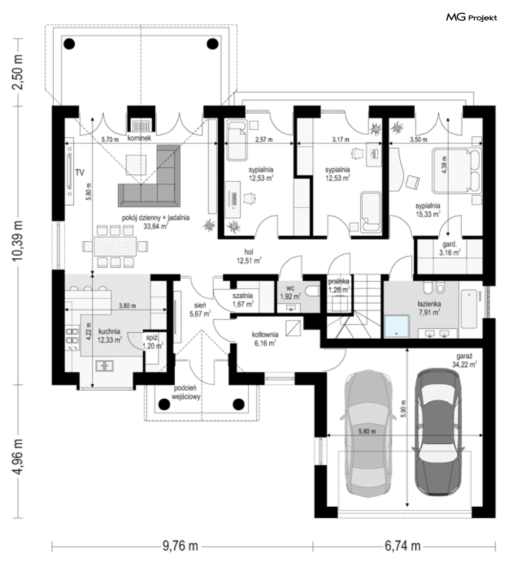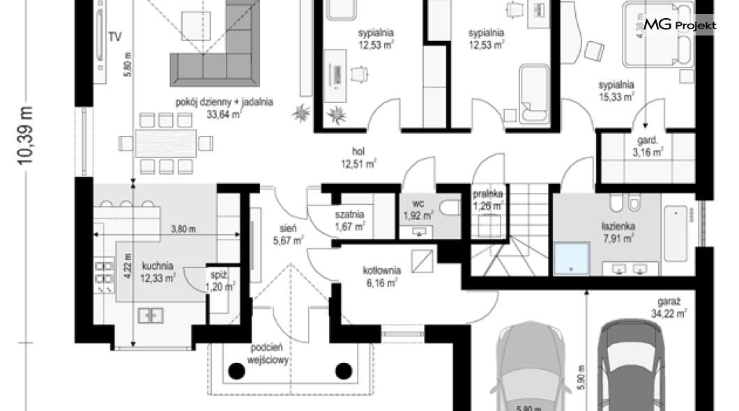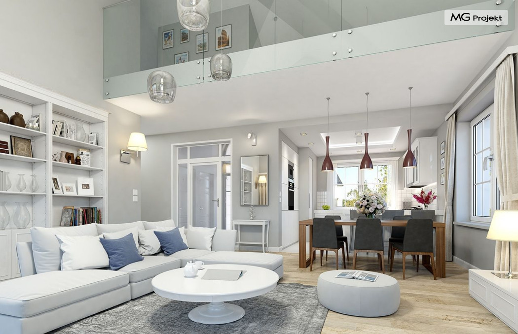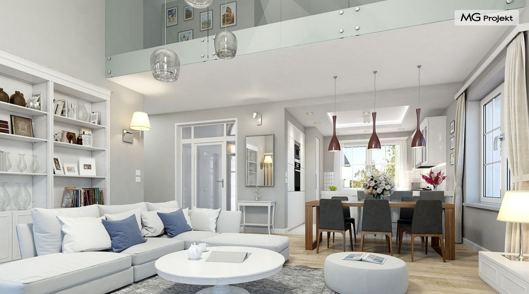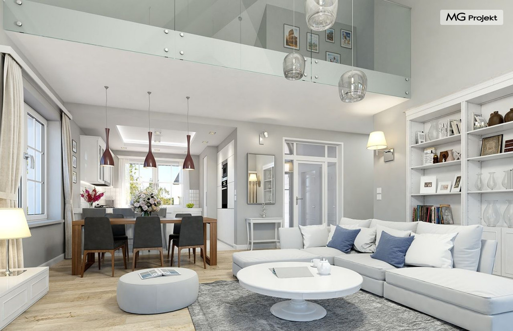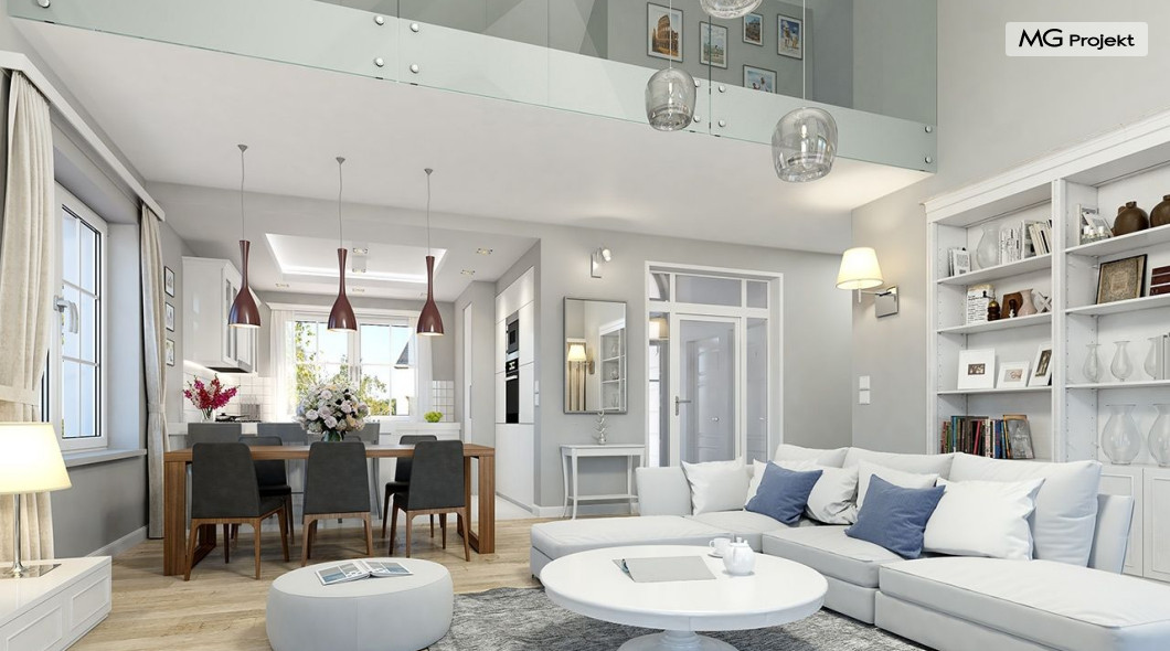 Wnętrze: całość programu użytkowego Domu na Parkowej 6 znajduje się na parterze. Strych może być zagospodarowany jako dodatkowa użytkowa przestrzeń, lub może być pozostawiony jako strych. Jeśli jest wykorzystany jako poddasze użytkowe, wówczas znajdują się tam dwa pokoje, łazienka i antresola nad pustką nad salonem. Do domu wschodzimy przez wygodną sień z szatnią, o podwyższonym suficie, z której dostajemy się do holu, lub w bok - do kotłowni i garażu. Na wprost wejścia wchodzimy do otwartej przestrzeni dziennej połączonego salonu i jadalni, oraz wydzielonej pięknej kuchni ze spiżarnią. Nad salonem otwarto sufit powiększając dodatkowo przestrzeń dzienną. Otwarcie jest połączone z antresolą na poddaszu. W części nocnej domu mamy trzy sypialnie, wc i łazienkę. Sypialnie dzieci mają wbudowane szafy. Sypialnia rodziców-garderobę. Wszystkie sypialnie mają piękne okna z widokiem na ogród. Nad garażem znajduje się dodatkowy strych gospodarczy. Dom na Parkowej 6 jest prosty w budowie i energooszczędny. To doskonała propozycja dla osób nie planujących wydawać bardzo dużej kwoty na budowę domu, lub nie posiadających dużej działki, a jednocześnie nie chcących rezygnować z marzeń. Zapraszamy do zapoznania się z pełną ofertą pracowni MG Projekt: projekt domu Dom na parkowej, projekt domu Dom na parkowej 2, projekt domu Dom na parkowej 3, projekt domu Dom na parkowej 4, projekt domu Dom na parkowej 5, projekt domu Dom na parkowej 7 A, projekt domu Dom na parkowej 7 B.