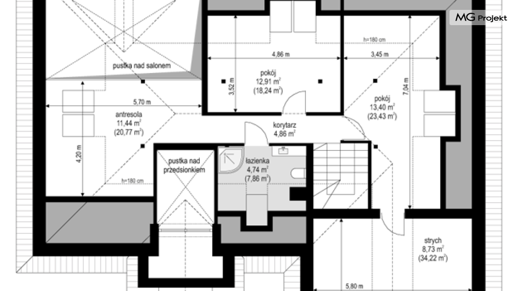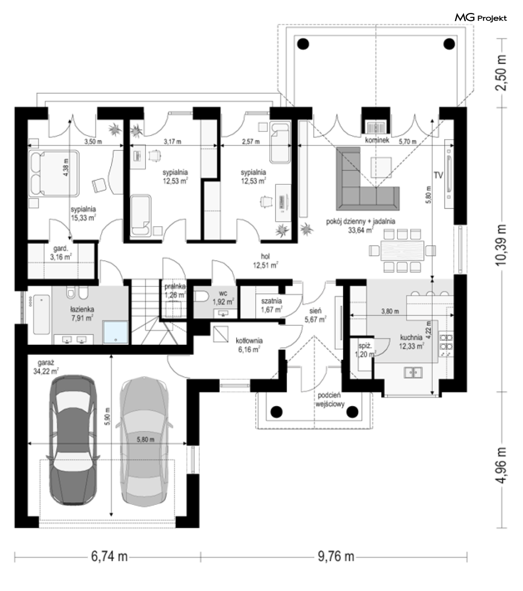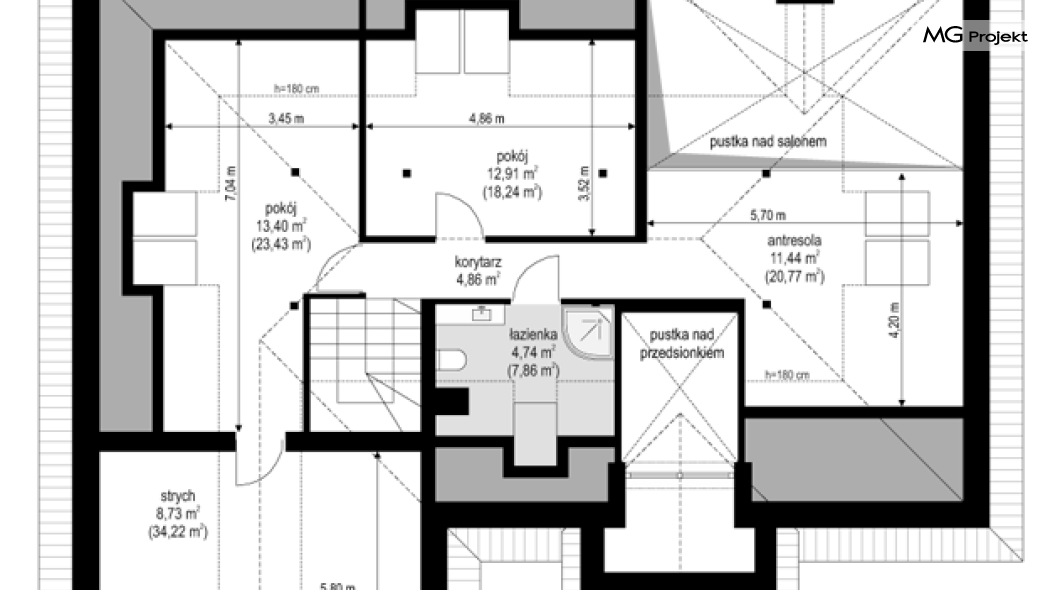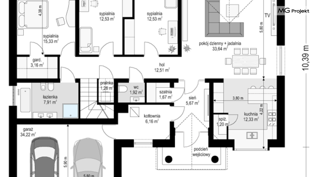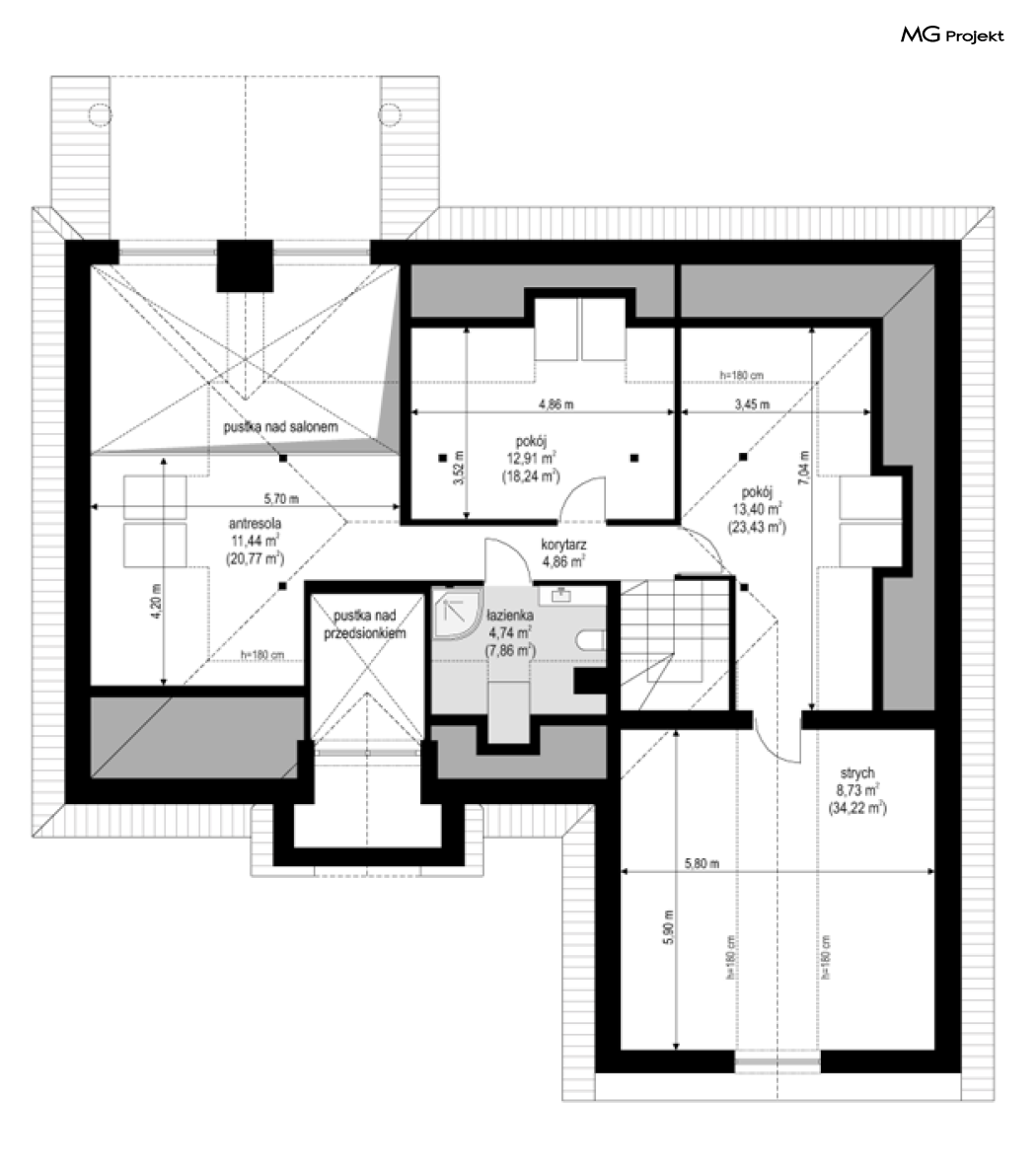 Wnętrze: całość programu użytkowego Domu na Parkowej 6 znajduje się na parterze. Strych może być zagospodarowany jako dodatkowa użytkowa przestrzeń, lub może być pozostawiony jako strych. Jeśli jest wykorzystany jako poddasze użytkowe, wówczas znajdują się tam dwa pokoje, łazienka i antresola nad pustką nad salonem. Do domu wschodzimy przez wygodną sień z szatnią, o podwyższonym suficie, z której dostajemy się do holu, lub w bok - do kotłowni i garażu. Na wprost wejścia wchodzimy do otwartej przestrzeni dziennej połączonego salonu i jadalni, oraz wydzielonej pięknej kuchni ze spiżarnią. Nad salonem otwarto sufit powiększając dodatkowo przestrzeń dzienną. Otwarcie jest połączone z antresolą na poddaszu. W części nocnej domu mamy trzy sypialnie, wc i łazienkę. Sypialnie dzieci mają wbudowane szafy. Sypialnia rodziców-garderobę. Wszystkie sypialnie mają piękne okna z widokiem na ogród. Nad garażem znajduje się dodatkowy strych gospodarczy. Dom na Parkowej 6 jest prosty w budowie i energooszczędny. To doskonała propozycja dla osób nie planujących wydawać bardzo dużej kwoty na budowę domu, lub nie posiadających dużej działki, a jednocześnie nie chcących rezygnować z marzeń. Zapraszamy do zapoznania się z pełną ofertą pracowni MG Projekt: projekt domu Dom na parkowej, projekt domu Dom na parkowej 2, projekt domu Dom na parkowej 3, projekt domu Dom na parkowej 4, projekt domu Dom na parkowej 5, projekt domu Dom na parkowej 7 A, projekt domu Dom na parkowej 7 B.