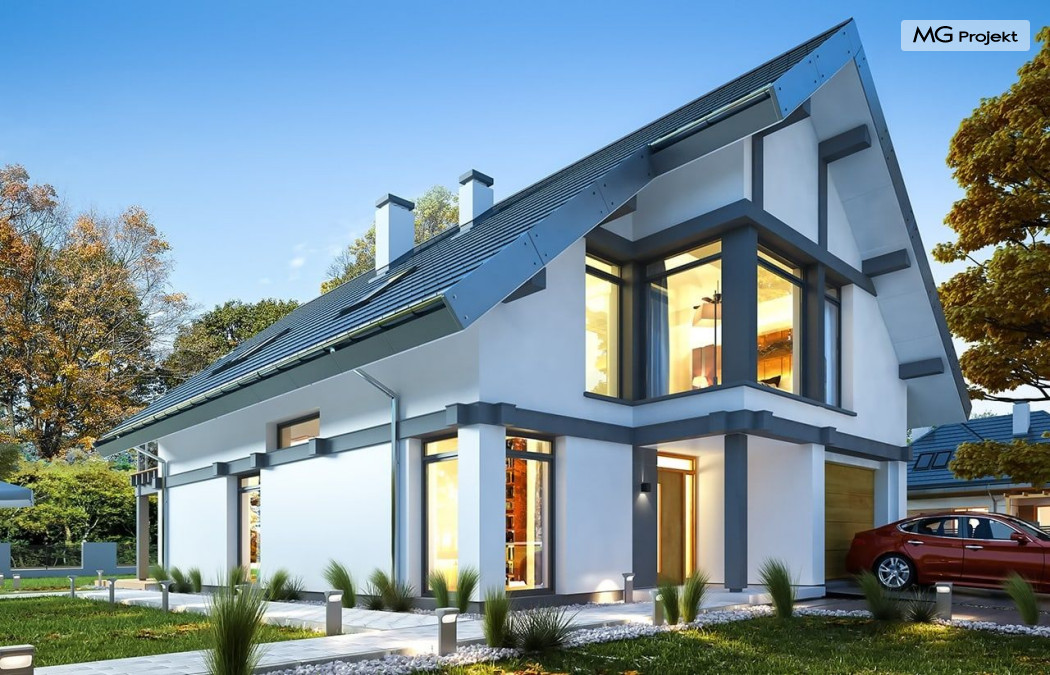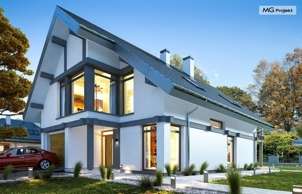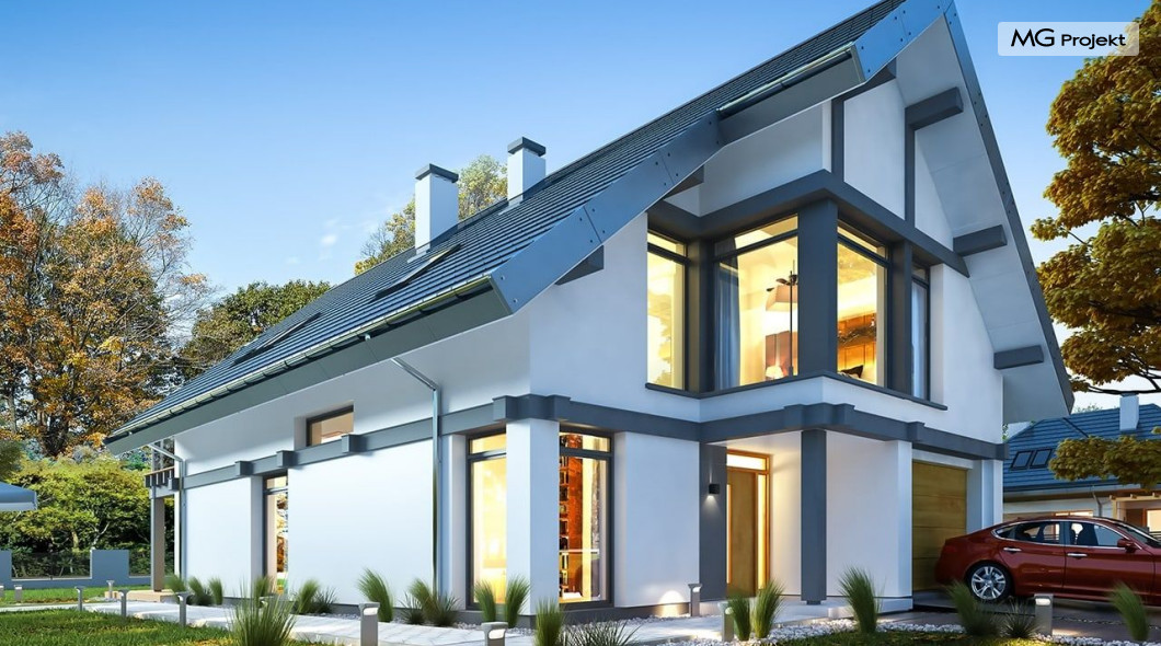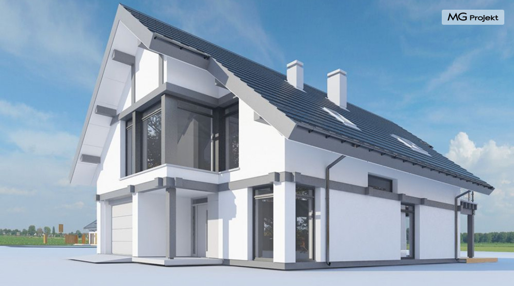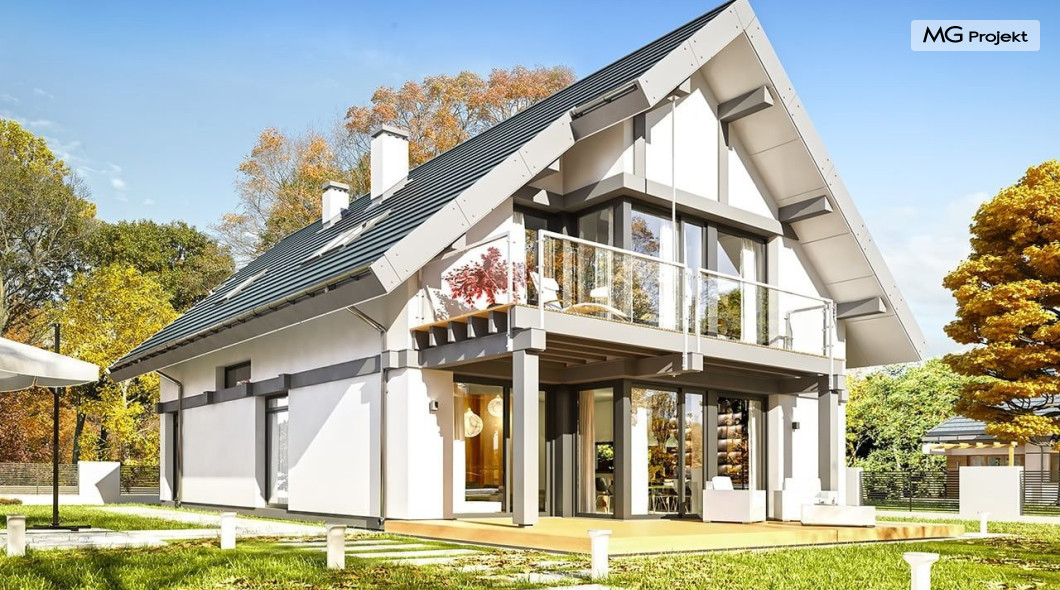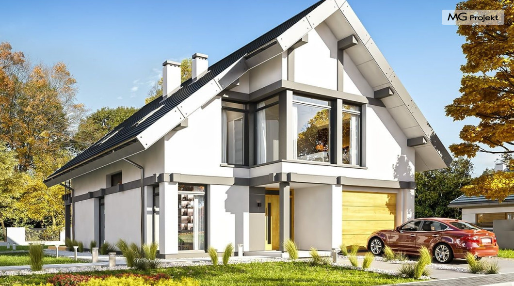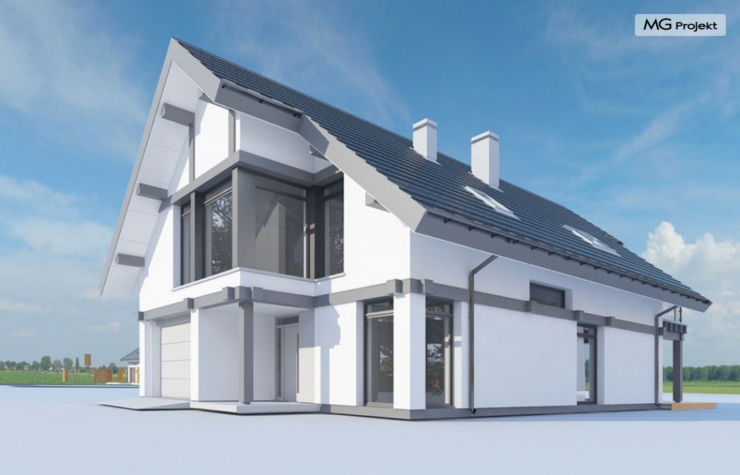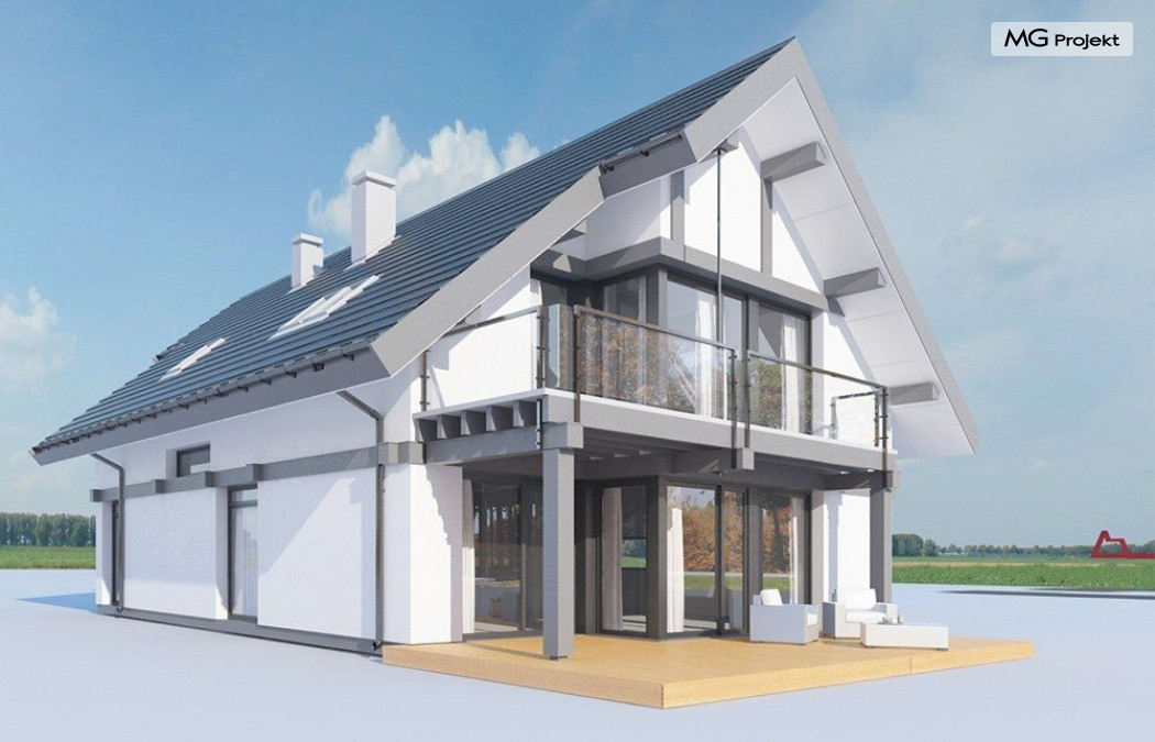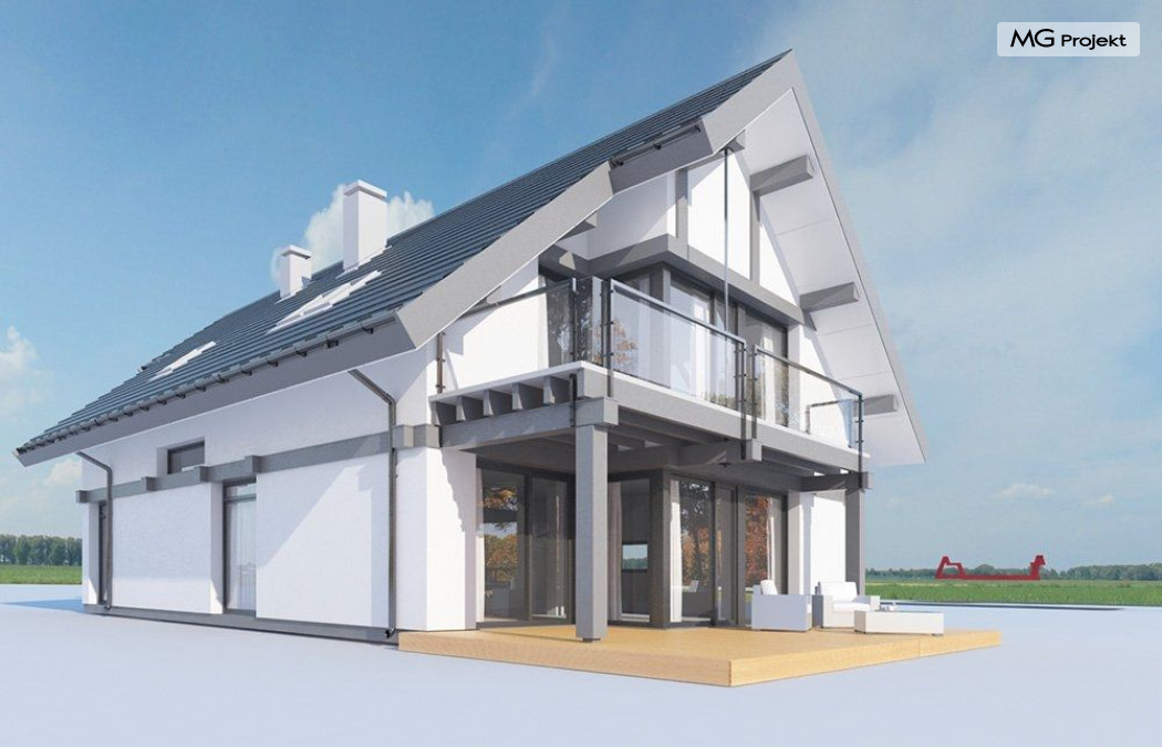 Projekt domu Otwarty 5 jest naszą kolejną propozycją z kolekcji domów „Otwartych”, czyli próba zmieszczenia budynku o podobnej do „Otwartych” funkcji i stylu architektonicznym na nieco węższej działce. Dom jest typowym dachowcem, budynkiem parterowym z użytkowym poddaszem, przykrytym symetrycznym dwuspadowym dachem, z charakterystycznym przesunięciem ściany szczytowej zarówno frontowej, jak i tylnej - ogrodowej, dzięki czemu uzyskujemy bardzo ładne oryginalne wejście do domu, oraz wygodny zadaszony taras i balkon. Architekturę domu definiują piękne przeszklenia, łączące wnętrze z otaczającym ogrodem. Jak sama nazwa projektu wskazuje: dom otwiera się na otoczenie, a granica między ogrodem a wnętrzem zostaje zatarta. Elementem nadającym rytm strukturze budynku - zarówno elewacjom, jak i rzutom kondygnacji, jest siatka słupów i belek, które pełnią funkcję porządkującą, ozdabiającą, oraz konstrukcyjną. Budynek wygląda w ten sposób oryginalnie i niepowtarzalnie. Wnętrze domu podzielono na część dzienną na parterze i sypialnie na poddaszu. Do wnętrza wchodzimy ładnym przedsionkiem, połączonym z garażem i kotłownią, wprost do holu otwierającego się na salon i od razu na ogród - dzięki pięknym przeszkleniom ogrodowej elewacji. Wspólne wnętrze salonu, jadalni , holu i kuchni ma ponad 70 m2 - jest to piękna otwarta przestrzeń. Na parterze przewidziano także dodatkowy pokój - gabinet, oraz wc. W domu Otwarty 5 na poddaszu mamy trzy bardzo ładne sypialnie: apartament rodziców, z własną garderobą i łazienką, oraz dwie sypialnie dzieci z łazienką dostępną z holu. Na poddaszu mieści się dodatkowo pralnia. W domu mamy duże, ładne, nie udawane pokoje - wnętrze jest bardzo komfortowe jak na tą powierzchnię użytkową. Konstrukcja budynku jest dość prosta i łatwa w budowie. Otwarty 5 to budynek energooszczędny, dzięki zastosowaniu nowoczesnym materiałów i instalacji. Projekt domu Otwarty 5 będzie niedrogi i bezproblemowy w późniejszej eksploatacji. Pracownia posiada odbicie lustrzane projektu oraz kilka wersji: bazową (projekt domu Otwarty), pomniejszonej z garażem dwustanowiskowym (projekt domu Otwarty 2), pomniejszonej z garażem jednostanowiskowym (projekt domu Otwarty 3), ze zmienionym układem pomieszczeń (projekt domu Otwarty 4). Zapraszamy!