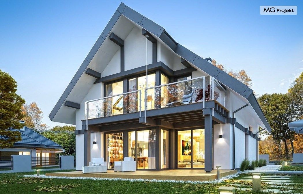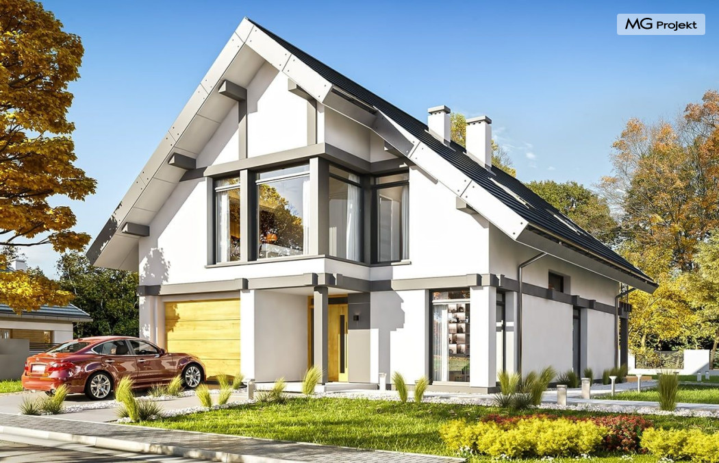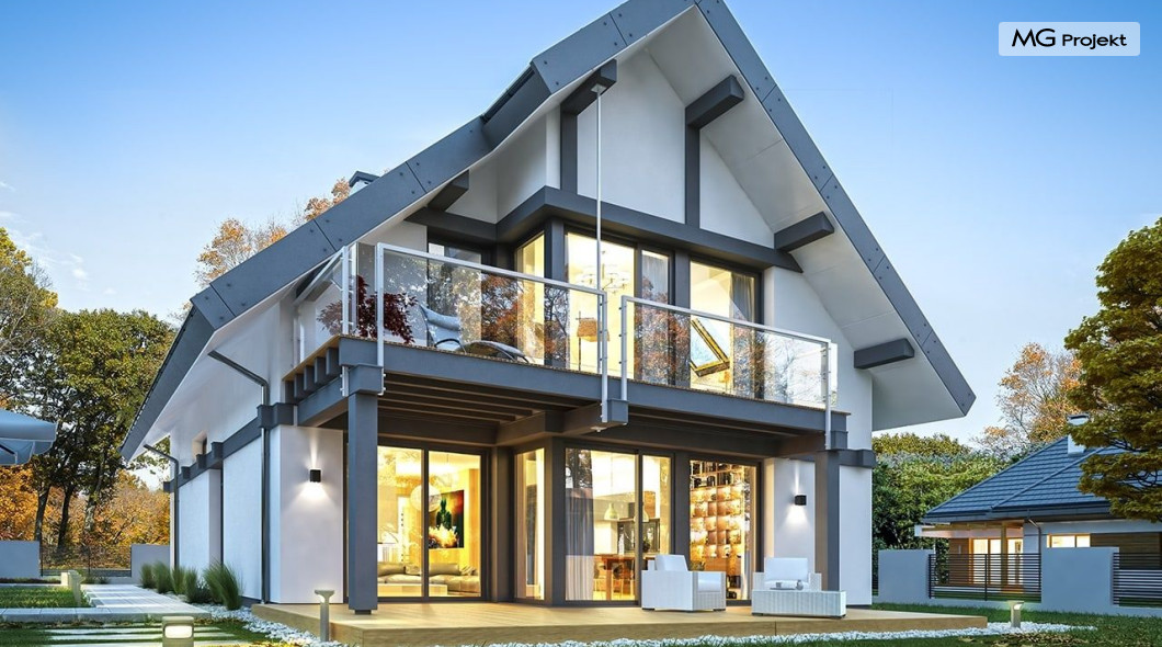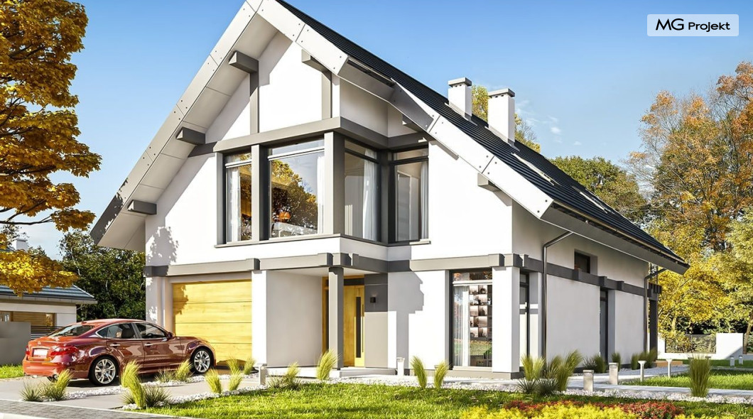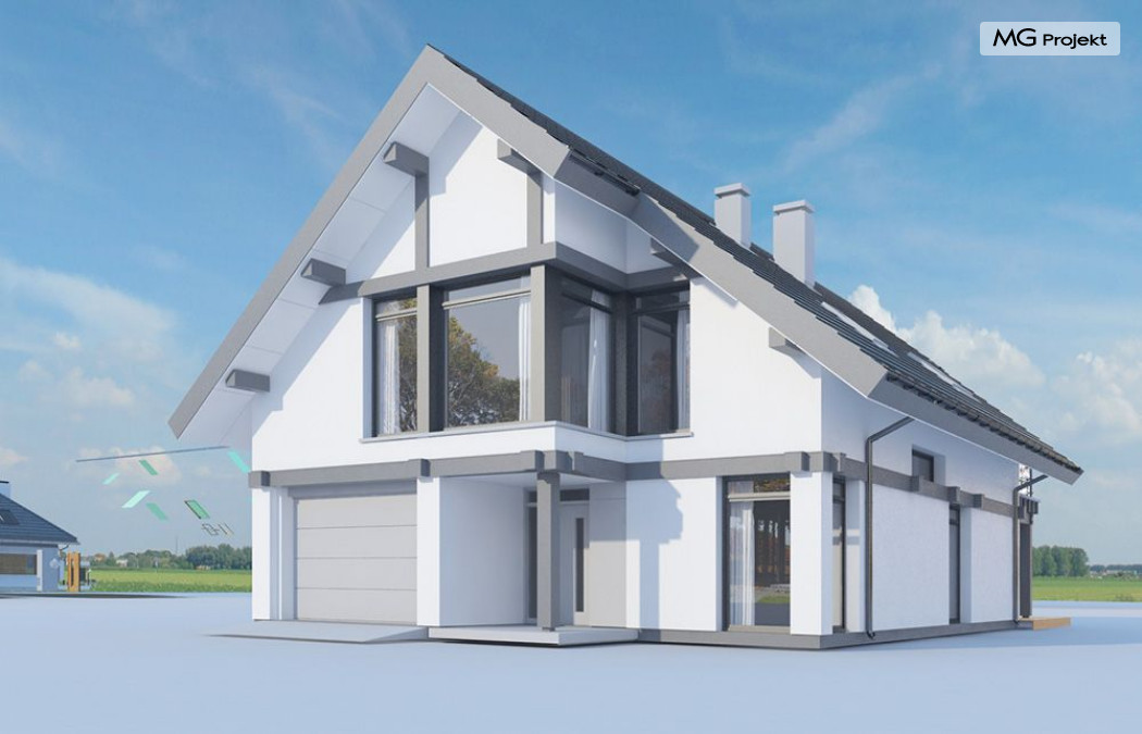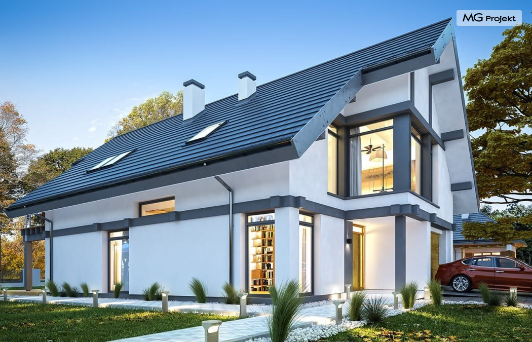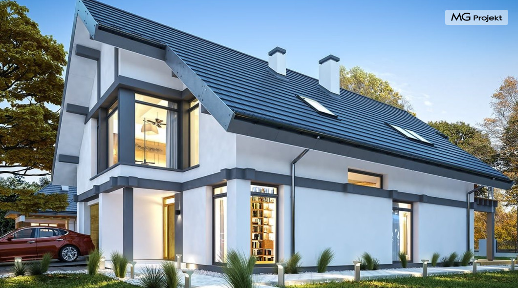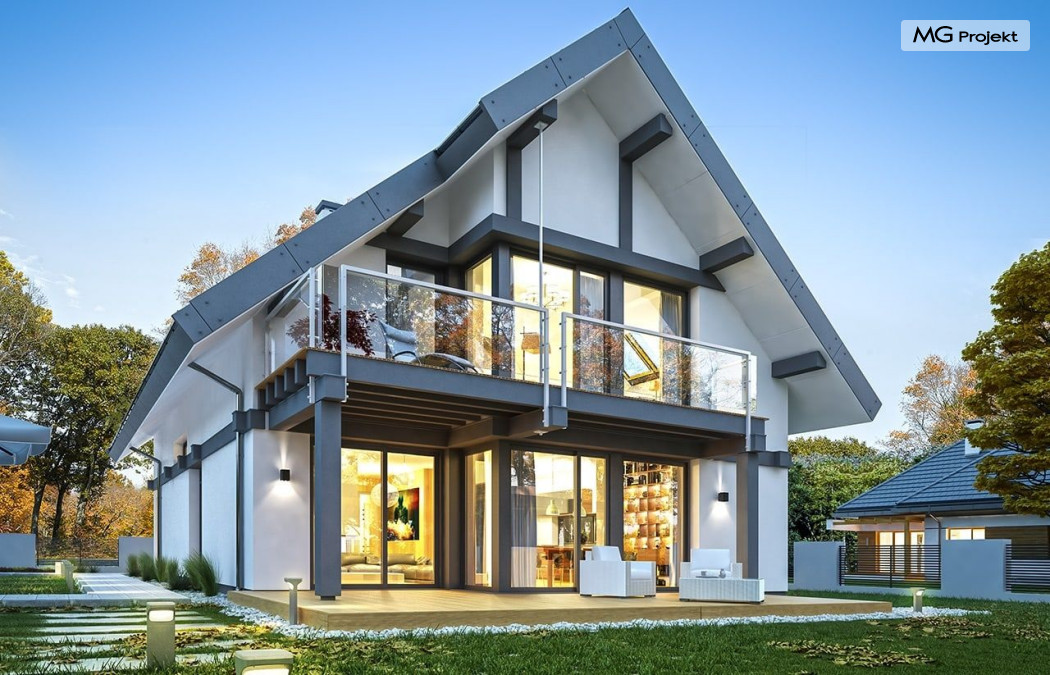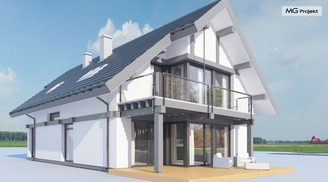 Projekt domu Otwarty 5 jest naszą kolejną propozycją z kolekcji domów „Otwartych”, czyli próba zmieszczenia budynku o podobnej do „Otwartych” funkcji i stylu architektonicznym na nieco węższej działce. Dom jest typowym dachowcem, budynkiem parterowym z użytkowym poddaszem, przykrytym symetrycznym dwuspadowym dachem, z charakterystycznym przesunięciem ściany szczytowej zarówno frontowej, jak i tylnej - ogrodowej, dzięki czemu uzyskujemy bardzo ładne oryginalne wejście do domu, oraz wygodny zadaszony taras i balkon. Architekturę domu definiują piękne przeszklenia, łączące wnętrze z otaczającym ogrodem. Jak sama nazwa projektu wskazuje: dom otwiera się na otoczenie, a granica między ogrodem a wnętrzem zostaje zatarta. Elementem nadającym rytm strukturze budynku - zarówno elewacjom, jak i rzutom kondygnacji, jest siatka słupów i belek, które pełnią funkcję porządkującą, ozdabiającą, oraz konstrukcyjną. Budynek wygląda w ten sposób oryginalnie i niepowtarzalnie. Wnętrze domu podzielono na część dzienną na parterze i sypialnie na poddaszu. Do wnętrza wchodzimy ładnym przedsionkiem, połączonym z garażem i kotłownią, wprost do holu otwierającego się na salon i od razu na ogród - dzięki pięknym przeszkleniom ogrodowej elewacji. Wspólne wnętrze salonu, jadalni , holu i kuchni ma ponad 70 m2 - jest to piękna otwarta przestrzeń. Na parterze przewidziano także dodatkowy pokój - gabinet, oraz wc. W domu Otwarty 5 na poddaszu mamy trzy bardzo ładne sypialnie: apartament rodziców, z własną garderobą i łazienką, oraz dwie sypialnie dzieci z łazienką dostępną z holu. Na poddaszu mieści się dodatkowo pralnia. W domu mamy duże, ładne, nie udawane pokoje - wnętrze jest bardzo komfortowe jak na tą powierzchnię użytkową. Konstrukcja budynku jest dość prosta i łatwa w budowie. Otwarty 5 to budynek energooszczędny, dzięki zastosowaniu nowoczesnym materiałów i instalacji. Projekt domu Otwarty 5 będzie niedrogi i bezproblemowy w późniejszej eksploatacji. Pracownia posiada odbicie lustrzane projektu oraz kilka wersji: bazową (projekt domu Otwarty), pomniejszonej z garażem dwustanowiskowym (projekt domu Otwarty 2), pomniejszonej z garażem jednostanowiskowym (projekt domu Otwarty 3), ze zmienionym układem pomieszczeń (projekt domu Otwarty 4). Zapraszamy!