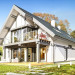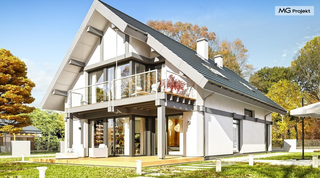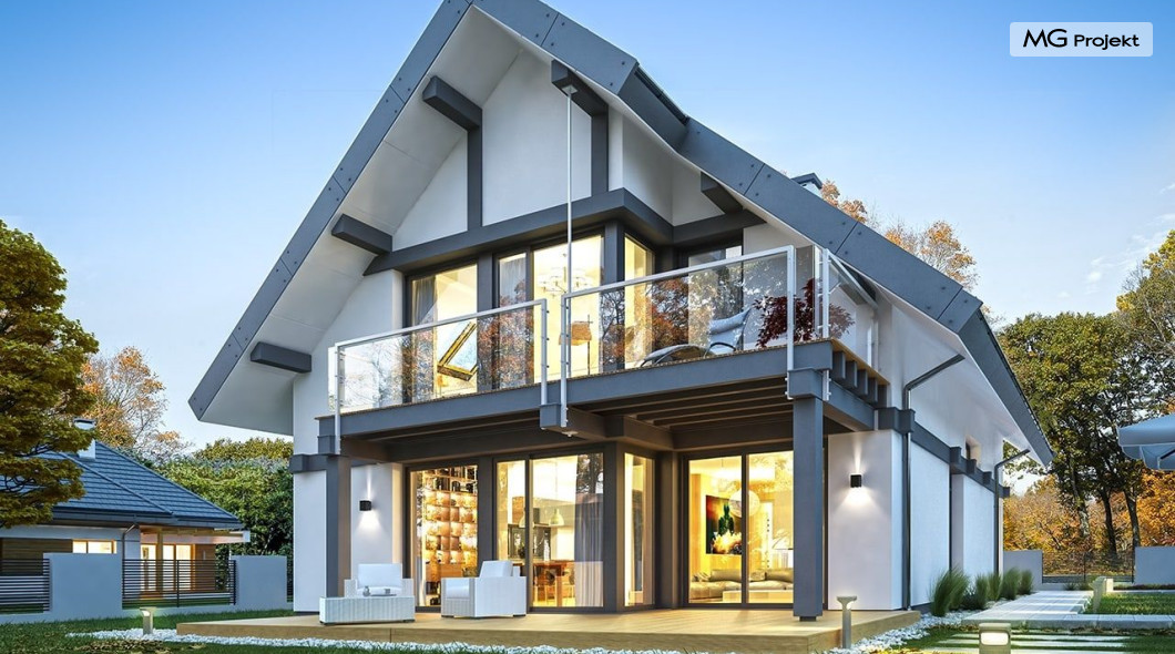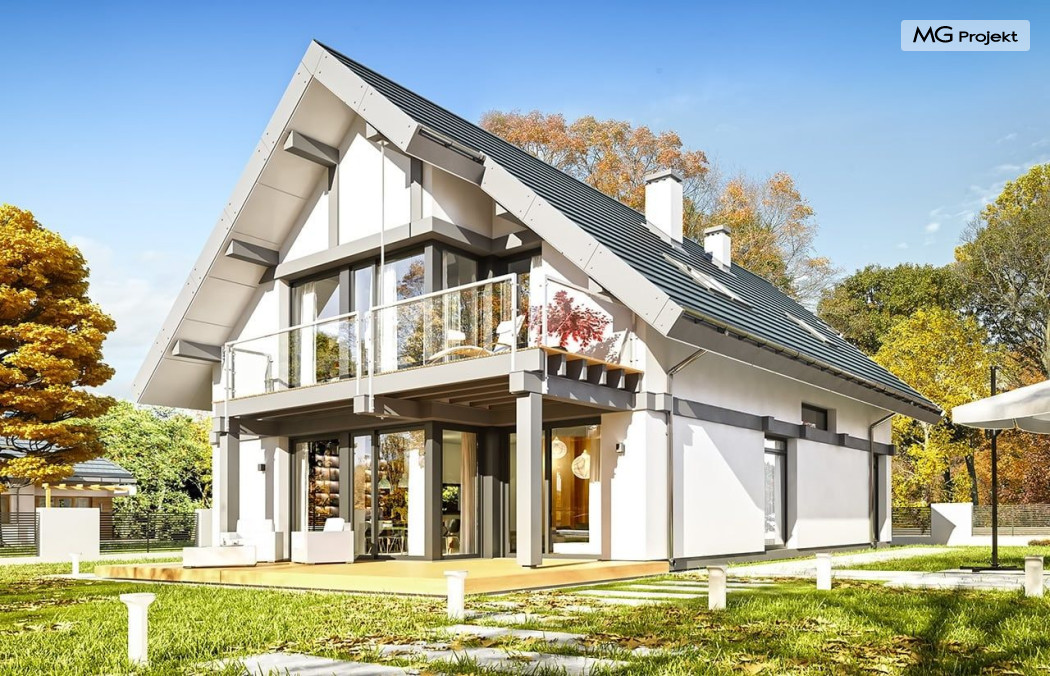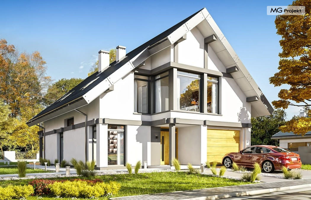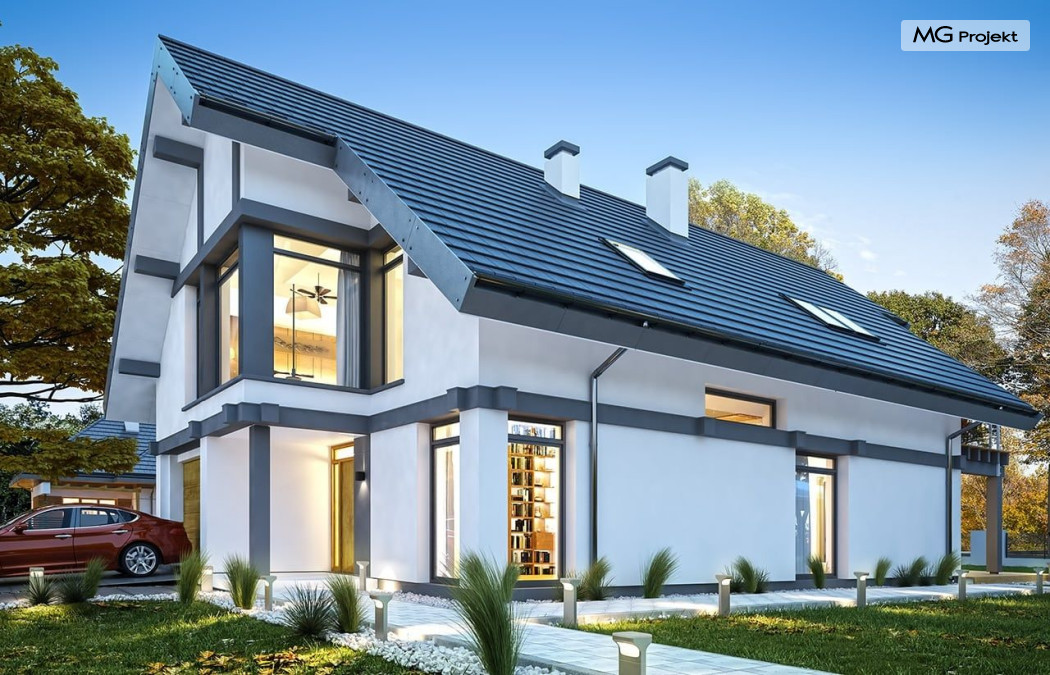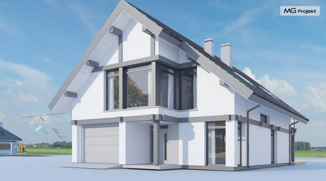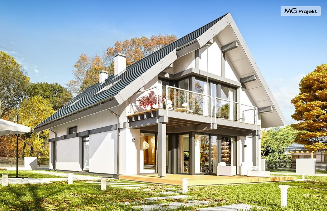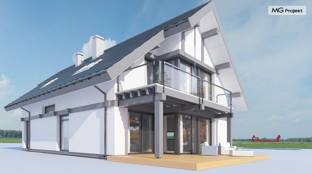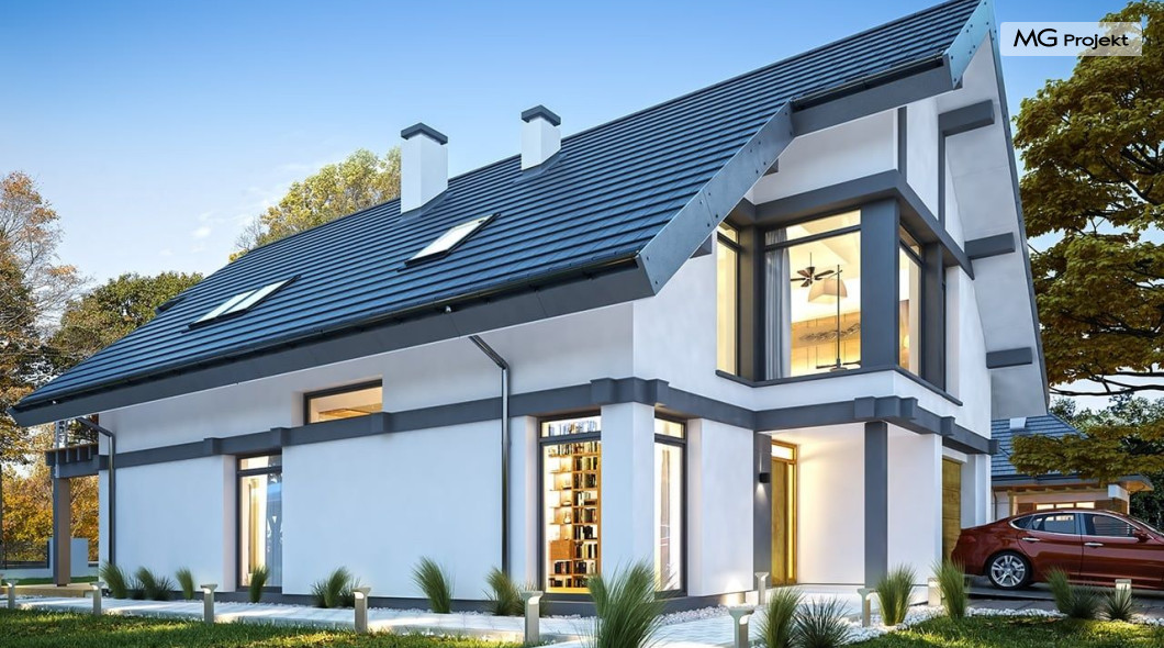 Projekt domu Otwarty 5 jest naszą kolejną propozycją z kolekcji domów „Otwartych”, czyli próba zmieszczenia budynku o podobnej do „Otwartych” funkcji i stylu architektonicznym na nieco węższej działce. Dom jest typowym dachowcem, budynkiem parterowym z użytkowym poddaszem, przykrytym symetrycznym dwuspadowym dachem, z charakterystycznym przesunięciem ściany szczytowej zarówno frontowej, jak i tylnej - ogrodowej, dzięki czemu uzyskujemy bardzo ładne oryginalne wejście do domu, oraz wygodny zadaszony taras i balkon. Architekturę domu definiują piękne przeszklenia, łączące wnętrze z otaczającym ogrodem. Jak sama nazwa projektu wskazuje: dom otwiera się na otoczenie, a granica między ogrodem a wnętrzem zostaje zatarta. Elementem nadającym rytm strukturze budynku - zarówno elewacjom, jak i rzutom kondygnacji, jest siatka słupów i belek, które pełnią funkcję porządkującą, ozdabiającą, oraz konstrukcyjną. Budynek wygląda w ten sposób oryginalnie i niepowtarzalnie. Wnętrze domu podzielono na część dzienną na parterze i sypialnie na poddaszu. Do wnętrza wchodzimy ładnym przedsionkiem, połączonym z garażem i kotłownią, wprost do holu otwierającego się na salon i od razu na ogród - dzięki pięknym przeszkleniom ogrodowej elewacji. Wspólne wnętrze salonu, jadalni , holu i kuchni ma ponad 70 m2 - jest to piękna otwarta przestrzeń. Na parterze przewidziano także dodatkowy pokój - gabinet, oraz wc. W domu Otwarty 5 na poddaszu mamy trzy bardzo ładne sypialnie: apartament rodziców, z własną garderobą i łazienką, oraz dwie sypialnie dzieci z łazienką dostępną z holu. Na poddaszu mieści się dodatkowo pralnia. W domu mamy duże, ładne, nie udawane pokoje - wnętrze jest bardzo komfortowe jak na tą powierzchnię użytkową. Konstrukcja budynku jest dość prosta i łatwa w budowie. Otwarty 5 to budynek energooszczędny, dzięki zastosowaniu nowoczesnym materiałów i instalacji. Projekt domu Otwarty 5 będzie niedrogi i bezproblemowy w późniejszej eksploatacji. Pracownia posiada odbicie lustrzane projektu oraz kilka wersji: bazową (projekt domu Otwarty), pomniejszonej z garażem dwustanowiskowym (projekt domu Otwarty 2), pomniejszonej z garażem jednostanowiskowym (projekt domu Otwarty 3), ze zmienionym układem pomieszczeń (projekt domu Otwarty 4). Zapraszamy!