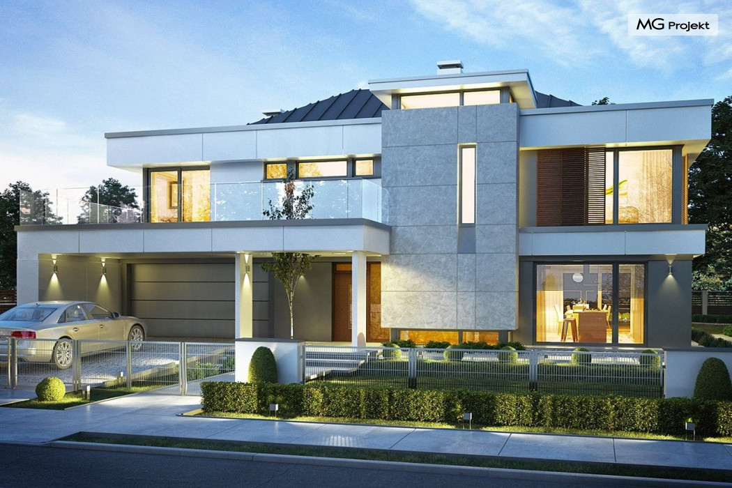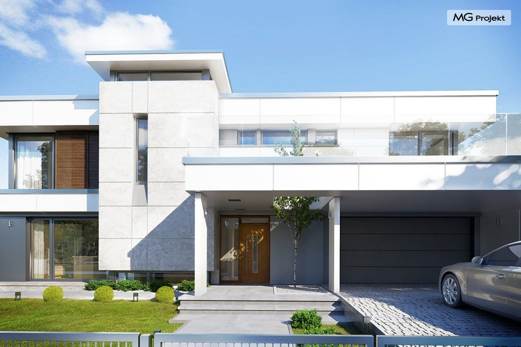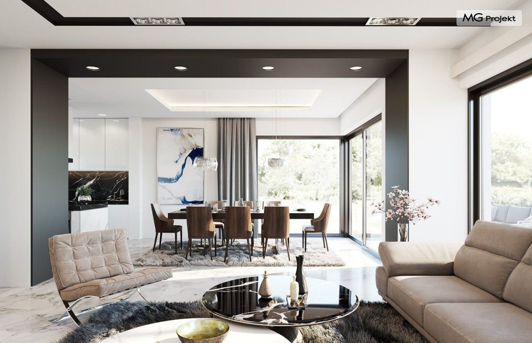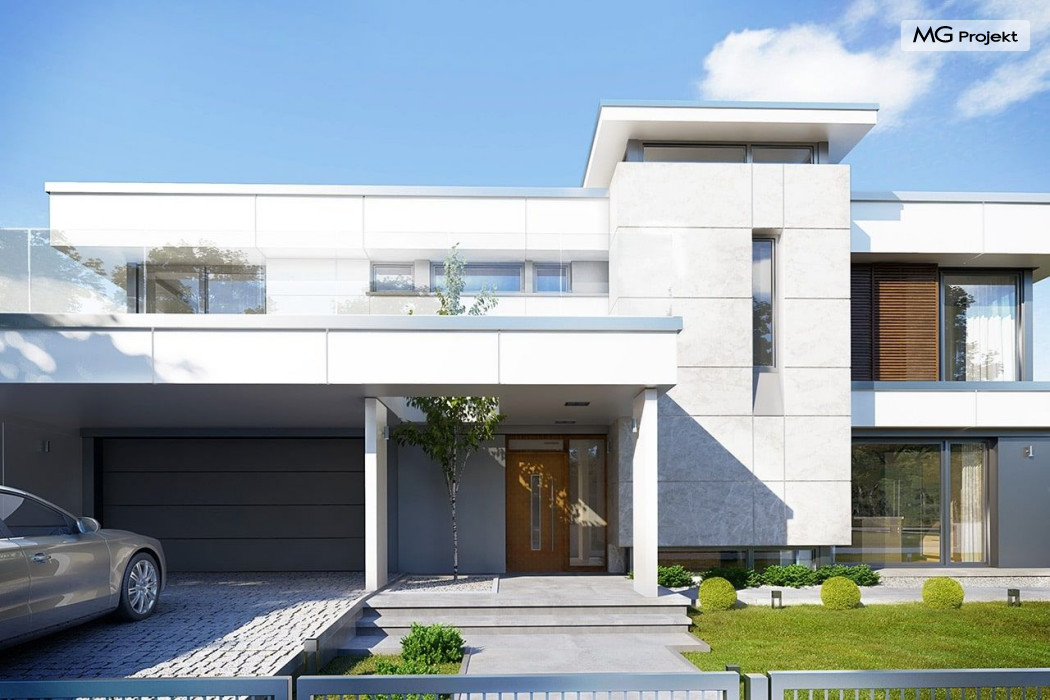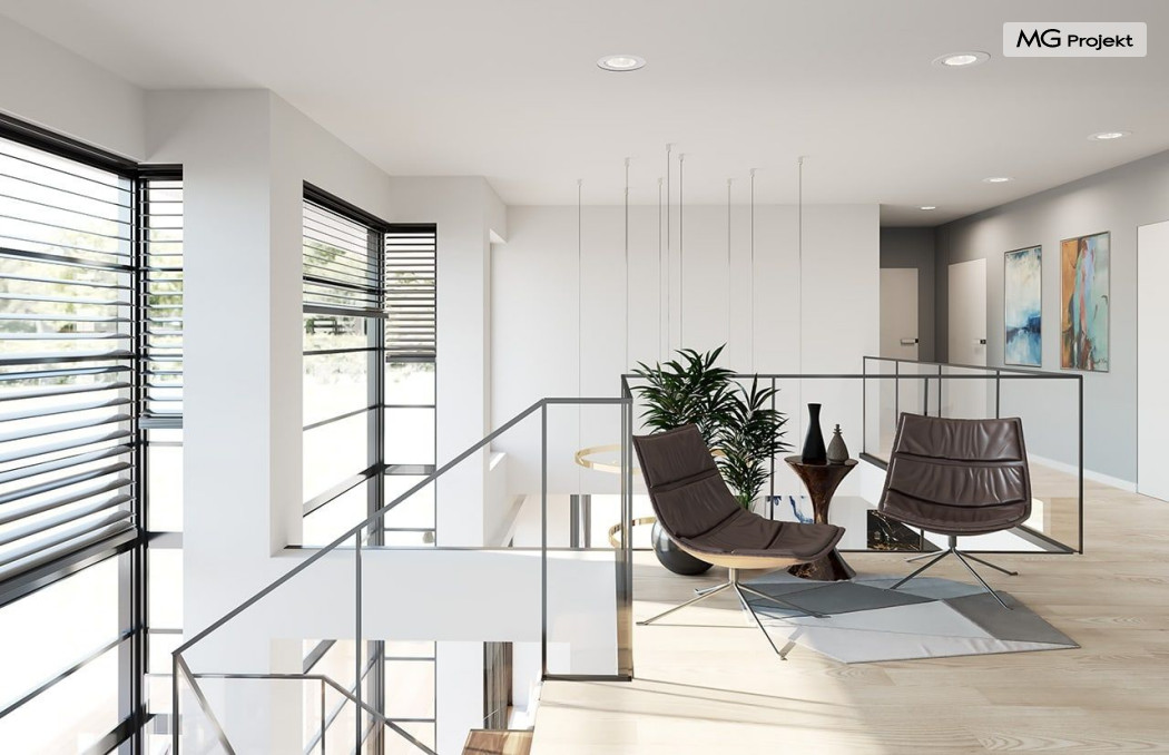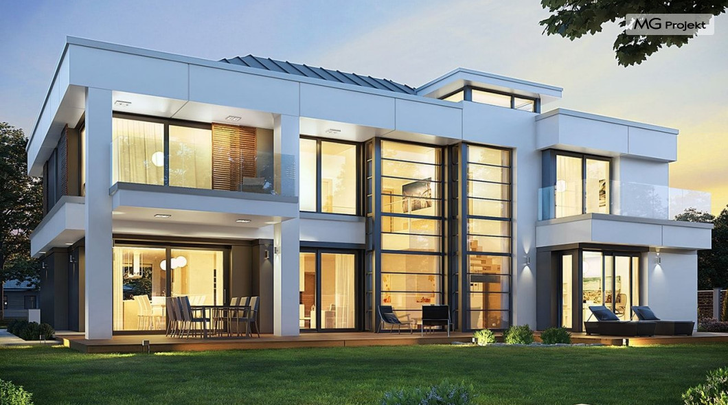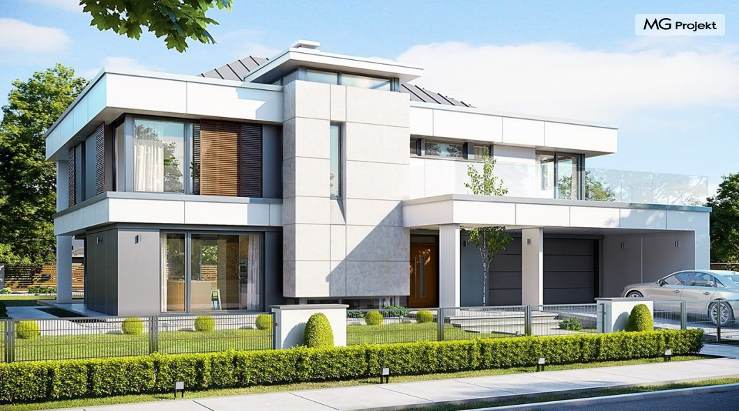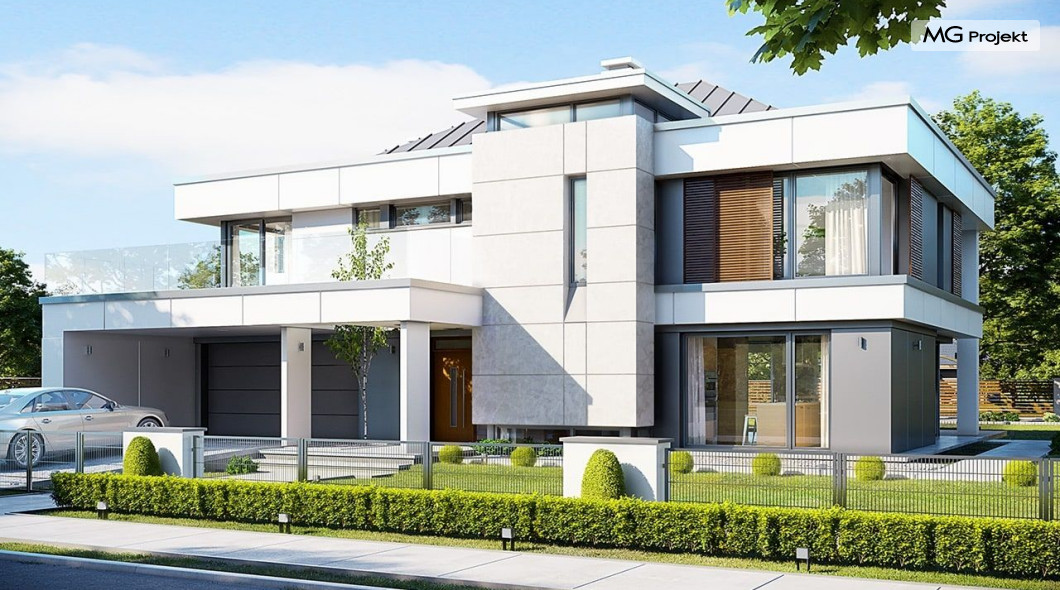 Projekt domu Willa Floryda 2 to dom nieco mniejszy od cieszącego się popularnością projektu Willa Floryda. Willa Floryda 2 jest o ponad 100 m2 mniejsza , ma mniejsze wymiary zewnętrzne, co nie znaczy, że w jakimkolwiek stopniu ustępuje swojemu poprzednikowi pod względem funkcjonalnym czy estetycznym. Dom ma ciekawą architekturę, a w mniejszej skali jest nie mniej zgrabny i interesujący. Budynek jest piętrowy, w kształcie prostokąta, z wystającą nieco z elewacji frontowej wiatą przed garażem, oraz dobudowaną niewielką parterową częścią od strony ogrodu. Dom przykrywa czterospadowy dach, który jednak dzięki głębokim gzymsom jest mało widoczny - nie dominuje nad modernistyczną nowoczesną bryłą. Wejście zostało mocno zaakcentowane szerokimi frontowymi drzwiami z naświetlem i masywną ścianą wykończoną kamieniem „unoszącą się” na dolnych szybach na wysokości fundamentu. Elewacje zostały podzielone kontrastującymi poziomymi pasami. Ciemniejsze pasy w grubości kondygnacji i okien, oraz jasne białe pasy w grubości stropów. Duże przeszklenia w elewacjach, łącznie z narożnymi oknami, dodają sylwetce domu lekkości i transparentności. Od strony ogrodu elewacja ozdobiona jest pięknym dwukondygnacyjnym przeszkleniem salonu z pustką - to wielkie okno pięknie otwiera wnętrze na otaczający dom ogród. Nowoczesna architektura i forma domu łączy się tutaj z przemyślaną funkcją. Wszystko ma swoje miejsce i sens. Wnętrze domu zaprojektowano wokół pięknego salonu z otwartą dwukondygnacyjną kubaturą, nad którą góruje antresola piętra, przedłużająca pokój dzienny na górną kondygnację. Do domu wchodzimy przez przedsionek z szatnią – z połączeniem z garażem i kotłownią - na wprost, do holu i pokoju dziennego. Przestrzeń dzienna, składająca się z holu, kuchni, jadalni i salonu ma łącznie ponad 90 m2! Kuchnia z piękną wyspą i ścianą z pełną zabudową łączy się z dodatkową dużą spiżarnią – magazynem. Z kolei obok salonu, przy reprezentacyjnej klatce schodowej mieści się dodatkowy pokój - gabinet, z dostępem do tarasu i ogrodu. Na piętrze mamy cztery prywatne apartamenty - każdy z własną łazienką i własną garderobą. Dodatkowo z holu, który może służyć jako domowa galeria, lub biblioteka widoczna z salonu na dole, mamy dostęp do pralni. Willa Floryda 2 to elegancka nowoczesna rezydencja - luksusowa i komfortowa. Jednocześnie zaprojektowana została w rozsądnej skali, sporo mniejszej niż oryginalna Willa Floryda. Nie każdy Inwestor dysponuje choćby tak dużą działką. Z pewnością projekt domu Willa Floryda 2 to rozsądna propozycja dla osób pragnących luksusu, ale bez przesady. Dom jest oczywiście energooszczędny - będzie niedrogi w przyszłej eksploatacji. Zapraszamy do zapoznania się z pełną ofertą pracowni MG Projekt: Willa Floryda, Willa Floryda 3, Willa Floryda 4, Rezydencja Floryda, Rezydencja Floryda 2.