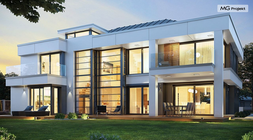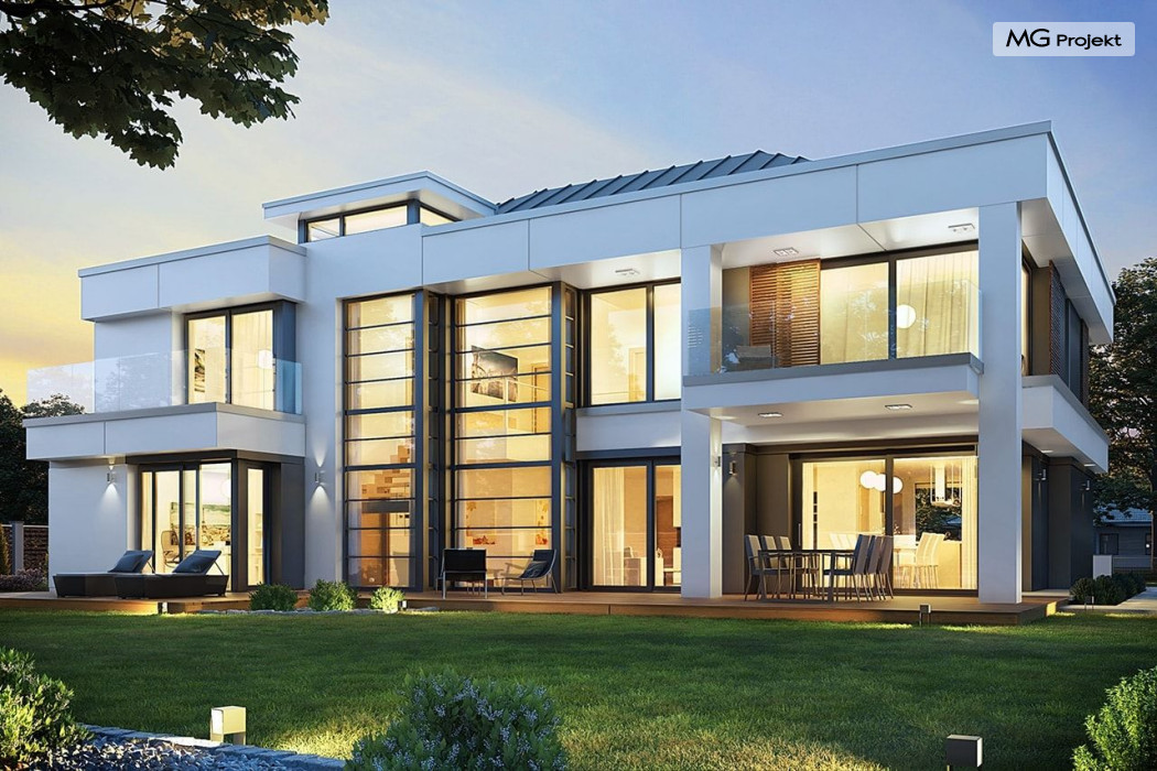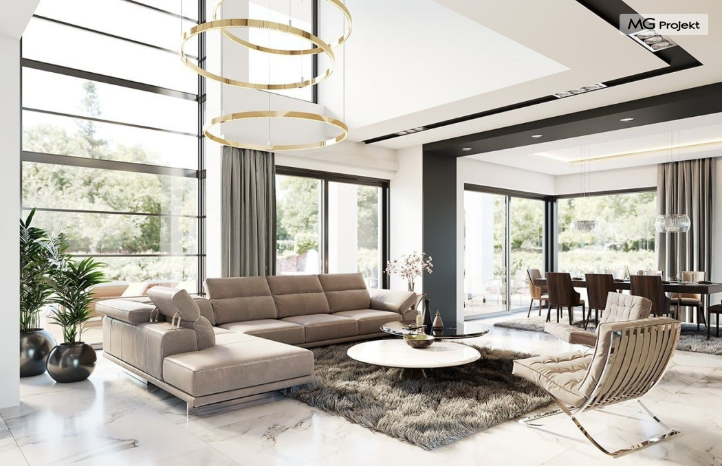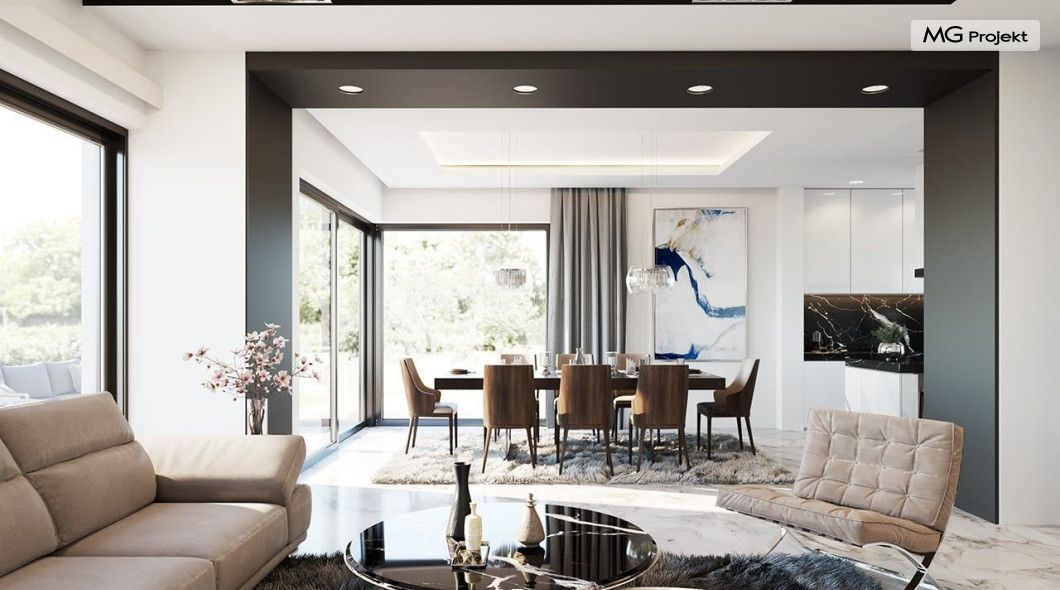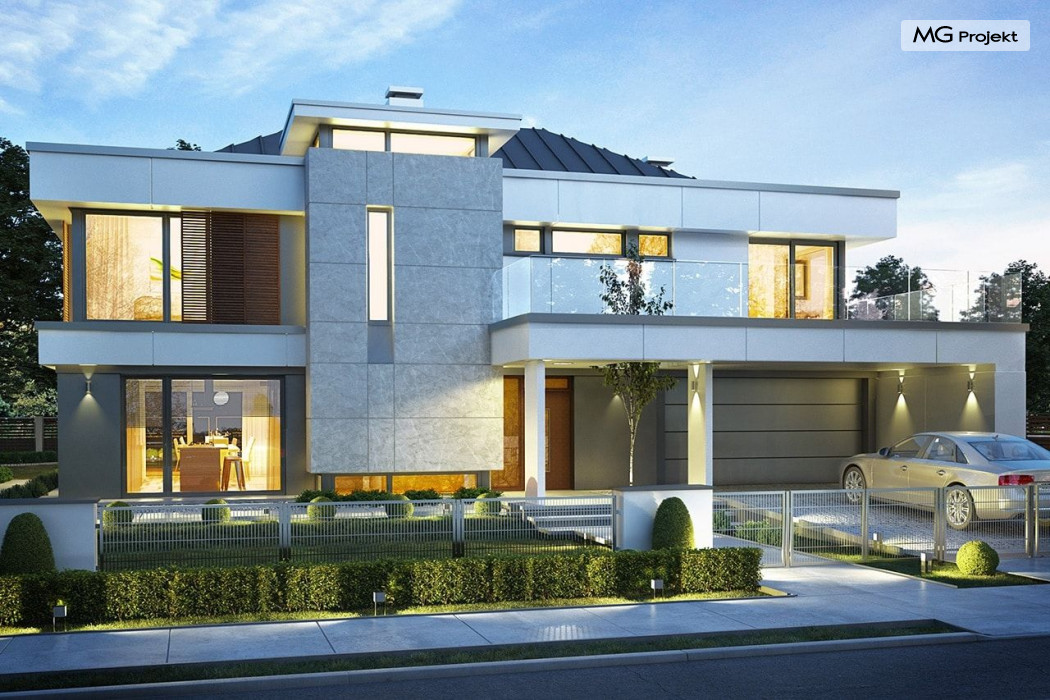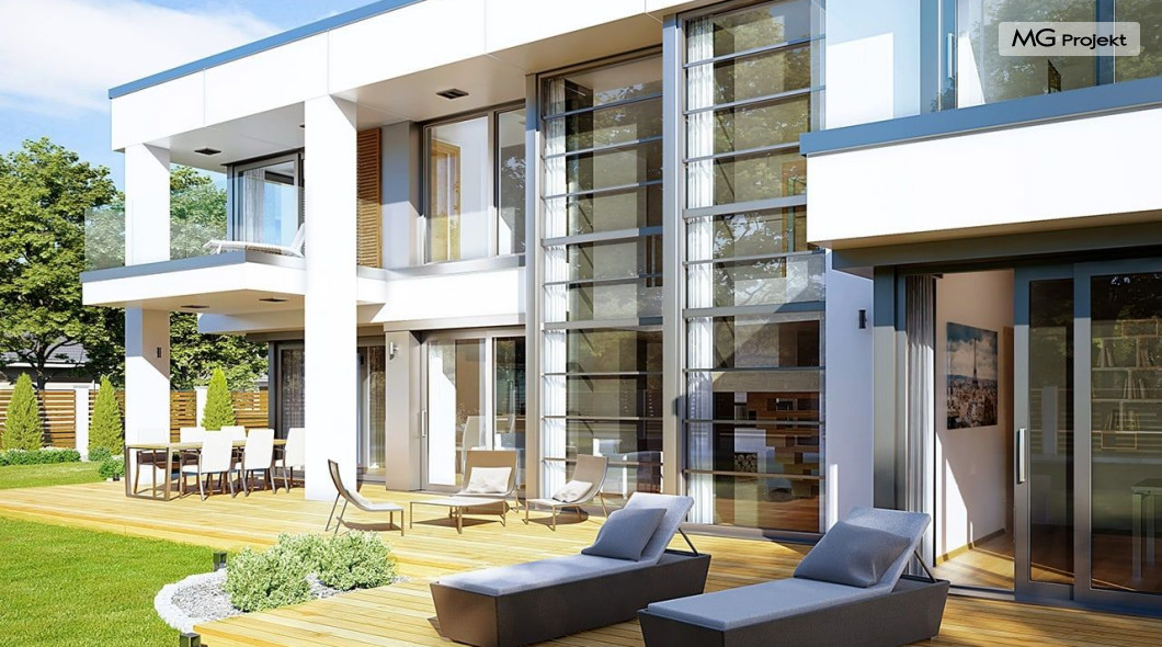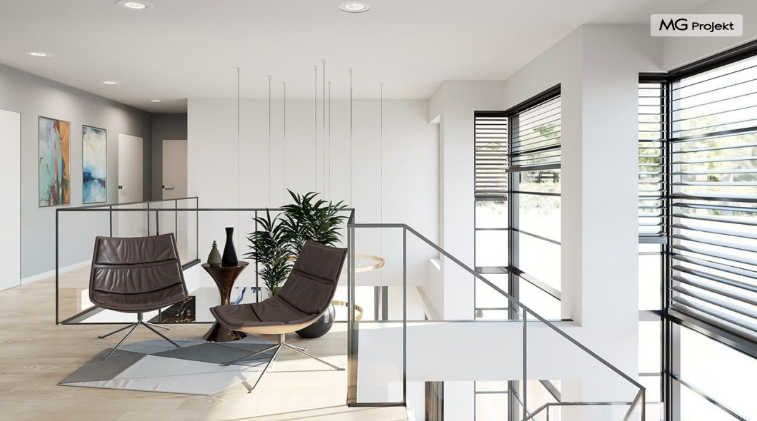 Projekt domu Willa Floryda 2 to dom nieco mniejszy od cieszącego się popularnością projektu Willa Floryda. Willa Floryda 2 jest o ponad 100 m2 mniejsza , ma mniejsze wymiary zewnętrzne, co nie znaczy, że w jakimkolwiek stopniu ustępuje swojemu poprzednikowi pod względem funkcjonalnym czy estetycznym. Dom ma ciekawą architekturę, a w mniejszej skali jest nie mniej zgrabny i interesujący. Budynek jest piętrowy, w kształcie prostokąta, z wystającą nieco z elewacji frontowej wiatą przed garażem, oraz dobudowaną niewielką parterową częścią od strony ogrodu. Dom przykrywa czterospadowy dach, który jednak dzięki głębokim gzymsom jest mało widoczny - nie dominuje nad modernistyczną nowoczesną bryłą. Wejście zostało mocno zaakcentowane szerokimi frontowymi drzwiami z naświetlem i masywną ścianą wykończoną kamieniem „unoszącą się” na dolnych szybach na wysokości fundamentu. Elewacje zostały podzielone kontrastującymi poziomymi pasami. Ciemniejsze pasy w grubości kondygnacji i okien, oraz jasne białe pasy w grubości stropów. Duże przeszklenia w elewacjach, łącznie z narożnymi oknami, dodają sylwetce domu lekkości i transparentności. Od strony ogrodu elewacja ozdobiona jest pięknym dwukondygnacyjnym przeszkleniem salonu z pustką - to wielkie okno pięknie otwiera wnętrze na otaczający dom ogród. Nowoczesna architektura i forma domu łączy się tutaj z przemyślaną funkcją. Wszystko ma swoje miejsce i sens. Wnętrze domu zaprojektowano wokół pięknego salonu z otwartą dwukondygnacyjną kubaturą, nad którą góruje antresola piętra, przedłużająca pokój dzienny na górną kondygnację. Do domu wchodzimy przez przedsionek z szatnią – z połączeniem z garażem i kotłownią - na wprost, do holu i pokoju dziennego. Przestrzeń dzienna, składająca się z holu, kuchni, jadalni i salonu ma łącznie ponad 90 m2! Kuchnia z piękną wyspą i ścianą z pełną zabudową łączy się z dodatkową dużą spiżarnią – magazynem. Z kolei obok salonu, przy reprezentacyjnej klatce schodowej mieści się dodatkowy pokój - gabinet, z dostępem do tarasu i ogrodu. Na piętrze mamy cztery prywatne apartamenty - każdy z własną łazienką i własną garderobą. Dodatkowo z holu, który może służyć jako domowa galeria, lub biblioteka widoczna z salonu na dole, mamy dostęp do pralni. Willa Floryda 2 to elegancka nowoczesna rezydencja - luksusowa i komfortowa. Jednocześnie zaprojektowana została w rozsądnej skali, sporo mniejszej niż oryginalna Willa Floryda. Nie każdy Inwestor dysponuje choćby tak dużą działką. Z pewnością projekt domu Willa Floryda 2 to rozsądna propozycja dla osób pragnących luksusu, ale bez przesady. Dom jest oczywiście energooszczędny - będzie niedrogi w przyszłej eksploatacji. Zapraszamy do zapoznania się z pełną ofertą pracowni MG Projekt: Willa Floryda, Willa Floryda 3, Willa Floryda 4, Rezydencja Floryda, Rezydencja Floryda 2.