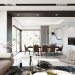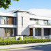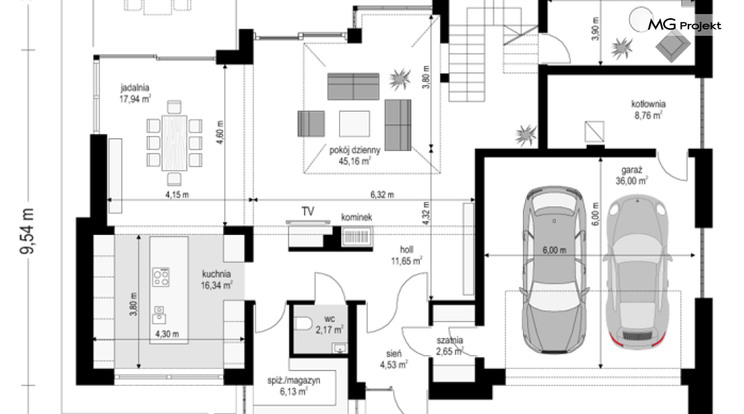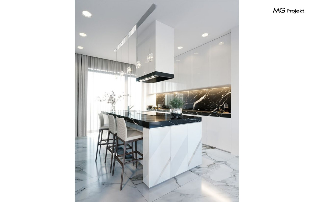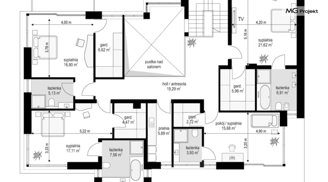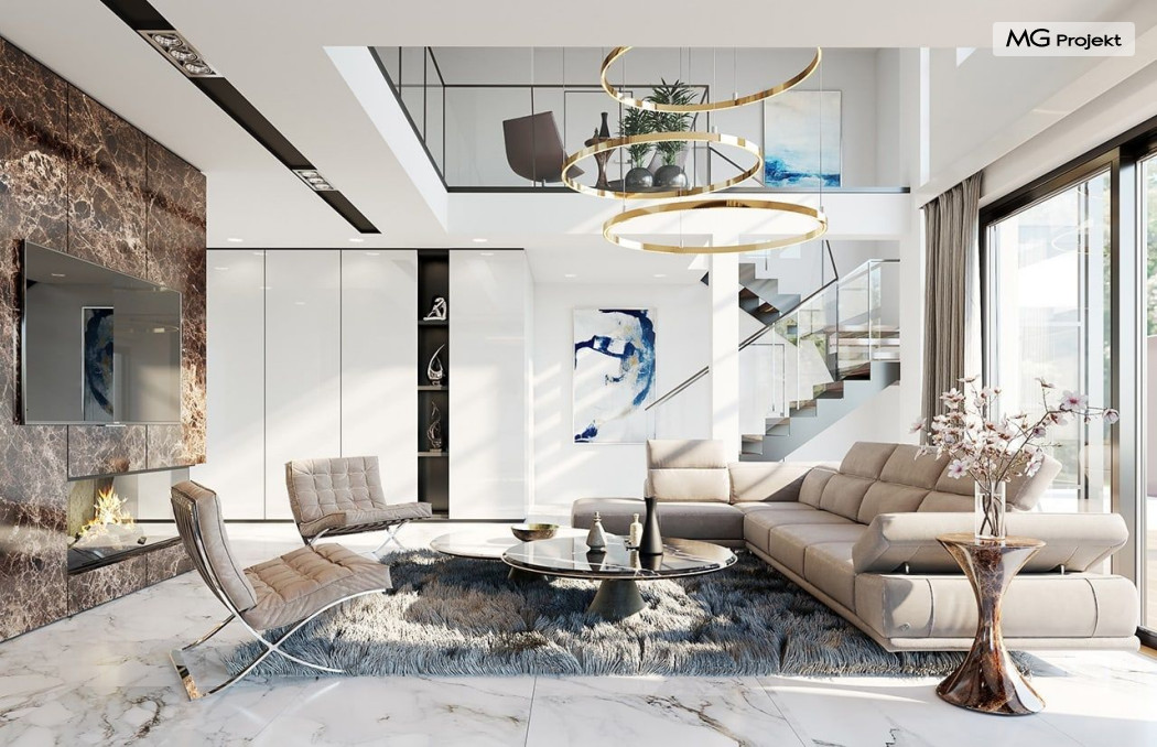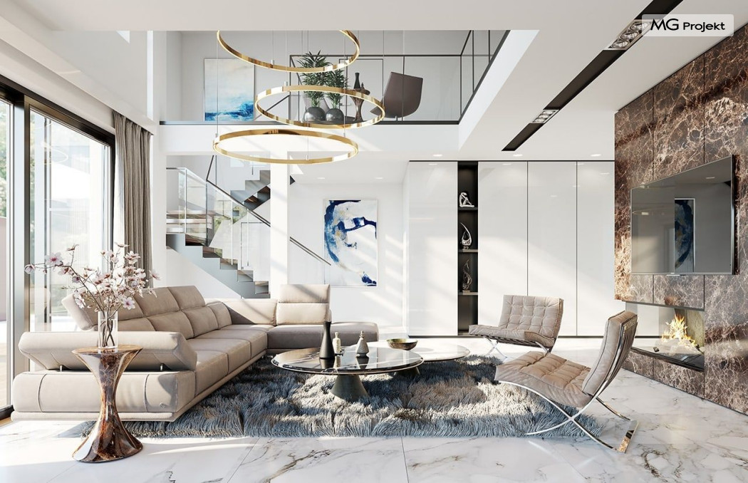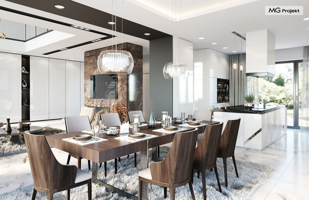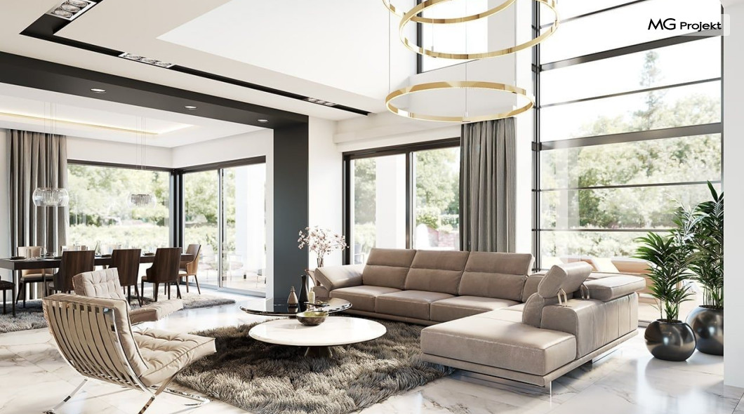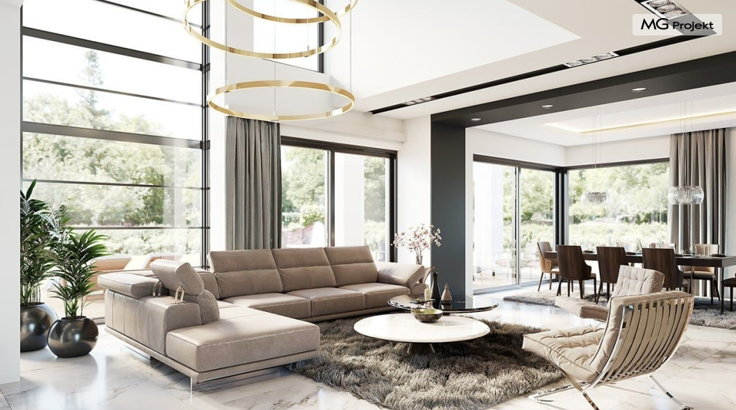 Projekt domu Willa Floryda 2 to dom nieco mniejszy od cieszącego się popularnością projektu Willa Floryda. Willa Floryda 2 jest o ponad 100 m2 mniejsza , ma mniejsze wymiary zewnętrzne, co nie znaczy, że w jakimkolwiek stopniu ustępuje swojemu poprzednikowi pod względem funkcjonalnym czy estetycznym. Dom ma ciekawą architekturę, a w mniejszej skali jest nie mniej zgrabny i interesujący. Budynek jest piętrowy, w kształcie prostokąta, z wystającą nieco z elewacji frontowej wiatą przed garażem, oraz dobudowaną niewielką parterową częścią od strony ogrodu. Dom przykrywa czterospadowy dach, który jednak dzięki głębokim gzymsom jest mało widoczny - nie dominuje nad modernistyczną nowoczesną bryłą. Wejście zostało mocno zaakcentowane szerokimi frontowymi drzwiami z naświetlem i masywną ścianą wykończoną kamieniem „unoszącą się” na dolnych szybach na wysokości fundamentu. Elewacje zostały podzielone kontrastującymi poziomymi pasami. Ciemniejsze pasy w grubości kondygnacji i okien, oraz jasne białe pasy w grubości stropów. Duże przeszklenia w elewacjach, łącznie z narożnymi oknami, dodają sylwetce domu lekkości i transparentności. Od strony ogrodu elewacja ozdobiona jest pięknym dwukondygnacyjnym przeszkleniem salonu z pustką - to wielkie okno pięknie otwiera wnętrze na otaczający dom ogród. Nowoczesna architektura i forma domu łączy się tutaj z przemyślaną funkcją. Wszystko ma swoje miejsce i sens. Wnętrze domu zaprojektowano wokół pięknego salonu z otwartą dwukondygnacyjną kubaturą, nad którą góruje antresola piętra, przedłużająca pokój dzienny na górną kondygnację. Do domu wchodzimy przez przedsionek z szatnią – z połączeniem z garażem i kotłownią - na wprost, do holu i pokoju dziennego. Przestrzeń dzienna, składająca się z holu, kuchni, jadalni i salonu ma łącznie ponad 90 m2! Kuchnia z piękną wyspą i ścianą z pełną zabudową łączy się z dodatkową dużą spiżarnią – magazynem. Z kolei obok salonu, przy reprezentacyjnej klatce schodowej mieści się dodatkowy pokój - gabinet, z dostępem do tarasu i ogrodu. Na piętrze mamy cztery prywatne apartamenty - każdy z własną łazienką i własną garderobą. Dodatkowo z holu, który może służyć jako domowa galeria, lub biblioteka widoczna z salonu na dole, mamy dostęp do pralni. Willa Floryda 2 to elegancka nowoczesna rezydencja - luksusowa i komfortowa. Jednocześnie zaprojektowana została w rozsądnej skali, sporo mniejszej niż oryginalna Willa Floryda. Nie każdy Inwestor dysponuje choćby tak dużą działką. Z pewnością projekt domu Willa Floryda 2 to rozsądna propozycja dla osób pragnących luksusu, ale bez przesady. Dom jest oczywiście energooszczędny - będzie niedrogi w przyszłej eksploatacji. Zapraszamy do zapoznania się z pełną ofertą pracowni MG Projekt: Willa Floryda, Willa Floryda 3, Willa Floryda 4, Rezydencja Floryda, Rezydencja Floryda 2.