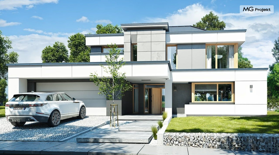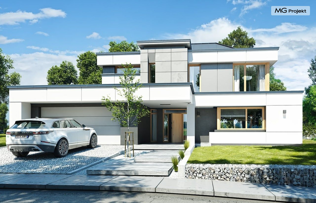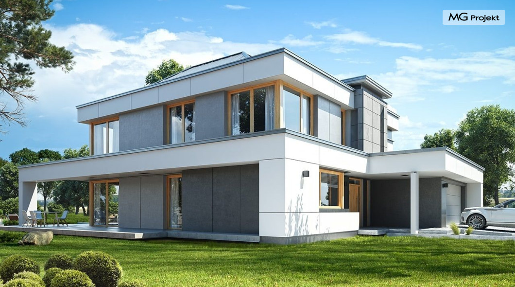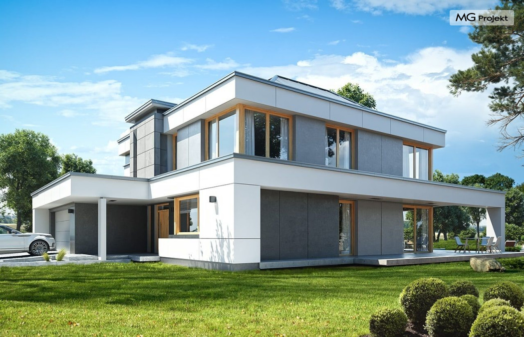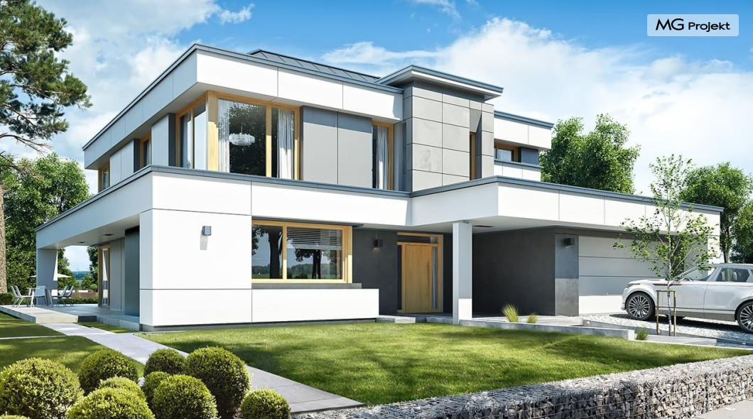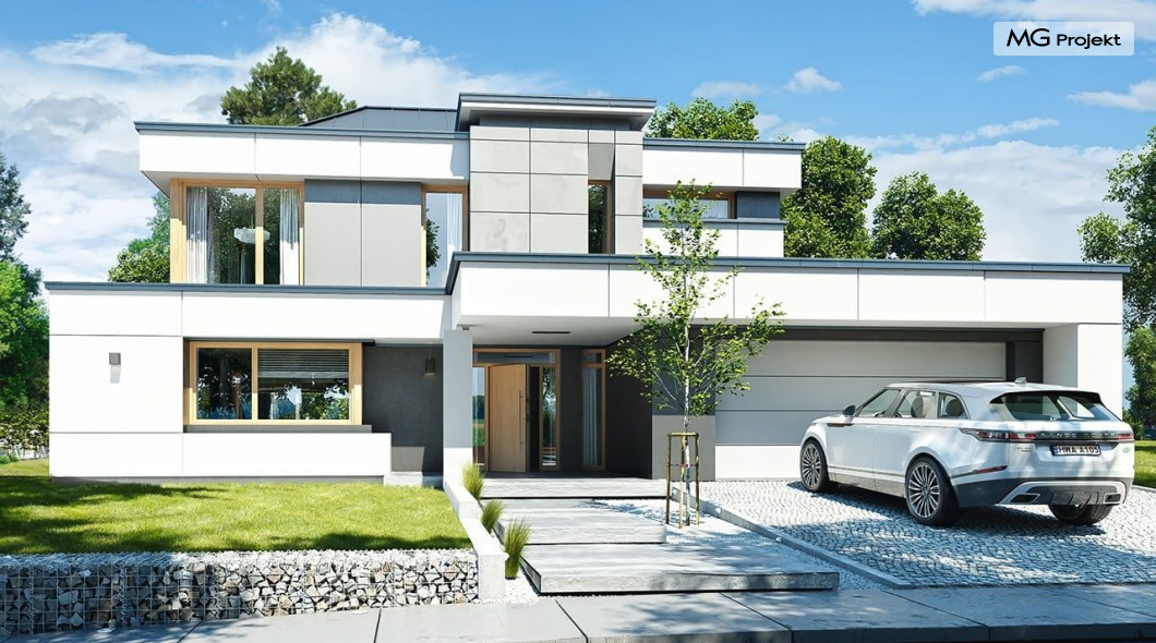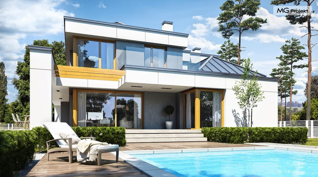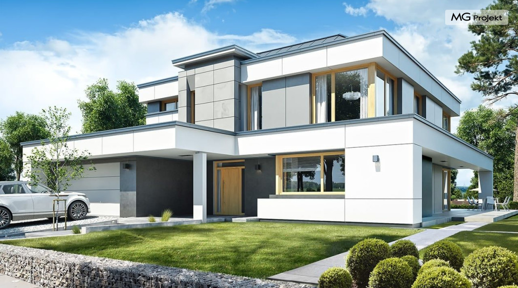 Projekt domu Willa Floryda 3 jest naszą kolejną propozycją projektu z serii nowoczesnych rezydencji Willa Floryda. Dom estetycznie i architektonicznie nawiązuje do serii "Floryd", natomiast układ funkcjonalny i wygląd są zupełnie inne. Budynek jest piętrowy, z dwukondygnacyjnym rdzeniem obudowanym parterowymi częściami od frontu i z tyłu. Dzięki temu bryła jest bardzo urozmaicona i wygląda lekko. Rezydencja Willa Floryda 3 łączy w sobie zalety budynku piętrowego i parterowego, będącego blisko ogrodu i w ludzkiej skali. Elewacje podzielono na poziome pasy: ciemne pasy w grubości kondygnacji i okien, oraz kontrastujące białe pasy w grubości stropów. Jasne części elewacji wystają do przodu, natomiast ciemniejsze fragmenty ścian chowają się, dzięki czemu bryła jest ciekawsza i bardziej rozrzeźbiona. Wejście do domu Willa Floryda 3 zaakcentowane jest pięknym podcieniem, oraz masywną ścianą wykończoną kamieniem, lub betonem architektonicznym. Narożne okno kuchni i przeszklenia piętra dodają frontowi domu lekkości i transparentności. W prawdziwy sposób dom otwiera swoje wnętrze od strony ogrodu. Narożne przeszklenia salonu i sypialni u góry łączą wnętrze z ogrodem. Jednocześnie podcień i pergola oparta na wystającym słupie i podciągu tworzą wewnętrzną przestrzeń tarasową - swoiste patio chroniące prywatność mieszkańców. Nowoczesna sylwetka domu z pewnością wyróżni tą piękną rezydencję z otaczającej nudnej zabudowy. Parter domu Willa Floryda 3 zaprojektowano na planie zbliżonym do kwadratu. Do budynku wchodzimy przez obszerny przedsionek z szatnią, połączony z garażem z jednej strony i spiżarnią i kuchnią z drugiej. W ten sposób zarówno wejście do domu piechotą, jak i przyjazd autem jest wygodny i prowadzi nas w to samo miejsce. Z przedsionka przedostajemy się do holu, z reprezentacyjnymi schodami po prawej i otwartą dużą przestrzenią dzienną po lewej stronie. Pokój dzienny, jadalnia i kuchnia z wyspą łączą się we wspólną niemal 90ciometrową powierzchnię. Salon otwiera się na narożny taras w kształcie litery "L". Na parterze mamy jeszcze dodatkową przestrzeń - dwa pokoje o dowolnym przeznaczeniu - rzadkość w piętrowych domach. Mogą to być sypialnie, lub pokoje do pracy czy rekreacji. Albo może to być wydzielone dodatkowe mieszkanko dla seniorów, lub gosposi. Przestrzeń do dowolnej aranżacji. Z domu Willa Floryda 3 i z garażu dostajemy się też do dużego pomieszczenia gospodarczego - kotłowni. Piętro domu to trzy sypialnie: apartament rodziców z własnymi garderobami i łazienką, oraz sypialnie dzieci z szafami wbudowanymi i łazienką dostępną z holu. Na piętrze mamy też pralnię. Hol piętra połączony jest z parterem otworem schodów, oraz niewielką dziurą w stropie. Projekt domu Willa Floryda 3 jest nowoczesny, luksusowy i komfortowy. Oczywiście projekt Willa Floryda 3 jest budynkiem energooszczędnym - dzięki zastosowanym materiałom i instalacjom. Zapraszamy do zapoznania się z pełną ofertą pracowni MG Projekt: Willa Floryda 2, Willa Floryda, Willa Floryda 4, Rezydencja Floryda, Rezydencja Floryda 2.