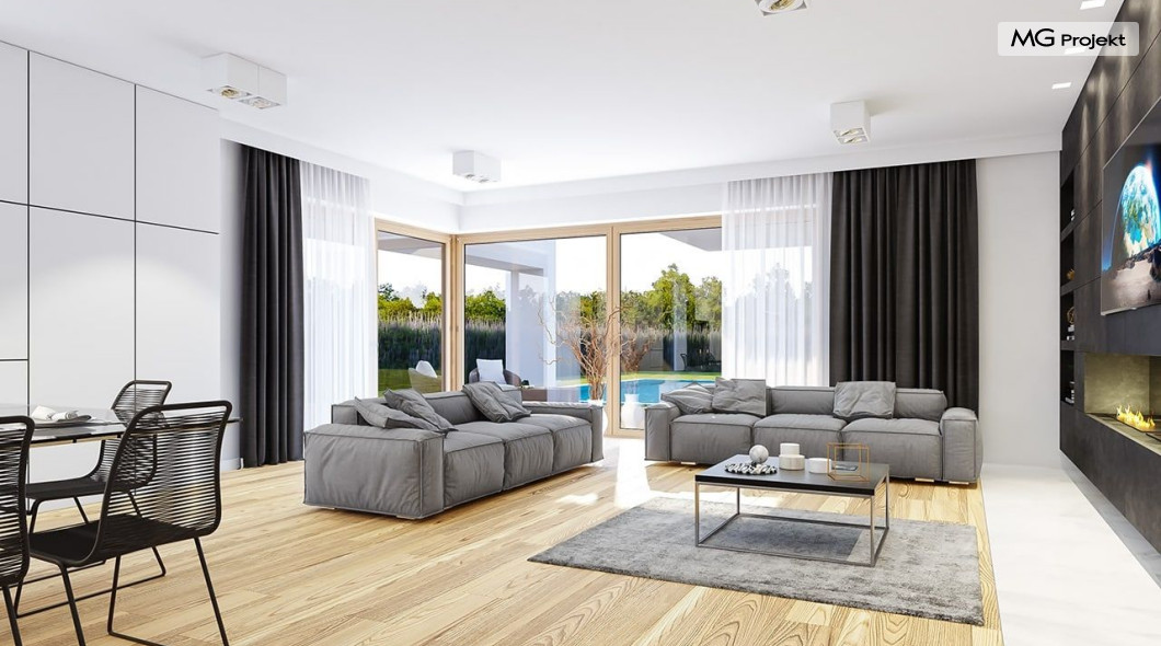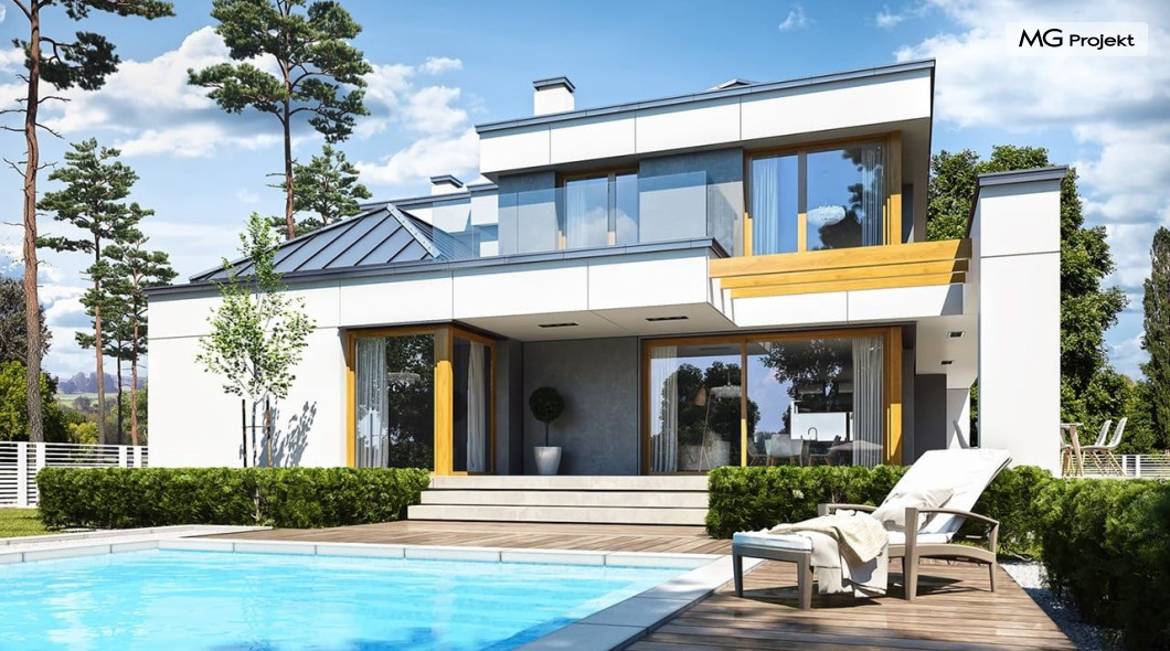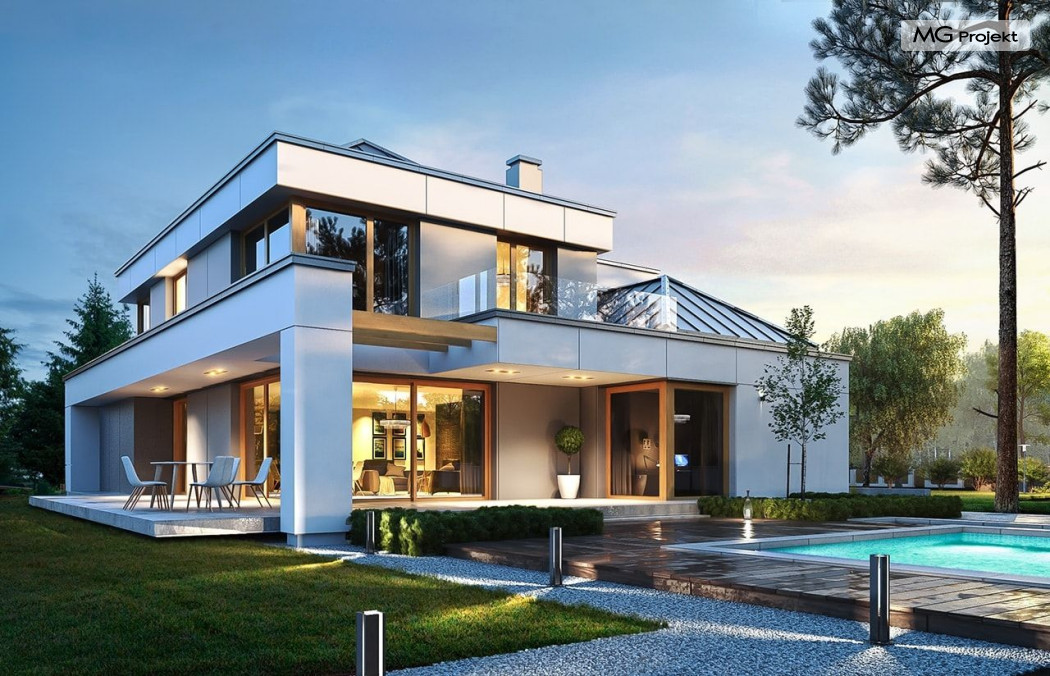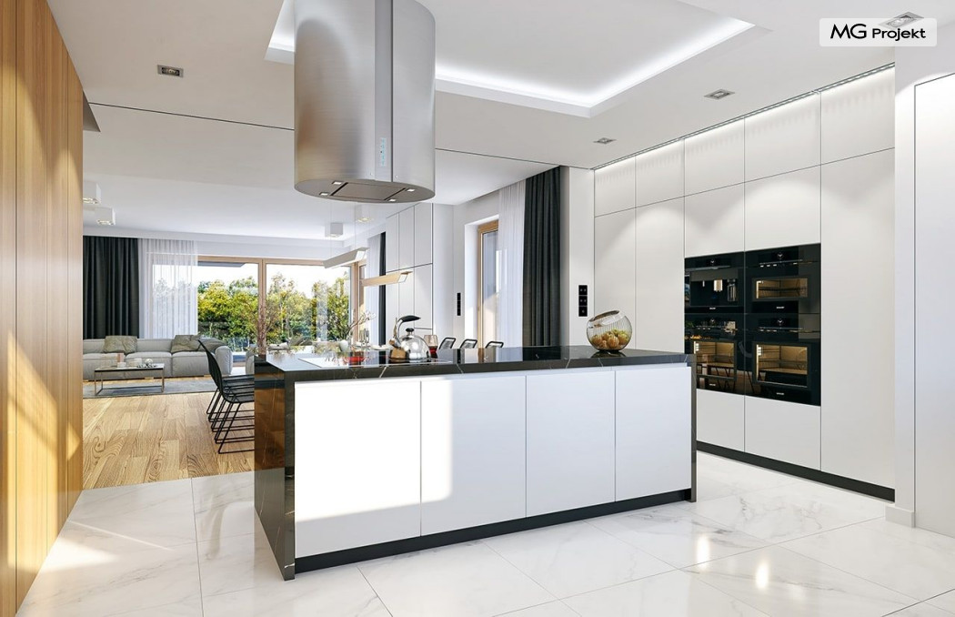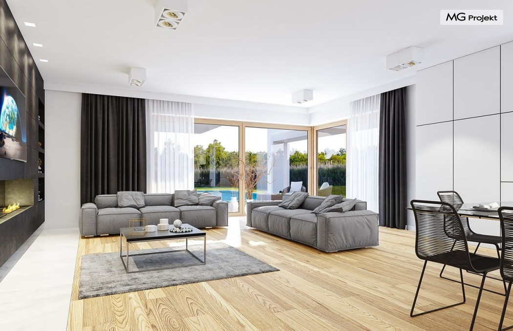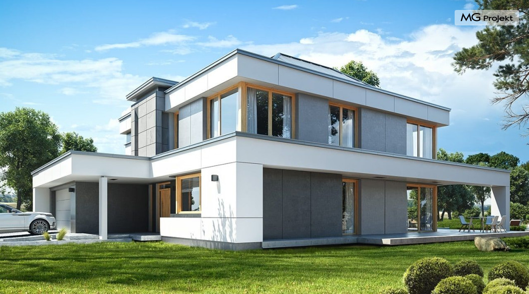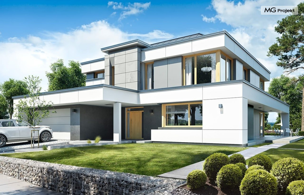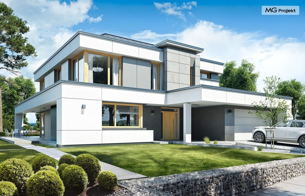 Projekt domu Willa Floryda 3 jest naszą kolejną propozycją projektu z serii nowoczesnych rezydencji Willa Floryda. Dom estetycznie i architektonicznie nawiązuje do serii "Floryd", natomiast układ funkcjonalny i wygląd są zupełnie inne. Budynek jest piętrowy, z dwukondygnacyjnym rdzeniem obudowanym parterowymi częściami od frontu i z tyłu. Dzięki temu bryła jest bardzo urozmaicona i wygląda lekko. Rezydencja Willa Floryda 3 łączy w sobie zalety budynku piętrowego i parterowego, będącego blisko ogrodu i w ludzkiej skali. Elewacje podzielono na poziome pasy: ciemne pasy w grubości kondygnacji i okien, oraz kontrastujące białe pasy w grubości stropów. Jasne części elewacji wystają do przodu, natomiast ciemniejsze fragmenty ścian chowają się, dzięki czemu bryła jest ciekawsza i bardziej rozrzeźbiona. Wejście do domu Willa Floryda 3 zaakcentowane jest pięknym podcieniem, oraz masywną ścianą wykończoną kamieniem, lub betonem architektonicznym. Narożne okno kuchni i przeszklenia piętra dodają frontowi domu lekkości i transparentności. W prawdziwy sposób dom otwiera swoje wnętrze od strony ogrodu. Narożne przeszklenia salonu i sypialni u góry łączą wnętrze z ogrodem. Jednocześnie podcień i pergola oparta na wystającym słupie i podciągu tworzą wewnętrzną przestrzeń tarasową - swoiste patio chroniące prywatność mieszkańców. Nowoczesna sylwetka domu z pewnością wyróżni tą piękną rezydencję z otaczającej nudnej zabudowy. Parter domu Willa Floryda 3 zaprojektowano na planie zbliżonym do kwadratu. Do budynku wchodzimy przez obszerny przedsionek z szatnią, połączony z garażem z jednej strony i spiżarnią i kuchnią z drugiej. W ten sposób zarówno wejście do domu piechotą, jak i przyjazd autem jest wygodny i prowadzi nas w to samo miejsce. Z przedsionka przedostajemy się do holu, z reprezentacyjnymi schodami po prawej i otwartą dużą przestrzenią dzienną po lewej stronie. Pokój dzienny, jadalnia i kuchnia z wyspą łączą się we wspólną niemal 90ciometrową powierzchnię. Salon otwiera się na narożny taras w kształcie litery "L". Na parterze mamy jeszcze dodatkową przestrzeń - dwa pokoje o dowolnym przeznaczeniu - rzadkość w piętrowych domach. Mogą to być sypialnie, lub pokoje do pracy czy rekreacji. Albo może to być wydzielone dodatkowe mieszkanko dla seniorów, lub gosposi. Przestrzeń do dowolnej aranżacji. Z domu Willa Floryda 3 i z garażu dostajemy się też do dużego pomieszczenia gospodarczego - kotłowni. Piętro domu to trzy sypialnie: apartament rodziców z własnymi garderobami i łazienką, oraz sypialnie dzieci z szafami wbudowanymi i łazienką dostępną z holu. Na piętrze mamy też pralnię. Hol piętra połączony jest z parterem otworem schodów, oraz niewielką dziurą w stropie. Projekt domu Willa Floryda 3 jest nowoczesny, luksusowy i komfortowy. Oczywiście projekt Willa Floryda 3 jest budynkiem energooszczędnym - dzięki zastosowanym materiałom i instalacjom. Zapraszamy do zapoznania się z pełną ofertą pracowni MG Projekt: Willa Floryda 2, Willa Floryda, Willa Floryda 4, Rezydencja Floryda, Rezydencja Floryda 2.