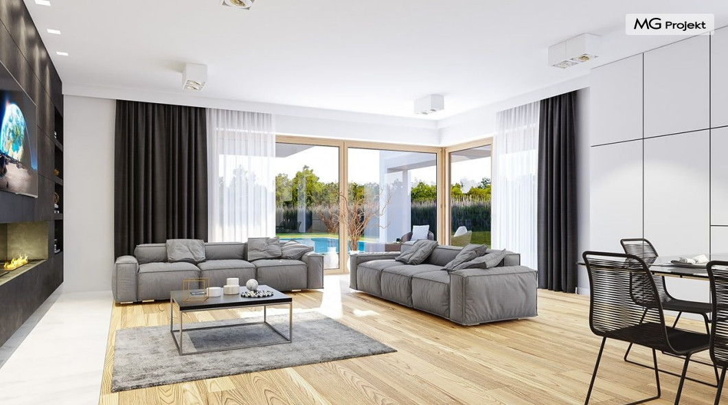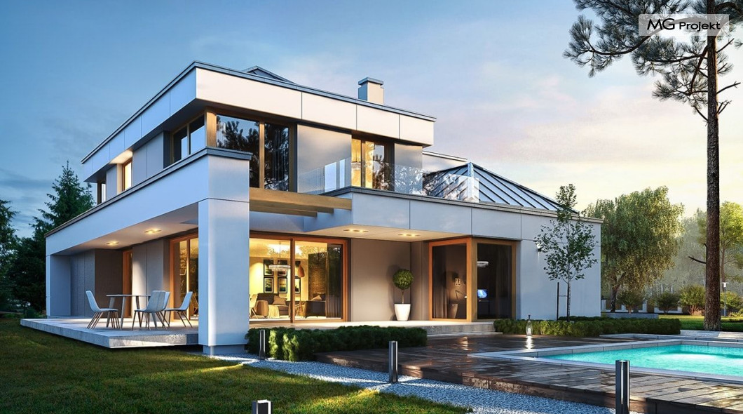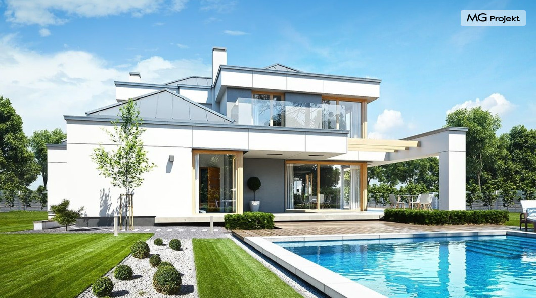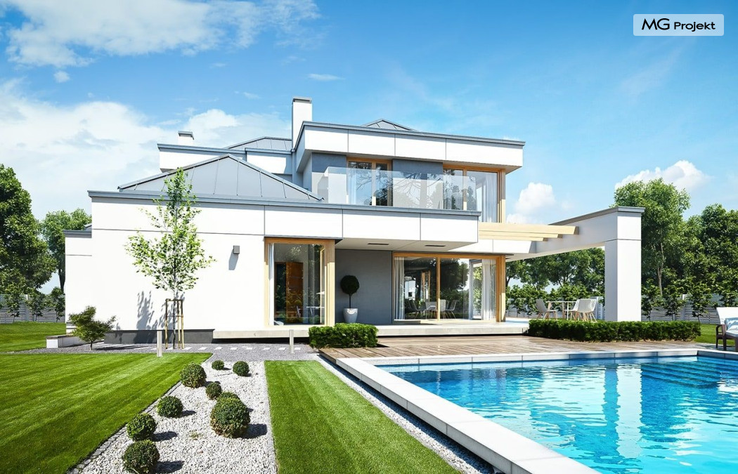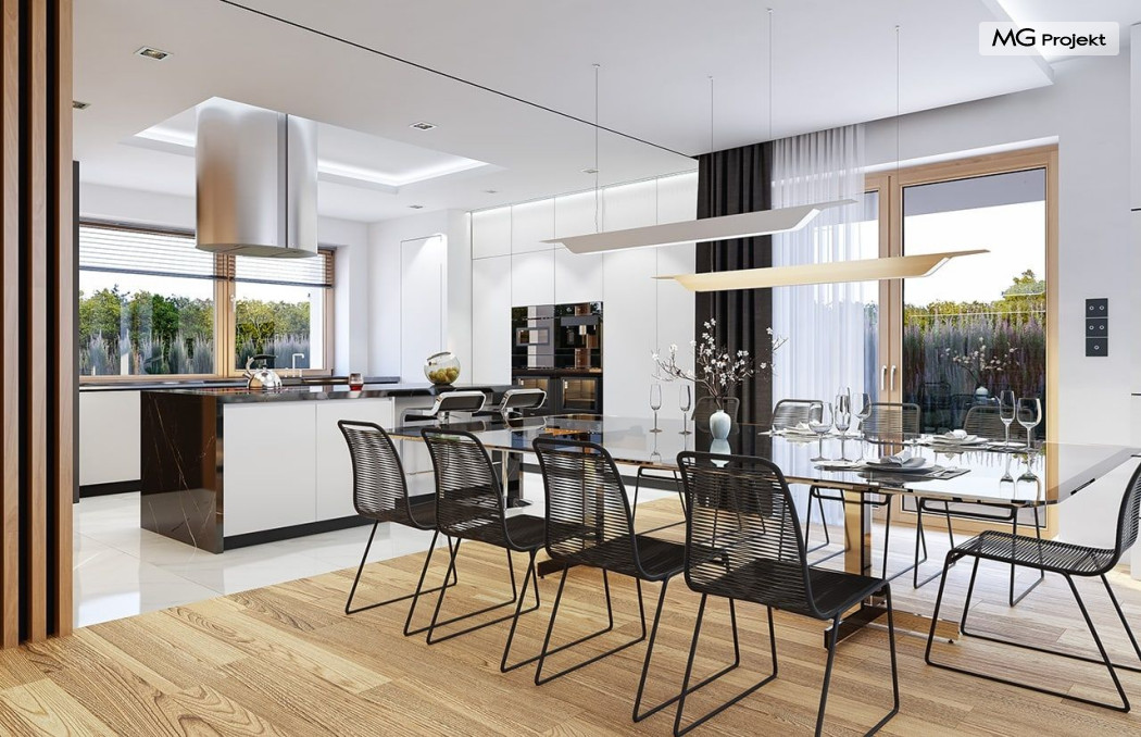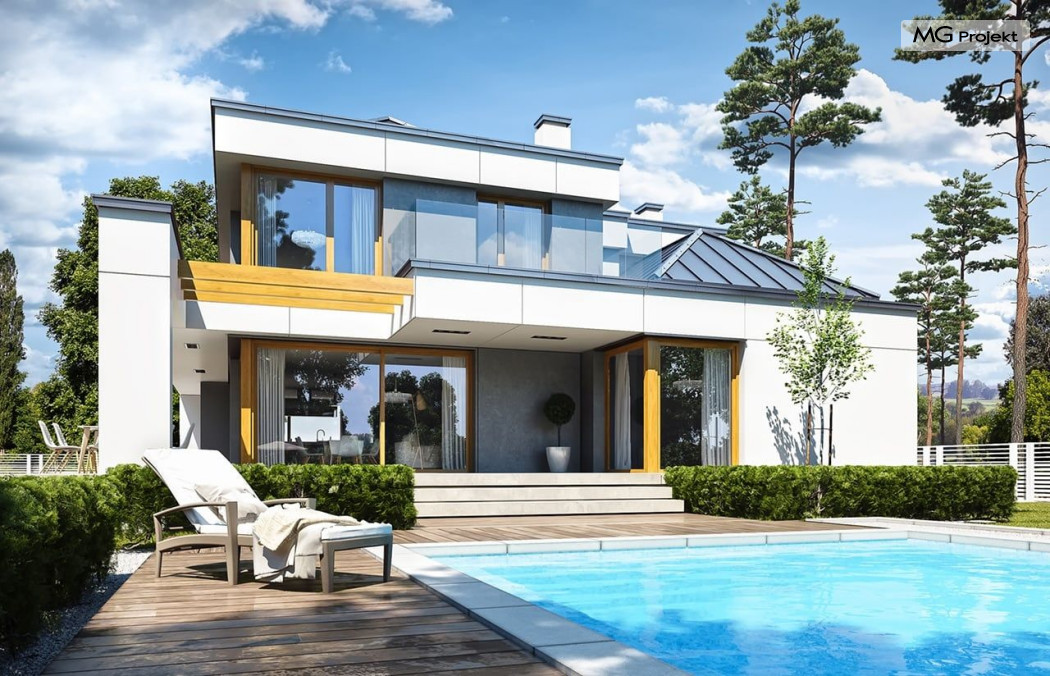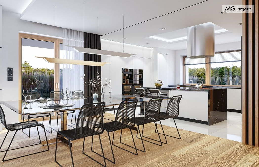 Projekt domu Willa Floryda 3 jest naszą kolejną propozycją projektu z serii nowoczesnych rezydencji Willa Floryda. Dom estetycznie i architektonicznie nawiązuje do serii "Floryd", natomiast układ funkcjonalny i wygląd są zupełnie inne. Budynek jest piętrowy, z dwukondygnacyjnym rdzeniem obudowanym parterowymi częściami od frontu i z tyłu. Dzięki temu bryła jest bardzo urozmaicona i wygląda lekko. Rezydencja Willa Floryda 3 łączy w sobie zalety budynku piętrowego i parterowego, będącego blisko ogrodu i w ludzkiej skali. Elewacje podzielono na poziome pasy: ciemne pasy w grubości kondygnacji i okien, oraz kontrastujące białe pasy w grubości stropów. Jasne części elewacji wystają do przodu, natomiast ciemniejsze fragmenty ścian chowają się, dzięki czemu bryła jest ciekawsza i bardziej rozrzeźbiona. Wejście do domu Willa Floryda 3 zaakcentowane jest pięknym podcieniem, oraz masywną ścianą wykończoną kamieniem, lub betonem architektonicznym. Narożne okno kuchni i przeszklenia piętra dodają frontowi domu lekkości i transparentności. W prawdziwy sposób dom otwiera swoje wnętrze od strony ogrodu. Narożne przeszklenia salonu i sypialni u góry łączą wnętrze z ogrodem. Jednocześnie podcień i pergola oparta na wystającym słupie i podciągu tworzą wewnętrzną przestrzeń tarasową - swoiste patio chroniące prywatność mieszkańców. Nowoczesna sylwetka domu z pewnością wyróżni tą piękną rezydencję z otaczającej nudnej zabudowy. Parter domu Willa Floryda 3 zaprojektowano na planie zbliżonym do kwadratu. Do budynku wchodzimy przez obszerny przedsionek z szatnią, połączony z garażem z jednej strony i spiżarnią i kuchnią z drugiej. W ten sposób zarówno wejście do domu piechotą, jak i przyjazd autem jest wygodny i prowadzi nas w to samo miejsce. Z przedsionka przedostajemy się do holu, z reprezentacyjnymi schodami po prawej i otwartą dużą przestrzenią dzienną po lewej stronie. Pokój dzienny, jadalnia i kuchnia z wyspą łączą się we wspólną niemal 90ciometrową powierzchnię. Salon otwiera się na narożny taras w kształcie litery "L". Na parterze mamy jeszcze dodatkową przestrzeń - dwa pokoje o dowolnym przeznaczeniu - rzadkość w piętrowych domach. Mogą to być sypialnie, lub pokoje do pracy czy rekreacji. Albo może to być wydzielone dodatkowe mieszkanko dla seniorów, lub gosposi. Przestrzeń do dowolnej aranżacji. Z domu Willa Floryda 3 i z garażu dostajemy się też do dużego pomieszczenia gospodarczego - kotłowni. Piętro domu to trzy sypialnie: apartament rodziców z własnymi garderobami i łazienką, oraz sypialnie dzieci z szafami wbudowanymi i łazienką dostępną z holu. Na piętrze mamy też pralnię. Hol piętra połączony jest z parterem otworem schodów, oraz niewielką dziurą w stropie. Projekt domu Willa Floryda 3 jest nowoczesny, luksusowy i komfortowy. Oczywiście projekt Willa Floryda 3 jest budynkiem energooszczędnym - dzięki zastosowanym materiałom i instalacjom. Zapraszamy do zapoznania się z pełną ofertą pracowni MG Projekt: Willa Floryda 2, Willa Floryda, Willa Floryda 4, Rezydencja Floryda, Rezydencja Floryda 2.