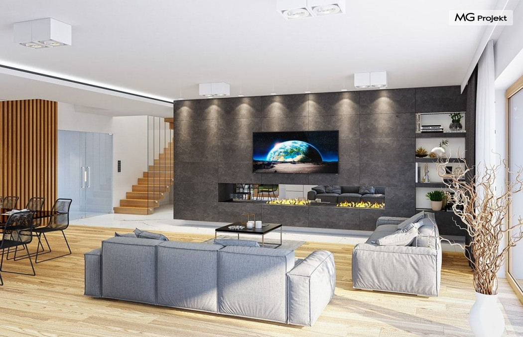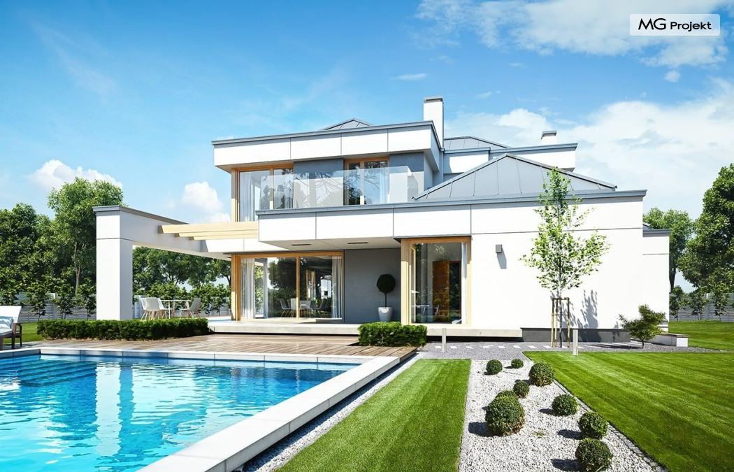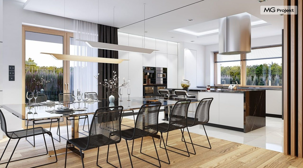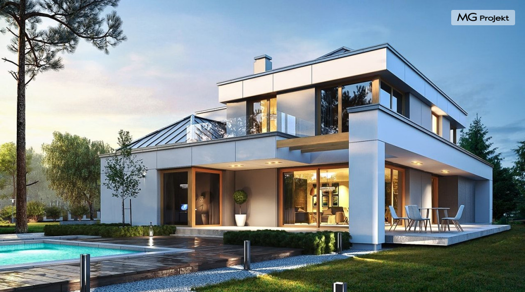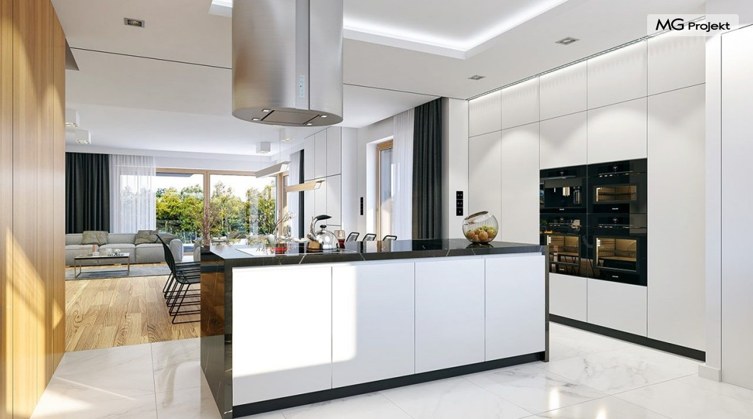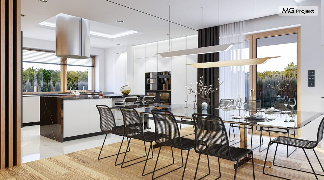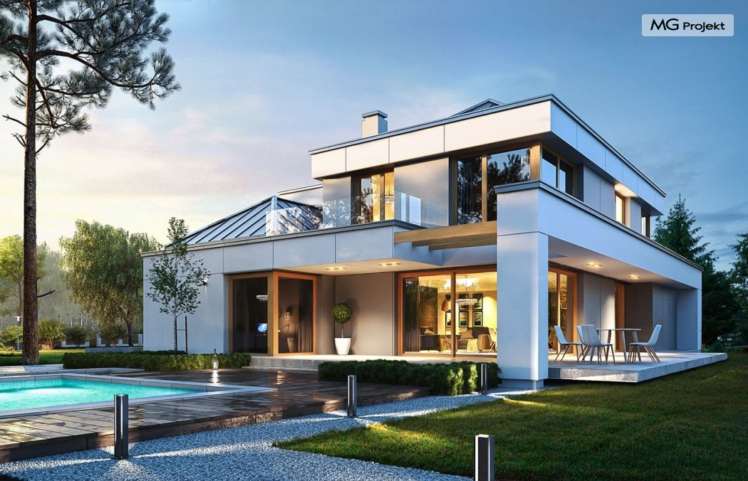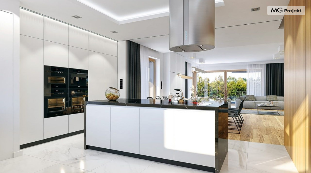 Projekt domu Willa Floryda 3 jest naszą kolejną propozycją projektu z serii nowoczesnych rezydencji Willa Floryda. Dom estetycznie i architektonicznie nawiązuje do serii "Floryd", natomiast układ funkcjonalny i wygląd są zupełnie inne. Budynek jest piętrowy, z dwukondygnacyjnym rdzeniem obudowanym parterowymi częściami od frontu i z tyłu. Dzięki temu bryła jest bardzo urozmaicona i wygląda lekko. Rezydencja Willa Floryda 3 łączy w sobie zalety budynku piętrowego i parterowego, będącego blisko ogrodu i w ludzkiej skali. Elewacje podzielono na poziome pasy: ciemne pasy w grubości kondygnacji i okien, oraz kontrastujące białe pasy w grubości stropów. Jasne części elewacji wystają do przodu, natomiast ciemniejsze fragmenty ścian chowają się, dzięki czemu bryła jest ciekawsza i bardziej rozrzeźbiona. Wejście do domu Willa Floryda 3 zaakcentowane jest pięknym podcieniem, oraz masywną ścianą wykończoną kamieniem, lub betonem architektonicznym. Narożne okno kuchni i przeszklenia piętra dodają frontowi domu lekkości i transparentności. W prawdziwy sposób dom otwiera swoje wnętrze od strony ogrodu. Narożne przeszklenia salonu i sypialni u góry łączą wnętrze z ogrodem. Jednocześnie podcień i pergola oparta na wystającym słupie i podciągu tworzą wewnętrzną przestrzeń tarasową - swoiste patio chroniące prywatność mieszkańców. Nowoczesna sylwetka domu z pewnością wyróżni tą piękną rezydencję z otaczającej nudnej zabudowy. Parter domu Willa Floryda 3 zaprojektowano na planie zbliżonym do kwadratu. Do budynku wchodzimy przez obszerny przedsionek z szatnią, połączony z garażem z jednej strony i spiżarnią i kuchnią z drugiej. W ten sposób zarówno wejście do domu piechotą, jak i przyjazd autem jest wygodny i prowadzi nas w to samo miejsce. Z przedsionka przedostajemy się do holu, z reprezentacyjnymi schodami po prawej i otwartą dużą przestrzenią dzienną po lewej stronie. Pokój dzienny, jadalnia i kuchnia z wyspą łączą się we wspólną niemal 90ciometrową powierzchnię. Salon otwiera się na narożny taras w kształcie litery "L". Na parterze mamy jeszcze dodatkową przestrzeń - dwa pokoje o dowolnym przeznaczeniu - rzadkość w piętrowych domach. Mogą to być sypialnie, lub pokoje do pracy czy rekreacji. Albo może to być wydzielone dodatkowe mieszkanko dla seniorów, lub gosposi. Przestrzeń do dowolnej aranżacji. Z domu Willa Floryda 3 i z garażu dostajemy się też do dużego pomieszczenia gospodarczego - kotłowni. Piętro domu to trzy sypialnie: apartament rodziców z własnymi garderobami i łazienką, oraz sypialnie dzieci z szafami wbudowanymi i łazienką dostępną z holu. Na piętrze mamy też pralnię. Hol piętra połączony jest z parterem otworem schodów, oraz niewielką dziurą w stropie. Projekt domu Willa Floryda 3 jest nowoczesny, luksusowy i komfortowy. Oczywiście projekt Willa Floryda 3 jest budynkiem energooszczędnym - dzięki zastosowanym materiałom i instalacjom. Zapraszamy do zapoznania się z pełną ofertą pracowni MG Projekt: Willa Floryda 2, Willa Floryda, Willa Floryda 4, Rezydencja Floryda, Rezydencja Floryda 2.