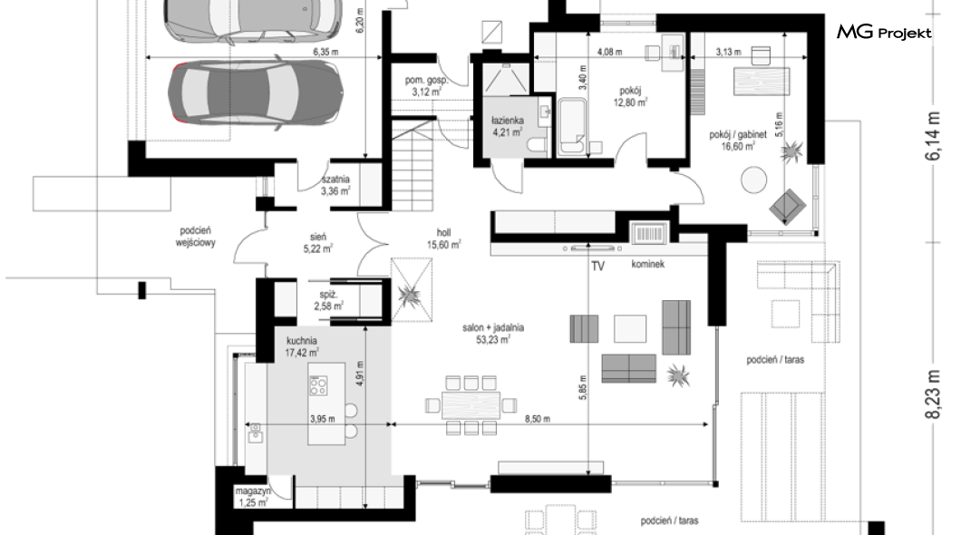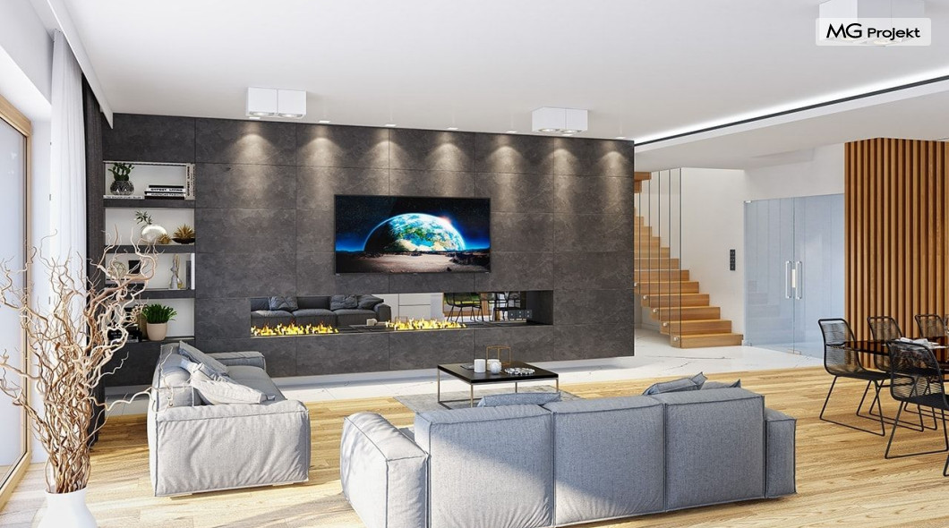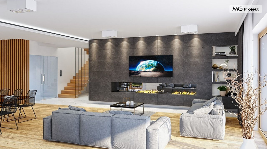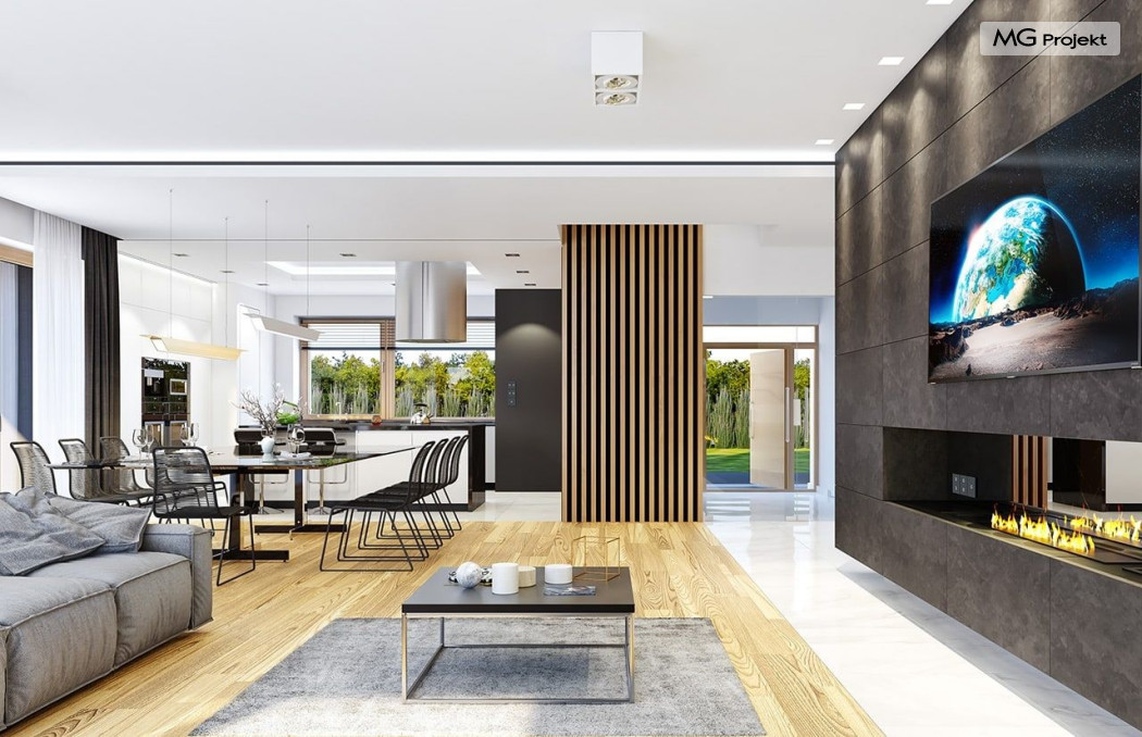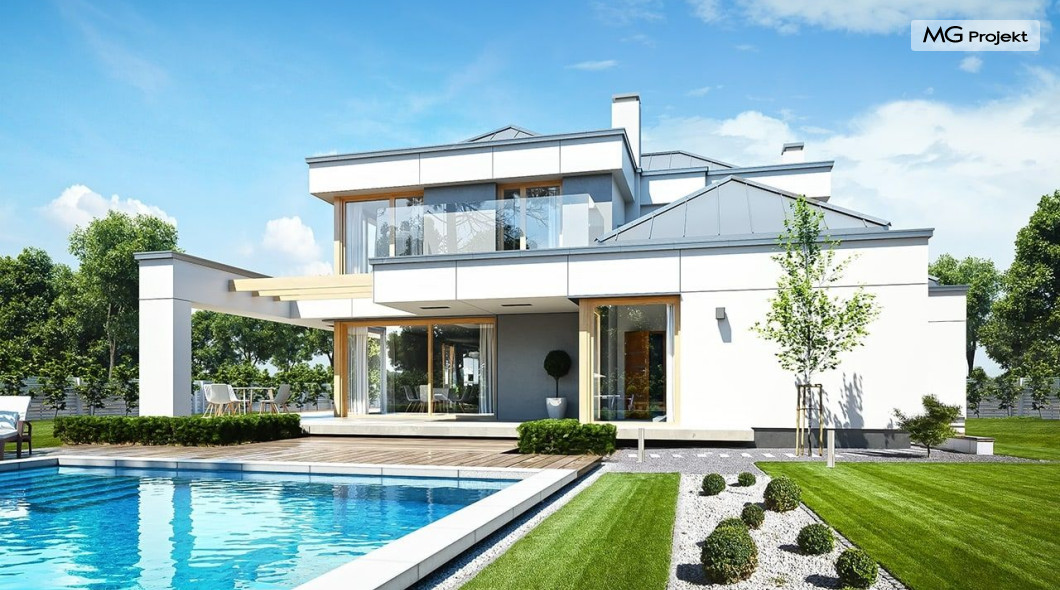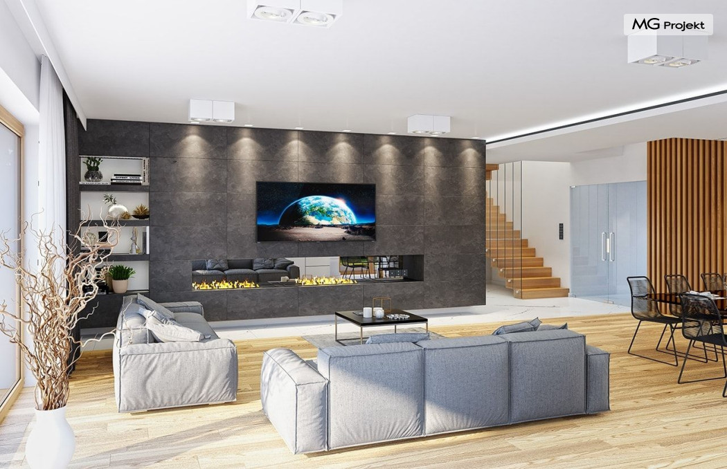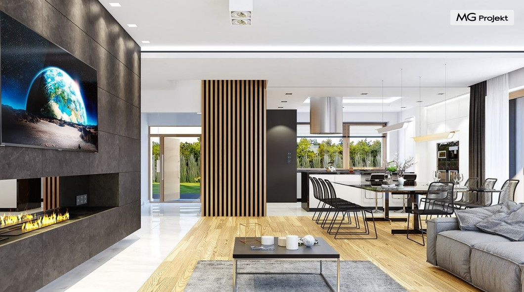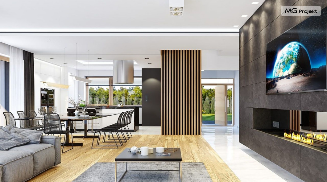 Projekt domu Willa Floryda 3 jest naszą kolejną propozycją projektu z serii nowoczesnych rezydencji Willa Floryda. Dom estetycznie i architektonicznie nawiązuje do serii "Floryd", natomiast układ funkcjonalny i wygląd są zupełnie inne. Budynek jest piętrowy, z dwukondygnacyjnym rdzeniem obudowanym parterowymi częściami od frontu i z tyłu. Dzięki temu bryła jest bardzo urozmaicona i wygląda lekko. Rezydencja Willa Floryda 3 łączy w sobie zalety budynku piętrowego i parterowego, będącego blisko ogrodu i w ludzkiej skali. Elewacje podzielono na poziome pasy: ciemne pasy w grubości kondygnacji i okien, oraz kontrastujące białe pasy w grubości stropów. Jasne części elewacji wystają do przodu, natomiast ciemniejsze fragmenty ścian chowają się, dzięki czemu bryła jest ciekawsza i bardziej rozrzeźbiona. Wejście do domu Willa Floryda 3 zaakcentowane jest pięknym podcieniem, oraz masywną ścianą wykończoną kamieniem, lub betonem architektonicznym. Narożne okno kuchni i przeszklenia piętra dodają frontowi domu lekkości i transparentności. W prawdziwy sposób dom otwiera swoje wnętrze od strony ogrodu. Narożne przeszklenia salonu i sypialni u góry łączą wnętrze z ogrodem. Jednocześnie podcień i pergola oparta na wystającym słupie i podciągu tworzą wewnętrzną przestrzeń tarasową - swoiste patio chroniące prywatność mieszkańców. Nowoczesna sylwetka domu z pewnością wyróżni tą piękną rezydencję z otaczającej nudnej zabudowy. Parter domu Willa Floryda 3 zaprojektowano na planie zbliżonym do kwadratu. Do budynku wchodzimy przez obszerny przedsionek z szatnią, połączony z garażem z jednej strony i spiżarnią i kuchnią z drugiej. W ten sposób zarówno wejście do domu piechotą, jak i przyjazd autem jest wygodny i prowadzi nas w to samo miejsce. Z przedsionka przedostajemy się do holu, z reprezentacyjnymi schodami po prawej i otwartą dużą przestrzenią dzienną po lewej stronie. Pokój dzienny, jadalnia i kuchnia z wyspą łączą się we wspólną niemal 90ciometrową powierzchnię. Salon otwiera się na narożny taras w kształcie litery "L". Na parterze mamy jeszcze dodatkową przestrzeń - dwa pokoje o dowolnym przeznaczeniu - rzadkość w piętrowych domach. Mogą to być sypialnie, lub pokoje do pracy czy rekreacji. Albo może to być wydzielone dodatkowe mieszkanko dla seniorów, lub gosposi. Przestrzeń do dowolnej aranżacji. Z domu Willa Floryda 3 i z garażu dostajemy się też do dużego pomieszczenia gospodarczego - kotłowni. Piętro domu to trzy sypialnie: apartament rodziców z własnymi garderobami i łazienką, oraz sypialnie dzieci z szafami wbudowanymi i łazienką dostępną z holu. Na piętrze mamy też pralnię. Hol piętra połączony jest z parterem otworem schodów, oraz niewielką dziurą w stropie. Projekt domu Willa Floryda 3 jest nowoczesny, luksusowy i komfortowy. Oczywiście projekt Willa Floryda 3 jest budynkiem energooszczędnym - dzięki zastosowanym materiałom i instalacjom. Zapraszamy do zapoznania się z pełną ofertą pracowni MG Projekt: Willa Floryda 2, Willa Floryda, Willa Floryda 4, Rezydencja Floryda, Rezydencja Floryda 2.