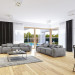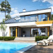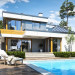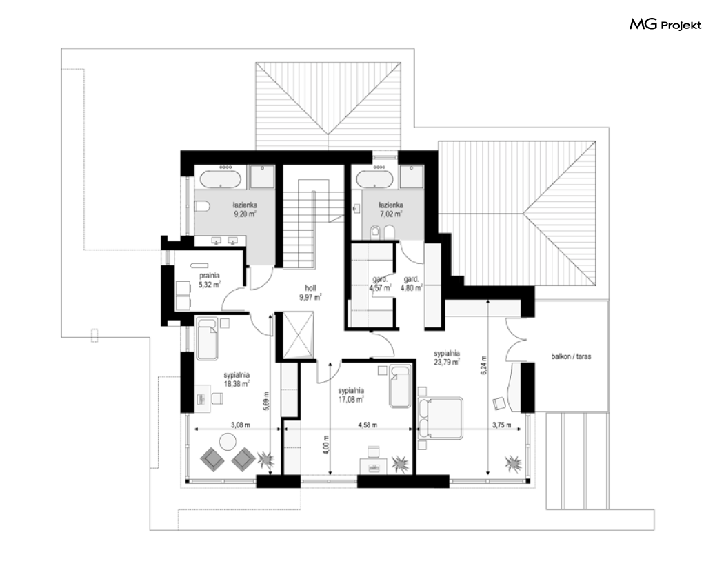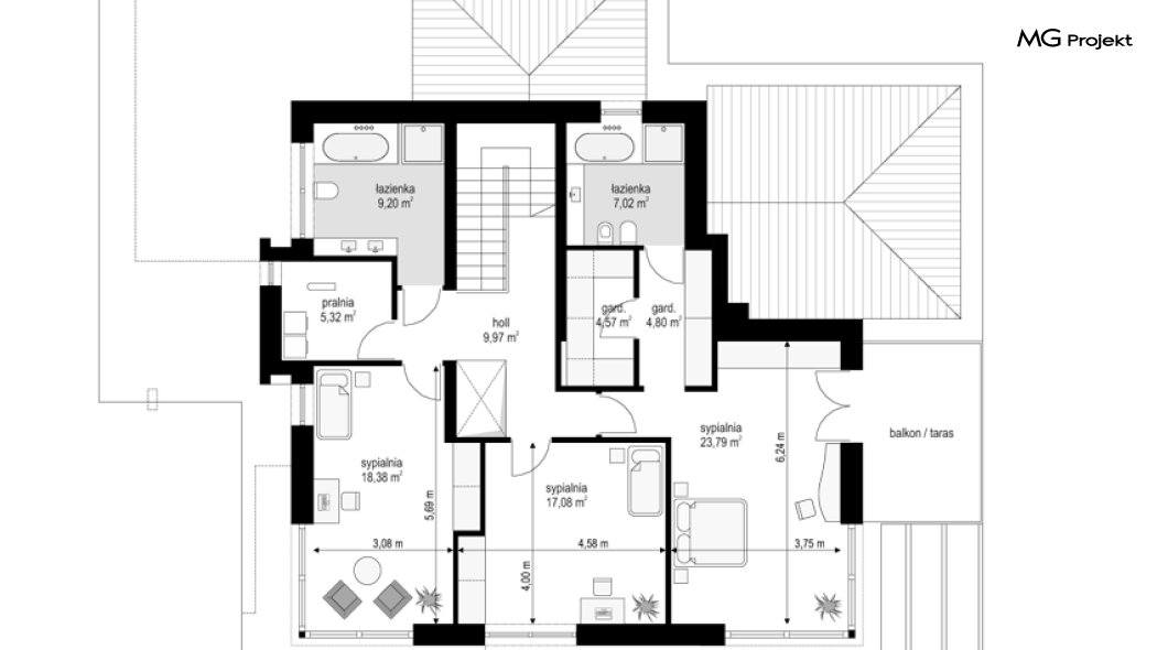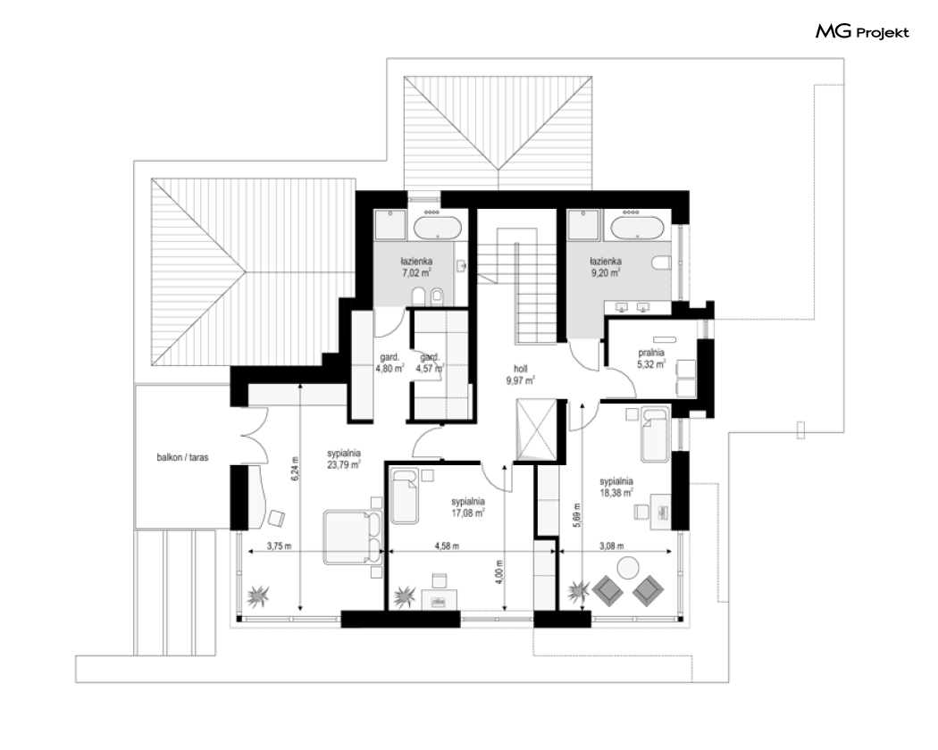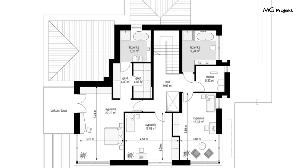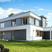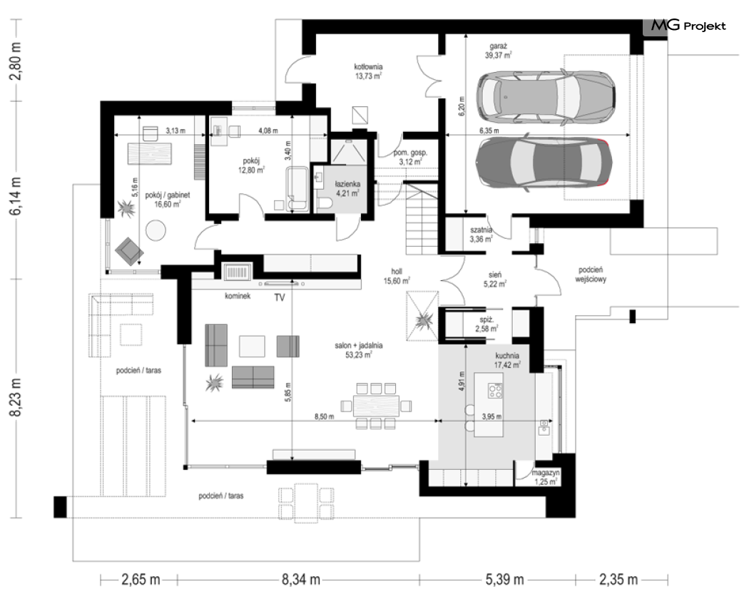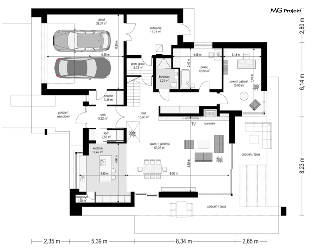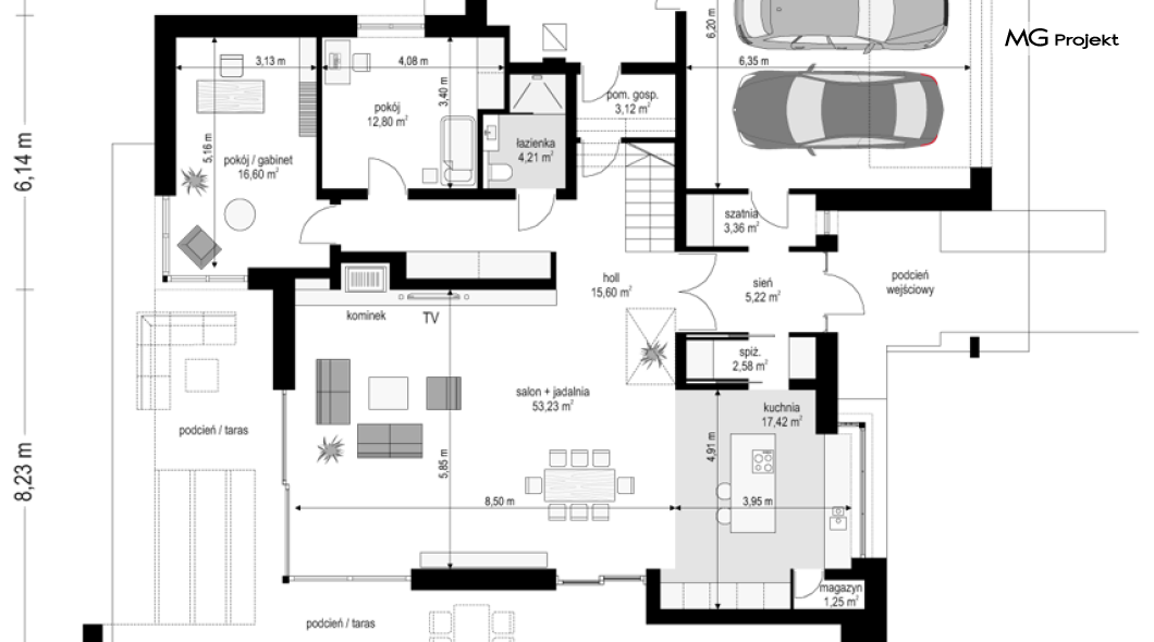 Projekt domu Willa Floryda 3 jest naszą kolejną propozycją projektu z serii nowoczesnych rezydencji Willa Floryda. Dom estetycznie i architektonicznie nawiązuje do serii "Floryd", natomiast układ funkcjonalny i wygląd są zupełnie inne. Budynek jest piętrowy, z dwukondygnacyjnym rdzeniem obudowanym parterowymi częściami od frontu i z tyłu. Dzięki temu bryła jest bardzo urozmaicona i wygląda lekko. Rezydencja Willa Floryda 3 łączy w sobie zalety budynku piętrowego i parterowego, będącego blisko ogrodu i w ludzkiej skali. Elewacje podzielono na poziome pasy: ciemne pasy w grubości kondygnacji i okien, oraz kontrastujące białe pasy w grubości stropów. Jasne części elewacji wystają do przodu, natomiast ciemniejsze fragmenty ścian chowają się, dzięki czemu bryła jest ciekawsza i bardziej rozrzeźbiona. Wejście do domu Willa Floryda 3 zaakcentowane jest pięknym podcieniem, oraz masywną ścianą wykończoną kamieniem, lub betonem architektonicznym. Narożne okno kuchni i przeszklenia piętra dodają frontowi domu lekkości i transparentności. W prawdziwy sposób dom otwiera swoje wnętrze od strony ogrodu. Narożne przeszklenia salonu i sypialni u góry łączą wnętrze z ogrodem. Jednocześnie podcień i pergola oparta na wystającym słupie i podciągu tworzą wewnętrzną przestrzeń tarasową - swoiste patio chroniące prywatność mieszkańców. Nowoczesna sylwetka domu z pewnością wyróżni tą piękną rezydencję z otaczającej nudnej zabudowy. Parter domu Willa Floryda 3 zaprojektowano na planie zbliżonym do kwadratu. Do budynku wchodzimy przez obszerny przedsionek z szatnią, połączony z garażem z jednej strony i spiżarnią i kuchnią z drugiej. W ten sposób zarówno wejście do domu piechotą, jak i przyjazd autem jest wygodny i prowadzi nas w to samo miejsce. Z przedsionka przedostajemy się do holu, z reprezentacyjnymi schodami po prawej i otwartą dużą przestrzenią dzienną po lewej stronie. Pokój dzienny, jadalnia i kuchnia z wyspą łączą się we wspólną niemal 90ciometrową powierzchnię. Salon otwiera się na narożny taras w kształcie litery "L". Na parterze mamy jeszcze dodatkową przestrzeń - dwa pokoje o dowolnym przeznaczeniu - rzadkość w piętrowych domach. Mogą to być sypialnie, lub pokoje do pracy czy rekreacji. Albo może to być wydzielone dodatkowe mieszkanko dla seniorów, lub gosposi. Przestrzeń do dowolnej aranżacji. Z domu Willa Floryda 3 i z garażu dostajemy się też do dużego pomieszczenia gospodarczego - kotłowni. Piętro domu to trzy sypialnie: apartament rodziców z własnymi garderobami i łazienką, oraz sypialnie dzieci z szafami wbudowanymi i łazienką dostępną z holu. Na piętrze mamy też pralnię. Hol piętra połączony jest z parterem otworem schodów, oraz niewielką dziurą w stropie. Projekt domu Willa Floryda 3 jest nowoczesny, luksusowy i komfortowy. Oczywiście projekt Willa Floryda 3 jest budynkiem energooszczędnym - dzięki zastosowanym materiałom i instalacjom. Zapraszamy do zapoznania się z pełną ofertą pracowni MG Projekt: Willa Floryda 2, Willa Floryda, Willa Floryda 4, Rezydencja Floryda, Rezydencja Floryda 2.