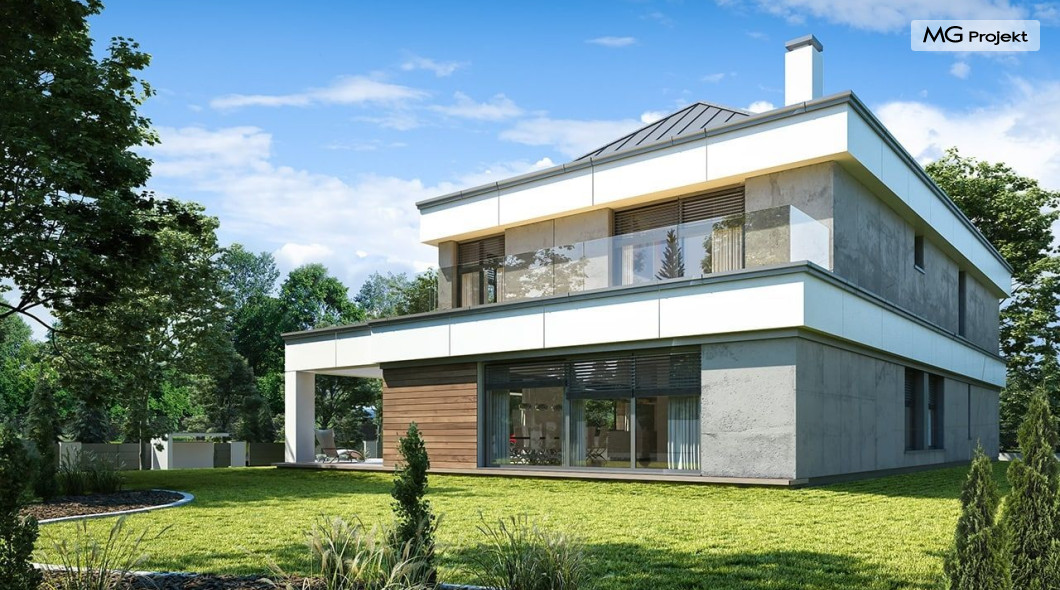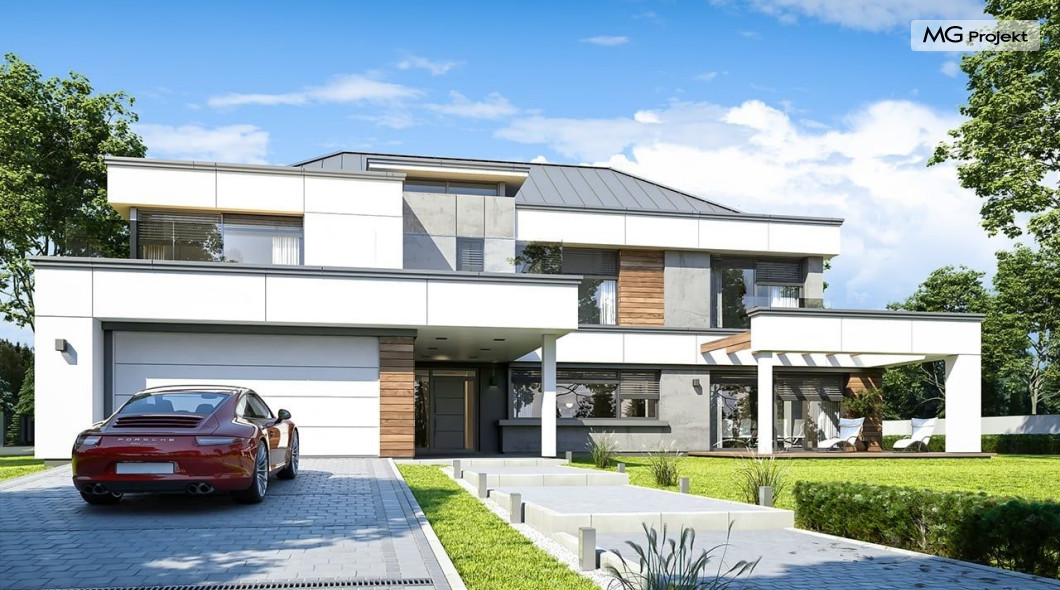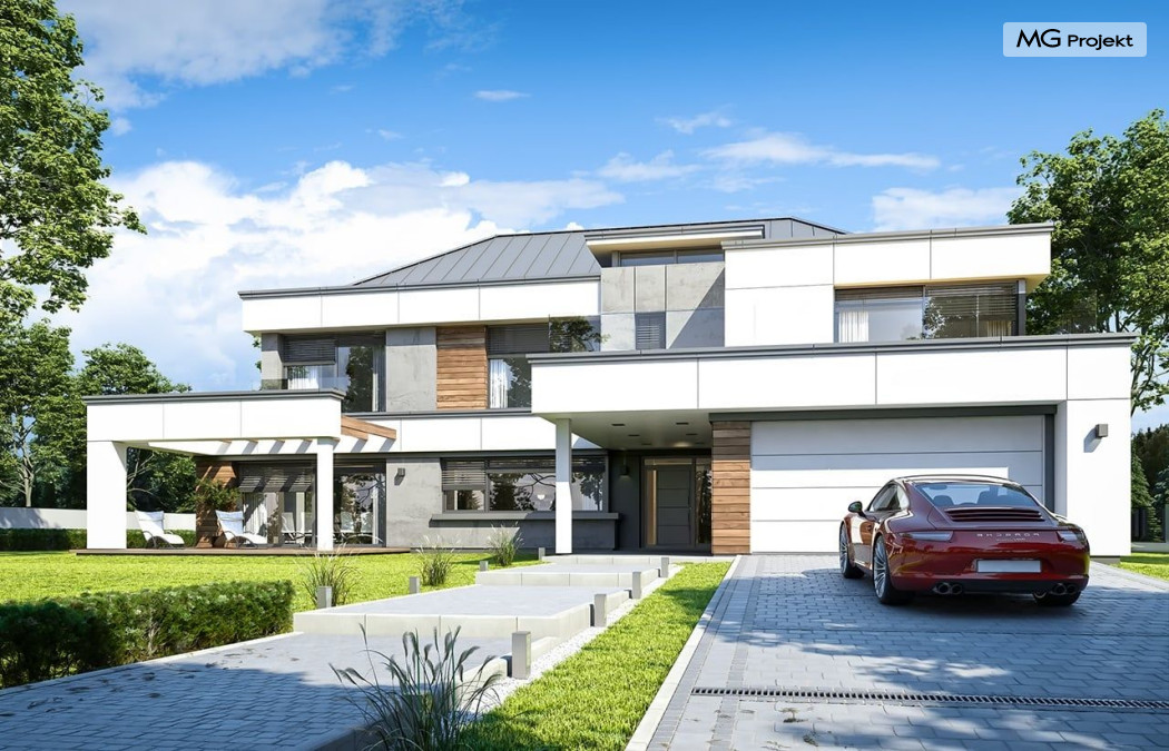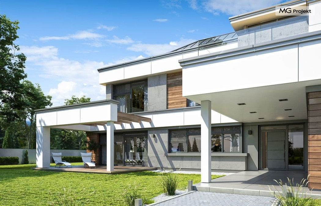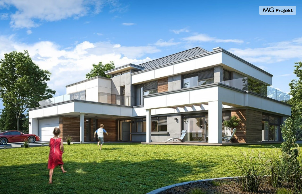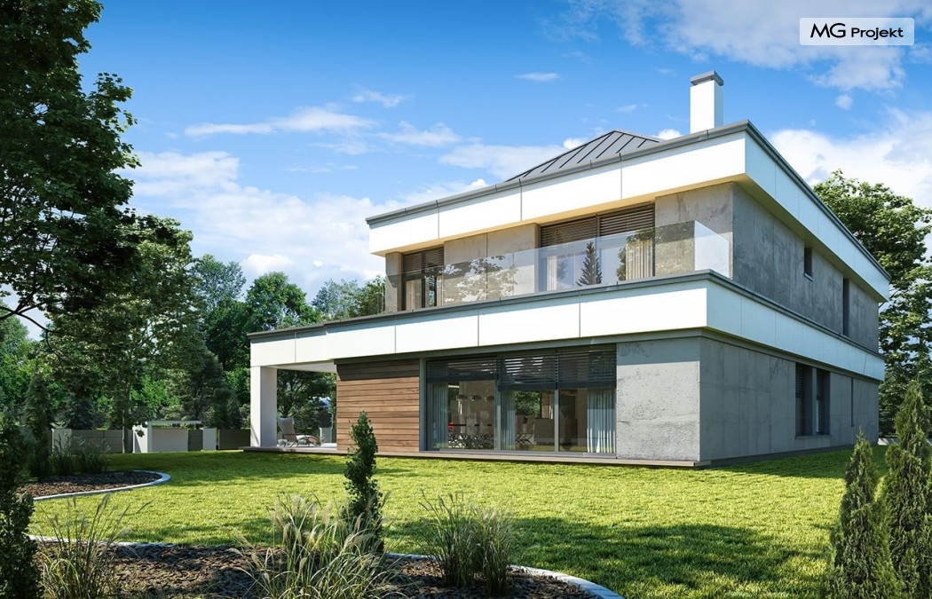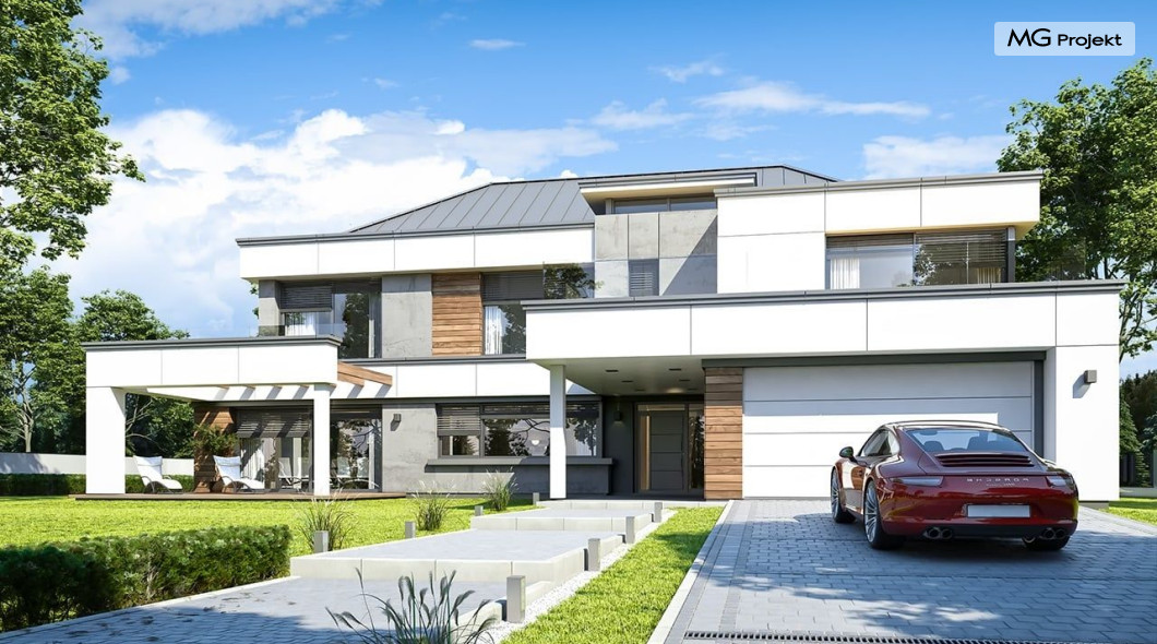 Projekt domu Willa Floryda 4 jest kolejną propozycją domu z serii Willa Floryda - cieszących się dużym zainteresowaniem Klientów. Projekt Willa Floryda 4 został oparty o język detali i formę podobną do pozostałych "Floryd", ale z własnym przemyślanym programem funkcjonalnym i założeniami. Najważniejszym jest przeznaczenie domu na działkę z wjazdem od południa, lub o wschodu. Zarówno strefa wjazdowa i wejściowa do budynku, jak i część ogrodowa znajdują się w zasadzie po tej samej stronie. Ogród jest przed oraz z boku domu. Dzięki sensownie zaplanowanym wnętrzom wszystkie pokoje są umieszczone od słonecznej strony. Budynek Willa Floryda 4 zaprojektowano jako nowoczesną piętrową willę, z dużymi oknami , elewacjami podzielonymi poziomymi pasami, wykończonymi okładzinami z betonu architektonicznego, tynku i drewna. Projekt domu Willa Floryda 4 składa się z zasadniczej dwukondygnacyjnej bryły, przykrytej łagodnym dachem krytym blachę na rąbek, oraz dobudowanej do niej bryły garażu. Wejście do domu podkreślone jest podcieniem, oraz wykuszem z płaskim daszkiem wystającym z elewacji nad wejściem, na piętrze. Wnętrze domu Willa Floryda 4 podzielono na części: na parterze część dzienną i gospodarczo - garażową, oraz na piętrze - część sypialną. Część dzienna składa się z salonu, jadalni, holu i częściowo zamkniętej kuchni, która jest centrum domu - w niej spotykają się wszyscy domownicy. Salon zdobią piękne przeszklenia na taras z pergolą i ogród, oraz trójstronny kominek. Ozdobą wnętrza jest pustka w holu i wspornikowe schody widoczne od razu po przekroczeniu drzwi wejściowych. Część gospodarczą tworzą pomieszczenia garażu, kotłowni, pralni, spiżarni, oraz szatni przy wejściu. Na parterze zaprojektowano też dodatkowy pokój (sypialnia gościnna lub gabinet), wc z natryskiem, oraz piwniczkę na wino. Na piętrze domu mamy piękny apartament rodziców, z wielką garderobą, pokojem kąpielowym z sauną, oraz tarasem z sypialni. Pozostała przestrzeń to dwa apartamenty dzieci, z łazienkami i garderobami i dostępem do tarasu, oraz pokój rekreacyjny. Nad piętrem znajduje się jeszcze spory strych. Budynek Willa Floryda 4ma dość prostą konstrukcję - mimo sporej powierzchni nie powinien być trudny ani bardzo drogi w budowie. Dzięki energooszczędnym rozwiązaniom będzie też niedrogi w eksploatacji. Zapraszamy do zapoznania się z pełną ofertą pracowni MG Projekt: Willa Floryda 2, Willa Floryda, Willa Floryda 3, Rezydencja Floryda, Rezydencja Floryda 2.