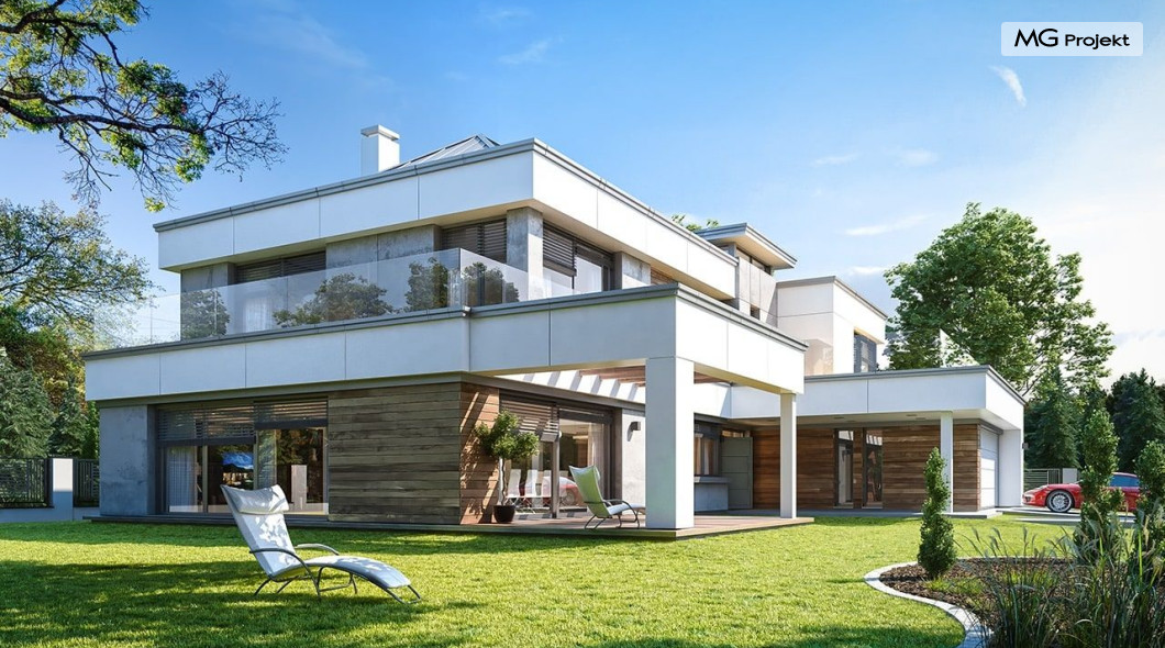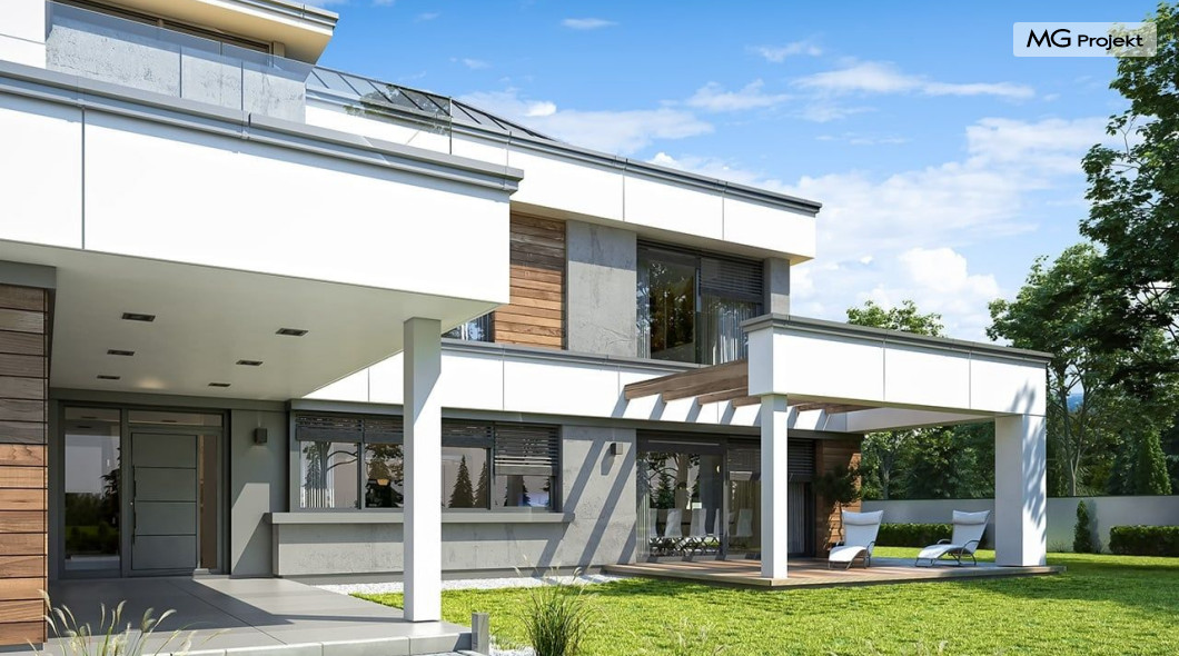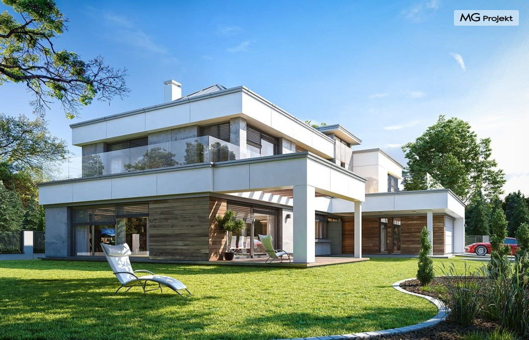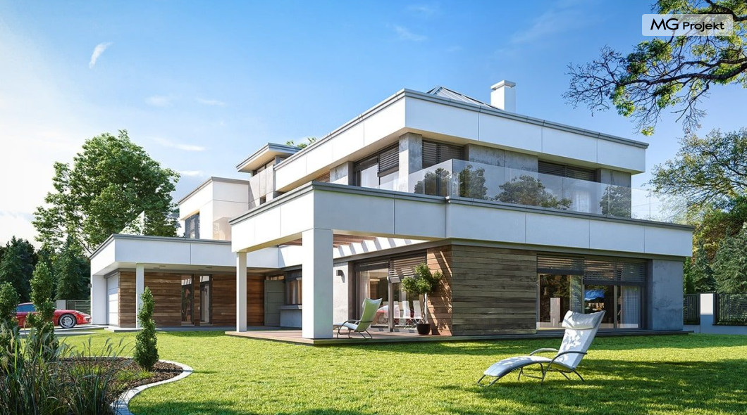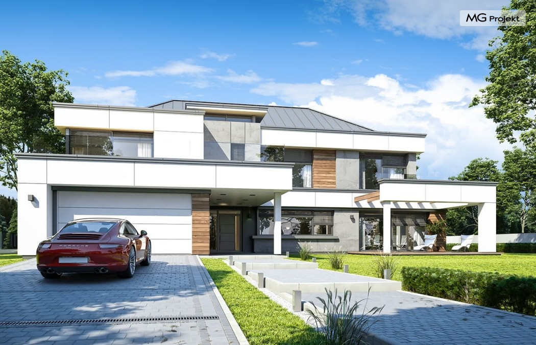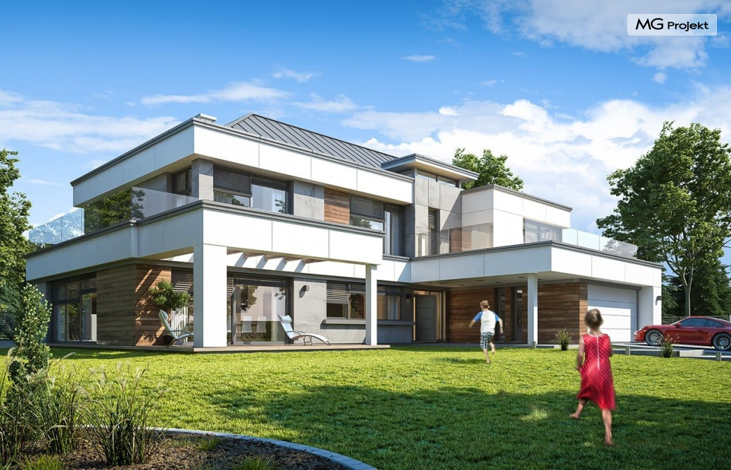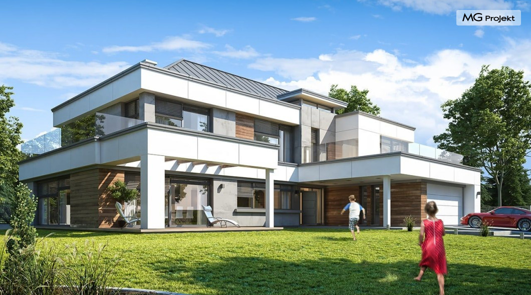Projekt domu Willa Floryda 4 jest kolejną propozycją domu z serii Willa Floryda - cieszących się dużym zainteresowaniem Klientów. Projekt Willa Floryda 4 został oparty o język detali i formę podobną do pozostałych "Floryd", ale z własnym przemyślanym programem funkcjonalnym i założeniami. Najważniejszym jest przeznaczenie domu na działkę z wjazdem od południa, lub o wschodu. Zarówno strefa wjazdowa i wejściowa do budynku, jak i część ogrodowa znajdują się w zasadzie po tej samej stronie. Ogród jest przed oraz z boku domu. Dzięki sensownie zaplanowanym wnętrzom wszystkie pokoje są umieszczone od słonecznej strony. Budynek Willa Floryda 4 zaprojektowano jako nowoczesną piętrową willę, z dużymi oknami , elewacjami podzielonymi poziomymi pasami, wykończonymi okładzinami z betonu architektonicznego, tynku i drewna. Projekt domu Willa Floryda 4 składa się z zasadniczej dwukondygnacyjnej bryły, przykrytej łagodnym dachem krytym blachę na rąbek, oraz dobudowanej do niej bryły garażu. Wejście do domu podkreślone jest podcieniem, oraz wykuszem z płaskim daszkiem wystającym z elewacji nad wejściem, na piętrze. Wnętrze domu Willa Floryda 4 podzielono na części: na parterze część dzienną i gospodarczo - garażową, oraz na piętrze - część sypialną. Część dzienna składa się z salonu, jadalni, holu i częściowo zamkniętej kuchni, która jest centrum domu - w niej spotykają się wszyscy domownicy. Salon zdobią piękne przeszklenia na taras z pergolą i ogród, oraz trójstronny kominek. Ozdobą wnętrza jest pustka w holu i wspornikowe schody widoczne od razu po przekroczeniu drzwi wejściowych. Część gospodarczą tworzą pomieszczenia garażu, kotłowni, pralni, spiżarni, oraz szatni przy wejściu. Na parterze zaprojektowano też dodatkowy pokój (sypialnia gościnna lub gabinet), wc z natryskiem, oraz piwniczkę na wino. Na piętrze domu mamy piękny apartament rodziców, z wielką garderobą, pokojem kąpielowym z sauną, oraz tarasem z sypialni. Pozostała przestrzeń to dwa apartamenty dzieci, z łazienkami i garderobami i dostępem do tarasu, oraz pokój rekreacyjny. Nad piętrem znajduje się jeszcze spory strych. Budynek Willa Floryda 4ma dość prostą konstrukcję - mimo sporej powierzchni nie powinien być trudny ani bardzo drogi w budowie. Dzięki energooszczędnym rozwiązaniom będzie też niedrogi w eksploatacji. Zapraszamy do zapoznania się z pełną ofertą pracowni MG Projekt: Willa Floryda 2, Willa Floryda, Willa Floryda 3, Rezydencja Floryda, Rezydencja Floryda 2.