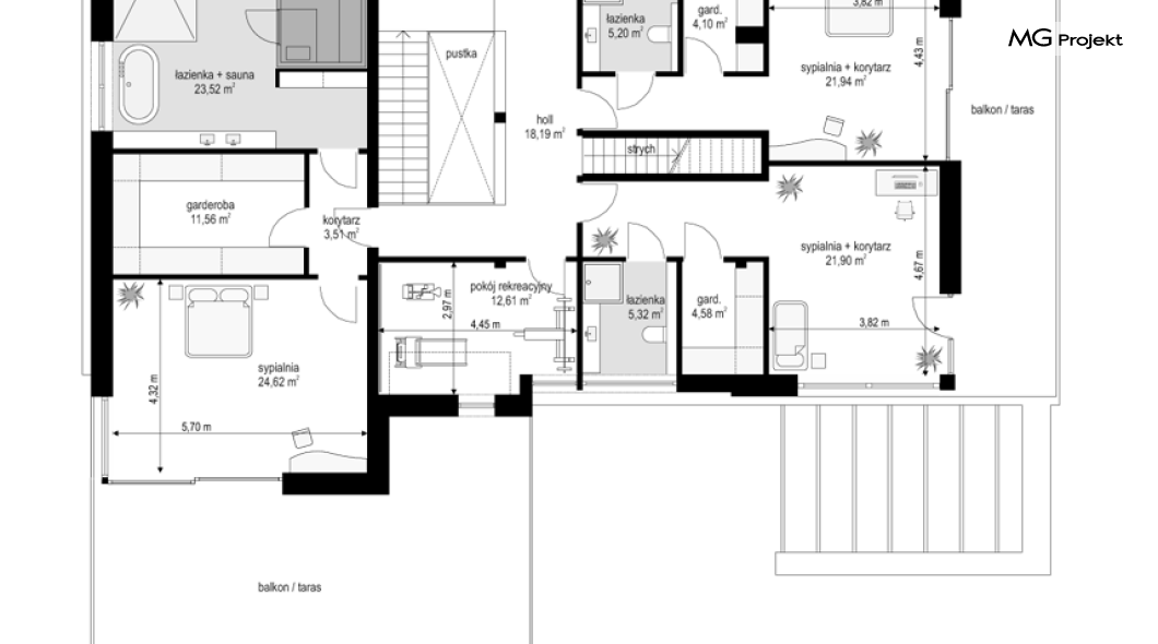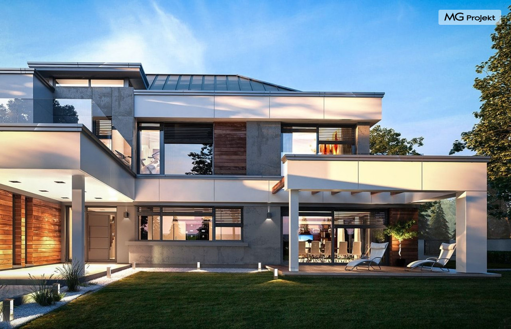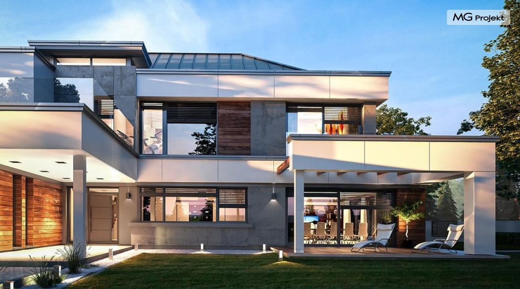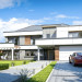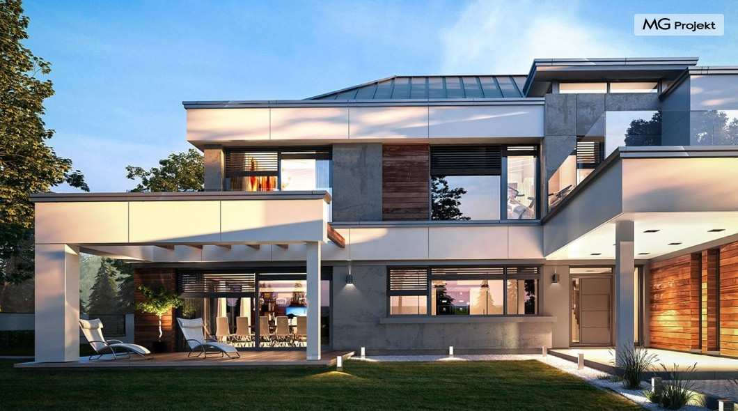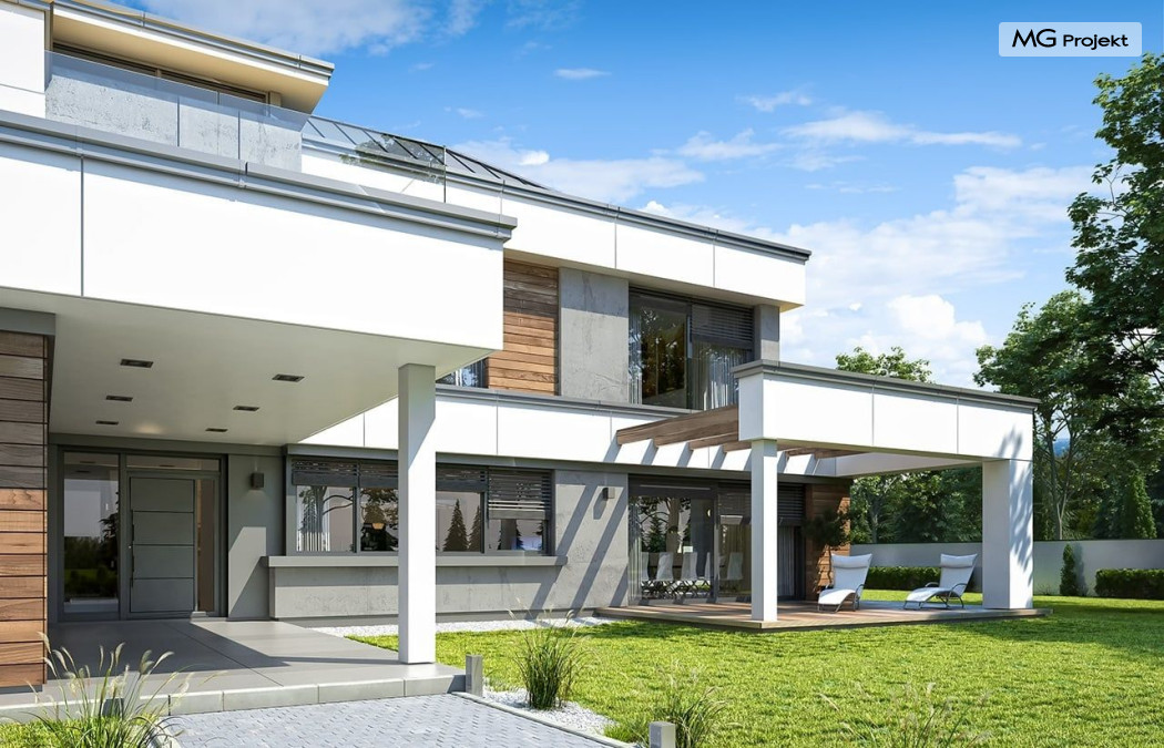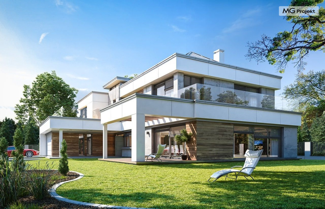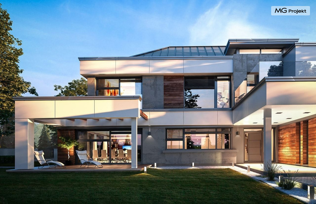 Projekt domu Willa Floryda 4 jest kolejną propozycją domu z serii Willa Floryda - cieszących się dużym zainteresowaniem Klientów. Projekt Willa Floryda 4 został oparty o język detali i formę podobną do pozostałych "Floryd", ale z własnym przemyślanym programem funkcjonalnym i założeniami. Najważniejszym jest przeznaczenie domu na działkę z wjazdem od południa, lub o wschodu. Zarówno strefa wjazdowa i wejściowa do budynku, jak i część ogrodowa znajdują się w zasadzie po tej samej stronie. Ogród jest przed oraz z boku domu. Dzięki sensownie zaplanowanym wnętrzom wszystkie pokoje są umieszczone od słonecznej strony. Budynek Willa Floryda 4 zaprojektowano jako nowoczesną piętrową willę, z dużymi oknami , elewacjami podzielonymi poziomymi pasami, wykończonymi okładzinami z betonu architektonicznego, tynku i drewna. Projekt domu Willa Floryda 4 składa się z zasadniczej dwukondygnacyjnej bryły, przykrytej łagodnym dachem krytym blachę na rąbek, oraz dobudowanej do niej bryły garażu. Wejście do domu podkreślone jest podcieniem, oraz wykuszem z płaskim daszkiem wystającym z elewacji nad wejściem, na piętrze. Wnętrze domu Willa Floryda 4 podzielono na części: na parterze część dzienną i gospodarczo - garażową, oraz na piętrze - część sypialną. Część dzienna składa się z salonu, jadalni, holu i częściowo zamkniętej kuchni, która jest centrum domu - w niej spotykają się wszyscy domownicy. Salon zdobią piękne przeszklenia na taras z pergolą i ogród, oraz trójstronny kominek. Ozdobą wnętrza jest pustka w holu i wspornikowe schody widoczne od razu po przekroczeniu drzwi wejściowych. Część gospodarczą tworzą pomieszczenia garażu, kotłowni, pralni, spiżarni, oraz szatni przy wejściu. Na parterze zaprojektowano też dodatkowy pokój (sypialnia gościnna lub gabinet), wc z natryskiem, oraz piwniczkę na wino. Na piętrze domu mamy piękny apartament rodziców, z wielką garderobą, pokojem kąpielowym z sauną, oraz tarasem z sypialni. Pozostała przestrzeń to dwa apartamenty dzieci, z łazienkami i garderobami i dostępem do tarasu, oraz pokój rekreacyjny. Nad piętrem znajduje się jeszcze spory strych. Budynek Willa Floryda 4ma dość prostą konstrukcję - mimo sporej powierzchni nie powinien być trudny ani bardzo drogi w budowie. Dzięki energooszczędnym rozwiązaniom będzie też niedrogi w eksploatacji. Zapraszamy do zapoznania się z pełną ofertą pracowni MG Projekt: Willa Floryda 2, Willa Floryda, Willa Floryda 3, Rezydencja Floryda, Rezydencja Floryda 2.