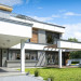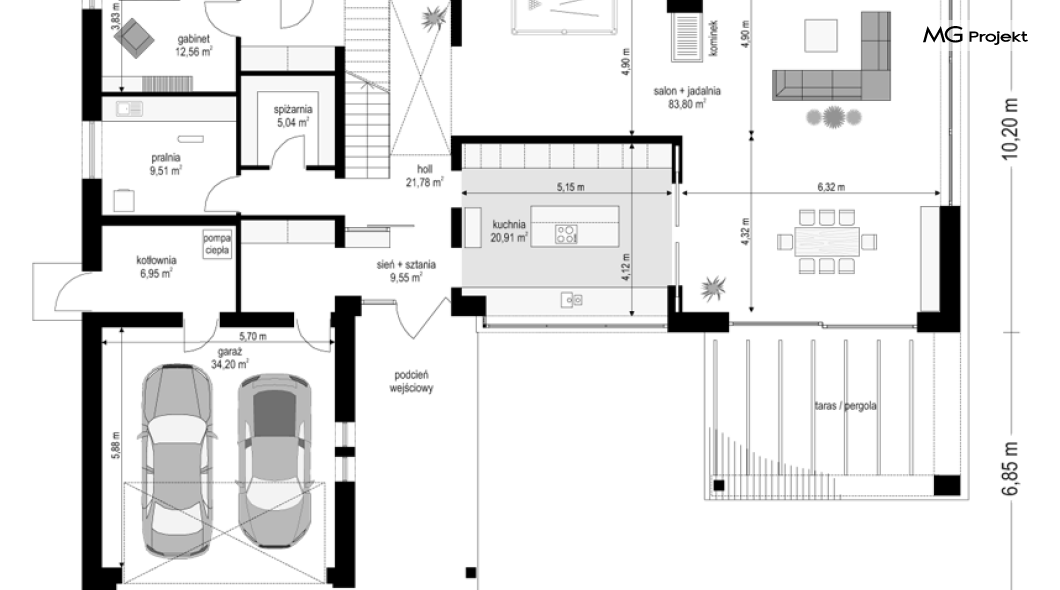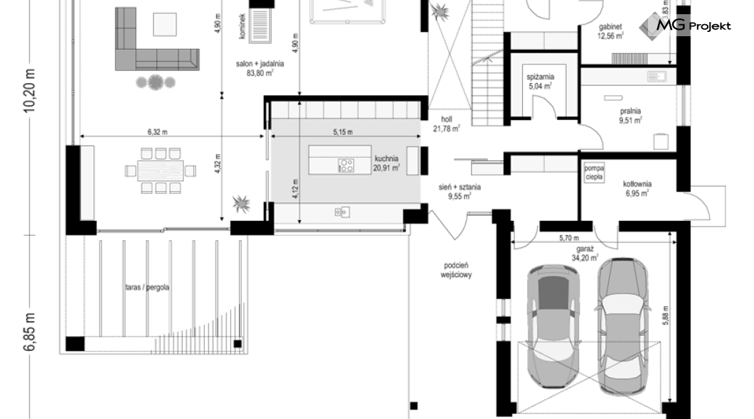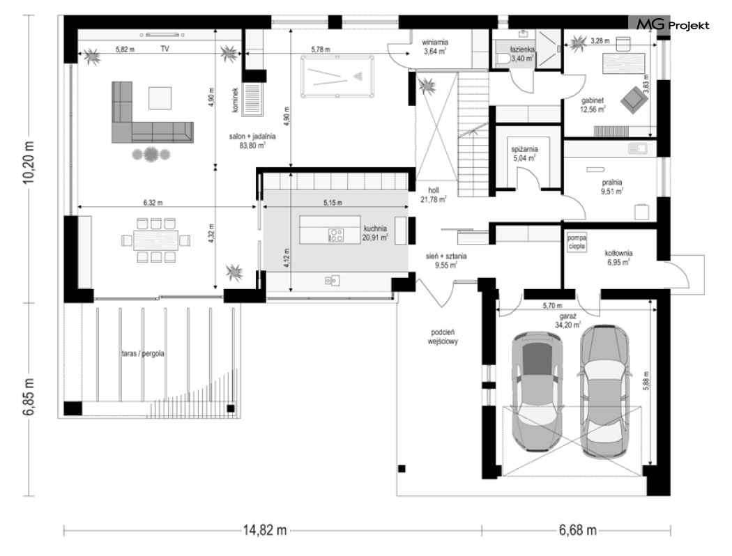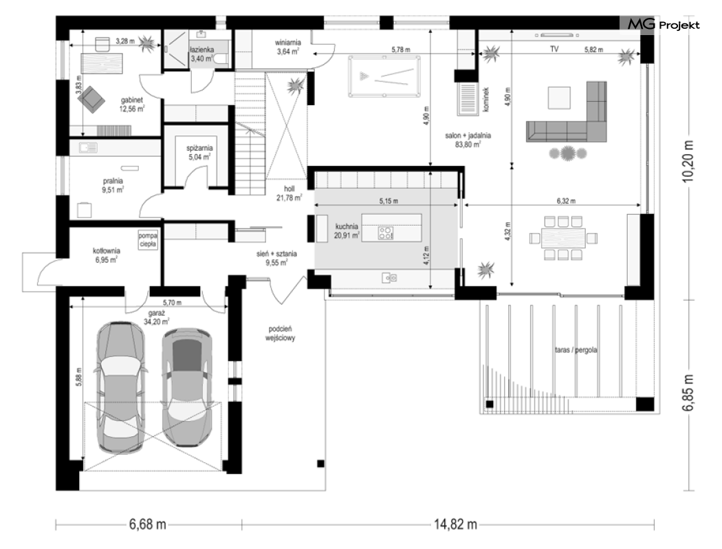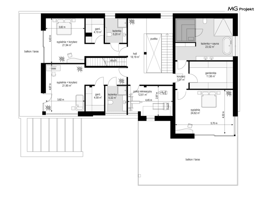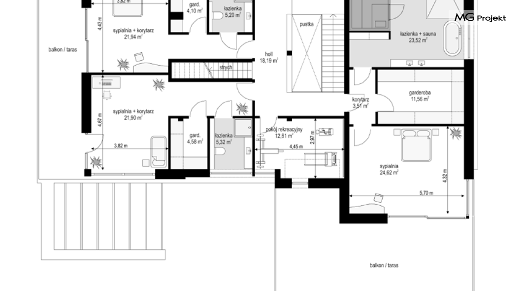 Projekt domu Willa Floryda 4 jest kolejną propozycją domu z serii Willa Floryda - cieszących się dużym zainteresowaniem Klientów. Projekt Willa Floryda 4 został oparty o język detali i formę podobną do pozostałych "Floryd", ale z własnym przemyślanym programem funkcjonalnym i założeniami. Najważniejszym jest przeznaczenie domu na działkę z wjazdem od południa, lub o wschodu. Zarówno strefa wjazdowa i wejściowa do budynku, jak i część ogrodowa znajdują się w zasadzie po tej samej stronie. Ogród jest przed oraz z boku domu. Dzięki sensownie zaplanowanym wnętrzom wszystkie pokoje są umieszczone od słonecznej strony. Budynek Willa Floryda 4 zaprojektowano jako nowoczesną piętrową willę, z dużymi oknami , elewacjami podzielonymi poziomymi pasami, wykończonymi okładzinami z betonu architektonicznego, tynku i drewna. Projekt domu Willa Floryda 4 składa się z zasadniczej dwukondygnacyjnej bryły, przykrytej łagodnym dachem krytym blachę na rąbek, oraz dobudowanej do niej bryły garażu. Wejście do domu podkreślone jest podcieniem, oraz wykuszem z płaskim daszkiem wystającym z elewacji nad wejściem, na piętrze. Wnętrze domu Willa Floryda 4 podzielono na części: na parterze część dzienną i gospodarczo - garażową, oraz na piętrze - część sypialną. Część dzienna składa się z salonu, jadalni, holu i częściowo zamkniętej kuchni, która jest centrum domu - w niej spotykają się wszyscy domownicy. Salon zdobią piękne przeszklenia na taras z pergolą i ogród, oraz trójstronny kominek. Ozdobą wnętrza jest pustka w holu i wspornikowe schody widoczne od razu po przekroczeniu drzwi wejściowych. Część gospodarczą tworzą pomieszczenia garażu, kotłowni, pralni, spiżarni, oraz szatni przy wejściu. Na parterze zaprojektowano też dodatkowy pokój (sypialnia gościnna lub gabinet), wc z natryskiem, oraz piwniczkę na wino. Na piętrze domu mamy piękny apartament rodziców, z wielką garderobą, pokojem kąpielowym z sauną, oraz tarasem z sypialni. Pozostała przestrzeń to dwa apartamenty dzieci, z łazienkami i garderobami i dostępem do tarasu, oraz pokój rekreacyjny. Nad piętrem znajduje się jeszcze spory strych. Budynek Willa Floryda 4ma dość prostą konstrukcję - mimo sporej powierzchni nie powinien być trudny ani bardzo drogi w budowie. Dzięki energooszczędnym rozwiązaniom będzie też niedrogi w eksploatacji. Zapraszamy do zapoznania się z pełną ofertą pracowni MG Projekt: Willa Floryda 2, Willa Floryda, Willa Floryda 3, Rezydencja Floryda, Rezydencja Floryda 2.