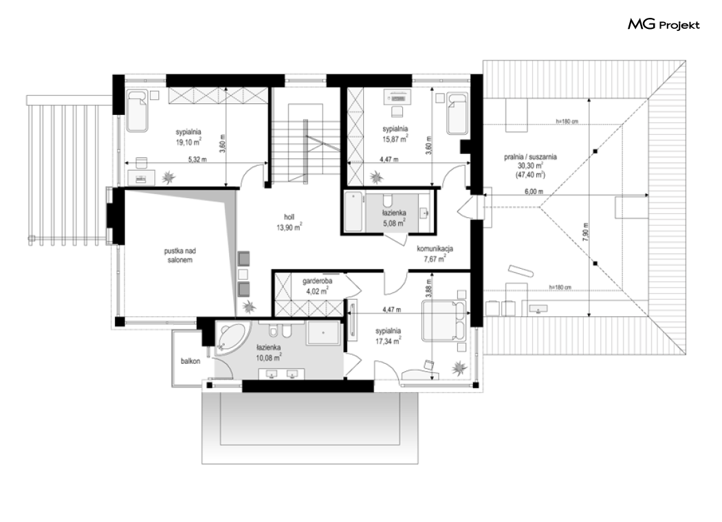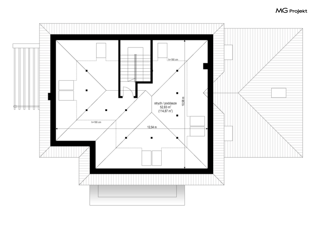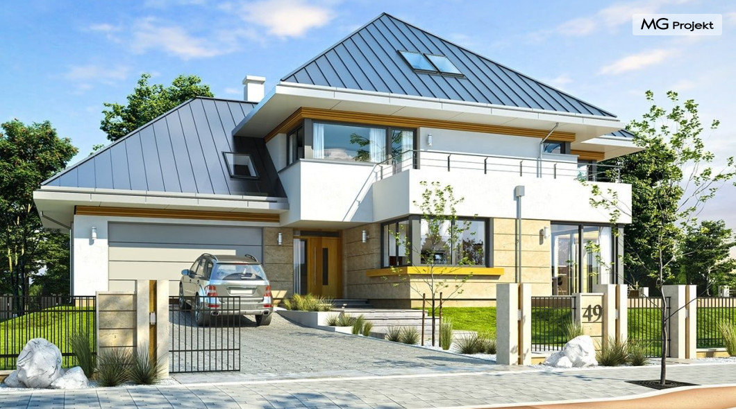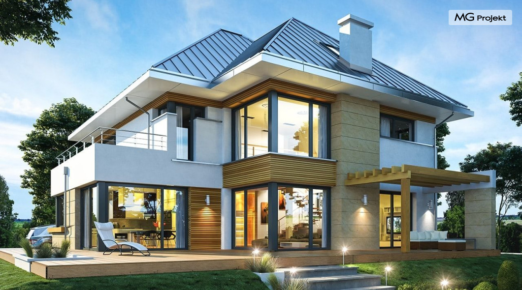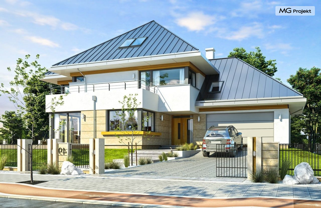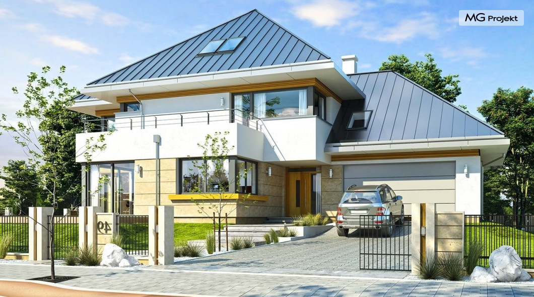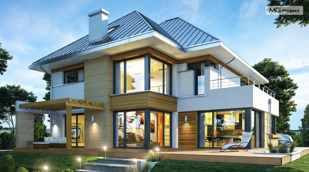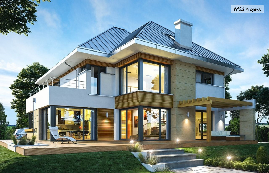 Projekt domu Dom z widokiem 2 C to projekt piętrowego domu jednorodzinnego o nowoczesnej architekturze, z kolekcji popularnych „Domów z widokiem”. Budynek został złożony z dwóch zasadniczych brył - z piętrowego rdzenia, przykrytego dachem w kształcie litery „L”, oraz parterowej bryły garażu przekrytego trzyspadowym dachem. Z uwagi na dość duży kąt nachylenia dachów, nad piętrem mieści się jeszcze spory strych, który można z powodzeniem zaadaptować na poddasze użytkowe z dodatkowymi pomieszczeniami. Bryła budynku ozdobiona jest ładnym detalem. Narożne okna, duże przeszklenia, kamienne i drewniane okładziny ścian - wszystkie te elementy dodają elewacjom domu szyku i elegancji. Budynek ma reprezentacyjny wygląd - przywołuje na myśl wrażenie komfortu i luksusu, a także solidności i trwałości zastosowanych materiałów i rozwiązań. Wnętrze zostało zaprojektowane z podziałem na przestrzeń dzienną i gospodarczą na parterze, oraz sypialnie na piętrze. Do domu wchodzimy dobrze oświetlonym przedsionkiem z szatnią, od razu do ładnego holu, a dalej do salonu z pustką i pięknymi reprezentacyjnymi schodami, oraz dużej kuchni z wyspą, oraz jadalnią. W części gospodarczej na parterze mamy dwustanowiskowy garaż z dodatkową przestrzenią magazynową, oraz osobną kotłownię. Salon i jadalnia otwierają się dużymi przeszkleniami na szeroki taras częściowo osłonięty pergolą. Z narożnego okna kuchni widzimy wejście i wjazd do domu. Na piętrze zaprojektowano apartament rodziców z garderobą, łazienką i własnym tarasem dostępnym z sypialni, oraz dwie sypialnie dziecięce z łazienką . Hol na piętrze pełni też funkcję antresoli nad salonem, w estetyczny sposób łącząc ze sobą górę i dół. Nad garażem mamy dużą dodatkową przestrzeń strychową, którą można wykorzystać w dowolny sposób. Na poddaszu nad piętrem mamy jeszcze ponad 60-metrowe studio, które również może być w łatwy sposób zaadaptowane na przestrzeń użytkową domu. Projekt domu Dom z widokiem 2 C to doskonała propozycja dla Inwestorów chcących dużego domu , ale mających ograniczenia powierzchni zabudowy lub niewielkiej działki, a do tego obowiązek budowy domu z dachem o większym kącie nachylenia połaci. Projekt domu Dom z widokiem 2 C doskonale pasować będzie na działkę z ogródkiem z boku, oraz na działkę z wjazdem na posesję od strony nasłonecznionej - na przykład od południa. W budynku zastosowano energooszczędne materiały i technologie, dzięki czemu dom będzie niedrogi w późniejszej eksploatacji. Zapraszamy do zapoznania się z pełną ofertą pracowni MG Projekt tej serii: Dom z widokiem, Dom z widokiem 2, Dom z widokiem 3, Dom z widokiem 3F, Dom z widokiem 4, Dom z widokiem 5, Dom z widokiem 6, Dom z widokiem 6B, Dom z widokiem B, Dom z widokiem E.