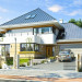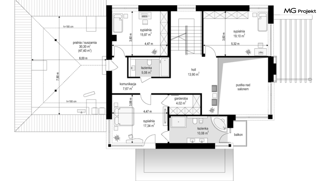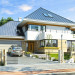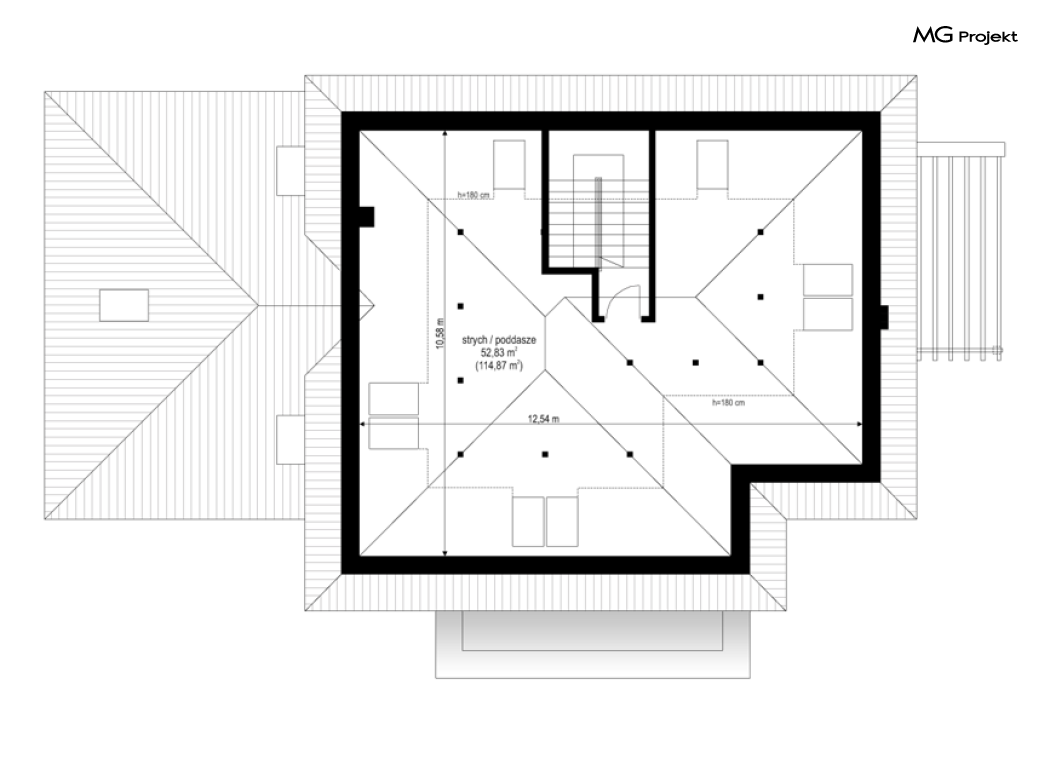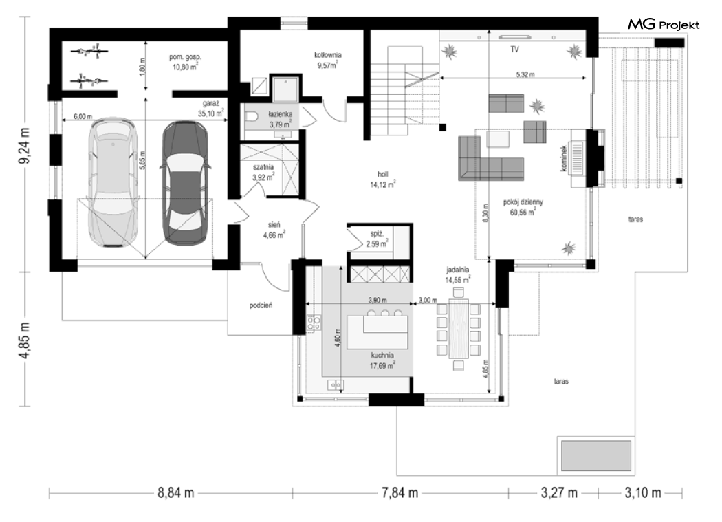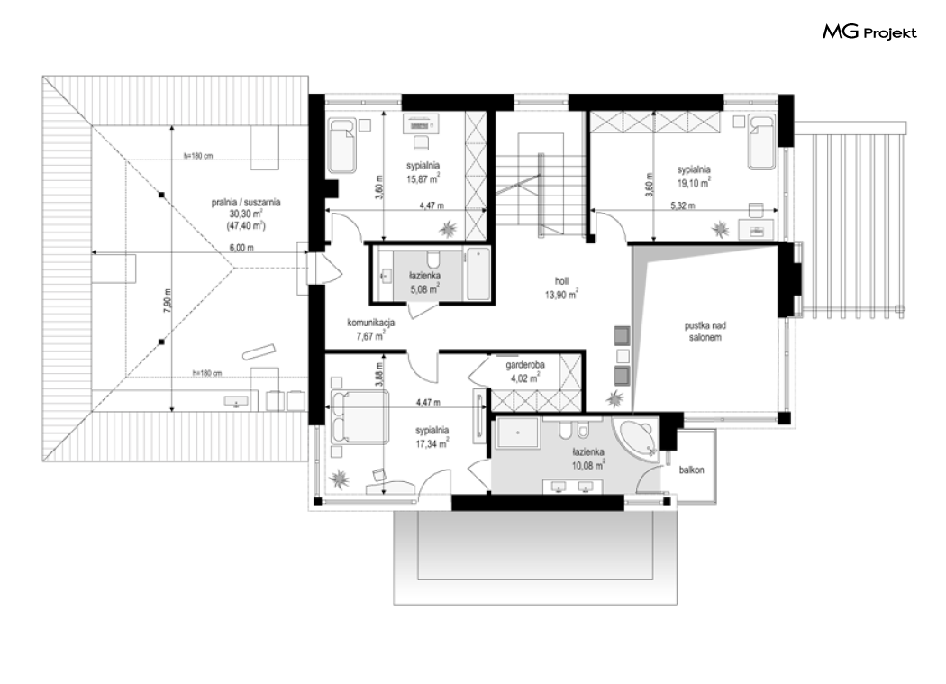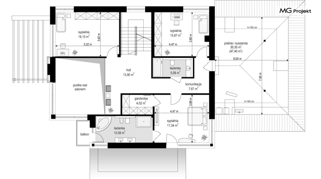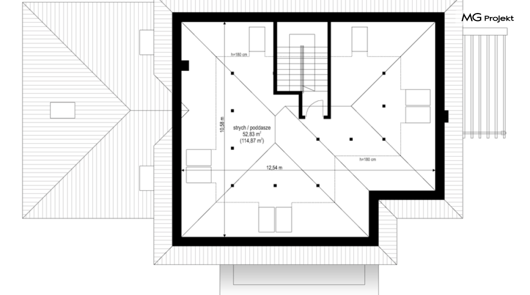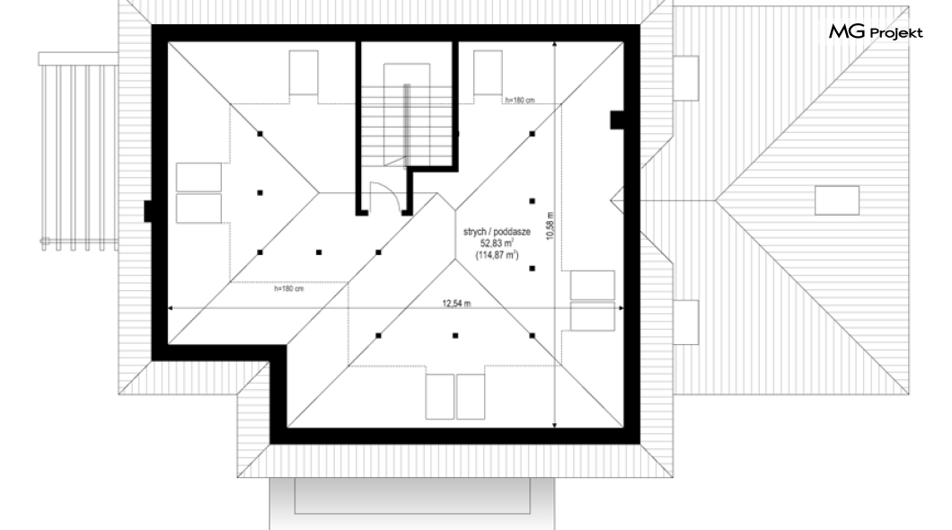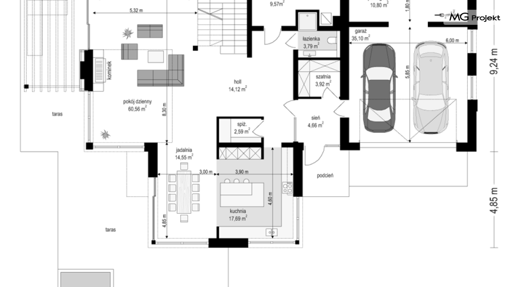 Projekt domu Dom z widokiem 2 C to projekt piętrowego domu jednorodzinnego o nowoczesnej architekturze, z kolekcji popularnych „Domów z widokiem”. Budynek został złożony z dwóch zasadniczych brył - z piętrowego rdzenia, przykrytego dachem w kształcie litery „L”, oraz parterowej bryły garażu przekrytego trzyspadowym dachem. Z uwagi na dość duży kąt nachylenia dachów, nad piętrem mieści się jeszcze spory strych, który można z powodzeniem zaadaptować na poddasze użytkowe z dodatkowymi pomieszczeniami. Bryła budynku ozdobiona jest ładnym detalem. Narożne okna, duże przeszklenia, kamienne i drewniane okładziny ścian - wszystkie te elementy dodają elewacjom domu szyku i elegancji. Budynek ma reprezentacyjny wygląd - przywołuje na myśl wrażenie komfortu i luksusu, a także solidności i trwałości zastosowanych materiałów i rozwiązań. Wnętrze zostało zaprojektowane z podziałem na przestrzeń dzienną i gospodarczą na parterze, oraz sypialnie na piętrze. Do domu wchodzimy dobrze oświetlonym przedsionkiem z szatnią, od razu do ładnego holu, a dalej do salonu z pustką i pięknymi reprezentacyjnymi schodami, oraz dużej kuchni z wyspą, oraz jadalnią. W części gospodarczej na parterze mamy dwustanowiskowy garaż z dodatkową przestrzenią magazynową, oraz osobną kotłownię. Salon i jadalnia otwierają się dużymi przeszkleniami na szeroki taras częściowo osłonięty pergolą. Z narożnego okna kuchni widzimy wejście i wjazd do domu. Na piętrze zaprojektowano apartament rodziców z garderobą, łazienką i własnym tarasem dostępnym z sypialni, oraz dwie sypialnie dziecięce z łazienką . Hol na piętrze pełni też funkcję antresoli nad salonem, w estetyczny sposób łącząc ze sobą górę i dół. Nad garażem mamy dużą dodatkową przestrzeń strychową, którą można wykorzystać w dowolny sposób. Na poddaszu nad piętrem mamy jeszcze ponad 60-metrowe studio, które również może być w łatwy sposób zaadaptowane na przestrzeń użytkową domu. Projekt domu Dom z widokiem 2 C to doskonała propozycja dla Inwestorów chcących dużego domu , ale mających ograniczenia powierzchni zabudowy lub niewielkiej działki, a do tego obowiązek budowy domu z dachem o większym kącie nachylenia połaci. Projekt domu Dom z widokiem 2 C doskonale pasować będzie na działkę z ogródkiem z boku, oraz na działkę z wjazdem na posesję od strony nasłonecznionej - na przykład od południa. W budynku zastosowano energooszczędne materiały i technologie, dzięki czemu dom będzie niedrogi w późniejszej eksploatacji. Zapraszamy do zapoznania się z pełną ofertą pracowni MG Projekt tej serii: Dom z widokiem, Dom z widokiem 2, Dom z widokiem 3, Dom z widokiem 3F, Dom z widokiem 4, Dom z widokiem 5, Dom z widokiem 6, Dom z widokiem 6B, Dom z widokiem B, Dom z widokiem E.