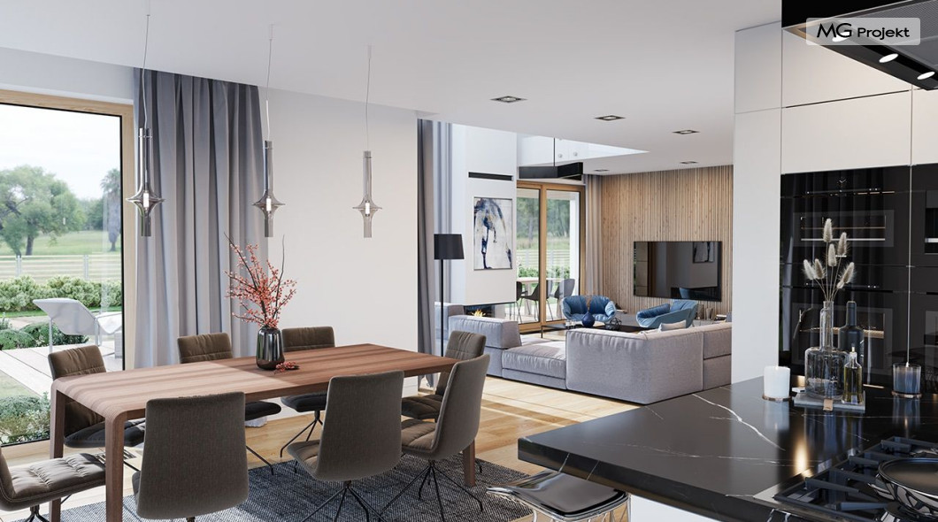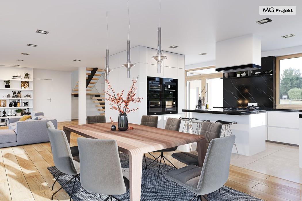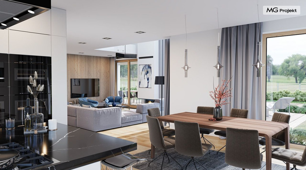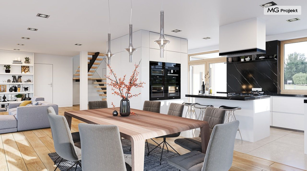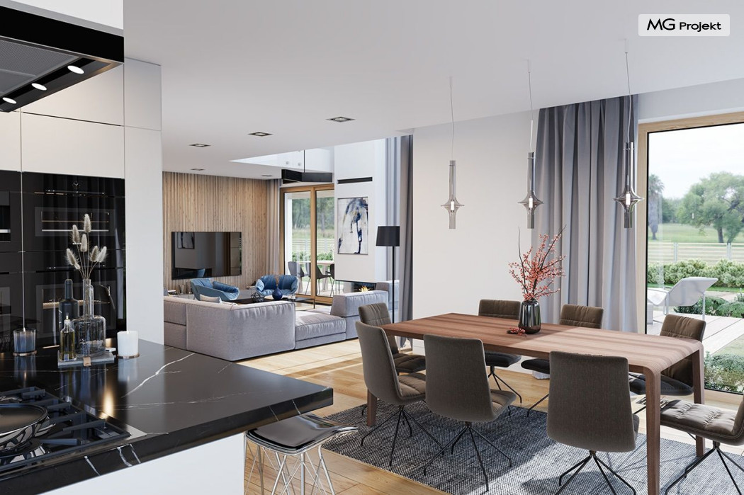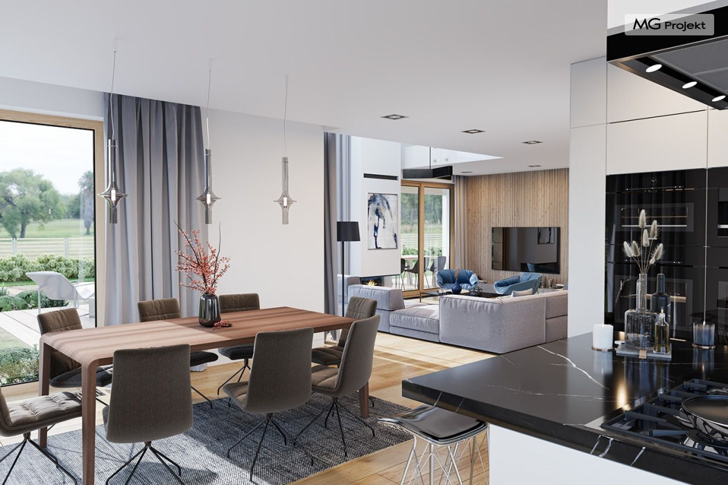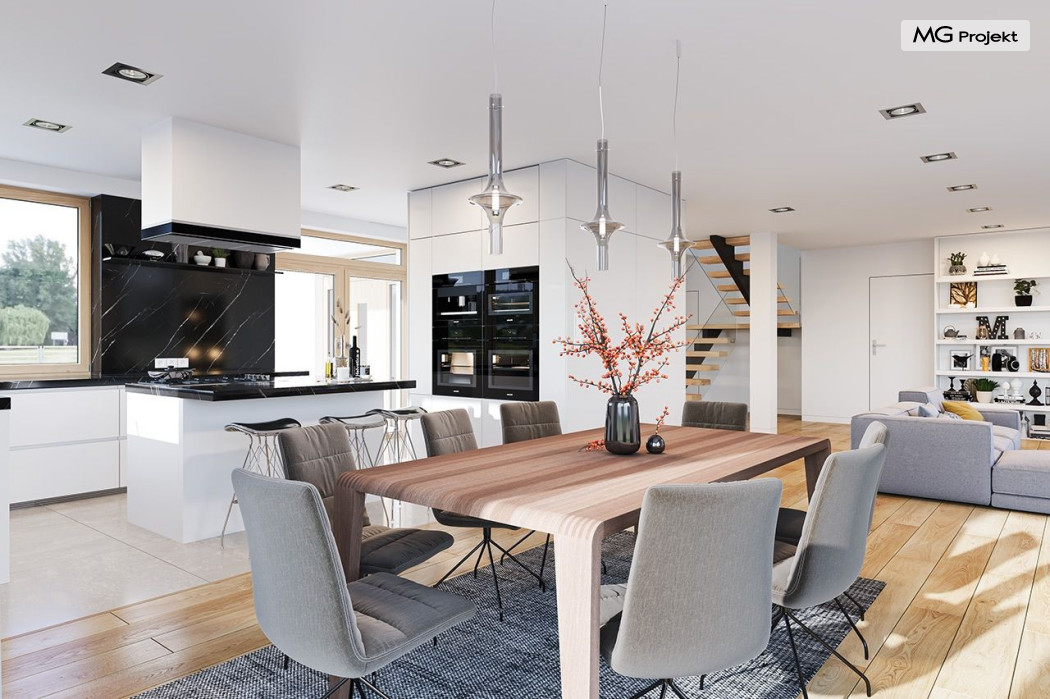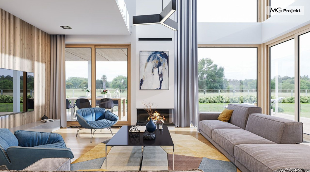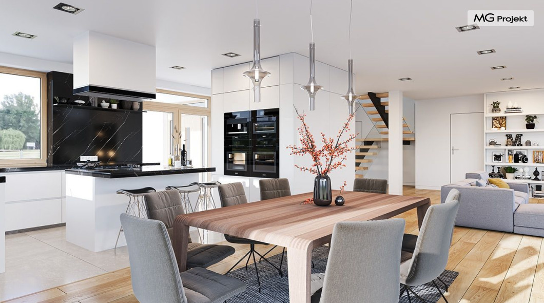 Projekt domu Dom z widokiem 3 F jest kolejną propozycją naszej pracowni z rodziny Domów z widokiem. Pod tą nazwą kryje się zupełnie nowy i zupełnie oryginalny nowoczesny piętrowy dom, przeznaczony na węższą działkę, z klasycznym wjazdem od północy lub wschodu i ogrodem od nasłonecznionej strony działki. Projekt domu Dom z widokiem 3 F zakłada wyciągniętą przed front parterową bryłę garażu, zaprojektowany od ulicy dziedziniec wejściowy i wjazdowy, a z kolei od strony ogrodu maksymalne otwarcie części dziennej na tarasy za pomocą szerokich przeszkleń. Przenikające się bryły głównego piętrowego rdzenia i dodatkowych parterowych brył, w połączeniu z pięknymi narożnymi przeszkleniami, kamiennymi i drewnianymi okładzinami ścian, dają nowoczesną i atrakcyjną sylwetkę budynku. Dom z jednej strony jawi się jako komfortowa, luksusowa podmiejska willa, z drugiej strony ujmuje ludzką skalą i przytulnością. Jednym słowem - jest to propozycja w sam raz dla każdej rodziny. Wnętrze projektu podzielono na część dzienną i gospodarczą na parterze i sypialnie na piętrze. Do domu wchodzimy do przedsionka z szatnią wprost ze szklanego narożnika widocznego od frontu. Przechodzimy stąd wprost do przestrzeni dziennej, składającej się z: salonu z pustką, holu ze schodami, jadalni i kuchni z wyspą. Na parterze mamy jeszcze dodatkowy pokój - gabinet, łazienkę, kotłownię, oraz bardzo duży garaż z przestrzenią magazynową. Na piętrze mieszczą się trzy sypialnie, łazienka, garderoba i pralnia, z dostępem na strych nad garażem. Piętro można dowolnie zaaranżować - dzięki stropowi monolitycznemu można dowolnie przestawiać ścianki działowe. Na górnej kondygnacji mamy też kącik do pracy / antresolę – bibliotekę i pustkę z widocznym poniżej salonem. Projekt domu Dom z widokiem 3 F jest doskonałą propozycją dla Klientów pragnących domu w sam raz - nie za dużego, a jednocześnie będącego spełnieniem marzeń i aspiracji o komforcie i luksusie wygodnego życia. Dom wbrew pozorom nie ma trudnej konstrukcji - powinien być dość prosty w budowie, a zastosowane energooszczędne materiały i technologie zapewnią niedrogą eksploatację budynku. Zapraszamy do zapoznania się z pełną ofertą pracowni MG Projekt tej serii: Dom z widokiem, Dom z widokiem 2, Dom z widokiem 2C, Dom z widokiem 3, Dom z widokiem 4, Dom z widokiem 5, Dom z widokiem 6, Dom z widokiem 6B, Dom z widokiem B, Dom z widokiem E.