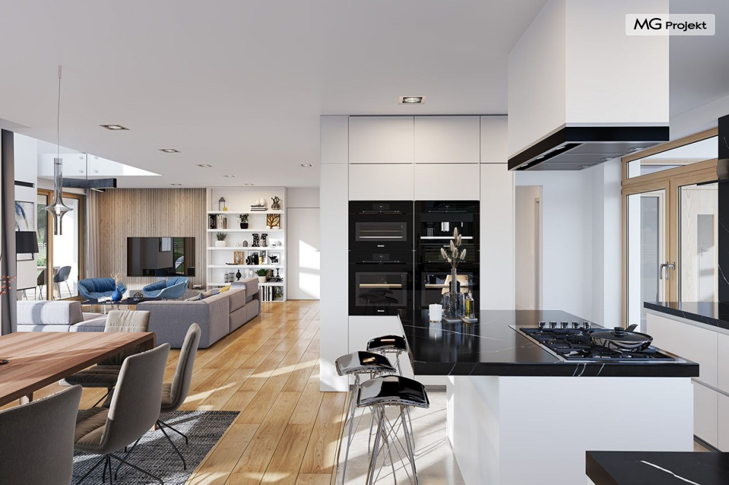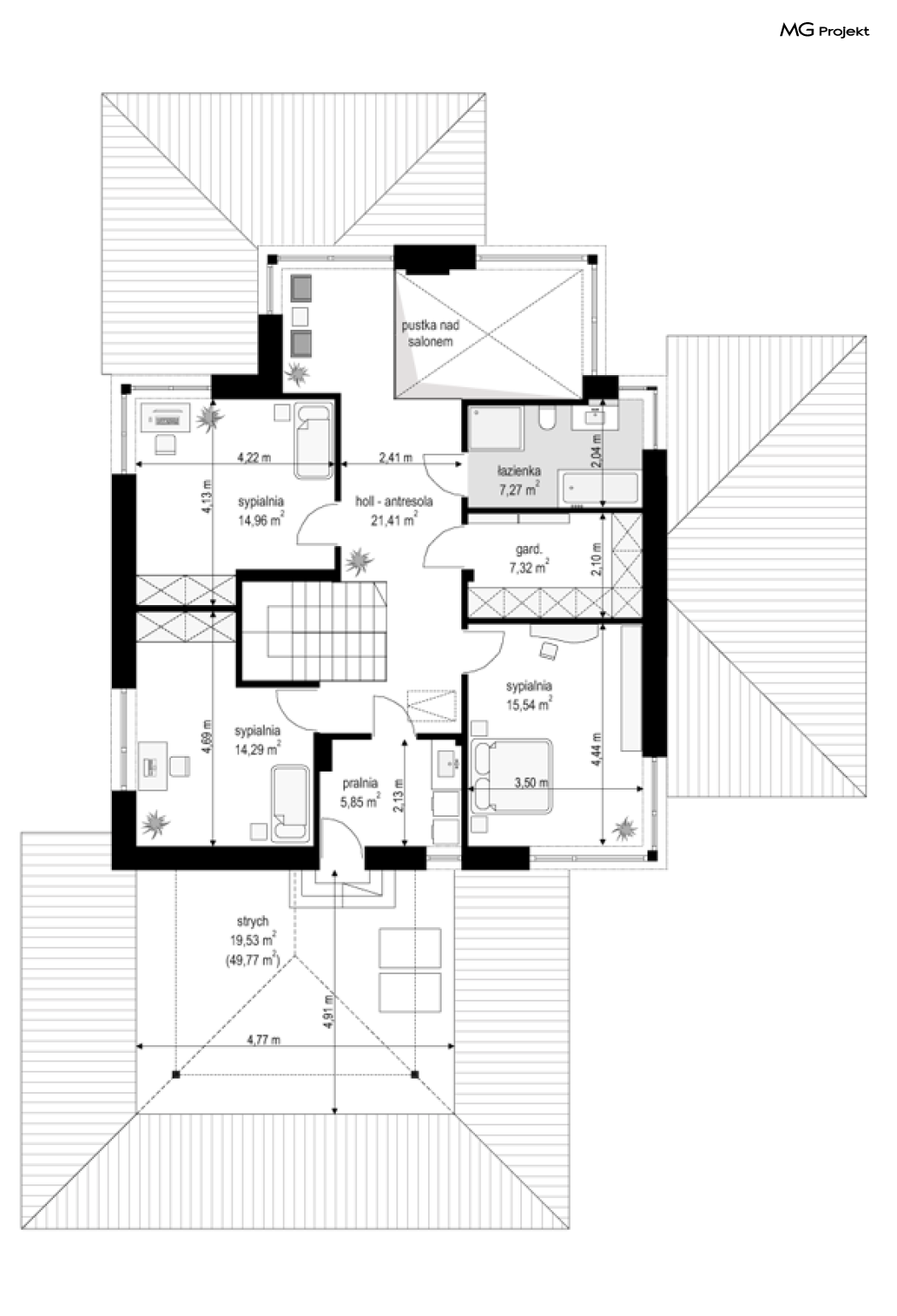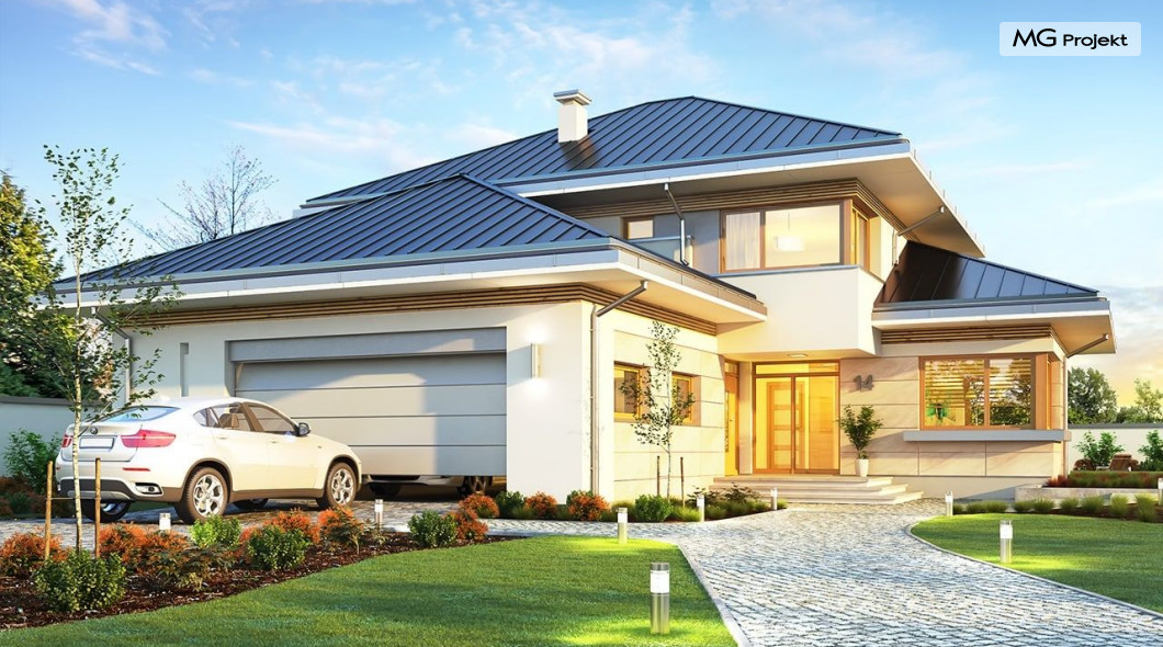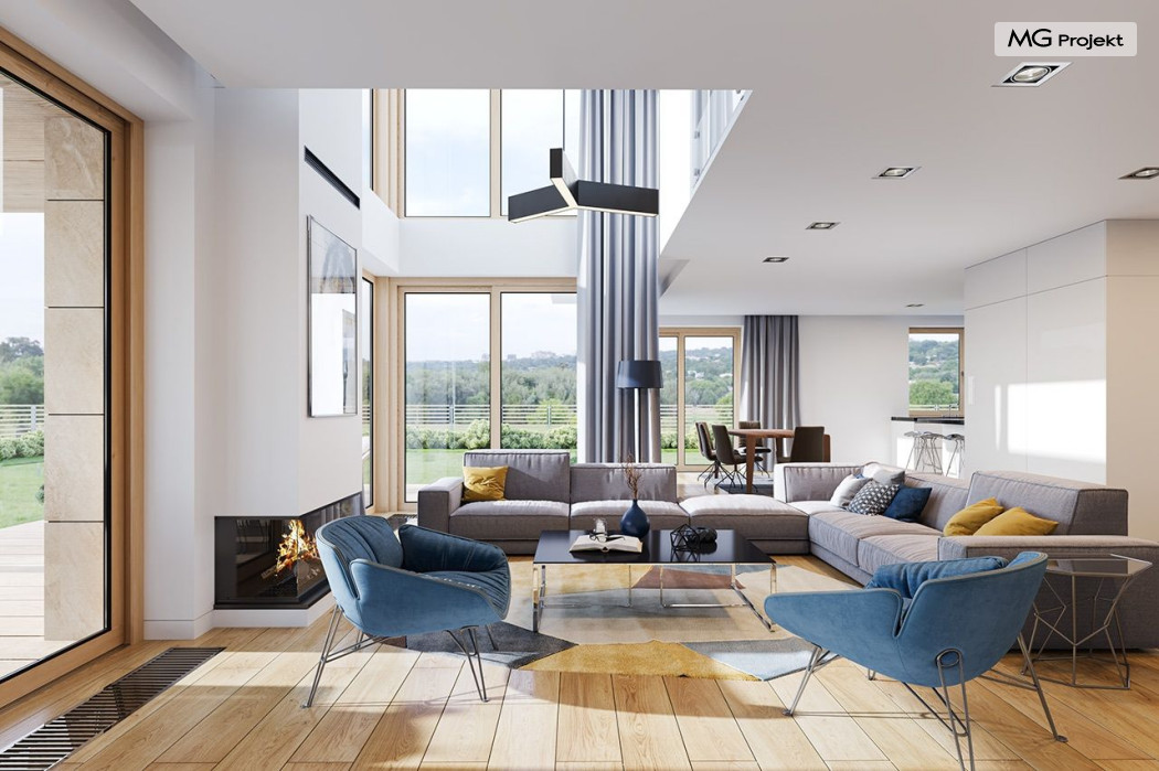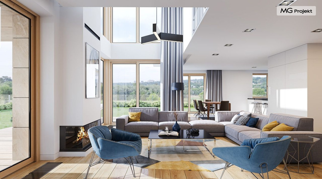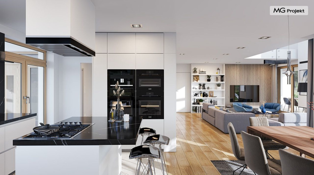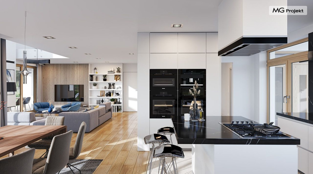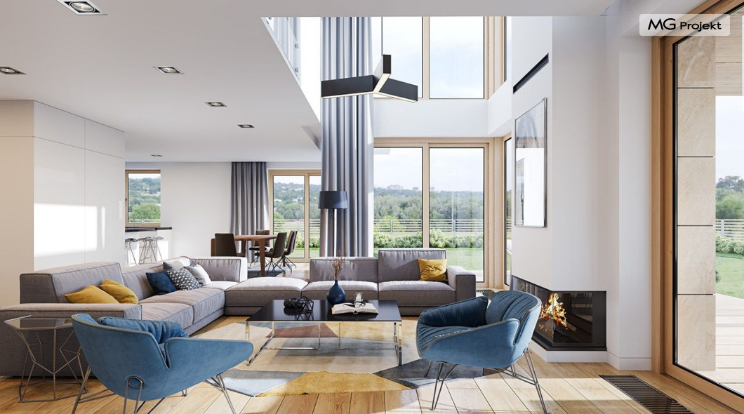 Projekt domu Dom z widokiem 3 F jest kolejną propozycją naszej pracowni z rodziny Domów z widokiem. Pod tą nazwą kryje się zupełnie nowy i zupełnie oryginalny nowoczesny piętrowy dom, przeznaczony na węższą działkę, z klasycznym wjazdem od północy lub wschodu i ogrodem od nasłonecznionej strony działki. Projekt domu Dom z widokiem 3 F zakłada wyciągniętą przed front parterową bryłę garażu, zaprojektowany od ulicy dziedziniec wejściowy i wjazdowy, a z kolei od strony ogrodu maksymalne otwarcie części dziennej na tarasy za pomocą szerokich przeszkleń. Przenikające się bryły głównego piętrowego rdzenia i dodatkowych parterowych brył, w połączeniu z pięknymi narożnymi przeszkleniami, kamiennymi i drewnianymi okładzinami ścian, dają nowoczesną i atrakcyjną sylwetkę budynku. Dom z jednej strony jawi się jako komfortowa, luksusowa podmiejska willa, z drugiej strony ujmuje ludzką skalą i przytulnością. Jednym słowem - jest to propozycja w sam raz dla każdej rodziny. Wnętrze projektu podzielono na część dzienną i gospodarczą na parterze i sypialnie na piętrze. Do domu wchodzimy do przedsionka z szatnią wprost ze szklanego narożnika widocznego od frontu. Przechodzimy stąd wprost do przestrzeni dziennej, składającej się z: salonu z pustką, holu ze schodami, jadalni i kuchni z wyspą. Na parterze mamy jeszcze dodatkowy pokój - gabinet, łazienkę, kotłownię, oraz bardzo duży garaż z przestrzenią magazynową. Na piętrze mieszczą się trzy sypialnie, łazienka, garderoba i pralnia, z dostępem na strych nad garażem. Piętro można dowolnie zaaranżować - dzięki stropowi monolitycznemu można dowolnie przestawiać ścianki działowe. Na górnej kondygnacji mamy też kącik do pracy / antresolę – bibliotekę i pustkę z widocznym poniżej salonem. Projekt domu Dom z widokiem 3 F jest doskonałą propozycją dla Klientów pragnących domu w sam raz - nie za dużego, a jednocześnie będącego spełnieniem marzeń i aspiracji o komforcie i luksusie wygodnego życia. Dom wbrew pozorom nie ma trudnej konstrukcji - powinien być dość prosty w budowie, a zastosowane energooszczędne materiały i technologie zapewnią niedrogą eksploatację budynku. Zapraszamy do zapoznania się z pełną ofertą pracowni MG Projekt tej serii: Dom z widokiem, Dom z widokiem 2, Dom z widokiem 2C, Dom z widokiem 3, Dom z widokiem 4, Dom z widokiem 5, Dom z widokiem 6, Dom z widokiem 6B, Dom z widokiem B, Dom z widokiem E.