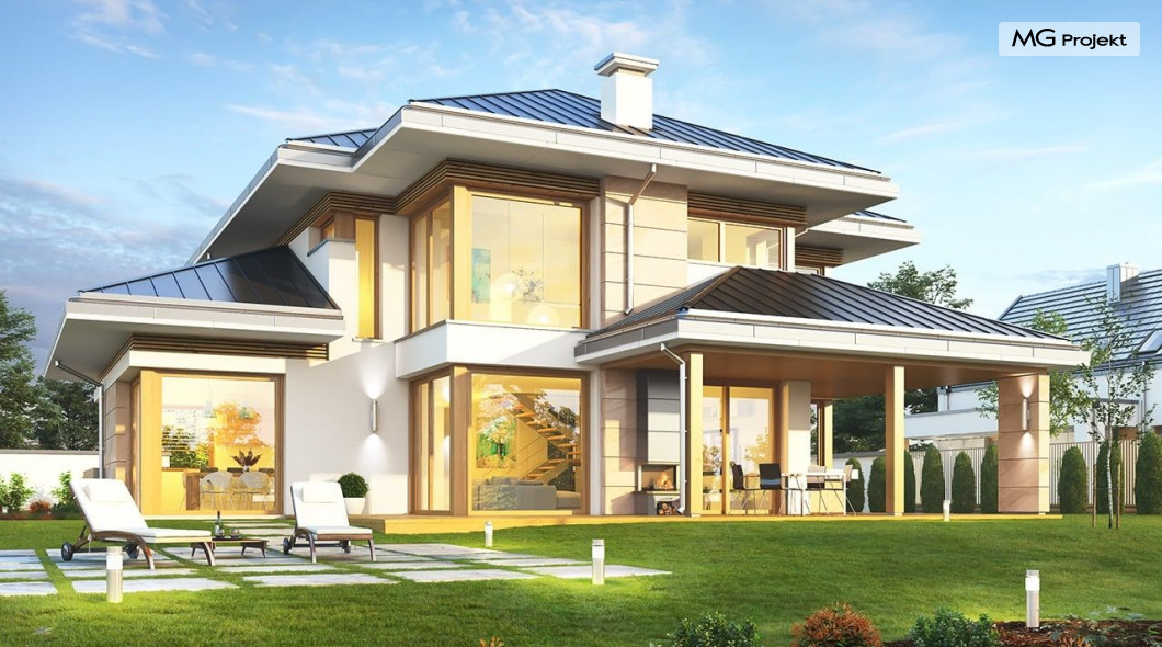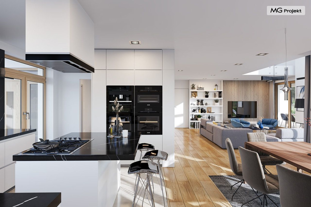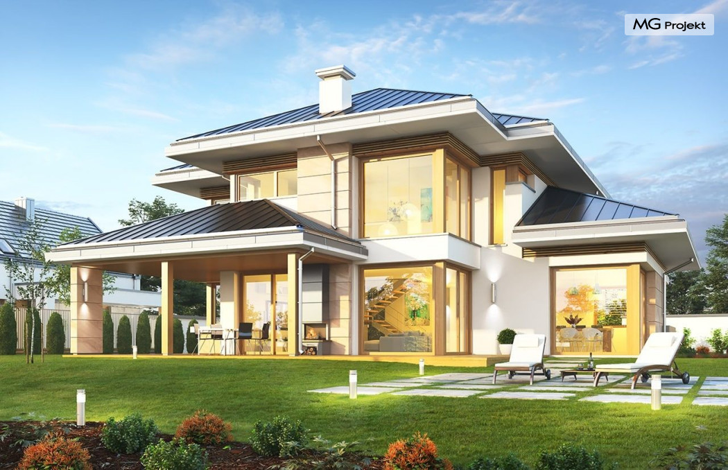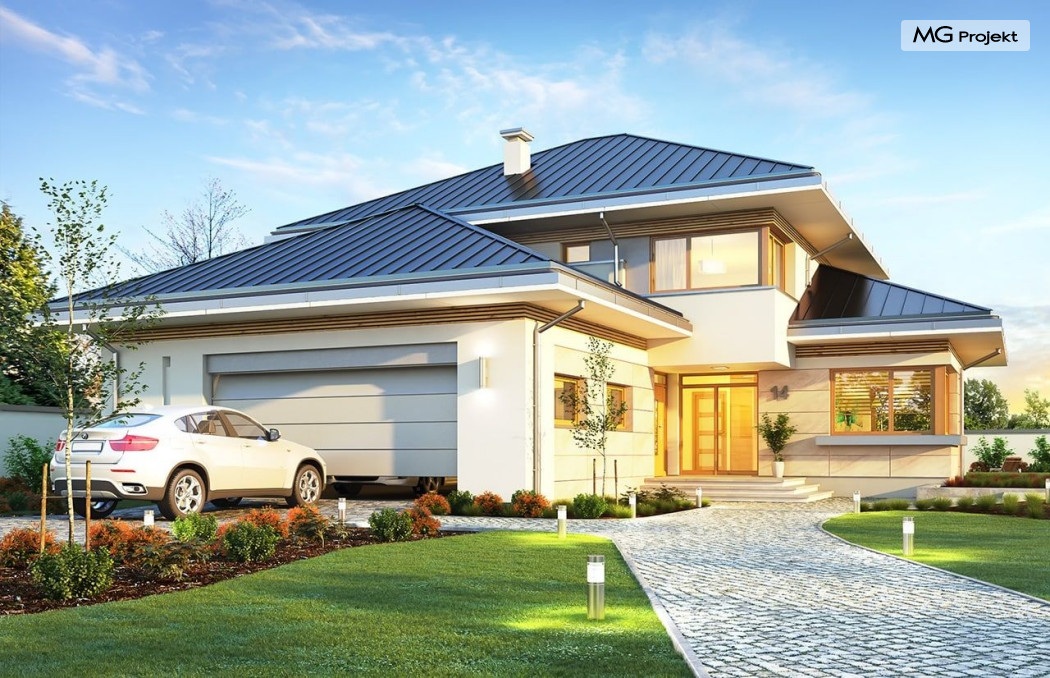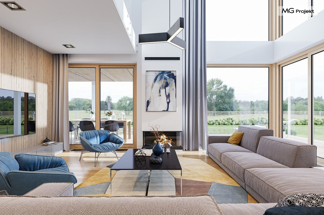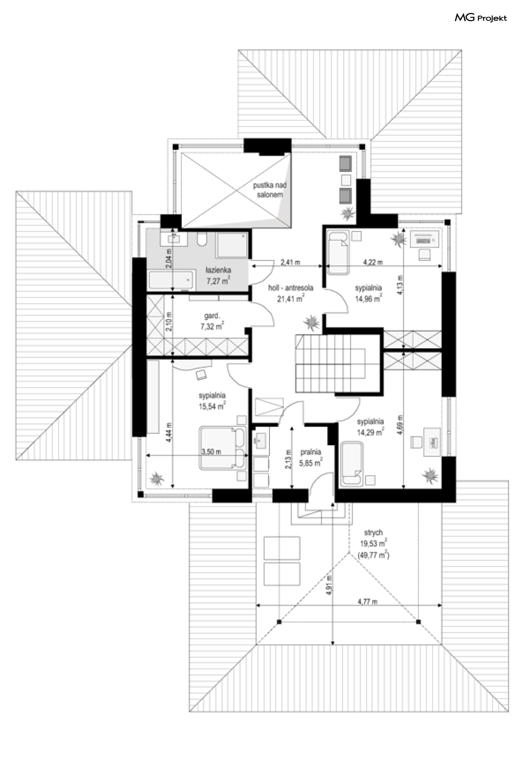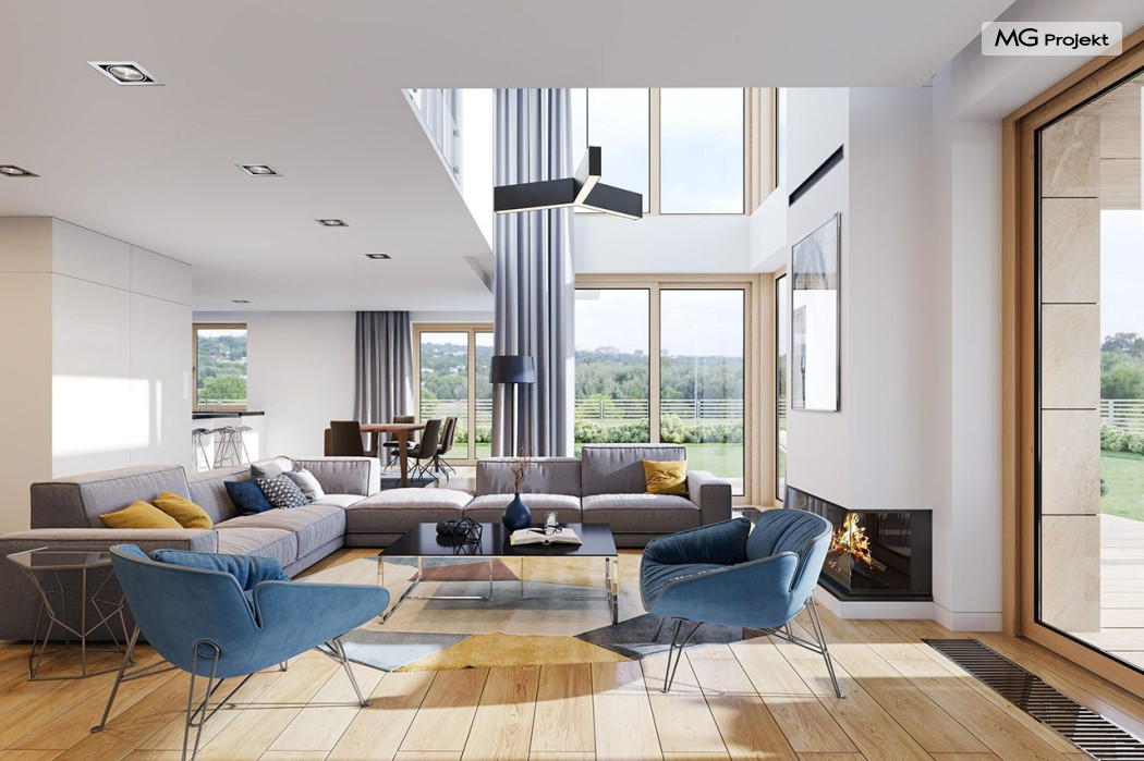 Projekt domu Dom z widokiem 3 F jest kolejną propozycją naszej pracowni z rodziny Domów z widokiem. Pod tą nazwą kryje się zupełnie nowy i zupełnie oryginalny nowoczesny piętrowy dom, przeznaczony na węższą działkę, z klasycznym wjazdem od północy lub wschodu i ogrodem od nasłonecznionej strony działki. Projekt domu Dom z widokiem 3 F zakłada wyciągniętą przed front parterową bryłę garażu, zaprojektowany od ulicy dziedziniec wejściowy i wjazdowy, a z kolei od strony ogrodu maksymalne otwarcie części dziennej na tarasy za pomocą szerokich przeszkleń. Przenikające się bryły głównego piętrowego rdzenia i dodatkowych parterowych brył, w połączeniu z pięknymi narożnymi przeszkleniami, kamiennymi i drewnianymi okładzinami ścian, dają nowoczesną i atrakcyjną sylwetkę budynku. Dom z jednej strony jawi się jako komfortowa, luksusowa podmiejska willa, z drugiej strony ujmuje ludzką skalą i przytulnością. Jednym słowem - jest to propozycja w sam raz dla każdej rodziny. Wnętrze projektu podzielono na część dzienną i gospodarczą na parterze i sypialnie na piętrze. Do domu wchodzimy do przedsionka z szatnią wprost ze szklanego narożnika widocznego od frontu. Przechodzimy stąd wprost do przestrzeni dziennej, składającej się z: salonu z pustką, holu ze schodami, jadalni i kuchni z wyspą. Na parterze mamy jeszcze dodatkowy pokój - gabinet, łazienkę, kotłownię, oraz bardzo duży garaż z przestrzenią magazynową. Na piętrze mieszczą się trzy sypialnie, łazienka, garderoba i pralnia, z dostępem na strych nad garażem. Piętro można dowolnie zaaranżować - dzięki stropowi monolitycznemu można dowolnie przestawiać ścianki działowe. Na górnej kondygnacji mamy też kącik do pracy / antresolę – bibliotekę i pustkę z widocznym poniżej salonem. Projekt domu Dom z widokiem 3 F jest doskonałą propozycją dla Klientów pragnących domu w sam raz - nie za dużego, a jednocześnie będącego spełnieniem marzeń i aspiracji o komforcie i luksusie wygodnego życia. Dom wbrew pozorom nie ma trudnej konstrukcji - powinien być dość prosty w budowie, a zastosowane energooszczędne materiały i technologie zapewnią niedrogą eksploatację budynku. Zapraszamy do zapoznania się z pełną ofertą pracowni MG Projekt tej serii: Dom z widokiem, Dom z widokiem 2, Dom z widokiem 2C, Dom z widokiem 3, Dom z widokiem 4, Dom z widokiem 5, Dom z widokiem 6, Dom z widokiem 6B, Dom z widokiem B, Dom z widokiem E.