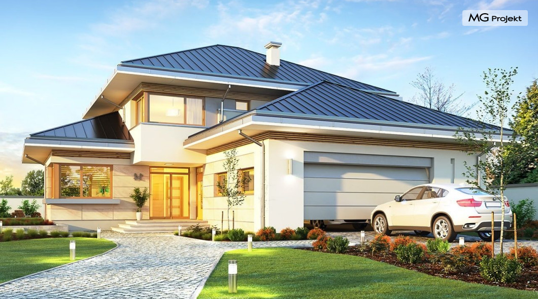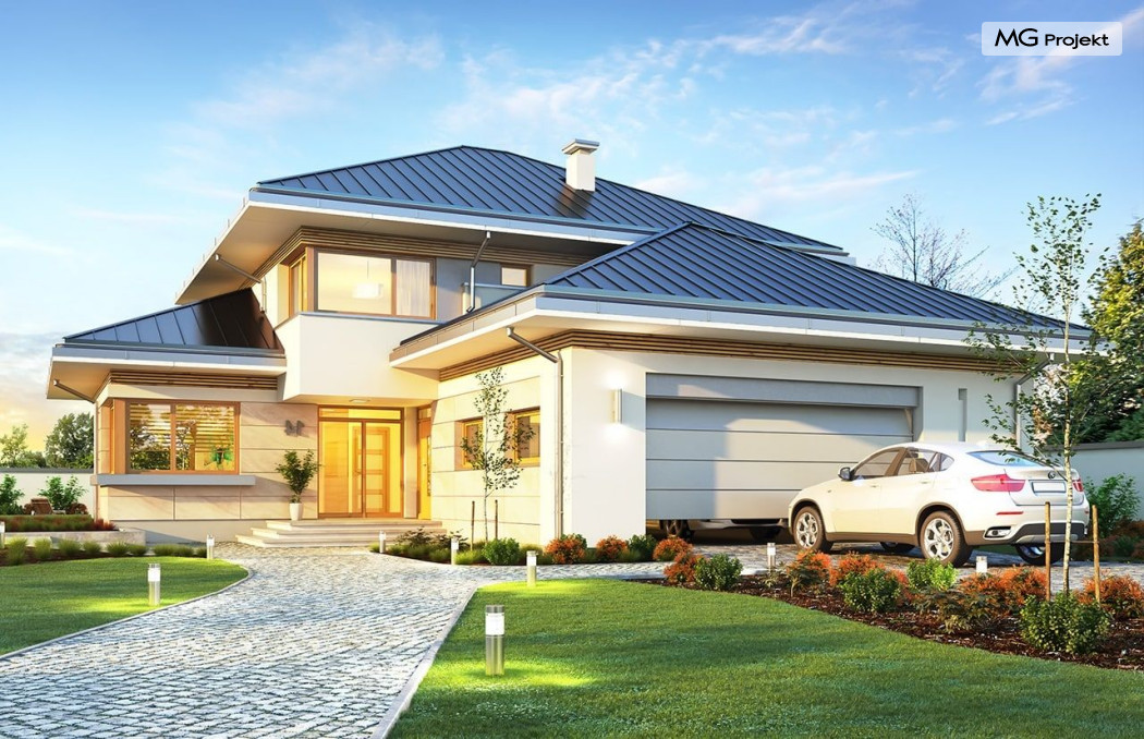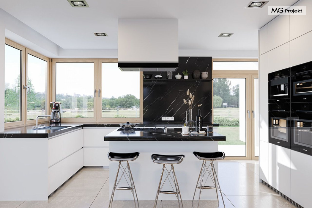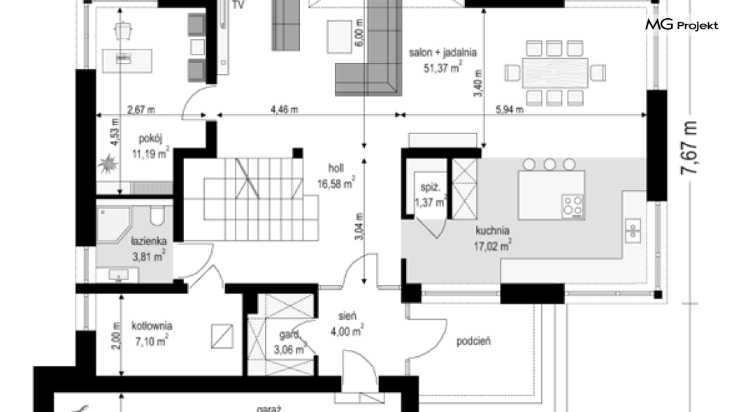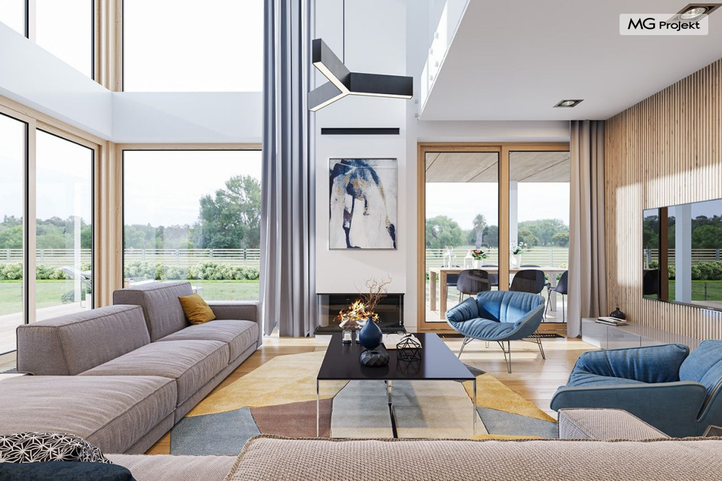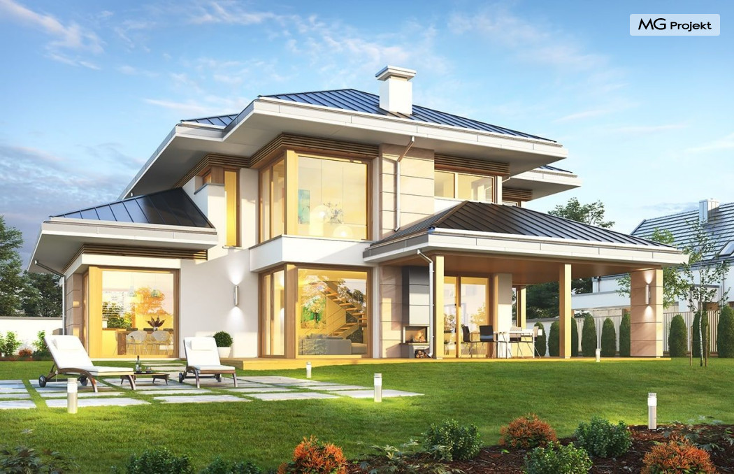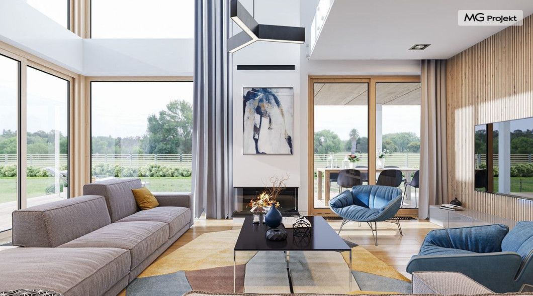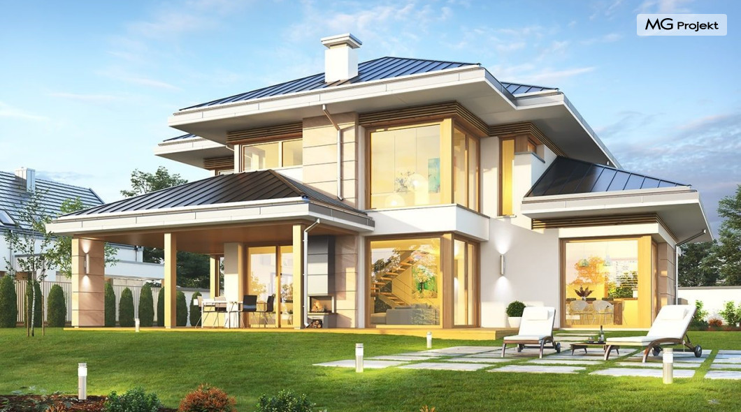 Projekt domu Dom z widokiem 3 F jest kolejną propozycją naszej pracowni z rodziny Domów z widokiem. Pod tą nazwą kryje się zupełnie nowy i zupełnie oryginalny nowoczesny piętrowy dom, przeznaczony na węższą działkę, z klasycznym wjazdem od północy lub wschodu i ogrodem od nasłonecznionej strony działki. Projekt domu Dom z widokiem 3 F zakłada wyciągniętą przed front parterową bryłę garażu, zaprojektowany od ulicy dziedziniec wejściowy i wjazdowy, a z kolei od strony ogrodu maksymalne otwarcie części dziennej na tarasy za pomocą szerokich przeszkleń. Przenikające się bryły głównego piętrowego rdzenia i dodatkowych parterowych brył, w połączeniu z pięknymi narożnymi przeszkleniami, kamiennymi i drewnianymi okładzinami ścian, dają nowoczesną i atrakcyjną sylwetkę budynku. Dom z jednej strony jawi się jako komfortowa, luksusowa podmiejska willa, z drugiej strony ujmuje ludzką skalą i przytulnością. Jednym słowem - jest to propozycja w sam raz dla każdej rodziny. Wnętrze projektu podzielono na część dzienną i gospodarczą na parterze i sypialnie na piętrze. Do domu wchodzimy do przedsionka z szatnią wprost ze szklanego narożnika widocznego od frontu. Przechodzimy stąd wprost do przestrzeni dziennej, składającej się z: salonu z pustką, holu ze schodami, jadalni i kuchni z wyspą. Na parterze mamy jeszcze dodatkowy pokój - gabinet, łazienkę, kotłownię, oraz bardzo duży garaż z przestrzenią magazynową. Na piętrze mieszczą się trzy sypialnie, łazienka, garderoba i pralnia, z dostępem na strych nad garażem. Piętro można dowolnie zaaranżować - dzięki stropowi monolitycznemu można dowolnie przestawiać ścianki działowe. Na górnej kondygnacji mamy też kącik do pracy / antresolę – bibliotekę i pustkę z widocznym poniżej salonem. Projekt domu Dom z widokiem 3 F jest doskonałą propozycją dla Klientów pragnących domu w sam raz - nie za dużego, a jednocześnie będącego spełnieniem marzeń i aspiracji o komforcie i luksusie wygodnego życia. Dom wbrew pozorom nie ma trudnej konstrukcji - powinien być dość prosty w budowie, a zastosowane energooszczędne materiały i technologie zapewnią niedrogą eksploatację budynku. Zapraszamy do zapoznania się z pełną ofertą pracowni MG Projekt tej serii: Dom z widokiem, Dom z widokiem 2, Dom z widokiem 2C, Dom z widokiem 3, Dom z widokiem 4, Dom z widokiem 5, Dom z widokiem 6, Dom z widokiem 6B, Dom z widokiem B, Dom z widokiem E.