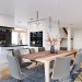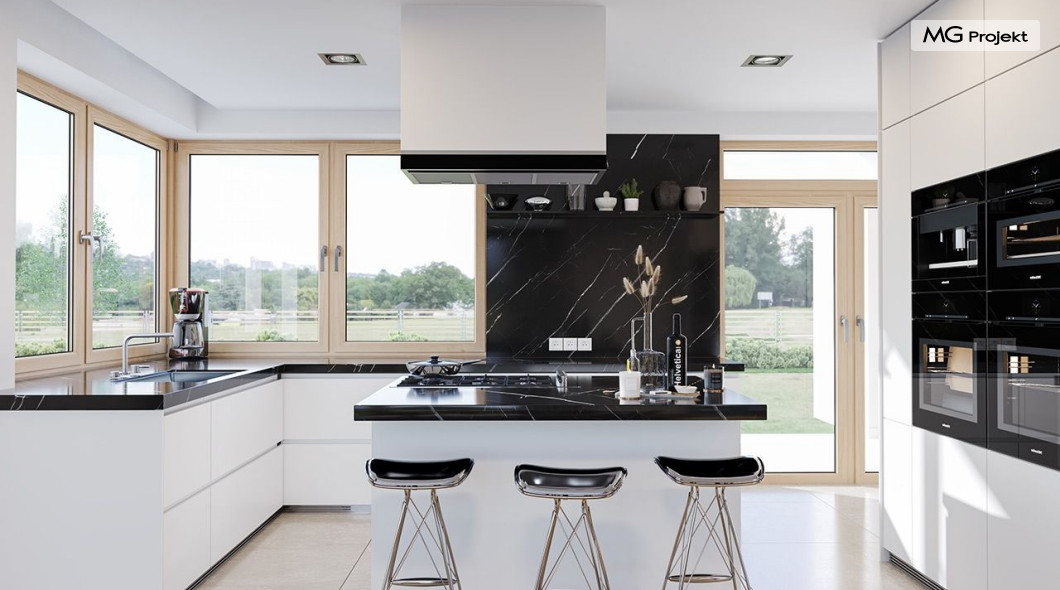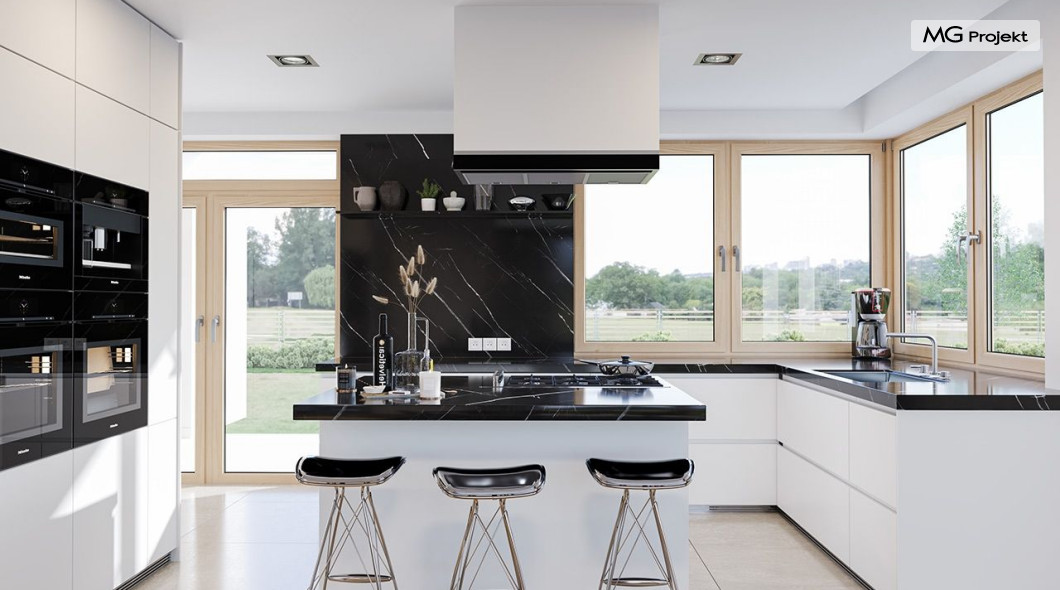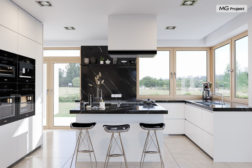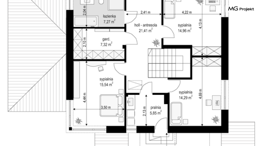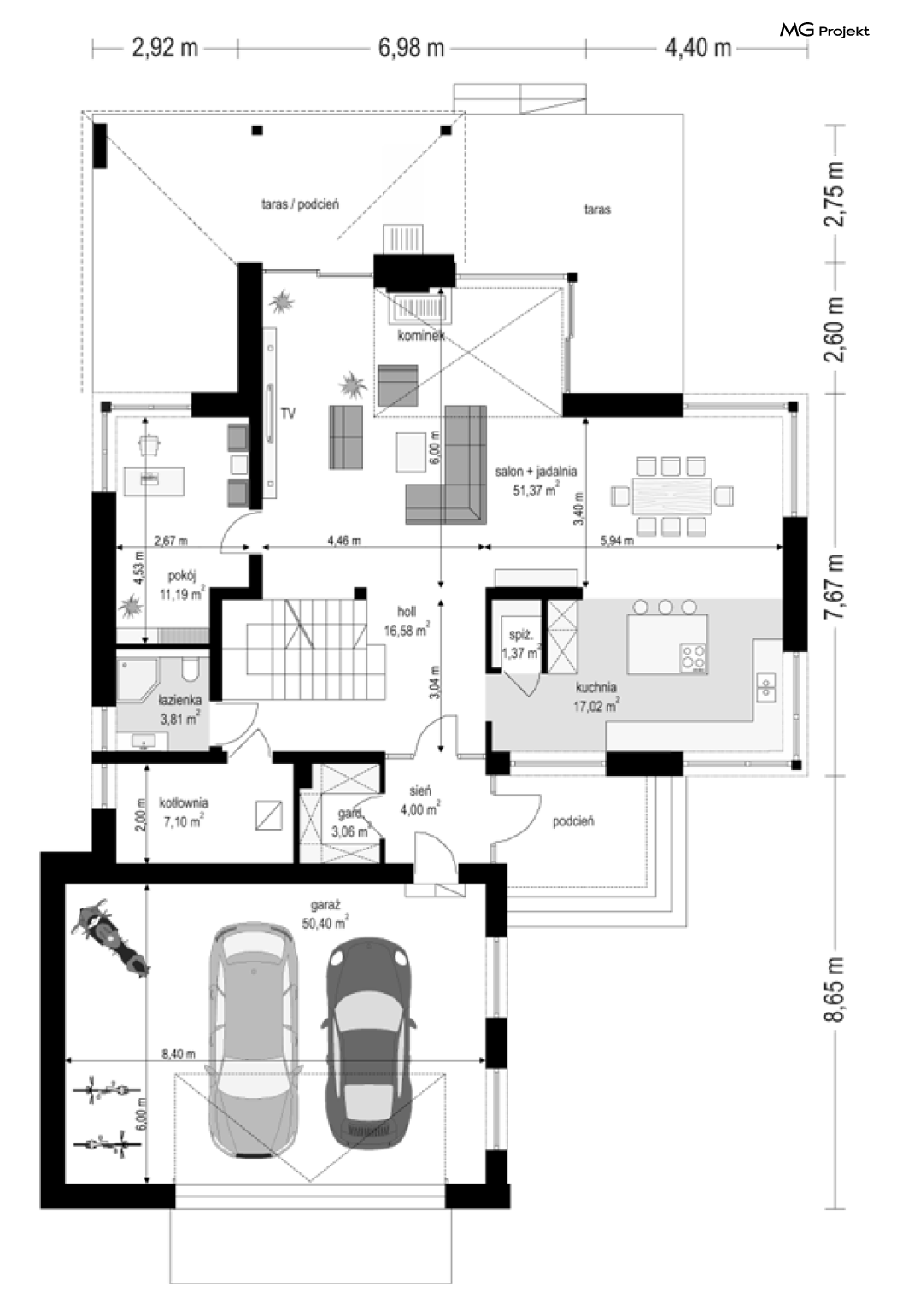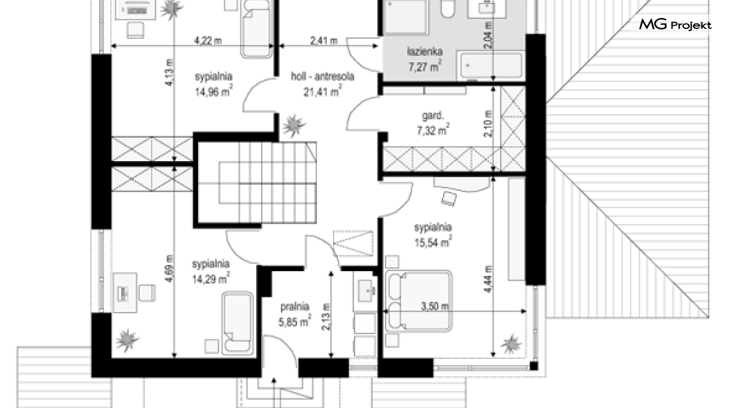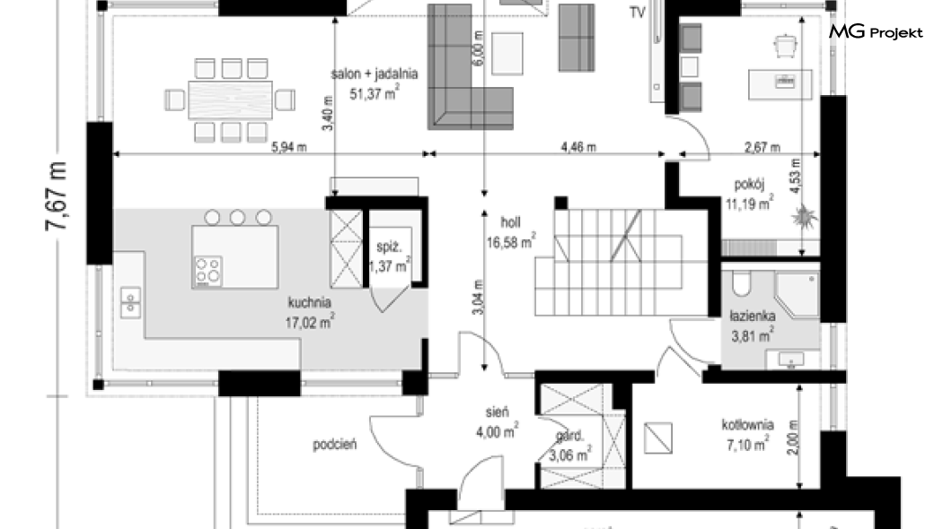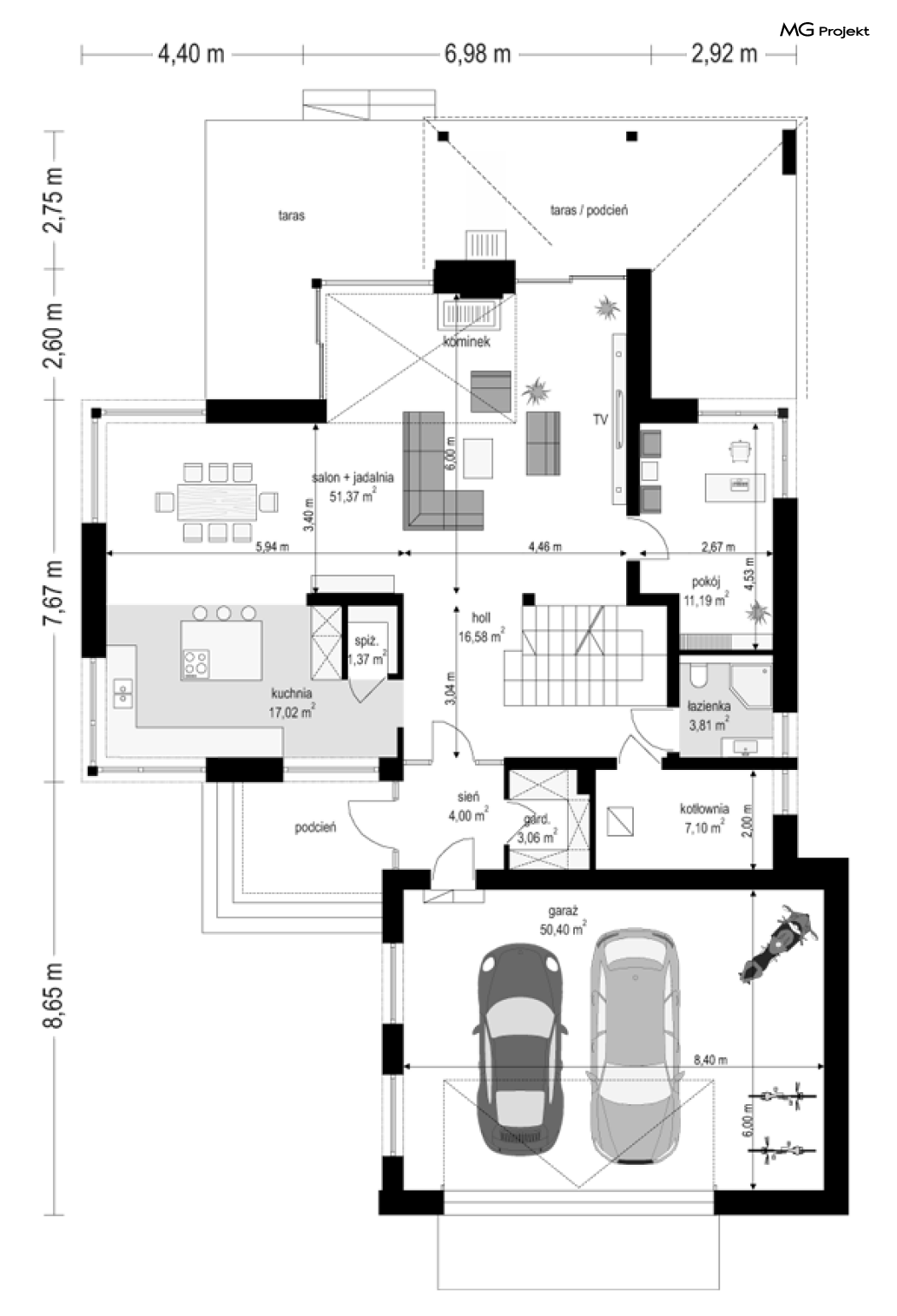 Projekt domu Dom z widokiem 3 F jest kolejną propozycją naszej pracowni z rodziny Domów z widokiem. Pod tą nazwą kryje się zupełnie nowy i zupełnie oryginalny nowoczesny piętrowy dom, przeznaczony na węższą działkę, z klasycznym wjazdem od północy lub wschodu i ogrodem od nasłonecznionej strony działki. Projekt domu Dom z widokiem 3 F zakłada wyciągniętą przed front parterową bryłę garażu, zaprojektowany od ulicy dziedziniec wejściowy i wjazdowy, a z kolei od strony ogrodu maksymalne otwarcie części dziennej na tarasy za pomocą szerokich przeszkleń. Przenikające się bryły głównego piętrowego rdzenia i dodatkowych parterowych brył, w połączeniu z pięknymi narożnymi przeszkleniami, kamiennymi i drewnianymi okładzinami ścian, dają nowoczesną i atrakcyjną sylwetkę budynku. Dom z jednej strony jawi się jako komfortowa, luksusowa podmiejska willa, z drugiej strony ujmuje ludzką skalą i przytulnością. Jednym słowem - jest to propozycja w sam raz dla każdej rodziny. Wnętrze projektu podzielono na część dzienną i gospodarczą na parterze i sypialnie na piętrze. Do domu wchodzimy do przedsionka z szatnią wprost ze szklanego narożnika widocznego od frontu. Przechodzimy stąd wprost do przestrzeni dziennej, składającej się z: salonu z pustką, holu ze schodami, jadalni i kuchni z wyspą. Na parterze mamy jeszcze dodatkowy pokój - gabinet, łazienkę, kotłownię, oraz bardzo duży garaż z przestrzenią magazynową. Na piętrze mieszczą się trzy sypialnie, łazienka, garderoba i pralnia, z dostępem na strych nad garażem. Piętro można dowolnie zaaranżować - dzięki stropowi monolitycznemu można dowolnie przestawiać ścianki działowe. Na górnej kondygnacji mamy też kącik do pracy / antresolę – bibliotekę i pustkę z widocznym poniżej salonem. Projekt domu Dom z widokiem 3 F jest doskonałą propozycją dla Klientów pragnących domu w sam raz - nie za dużego, a jednocześnie będącego spełnieniem marzeń i aspiracji o komforcie i luksusie wygodnego życia. Dom wbrew pozorom nie ma trudnej konstrukcji - powinien być dość prosty w budowie, a zastosowane energooszczędne materiały i technologie zapewnią niedrogą eksploatację budynku. Zapraszamy do zapoznania się z pełną ofertą pracowni MG Projekt tej serii: Dom z widokiem, Dom z widokiem 2, Dom z widokiem 2C, Dom z widokiem 3, Dom z widokiem 4, Dom z widokiem 5, Dom z widokiem 6, Dom z widokiem 6B, Dom z widokiem B, Dom z widokiem E.