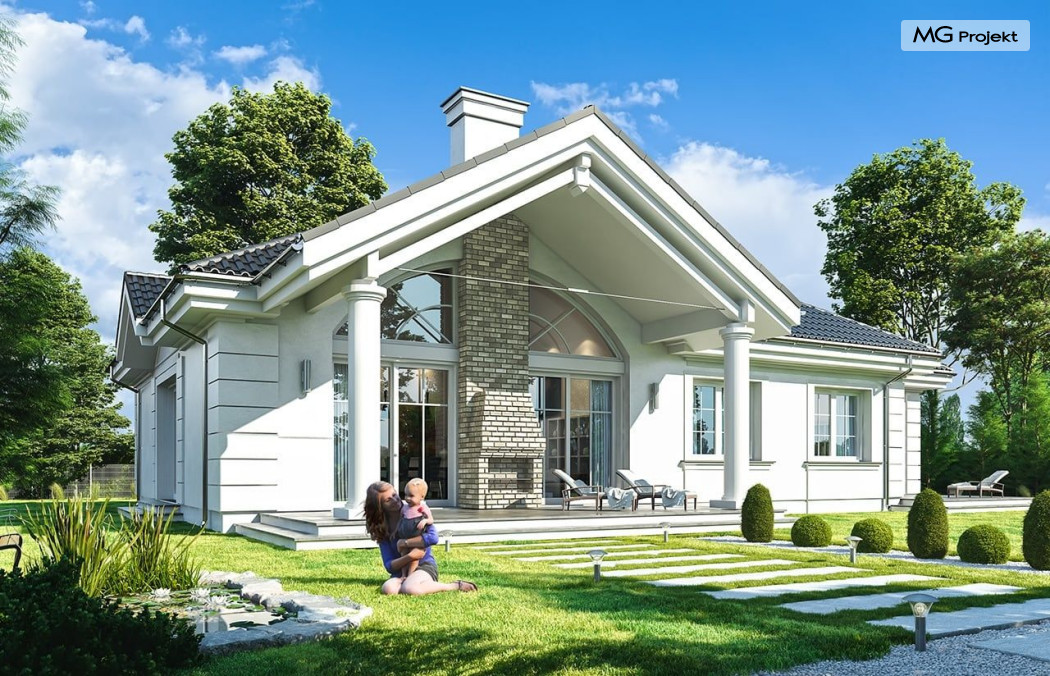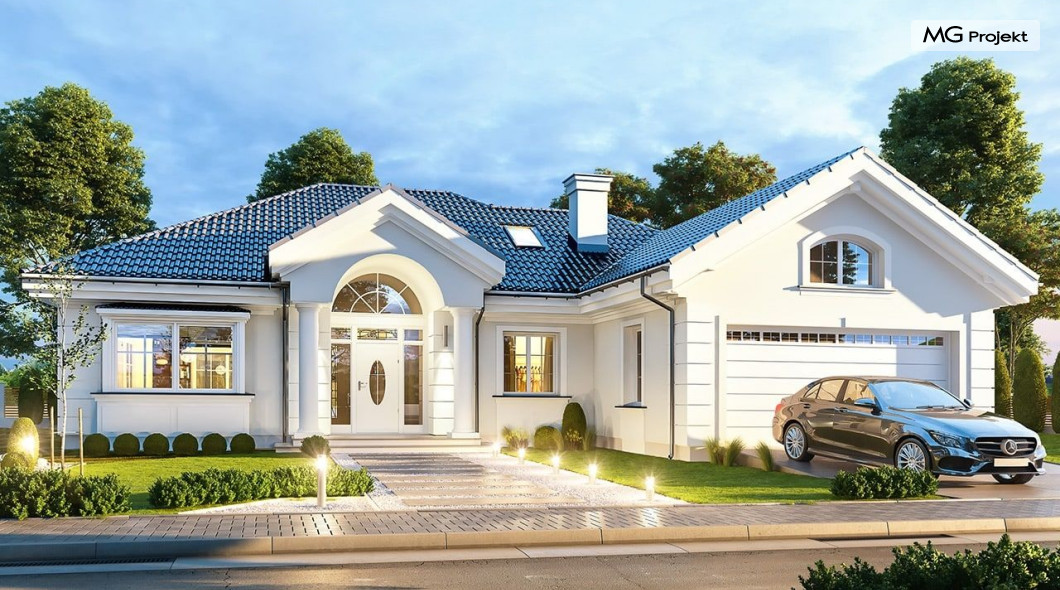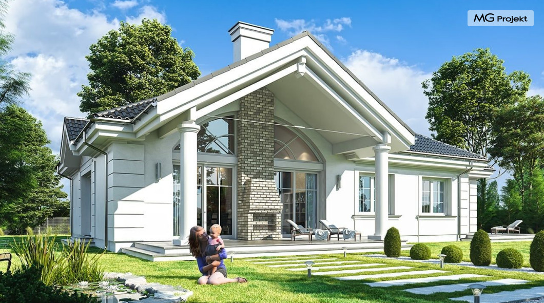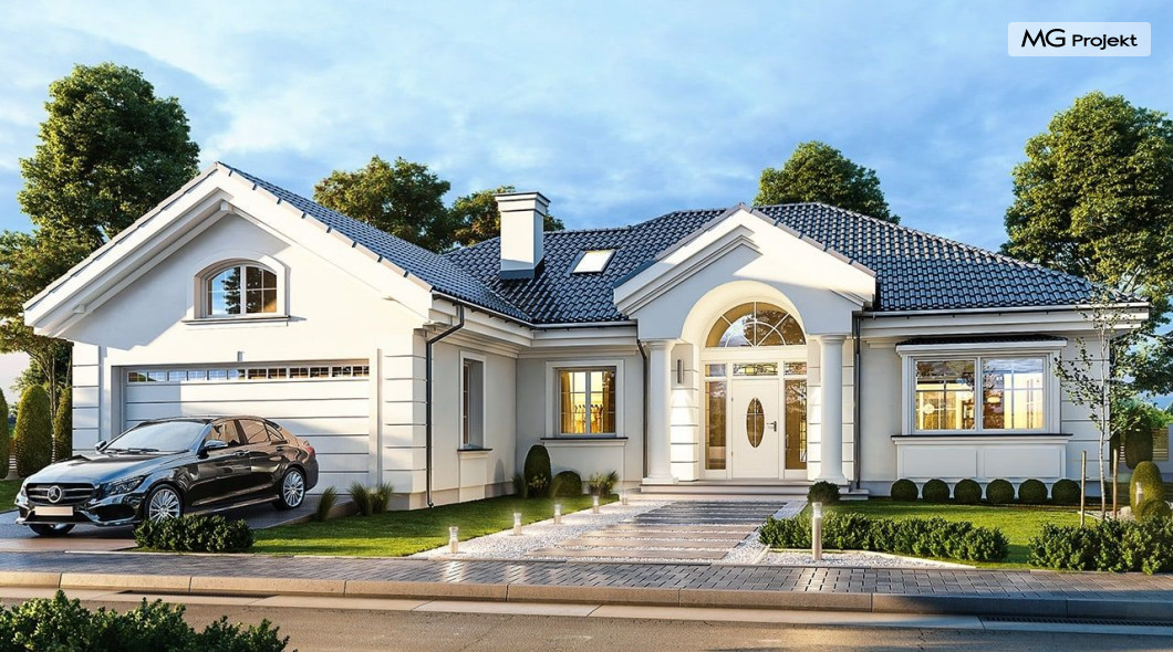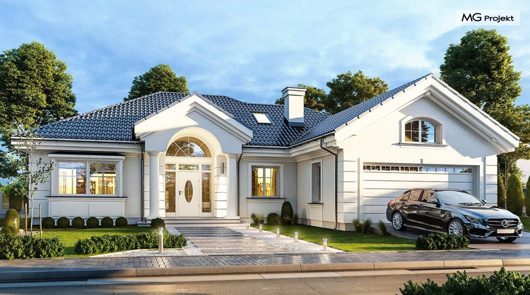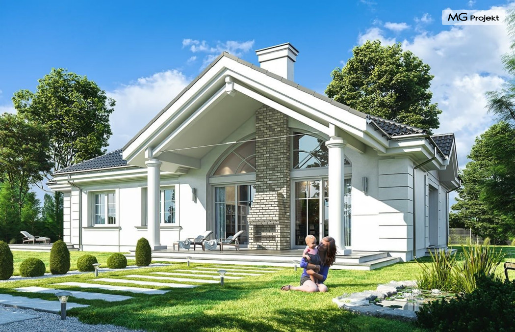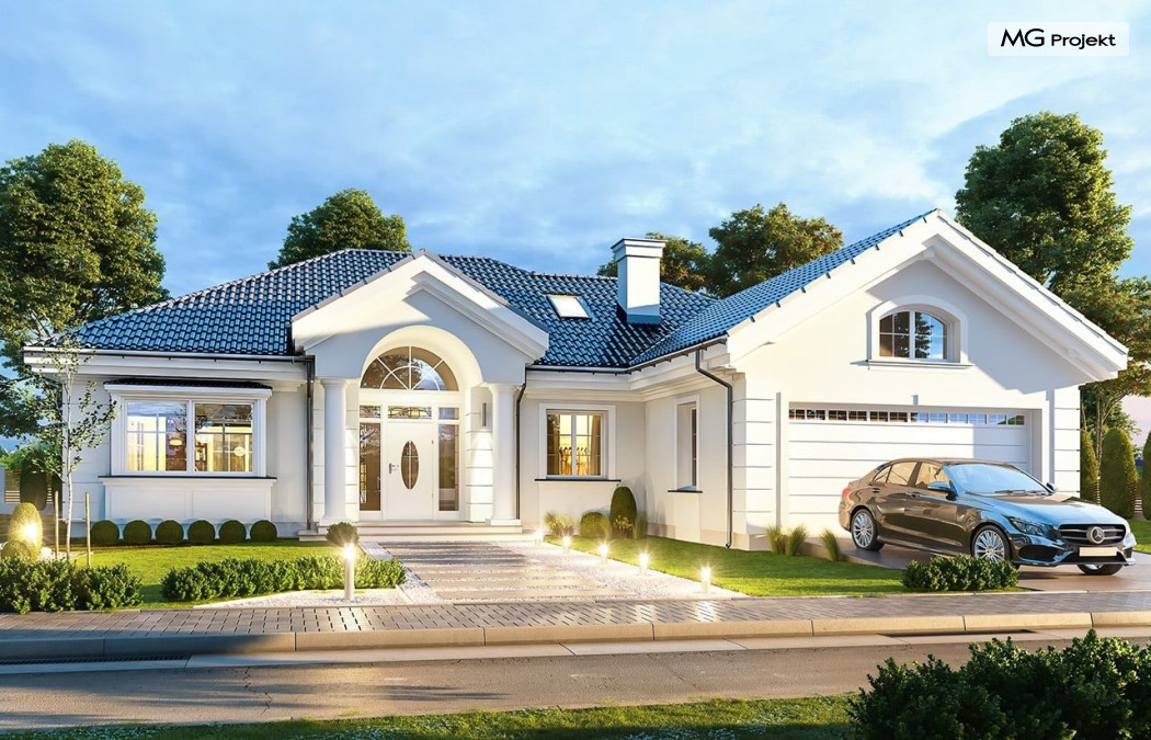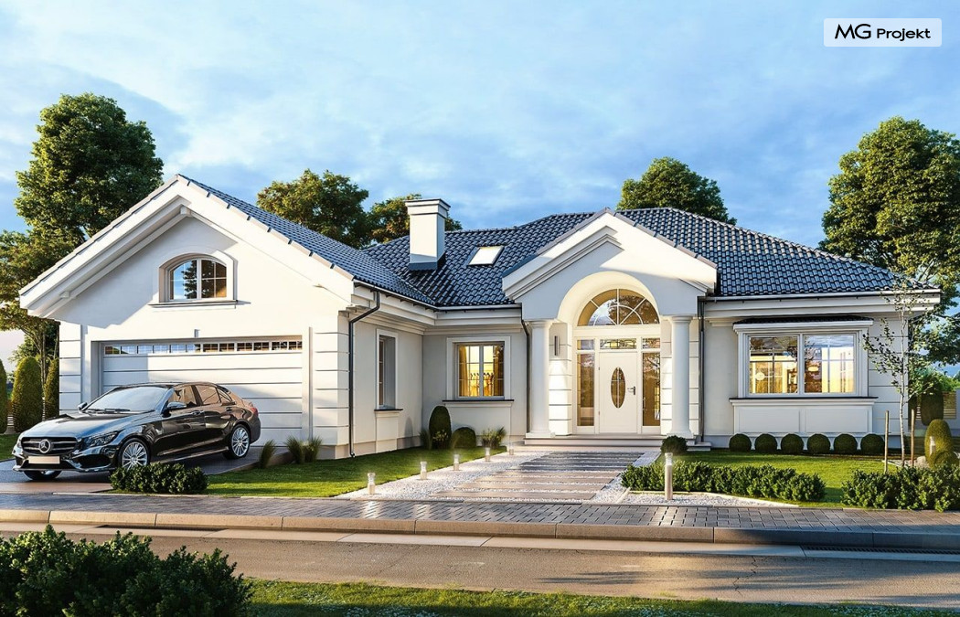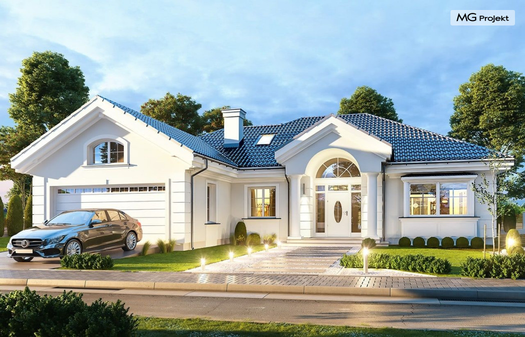 Projekt domu Willa parkowa B jest kolejną wersją projektu z serii „rezydencja parkowa – willa parkowa”. Budynek o bardziej zwartej bryle, węższy o niemal dwa metry od wersji bazowej, przeznaczony na mniejszą działkę. Dom jest komfortową parterową willą, nawiązującą architektonicznie do amerykańskich podmiejskich rezydencji i do naszych polskich dworków. Zastosowane w nim detale to połączenie nowoczesnych materiałów i rozwiązań, oraz klasycznej formy. Taki dom nigdy się nie zestarzeje, a jego styl będzie zawsze modny. Budynek został zaprojektowany jako parterowy, czyli bardzo wygodny w użytkowaniu. W projekcie domu Willa parkowa B szystkie pomieszczenia znajdują się na jednym poziomie. Na poddaszu mamy dodatkową przestrzeń do dowolnego wykorzystania poza podstawowym programem użytkowym. Wszystkie pokoje - zarówno salon jak i sypialnie mają bezpośredni kontakt z otaczającym ogrodem. Front budynku zaakcentowano reprezentacyjnym podcieniem wejściowym, z dużymi przeszklonymi drzwiami z naświetlami prowadzącymi do obszernego przedsionka. Wystający przed elewację frontową garaż pozwala na cofnięcie ściany frontowej od ogrodzenia, co tworzy właściwy dystans domu od drogi. W elewacji ogrodowej zaprojektowano duży zadaszony taras - miejsce rodzinnych biesiad i relaksu. Dom ma duże przeszklenia z ładnymi podziałami. Całość przykryta jest proporcjonalnym dachem. Wnętrze domu podzielono na część dzienną i nocną. W projekcie domu Willa parkowa B duży salon z pustką łączy się z jadalnią, holem, kuchnią w komfortowe wspólne wnętrze. W części nocnej zmieszczono trzy sypialnie (w tym sypialnia rodziców z garderobą) i dwie łazienki. Z sieni wejściowej przechodzimy z kolei przez szatnię do kotłowni –pralni, oraz do garażu dwustanowiskowego. Nad parterem mamy duży strych – poddasze. Może ono być użytkowe - z pokojami i łazienką, albo może pozostać po prostu strychem. Willa parkowa B to bardzo zgrabny stylowy dom jednorodzinny, dający komfort i prestiż jego przyszłym mieszkańcom. W budynku zastosowano dobre izolacje, oraz nowoczesne energooszczędne materiały. Wbrew pozorom nie będzie on bardzo drogi w budowie, ani w późniejszym utrzymaniu. Zapraszamy do obejrzenia wszystkich projektów domów z serii Willa Parkowa: https://www.mgprojekt.com.pl/willa-parkowa, https://www.mgprojekt.com.pl/willa-parkowa-2, https://www.mgprojekt.com.pl/willa-parkowa-3, https://www.mgprojekt.com.pl/willa-parkowa-4, https://www.mgprojekt.com.pl/willa-parkowa-5, https://www.mgprojekt.com.pl/willa-parkowa-6, https://www.mgprojekt.com.pl/willa-parkowa-6-d, https://www.mgprojekt.com.pl/willa-parkowa-7, https://www.mgprojekt.com.pl/willa-parkowa-8-a, https://www.mgprojekt.com.pl/willa-parkowa-8-b, https://www.mgprojekt.com.pl/willa-parkowa-9, https://www.mgprojekt.com.pl/willa-parkowa-10, https://www.mgprojekt.com.pl/willa-parkowa-b, https://www.mgprojekt.com.pl/willa-parkowa-c, https://www.mgprojekt.com.pl/willa-parkowa-d.