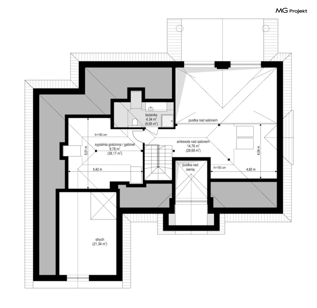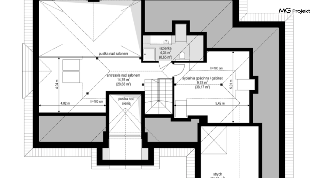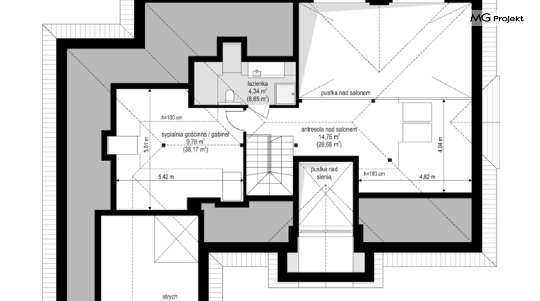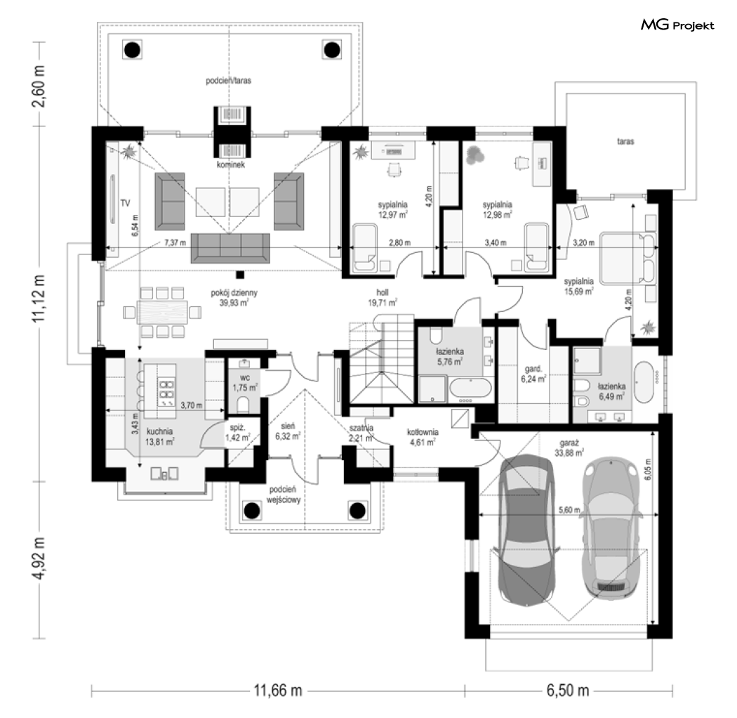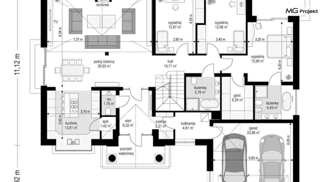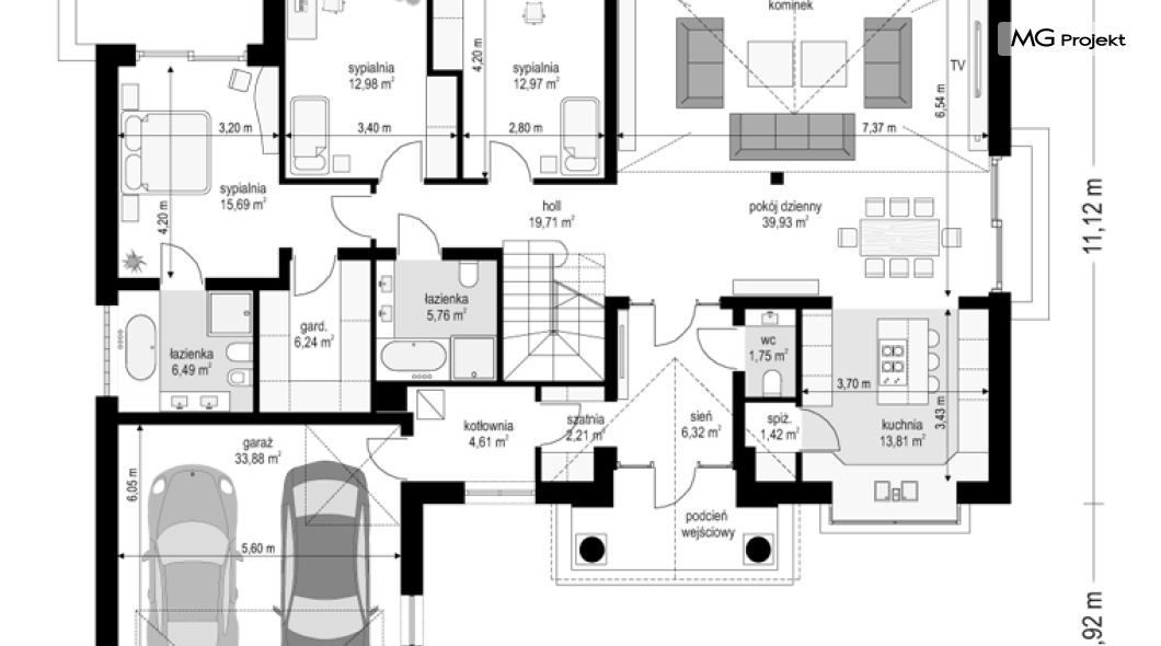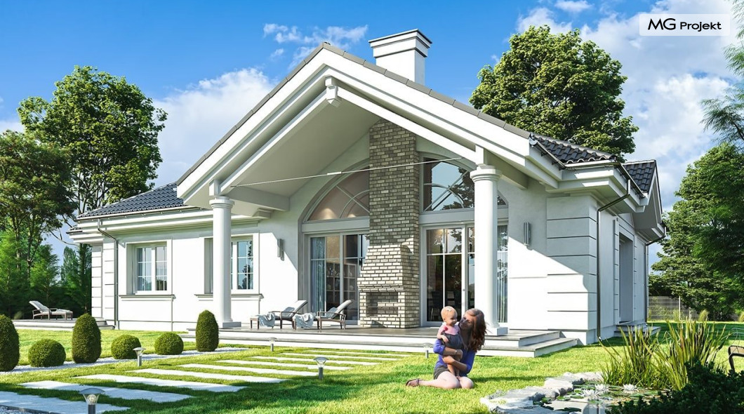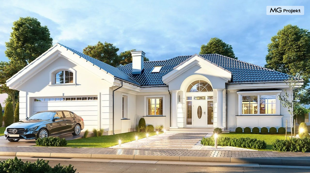 Projekt domu Willa parkowa B jest kolejną wersją projektu z serii „rezydencja parkowa – willa parkowa”. Budynek o bardziej zwartej bryle, węższy o niemal dwa metry od wersji bazowej, przeznaczony na mniejszą działkę. Dom jest komfortową parterową willą, nawiązującą architektonicznie do amerykańskich podmiejskich rezydencji i do naszych polskich dworków. Zastosowane w nim detale to połączenie nowoczesnych materiałów i rozwiązań, oraz klasycznej formy. Taki dom nigdy się nie zestarzeje, a jego styl będzie zawsze modny. Budynek został zaprojektowany jako parterowy, czyli bardzo wygodny w użytkowaniu. W projekcie domu Willa parkowa B szystkie pomieszczenia znajdują się na jednym poziomie. Na poddaszu mamy dodatkową przestrzeń do dowolnego wykorzystania poza podstawowym programem użytkowym. Wszystkie pokoje - zarówno salon jak i sypialnie mają bezpośredni kontakt z otaczającym ogrodem. Front budynku zaakcentowano reprezentacyjnym podcieniem wejściowym, z dużymi przeszklonymi drzwiami z naświetlami prowadzącymi do obszernego przedsionka. Wystający przed elewację frontową garaż pozwala na cofnięcie ściany frontowej od ogrodzenia, co tworzy właściwy dystans domu od drogi. W elewacji ogrodowej zaprojektowano duży zadaszony taras - miejsce rodzinnych biesiad i relaksu. Dom ma duże przeszklenia z ładnymi podziałami. Całość przykryta jest proporcjonalnym dachem. Wnętrze domu podzielono na część dzienną i nocną. W projekcie domu Willa parkowa B duży salon z pustką łączy się z jadalnią, holem, kuchnią w komfortowe wspólne wnętrze. W części nocnej zmieszczono trzy sypialnie (w tym sypialnia rodziców z garderobą) i dwie łazienki. Z sieni wejściowej przechodzimy z kolei przez szatnię do kotłowni –pralni, oraz do garażu dwustanowiskowego. Nad parterem mamy duży strych – poddasze. Może ono być użytkowe - z pokojami i łazienką, albo może pozostać po prostu strychem. Willa parkowa B to bardzo zgrabny stylowy dom jednorodzinny, dający komfort i prestiż jego przyszłym mieszkańcom. W budynku zastosowano dobre izolacje, oraz nowoczesne energooszczędne materiały. Wbrew pozorom nie będzie on bardzo drogi w budowie, ani w późniejszym utrzymaniu. Zapraszamy do obejrzenia wszystkich projektów domów z serii Willa Parkowa: https://www.mgprojekt.com.pl/willa-parkowa, https://www.mgprojekt.com.pl/willa-parkowa-2, https://www.mgprojekt.com.pl/willa-parkowa-3, https://www.mgprojekt.com.pl/willa-parkowa-4, https://www.mgprojekt.com.pl/willa-parkowa-5, https://www.mgprojekt.com.pl/willa-parkowa-6, https://www.mgprojekt.com.pl/willa-parkowa-6-d, https://www.mgprojekt.com.pl/willa-parkowa-7, https://www.mgprojekt.com.pl/willa-parkowa-8-a, https://www.mgprojekt.com.pl/willa-parkowa-8-b, https://www.mgprojekt.com.pl/willa-parkowa-9, https://www.mgprojekt.com.pl/willa-parkowa-10, https://www.mgprojekt.com.pl/willa-parkowa-b, https://www.mgprojekt.com.pl/willa-parkowa-c, https://www.mgprojekt.com.pl/willa-parkowa-d.