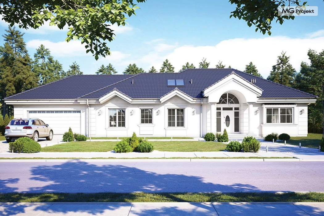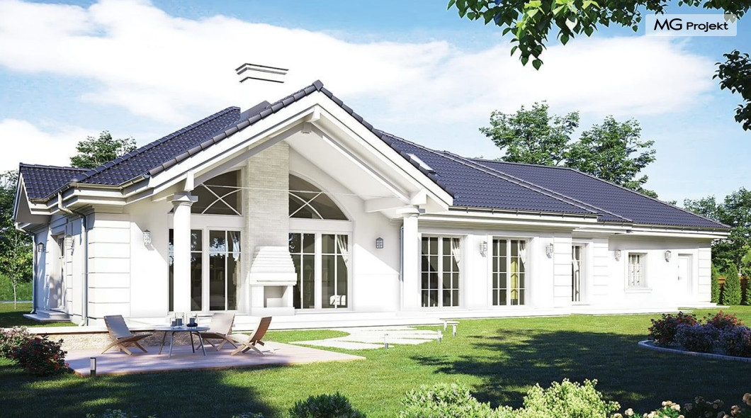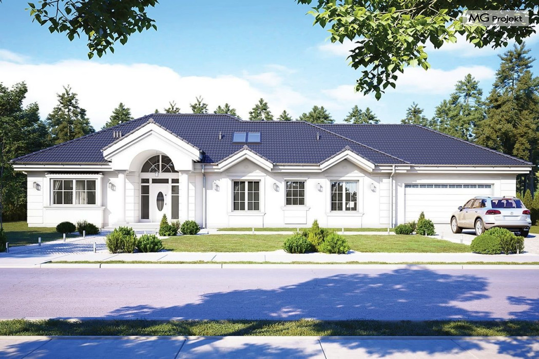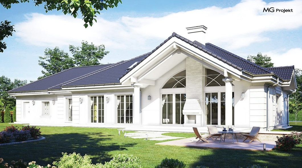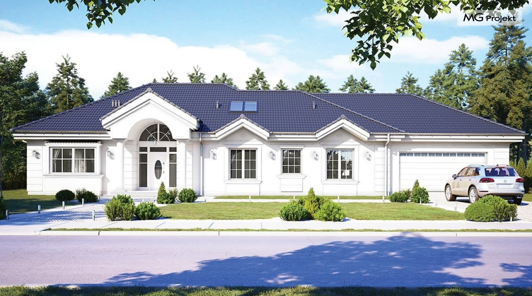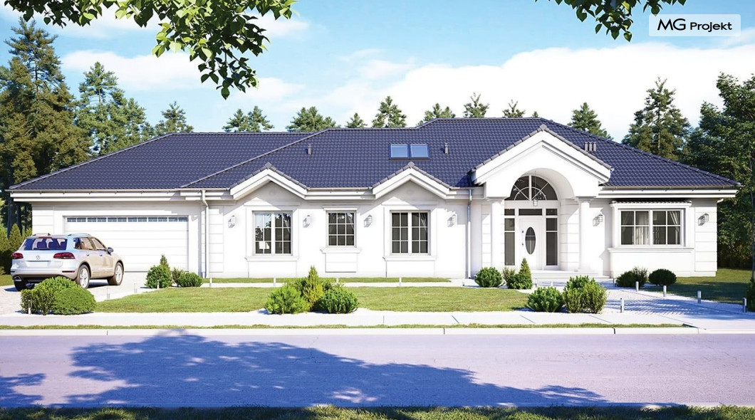 Projekt domu Willa parkowa C to projekt domu jednorodzinnego z cieszącej się popularnością serii projektów Willa parkowa. Dom został zaprojektowany w oparciu o sugestie Inwestorów, którym spodobała się stylistyka Willi parkowych, ale chcieliby mieć garaż z boku, nie wystający przed ścianę frontową - bądź to z przyczyn estetycznych, bądź to z powodu płytkiej działki . Bryła budynku jest więc obecnie podłużna, składa się z prostokątnej głównej części mieszkalnej i dobudowanej do niej - garażowo-gospodarczej. Architektonicznie projekt domu Willa parkowa C nawiązuje do polskiego dworku,oraz do podmiejskich amerykańskich willi. Klasyczna forma i detale współgrają tutaj z nowoczesnymi materiałami, technologiami i funkcjonalnością wnętrz. Do domu wchodzimy przez piękny łukowy podcień z kolumnami, zapraszający przez solidne drzwi z naświetlami do wnętrza. Przedsionek z podwyższonym łukowym sufitem jest pierwszą atrakcją. Następnie przechodzimy do otwartej przestrzeni dziennej, z pustką nad salonem i wielkimi podwyższonymi przeszkleniami otwierającymi salon na taras i ogród. Na parterze w części dziennej mamy wygodną kuchnię z wyspą i spiżarnią, pokój dzienny z jadalnią i częścią wypoczynkową, oraz hol z reprezentacyjnymi schodami na górę. Obok zaprojektowano dostępne z korytarza sypialnie domowników: apartament rodziców z własną łazienką i garderobą, oraz dwie sypialnie dzieci, łazienkę i pralnię. Część gospodarcza domu jest oddzielona od reszty wnętrza, co szczególnie Klienci budujący się poza miastem często doceniają. Nad parterem mieści się strych, który z łatwością można zaadaptować na poddasze użytkowe. Z poddasza przez antresolę mamy widok na salon poniżej. Dom Willa parkowa C jest bardzo wygodny i komfortowy. Stanowi idealną propozycję dla osób marzących o wygodnym życiu na parterze, na jednej kondygnacji, blisko ogrodu. Budynek zaprojektowano jako energooszczędny, stosując nowoczesne materiały i instalacje. Projekt domu Willa parkowa C nie ma trudnej konstrukcji - powinien być dość prosty w budowie. Zapraszamy do obejrzenia wszystkich projektów domów z serii Willa Parkowa: https://www.mgprojekt.com.pl/willa-parkowa, https://www.mgprojekt.com.pl/willa-parkowa-2, https://www.mgprojekt.com.pl/willa-parkowa-3, https://www.mgprojekt.com.pl/willa-parkowa-4, https://www.mgprojekt.com.pl/willa-parkowa-5, https://www.mgprojekt.com.pl/willa-parkowa-6, https://www.mgprojekt.com.pl/willa-parkowa-6-d, https://www.mgprojekt.com.pl/willa-parkowa-7, https://www.mgprojekt.com.pl/willa-parkowa-8-a, https://www.mgprojekt.com.pl/willa-parkowa-8-b, https://www.mgprojekt.com.pl/willa-parkowa-9, https://www.mgprojekt.com.pl/willa-parkowa-10, https://www.mgprojekt.com.pl/willa-parkowa-b, https://www.mgprojekt.com.pl/willa-parkowa-c, https://www.mgprojekt.com.pl/willa-parkowa-d.