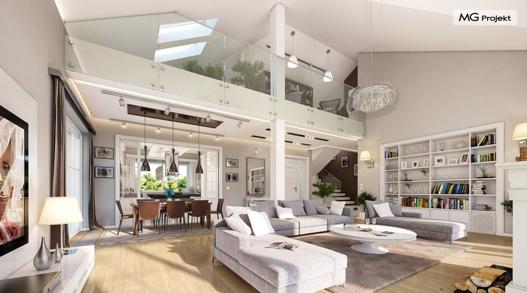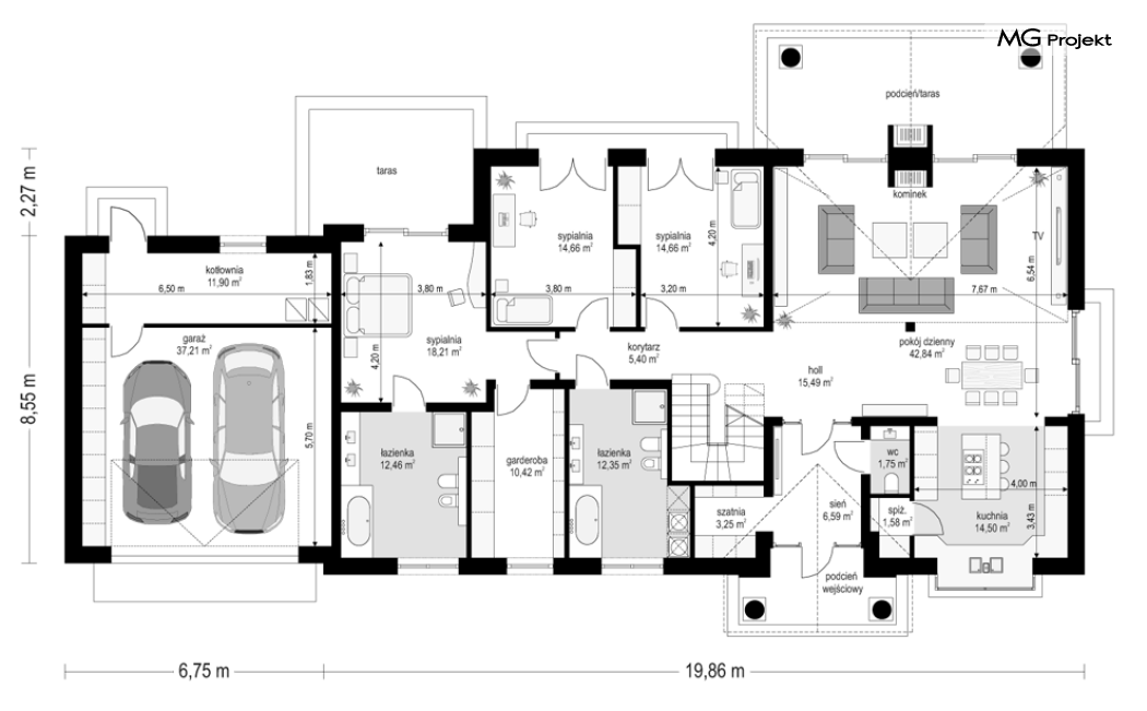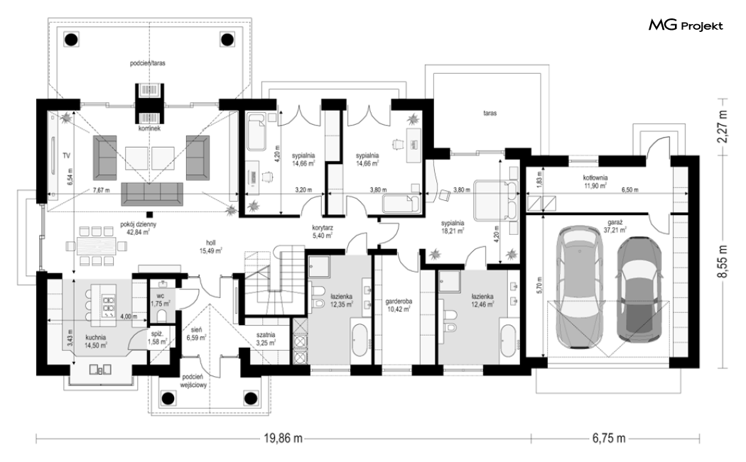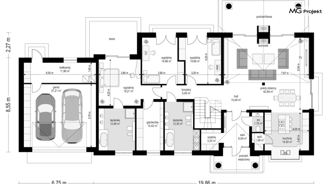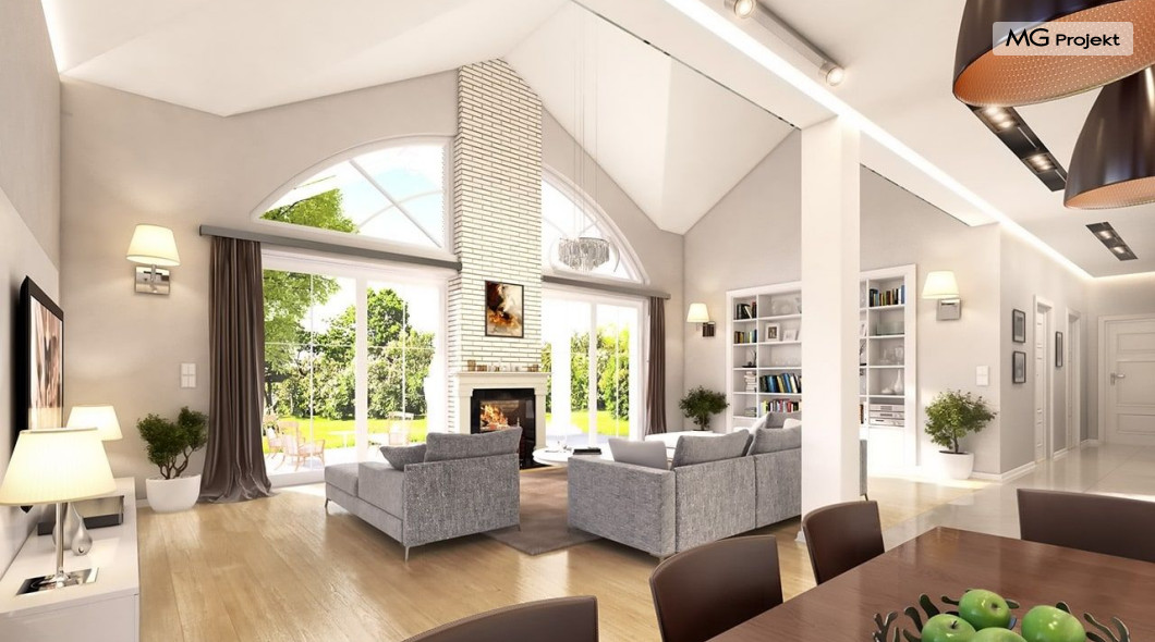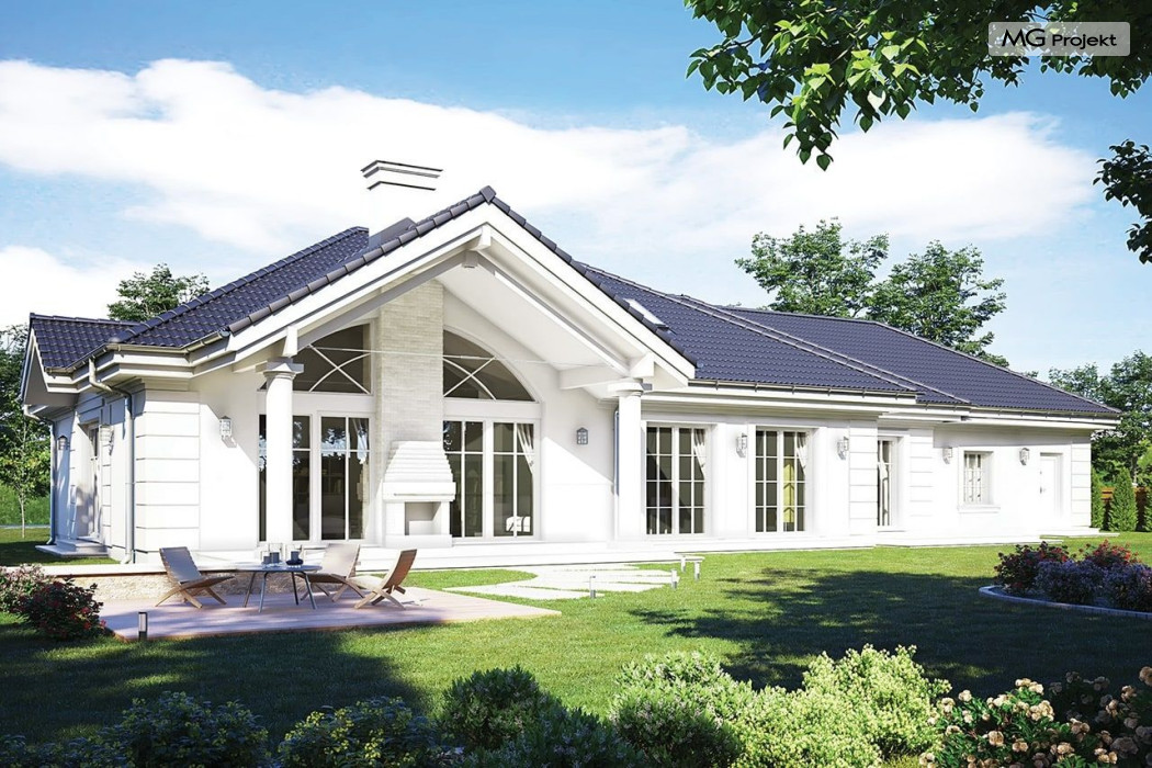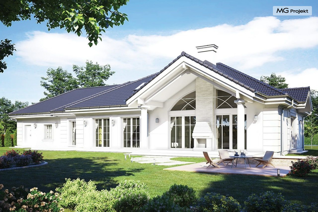 Projekt domu Willa parkowa C to projekt domu jednorodzinnego z cieszącej się popularnością serii projektów Willa parkowa. Dom został zaprojektowany w oparciu o sugestie Inwestorów, którym spodobała się stylistyka Willi parkowych, ale chcieliby mieć garaż z boku, nie wystający przed ścianę frontową - bądź to z przyczyn estetycznych, bądź to z powodu płytkiej działki . Bryła budynku jest więc obecnie podłużna, składa się z prostokątnej głównej części mieszkalnej i dobudowanej do niej - garażowo-gospodarczej. Architektonicznie projekt domu Willa parkowa C nawiązuje do polskiego dworku,oraz do podmiejskich amerykańskich willi. Klasyczna forma i detale współgrają tutaj z nowoczesnymi materiałami, technologiami i funkcjonalnością wnętrz. Do domu wchodzimy przez piękny łukowy podcień z kolumnami, zapraszający przez solidne drzwi z naświetlami do wnętrza. Przedsionek z podwyższonym łukowym sufitem jest pierwszą atrakcją. Następnie przechodzimy do otwartej przestrzeni dziennej, z pustką nad salonem i wielkimi podwyższonymi przeszkleniami otwierającymi salon na taras i ogród. Na parterze w części dziennej mamy wygodną kuchnię z wyspą i spiżarnią, pokój dzienny z jadalnią i częścią wypoczynkową, oraz hol z reprezentacyjnymi schodami na górę. Obok zaprojektowano dostępne z korytarza sypialnie domowników: apartament rodziców z własną łazienką i garderobą, oraz dwie sypialnie dzieci, łazienkę i pralnię. Część gospodarcza domu jest oddzielona od reszty wnętrza, co szczególnie Klienci budujący się poza miastem często doceniają. Nad parterem mieści się strych, który z łatwością można zaadaptować na poddasze użytkowe. Z poddasza przez antresolę mamy widok na salon poniżej. Dom Willa parkowa C jest bardzo wygodny i komfortowy. Stanowi idealną propozycję dla osób marzących o wygodnym życiu na parterze, na jednej kondygnacji, blisko ogrodu. Budynek zaprojektowano jako energooszczędny, stosując nowoczesne materiały i instalacje. Projekt domu Willa parkowa C nie ma trudnej konstrukcji - powinien być dość prosty w budowie. Zapraszamy do obejrzenia wszystkich projektów domów z serii Willa Parkowa: https://www.mgprojekt.com.pl/willa-parkowa, https://www.mgprojekt.com.pl/willa-parkowa-2, https://www.mgprojekt.com.pl/willa-parkowa-3, https://www.mgprojekt.com.pl/willa-parkowa-4, https://www.mgprojekt.com.pl/willa-parkowa-5, https://www.mgprojekt.com.pl/willa-parkowa-6, https://www.mgprojekt.com.pl/willa-parkowa-6-d, https://www.mgprojekt.com.pl/willa-parkowa-7, https://www.mgprojekt.com.pl/willa-parkowa-8-a, https://www.mgprojekt.com.pl/willa-parkowa-8-b, https://www.mgprojekt.com.pl/willa-parkowa-9, https://www.mgprojekt.com.pl/willa-parkowa-10, https://www.mgprojekt.com.pl/willa-parkowa-b, https://www.mgprojekt.com.pl/willa-parkowa-c, https://www.mgprojekt.com.pl/willa-parkowa-d.