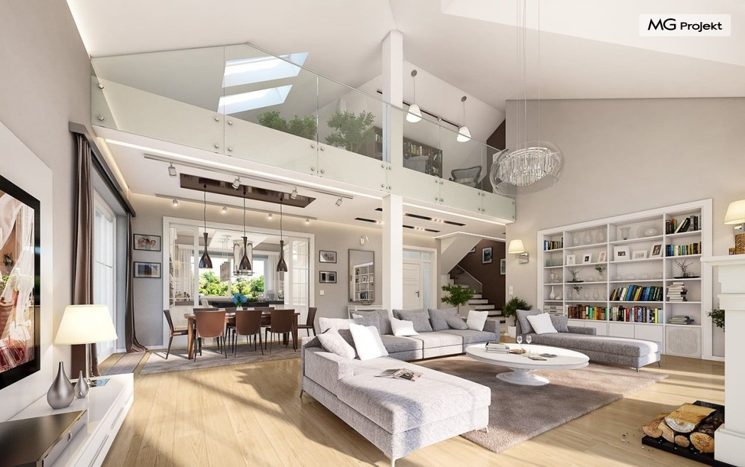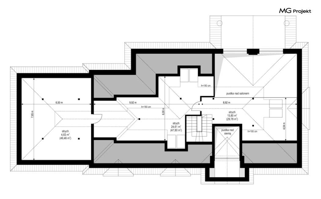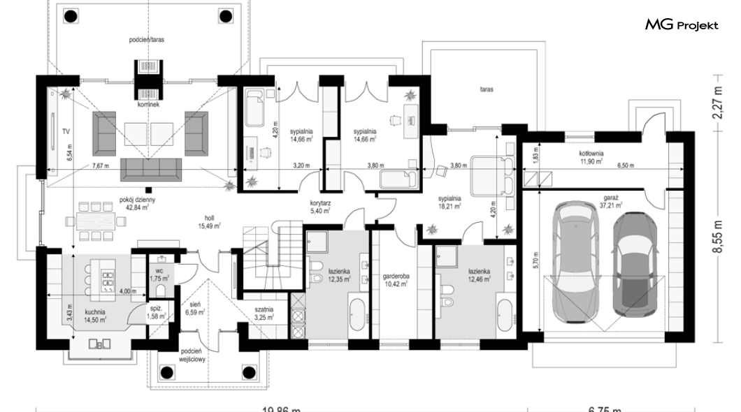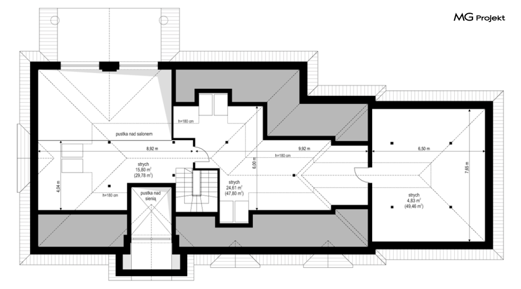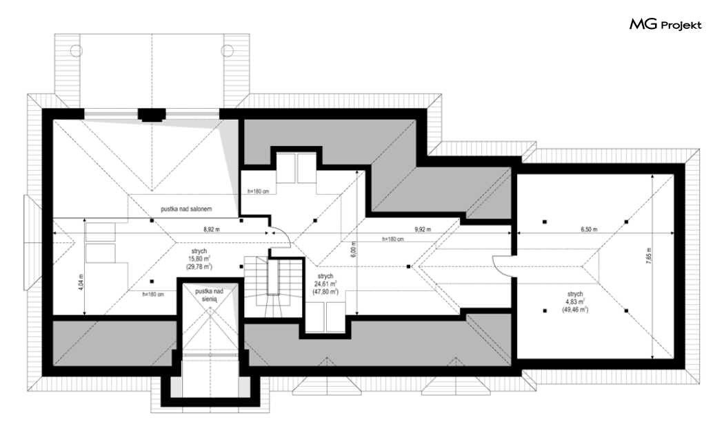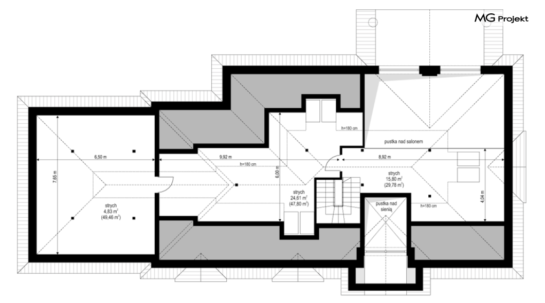 Projekt domu Willa parkowa C to projekt domu jednorodzinnego z cieszącej się popularnością serii projektów Willa parkowa. Dom został zaprojektowany w oparciu o sugestie Inwestorów, którym spodobała się stylistyka Willi parkowych, ale chcieliby mieć garaż z boku, nie wystający przed ścianę frontową - bądź to z przyczyn estetycznych, bądź to z powodu płytkiej działki . Bryła budynku jest więc obecnie podłużna, składa się z prostokątnej głównej części mieszkalnej i dobudowanej do niej - garażowo-gospodarczej. Architektonicznie projekt domu Willa parkowa C nawiązuje do polskiego dworku,oraz do podmiejskich amerykańskich willi. Klasyczna forma i detale współgrają tutaj z nowoczesnymi materiałami, technologiami i funkcjonalnością wnętrz. Do domu wchodzimy przez piękny łukowy podcień z kolumnami, zapraszający przez solidne drzwi z naświetlami do wnętrza. Przedsionek z podwyższonym łukowym sufitem jest pierwszą atrakcją. Następnie przechodzimy do otwartej przestrzeni dziennej, z pustką nad salonem i wielkimi podwyższonymi przeszkleniami otwierającymi salon na taras i ogród. Na parterze w części dziennej mamy wygodną kuchnię z wyspą i spiżarnią, pokój dzienny z jadalnią i częścią wypoczynkową, oraz hol z reprezentacyjnymi schodami na górę. Obok zaprojektowano dostępne z korytarza sypialnie domowników: apartament rodziców z własną łazienką i garderobą, oraz dwie sypialnie dzieci, łazienkę i pralnię. Część gospodarcza domu jest oddzielona od reszty wnętrza, co szczególnie Klienci budujący się poza miastem często doceniają. Nad parterem mieści się strych, który z łatwością można zaadaptować na poddasze użytkowe. Z poddasza przez antresolę mamy widok na salon poniżej. Dom Willa parkowa C jest bardzo wygodny i komfortowy. Stanowi idealną propozycję dla osób marzących o wygodnym życiu na parterze, na jednej kondygnacji, blisko ogrodu. Budynek zaprojektowano jako energooszczędny, stosując nowoczesne materiały i instalacje. Projekt domu Willa parkowa C nie ma trudnej konstrukcji - powinien być dość prosty w budowie. Zapraszamy do obejrzenia wszystkich projektów domów z serii Willa Parkowa: https://www.mgprojekt.com.pl/willa-parkowa, https://www.mgprojekt.com.pl/willa-parkowa-2, https://www.mgprojekt.com.pl/willa-parkowa-3, https://www.mgprojekt.com.pl/willa-parkowa-4, https://www.mgprojekt.com.pl/willa-parkowa-5, https://www.mgprojekt.com.pl/willa-parkowa-6, https://www.mgprojekt.com.pl/willa-parkowa-6-d, https://www.mgprojekt.com.pl/willa-parkowa-7, https://www.mgprojekt.com.pl/willa-parkowa-8-a, https://www.mgprojekt.com.pl/willa-parkowa-8-b, https://www.mgprojekt.com.pl/willa-parkowa-9, https://www.mgprojekt.com.pl/willa-parkowa-10, https://www.mgprojekt.com.pl/willa-parkowa-b, https://www.mgprojekt.com.pl/willa-parkowa-c, https://www.mgprojekt.com.pl/willa-parkowa-d.