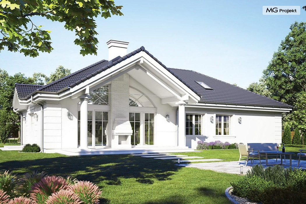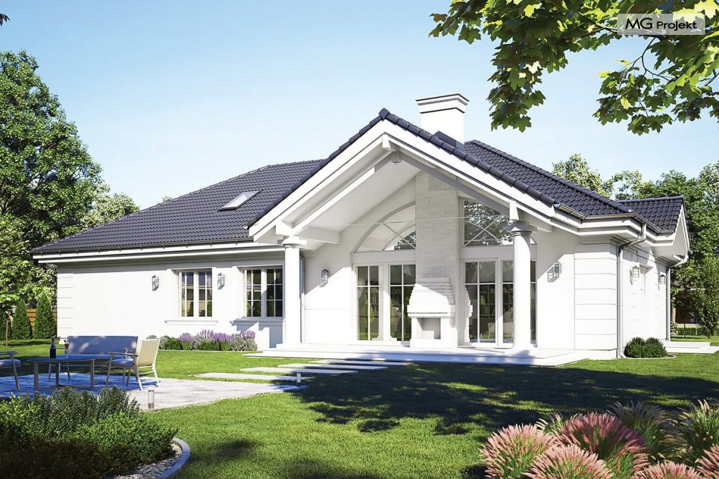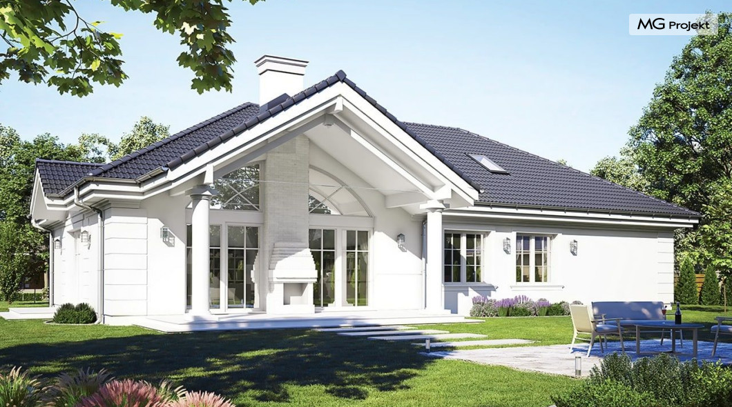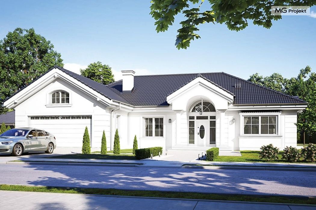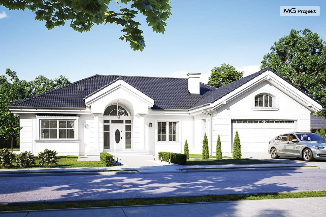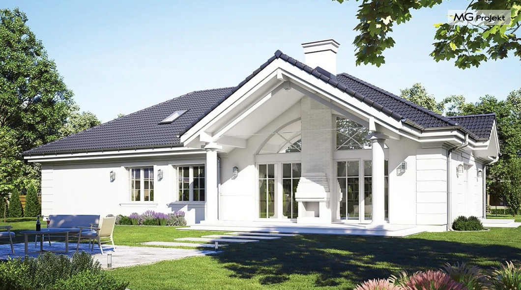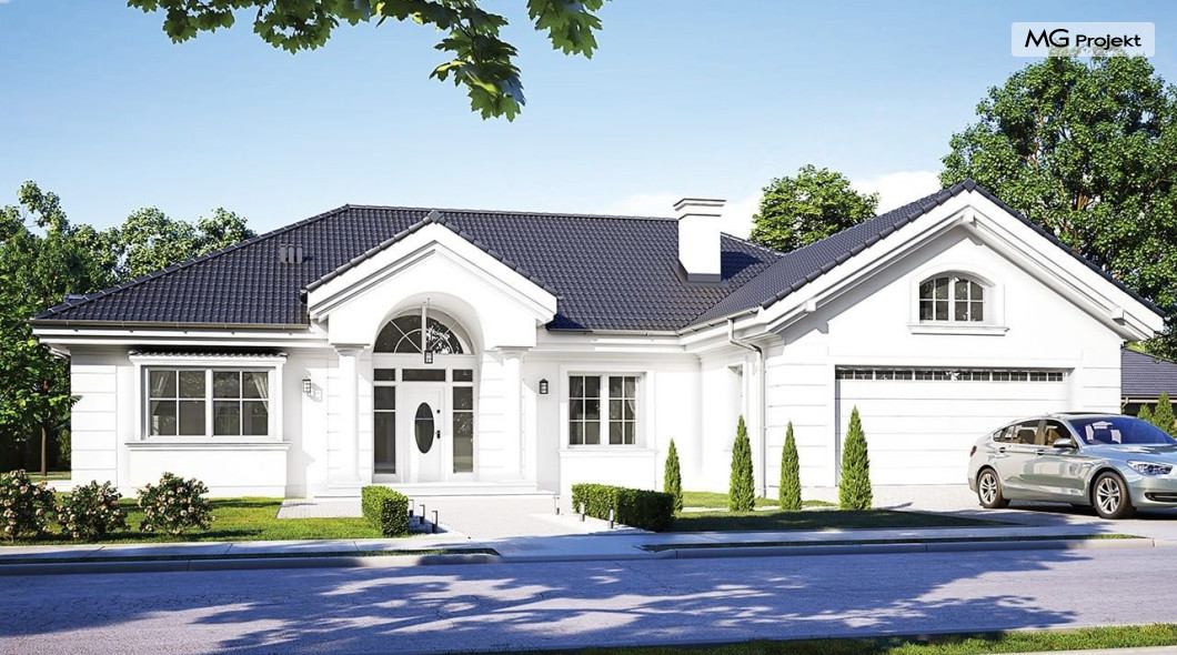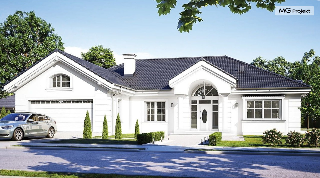Projekt domu Willa Parkowa D stanowi kolejną propozycję domu z serii projektów „Willa parkowa”. Budynek jest nieco większy od wersji bazowej, ma uproszczony - bardziej prostokątny - kształt rzutu i mniej skomplikowany dach. Willa parkowa wariant D to parterowy dom przykryty wielospadowym dachem, ze strychem do adaptacji na ewentualne poddasze. Architektura domu nawiązuje do amerykańskich willi z przedmieść, oraz do polskich dworków z lat 20-30 dwudziestego wieku. Osadzony w tradycji detal jest jednak stonowany, dyskretny, a dom zachowuje właściwe proporcje. Projekt domu Willa Parkowa D bez kłopotu wpasuje się w sąsiedztwo innych domków jednorodzinnych. Wejście podkreślone jest ciekawym łukowym portykiem z naświetlami wokół solidnych drzwi. Garaż lekko wysunięty przed linię elewacji tworzy niewielki frontowy placyk wejściowy. Od strony ogrodu ozdobę jest szerokie zadaszenie nad tarasem, z pięknym wysokim oknem salonu i wyeksponowaną ścianą kominkową. Wnętrze Willi Parkowej D: do domu wchodzimy przez obszerny przedsionek z szatnią, połączony z garażem i kotłownią , wprost do pokoju dziennego i jadalni, z pustką nad połową powierzchni salonu. Część dzienna holu, pokoju dziennego i pięknej kuchni z wyspą i spiżarnią ma powierzchnię blisko 80 m2! Na lewo od wejścia zaprojektowane są reprezentacyjne schody na strych / poddasze i dalej korytarz do pokoi w części nocnej parteru. W tym fragmencie domu mamy trzy sypialnie: apartament rodziców z własną łazienką i garderobą, oraz dwie sypialnie dzieci, łazienkę i pralnię. Wszystkie pokoje są ładne i ustawne. Na górze mieści się strych , który łatwo można zaadaptować na poddasze użytkowe, z dwoma pokojami i łazienką, z których jeden pokój to antresola nad otwartym poniżej salonem. Dom ma stosunkowo prostą konstrukcję, jest funkcjonalnie i logicznie zaprojektowany. W budynku zastosowano nowoczesne materiały, bardzo dobre izolacje i instalacje. Budynek jest energooszczędny i będzie niedrogi w przyszłej eksploatacji. Projekt domu Willa Parkowa D to doskonała propozycja dla osób pragnących klasycznego parterowego domu, którzy cenią sobie komfort i wygodę, oraz ponadczasowy styl. Zapraszamy do obejrzenia wszystkich projektów domów z serii Willa Parkowa: https://www.mgprojekt.com.pl/willa-parkowa, https://www.mgprojekt.com.pl/willa-parkowa-2, https://www.mgprojekt.com.pl/willa-parkowa-3, https://www.mgprojekt.com.pl/willa-parkowa-4, https://www.mgprojekt.com.pl/willa-parkowa-5, https://www.mgprojekt.com.pl/willa-parkowa-6, https://www.mgprojekt.com.pl/willa-parkowa-6-d, https://www.mgprojekt.com.pl/willa-parkowa-7, https://www.mgprojekt.com.pl/willa-parkowa-8-a, https://www.mgprojekt.com.pl/willa-parkowa-8-b, https://www.mgprojekt.com.pl/willa-parkowa-9, https://www.mgprojekt.com.pl/willa-parkowa-10, https://www.mgprojekt.com.pl/willa-parkowa-b, https://www.mgprojekt.com.pl/willa-parkowa-c, https://www.mgprojekt.com.pl/willa-parkowa-d.