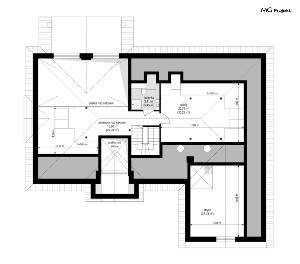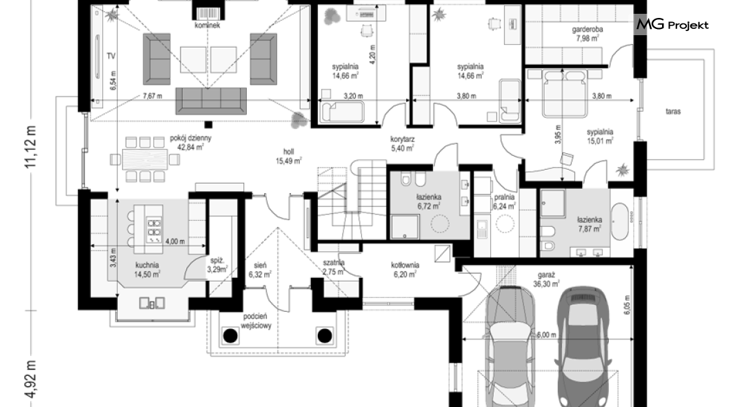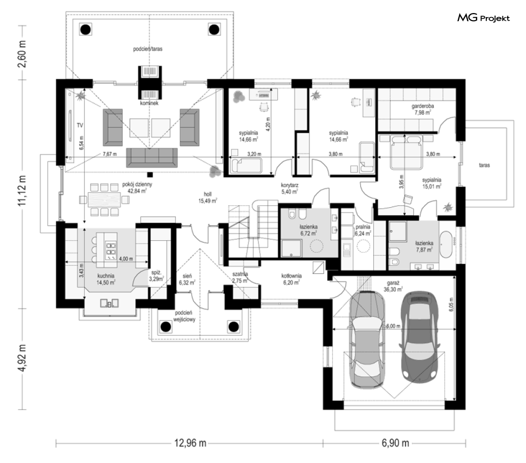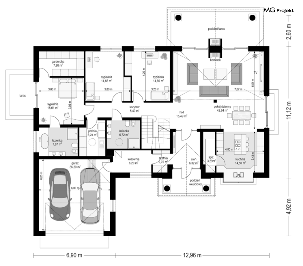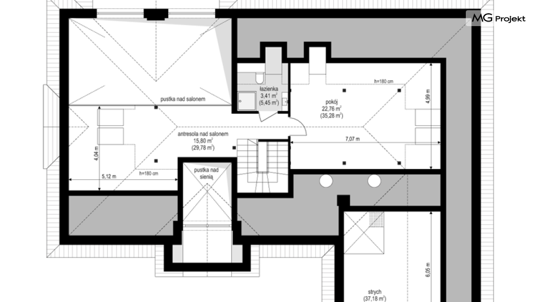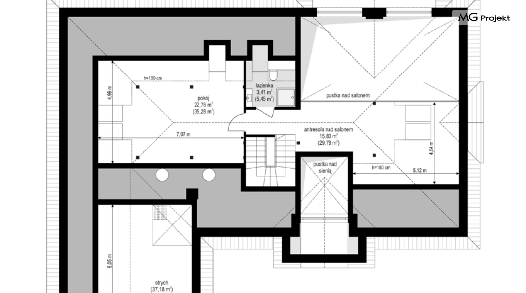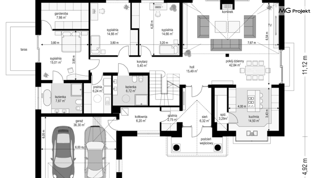 Projekt domu Willa Parkowa D stanowi kolejną propozycję domu z serii projektów „Willa parkowa”. Budynek jest nieco większy od wersji bazowej, ma uproszczony - bardziej prostokątny - kształt rzutu i mniej skomplikowany dach. Willa parkowa wariant D to parterowy dom przykryty wielospadowym dachem, ze strychem do adaptacji na ewentualne poddasze. Architektura domu nawiązuje do amerykańskich willi z przedmieść, oraz do polskich dworków z lat 20-30 dwudziestego wieku. Osadzony w tradycji detal jest jednak stonowany, dyskretny, a dom zachowuje właściwe proporcje. Projekt domu Willa Parkowa D bez kłopotu wpasuje się w sąsiedztwo innych domków jednorodzinnych. Wejście podkreślone jest ciekawym łukowym portykiem z naświetlami wokół solidnych drzwi. Garaż lekko wysunięty przed linię elewacji tworzy niewielki frontowy placyk wejściowy. Od strony ogrodu ozdobę jest szerokie zadaszenie nad tarasem, z pięknym wysokim oknem salonu i wyeksponowaną ścianą kominkową. Wnętrze Willi Parkowej D: do domu wchodzimy przez obszerny przedsionek z szatnią, połączony z garażem i kotłownią , wprost do pokoju dziennego i jadalni, z pustką nad połową powierzchni salonu. Część dzienna holu, pokoju dziennego i pięknej kuchni z wyspą i spiżarnią ma powierzchnię blisko 80 m2! Na lewo od wejścia zaprojektowane są reprezentacyjne schody na strych / poddasze i dalej korytarz do pokoi w części nocnej parteru. W tym fragmencie domu mamy trzy sypialnie: apartament rodziców z własną łazienką i garderobą, oraz dwie sypialnie dzieci, łazienkę i pralnię. Wszystkie pokoje są ładne i ustawne. Na górze mieści się strych , który łatwo można zaadaptować na poddasze użytkowe, z dwoma pokojami i łazienką, z których jeden pokój to antresola nad otwartym poniżej salonem. Dom ma stosunkowo prostą konstrukcję, jest funkcjonalnie i logicznie zaprojektowany. W budynku zastosowano nowoczesne materiały, bardzo dobre izolacje i instalacje. Budynek jest energooszczędny i będzie niedrogi w przyszłej eksploatacji. Projekt domu Willa Parkowa D to doskonała propozycja dla osób pragnących klasycznego parterowego domu, którzy cenią sobie komfort i wygodę, oraz ponadczasowy styl. Zapraszamy do obejrzenia wszystkich projektów domów z serii Willa Parkowa: https://www.mgprojekt.com.pl/willa-parkowa, https://www.mgprojekt.com.pl/willa-parkowa-2, https://www.mgprojekt.com.pl/willa-parkowa-3, https://www.mgprojekt.com.pl/willa-parkowa-4, https://www.mgprojekt.com.pl/willa-parkowa-5, https://www.mgprojekt.com.pl/willa-parkowa-6, https://www.mgprojekt.com.pl/willa-parkowa-6-d, https://www.mgprojekt.com.pl/willa-parkowa-7, https://www.mgprojekt.com.pl/willa-parkowa-8-a, https://www.mgprojekt.com.pl/willa-parkowa-8-b, https://www.mgprojekt.com.pl/willa-parkowa-9, https://www.mgprojekt.com.pl/willa-parkowa-10, https://www.mgprojekt.com.pl/willa-parkowa-b, https://www.mgprojekt.com.pl/willa-parkowa-c, https://www.mgprojekt.com.pl/willa-parkowa-d.