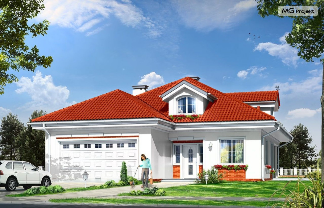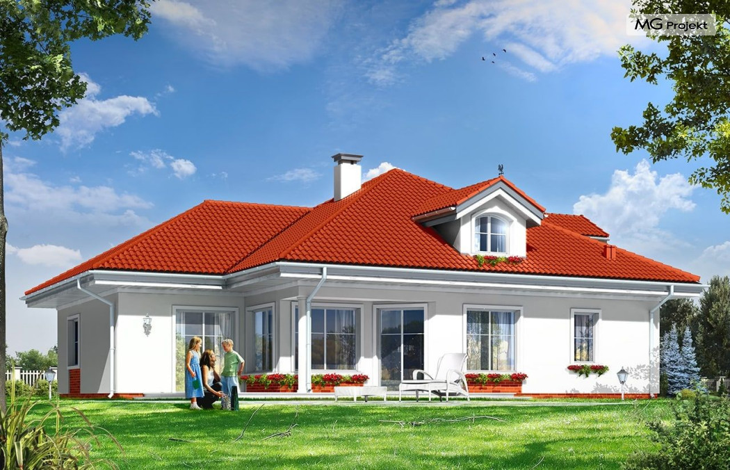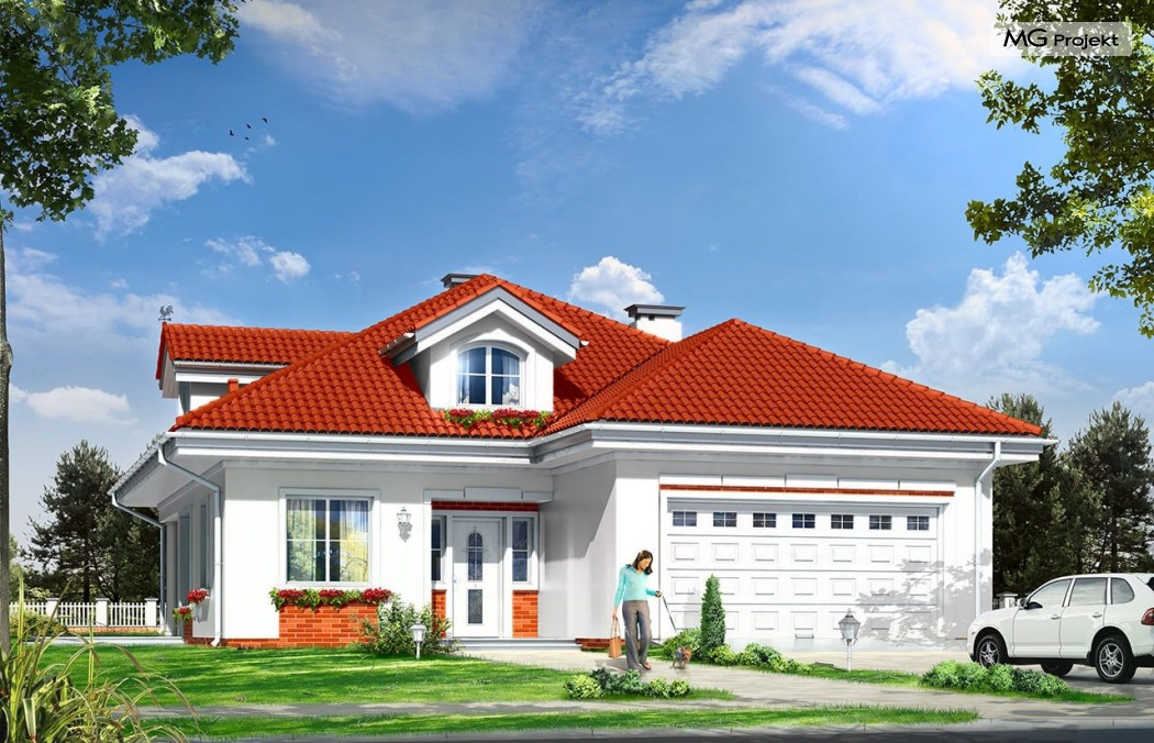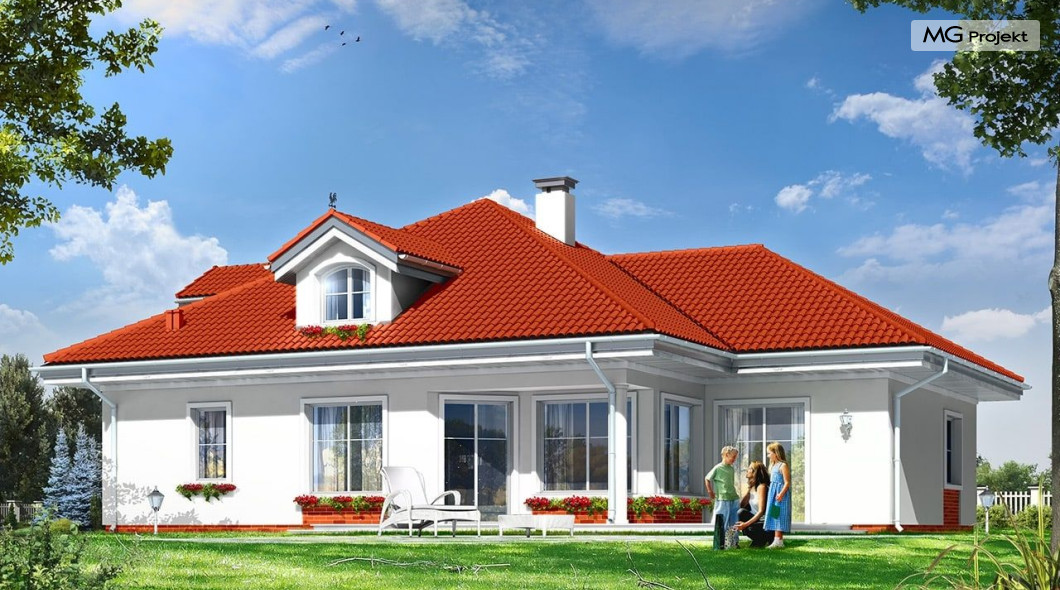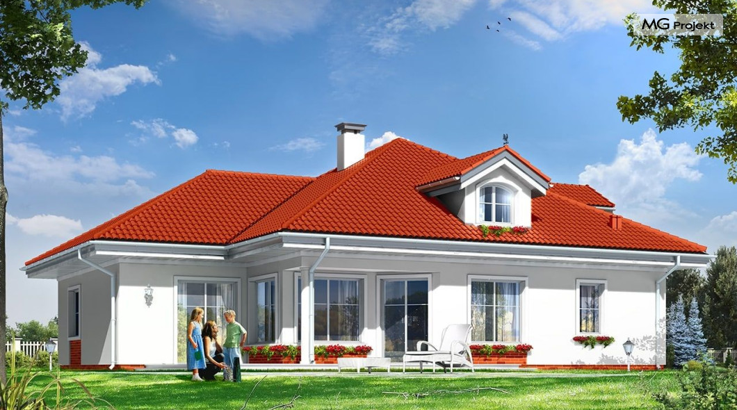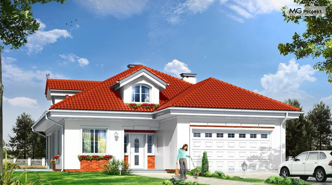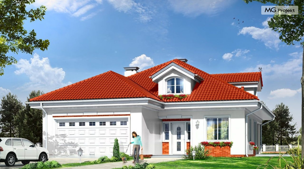 Architektura gotowego projektu Afrodyta cieszy oko właściwymi proporcjami, ludzką skalą budynku i starannym detalem wykończenia. Projekt domu Afrodyta dedykowany jest na dość wąskie działki, lub parcele mające ogród z boku budynku.