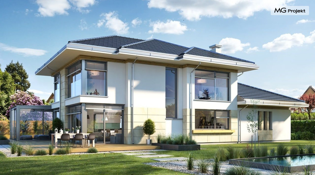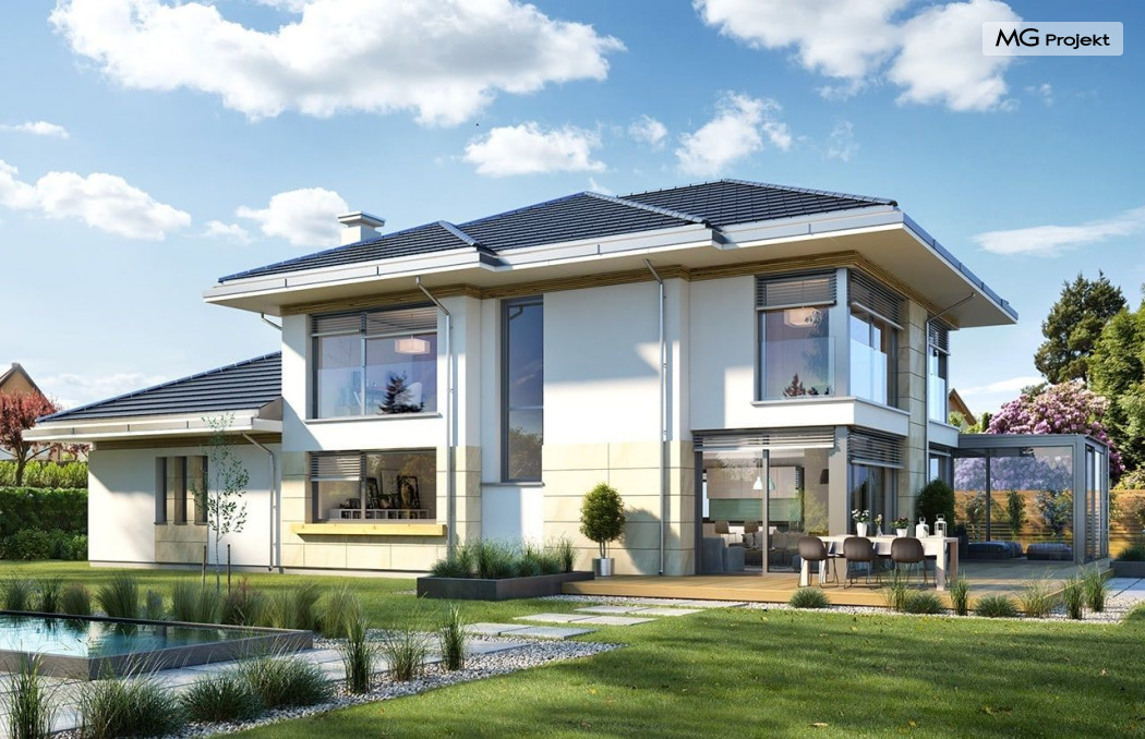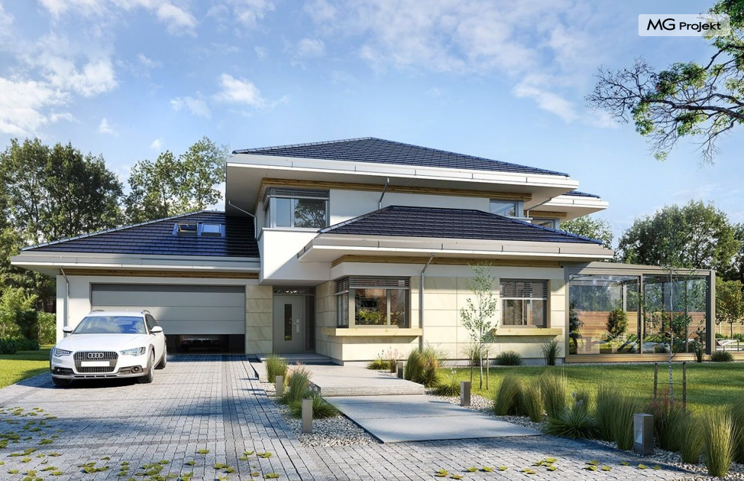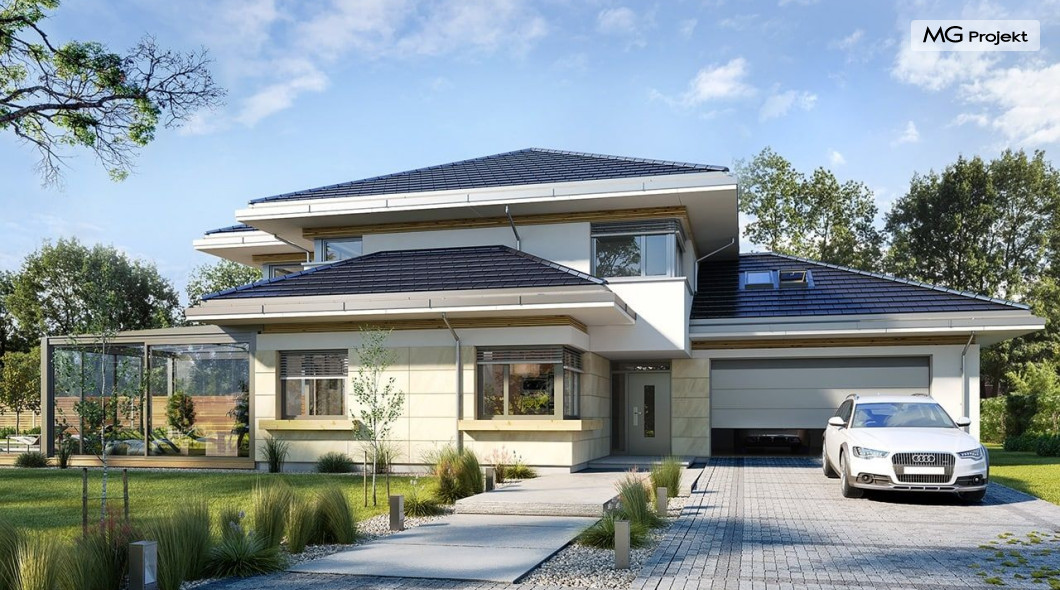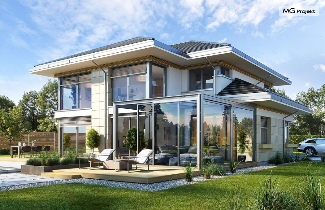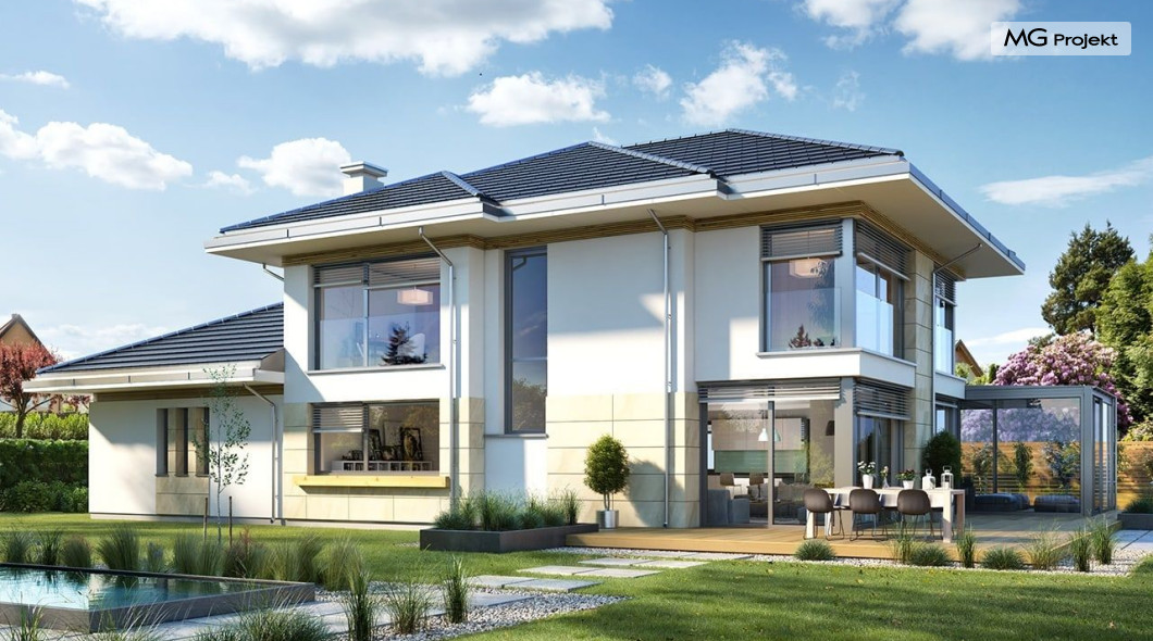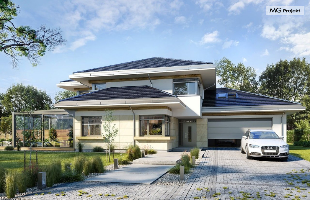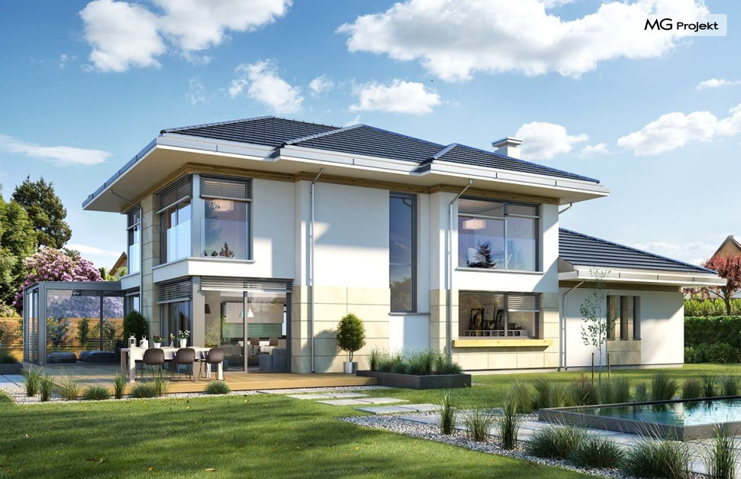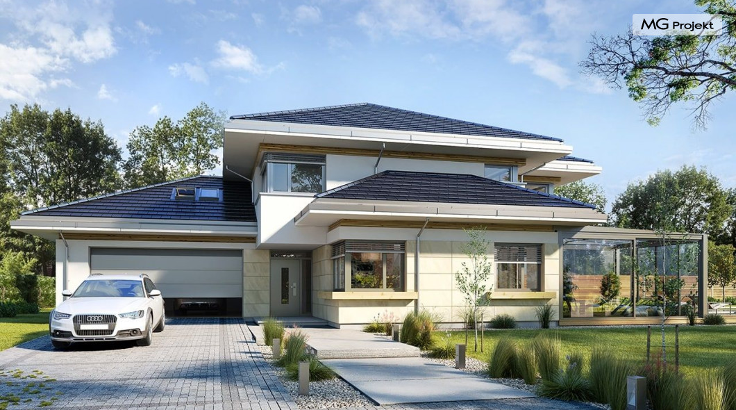 Projekt domu Dom z widokiem 6 B jest kolejną propozycją domu piętrowego z się serii „Domów z widokiem” z naszej pracowni. Prezentowany projekt to duży piętrowy dom dla 4-5 osobowej rodziny, z rozbudowanym programem użytkowym, oraz dodatkową - wymarzoną przez wielu Inwestorów oranżerią w części dziennej. Budynek został zaprojektowany na planie litery „T”, z główną piętrową bryłą, oraz dwiema dobudowanymi częściami parterowymi. Architektura projektu domu Dom z widokiem 6 B jest nowoczesna. Zastosowane materiały i detale tworzą wysmakowaną podmiejską willę.Podział elewacji na poziome pasy, oraz duże narożne przeszklenia, nadają sylwetce domu atrakcyjnego wyglądu. Wnętrze to otwarta jednoprzestrzenna część dzienna na parterze, cześć gospodarczo - garażowa, oraz sypialnie na piętrze. Zrezygnowano z pustki nad pokojem dziennym - która nie każdemu Inwestorowi odpowiada. Do domu wchodzimy przez dużą sień wprost do holu i salonu. Salon, jadalnia i kuchnia tworzą ogromną otwartą wspólną przestrzeń. Kuchnia, jak na skalę budynku jest bardzo duża - zmieści się w niej dowolnej wielkości wyspa. Przy kuchni mamy spiżarnię i przejście do ogrodu zimowego, gdzie domownicy w ogrzewanym green-hausie mogą zjeść posiłek, albo odpocząć. To prawdziwa dodatkowa atrakcja domu. Obok mamy salon z dużym stołem jadalnym i meblami wypoczynkowymi. W wersji bazowej projektu zrezygnowano z kominka - można go bez kłopotu dodać. Z holu i salonu widoczne są reprezentacyjne, ozdobne schody na piętro. Na parterze przewidziano jeszcze dodatkowy pokój - gabinet lub sypialnię gościnną. Na piętrze mamy dwie sypialnie dziecięce, łazienkę, pralnię, oraz apartament rodziców, z sypialnią, garderobą i łazienką, oraz dodatkowym dostępem do strychu nad garażem, który można zaadaptować jako kolejną garderobę, albo pokój rekreacyjny. Projekt domu Dom z widokiem 6 B to funkcjonalna, nowoczesna, racjonalnie zaprojektowana willa. W projekcie zastosowano energooszczędne rozwiązania. Budynek będzie niedrogi w późniejszej eksploatacji. To doskonała propozycja dla osób marzących o pięknym piętrowym praktycznym domu dla swojej rodziny. Zapraszamy do zapoznania się z pełną ofertą pracowni MG Projekt tej serii: Dom z widokiem, Dom z widokiem 2, Dom z widokiem 2C, Dom z widokiem 3, Dom z widokiem 3F, Dom z widokiem 4, Dom z widokiem 5, Dom z widokiem 6, Dom z widokiem B, Dom z widokiem E.