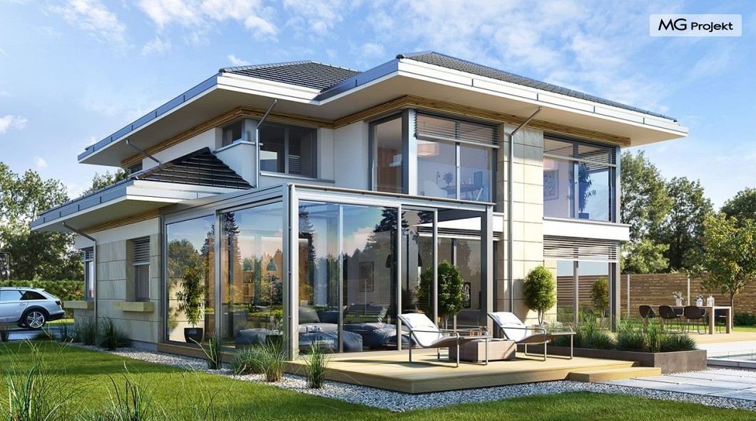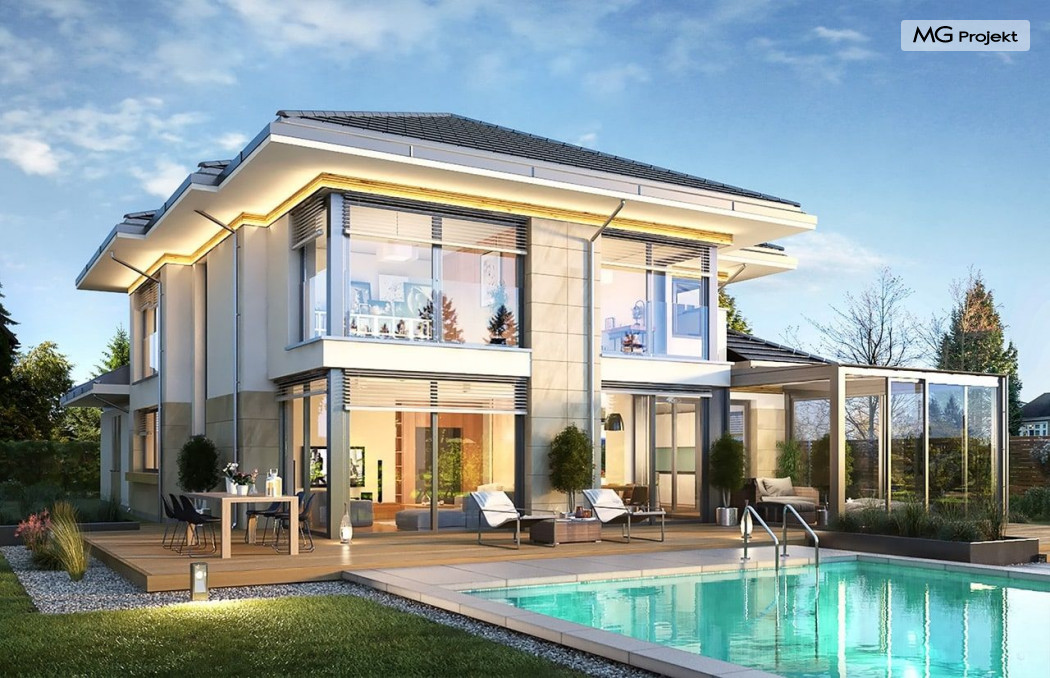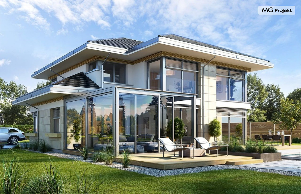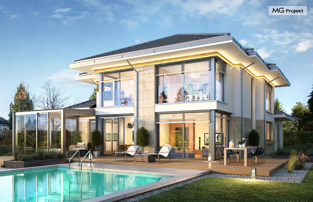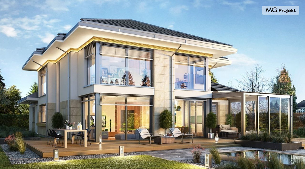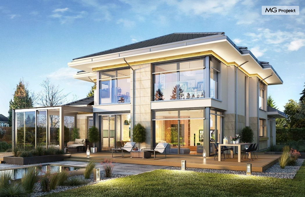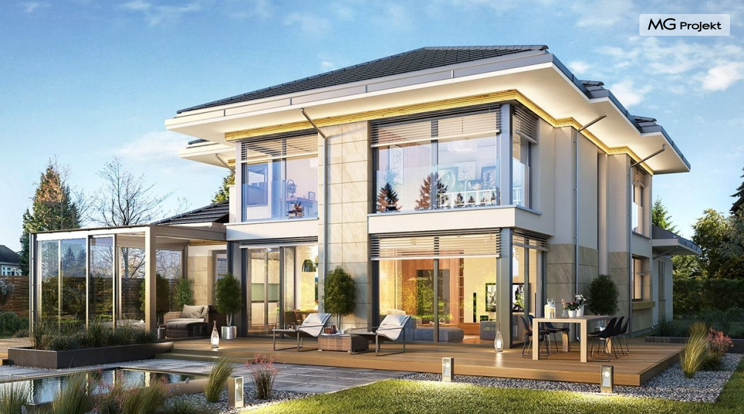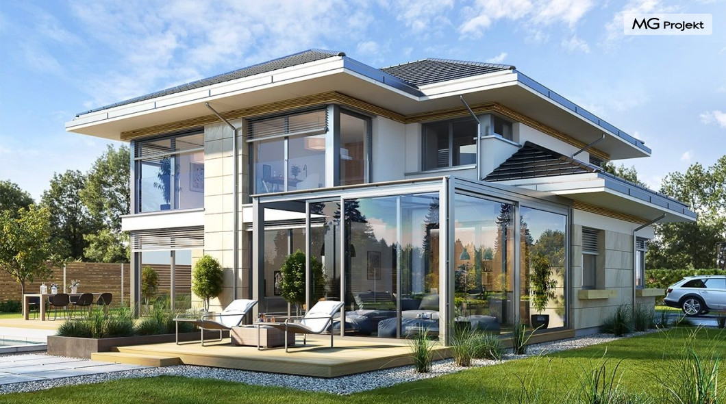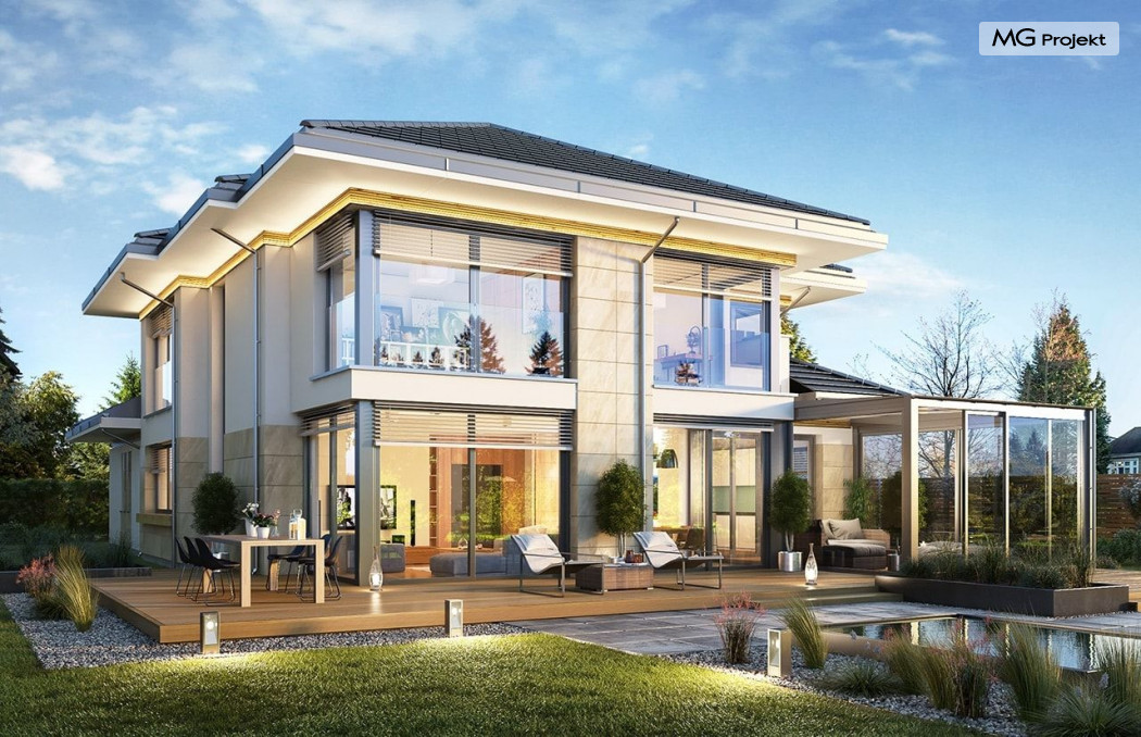 Projekt domu Dom z widokiem 6 B jest kolejną propozycją domu piętrowego z się serii „Domów z widokiem” z naszej pracowni. Prezentowany projekt to duży piętrowy dom dla 4-5 osobowej rodziny, z rozbudowanym programem użytkowym, oraz dodatkową - wymarzoną przez wielu Inwestorów oranżerią w części dziennej. Budynek został zaprojektowany na planie litery „T”, z główną piętrową bryłą, oraz dwiema dobudowanymi częściami parterowymi. Architektura projektu domu Dom z widokiem 6 B jest nowoczesna. Zastosowane materiały i detale tworzą wysmakowaną podmiejską willę.Podział elewacji na poziome pasy, oraz duże narożne przeszklenia, nadają sylwetce domu atrakcyjnego wyglądu. Wnętrze to otwarta jednoprzestrzenna część dzienna na parterze, cześć gospodarczo - garażowa, oraz sypialnie na piętrze. Zrezygnowano z pustki nad pokojem dziennym - która nie każdemu Inwestorowi odpowiada. Do domu wchodzimy przez dużą sień wprost do holu i salonu. Salon, jadalnia i kuchnia tworzą ogromną otwartą wspólną przestrzeń. Kuchnia, jak na skalę budynku jest bardzo duża - zmieści się w niej dowolnej wielkości wyspa. Przy kuchni mamy spiżarnię i przejście do ogrodu zimowego, gdzie domownicy w ogrzewanym green-hausie mogą zjeść posiłek, albo odpocząć. To prawdziwa dodatkowa atrakcja domu. Obok mamy salon z dużym stołem jadalnym i meblami wypoczynkowymi. W wersji bazowej projektu zrezygnowano z kominka - można go bez kłopotu dodać. Z holu i salonu widoczne są reprezentacyjne, ozdobne schody na piętro. Na parterze przewidziano jeszcze dodatkowy pokój - gabinet lub sypialnię gościnną. Na piętrze mamy dwie sypialnie dziecięce, łazienkę, pralnię, oraz apartament rodziców, z sypialnią, garderobą i łazienką, oraz dodatkowym dostępem do strychu nad garażem, który można zaadaptować jako kolejną garderobę, albo pokój rekreacyjny. Projekt domu Dom z widokiem 6 B to funkcjonalna, nowoczesna, racjonalnie zaprojektowana willa. W projekcie zastosowano energooszczędne rozwiązania. Budynek będzie niedrogi w późniejszej eksploatacji. To doskonała propozycja dla osób marzących o pięknym piętrowym praktycznym domu dla swojej rodziny. Zapraszamy do zapoznania się z pełną ofertą pracowni MG Projekt tej serii: Dom z widokiem, Dom z widokiem 2, Dom z widokiem 2C, Dom z widokiem 3, Dom z widokiem 3F, Dom z widokiem 4, Dom z widokiem 5, Dom z widokiem 6, Dom z widokiem B, Dom z widokiem E.