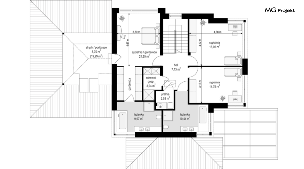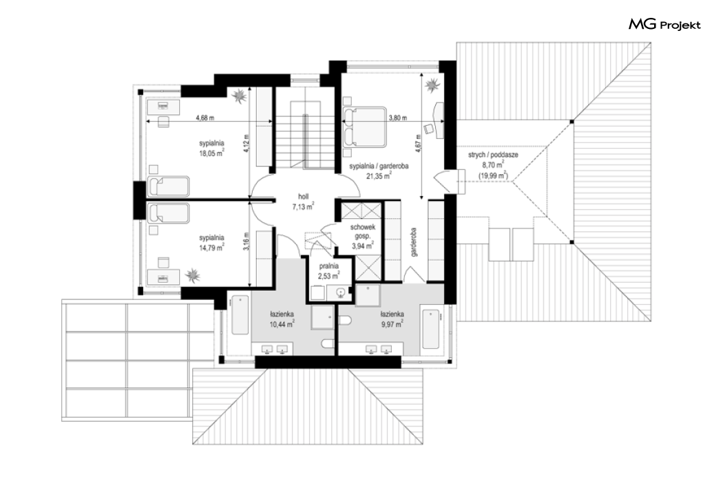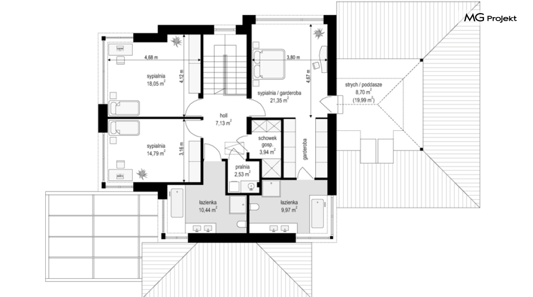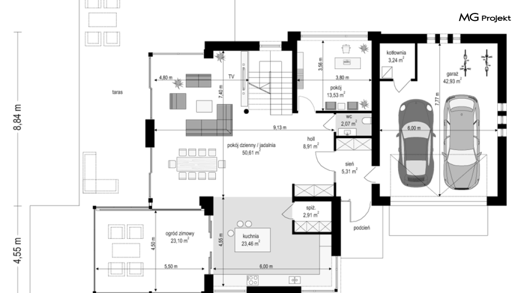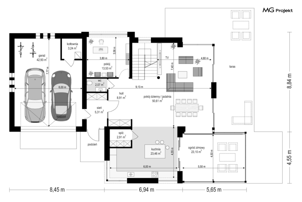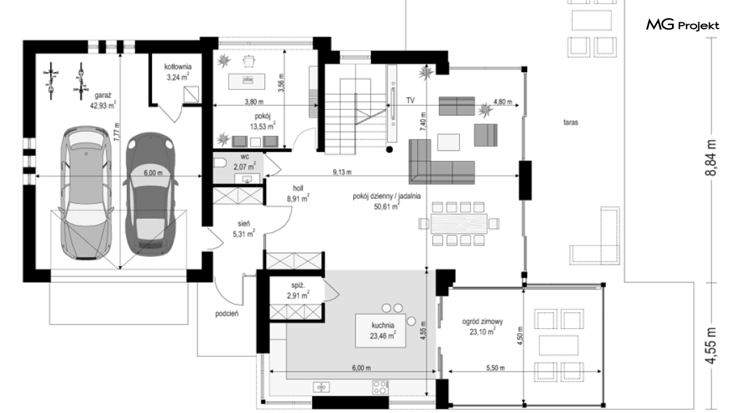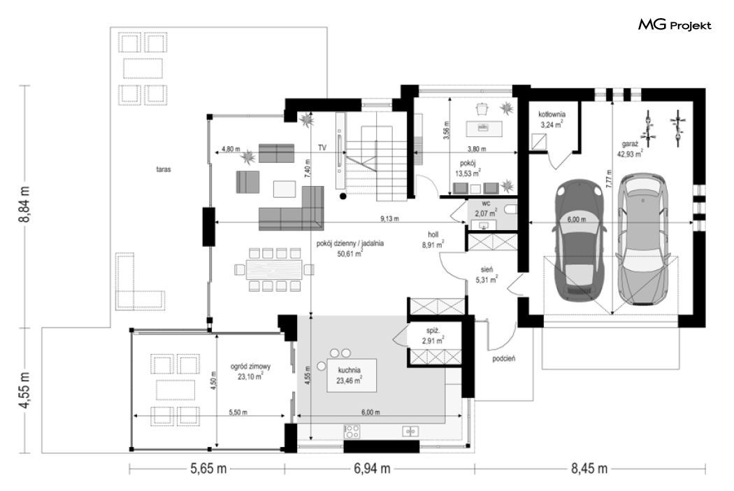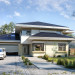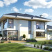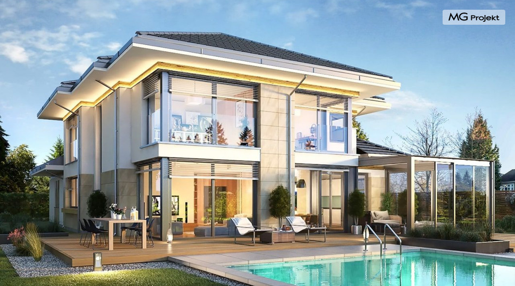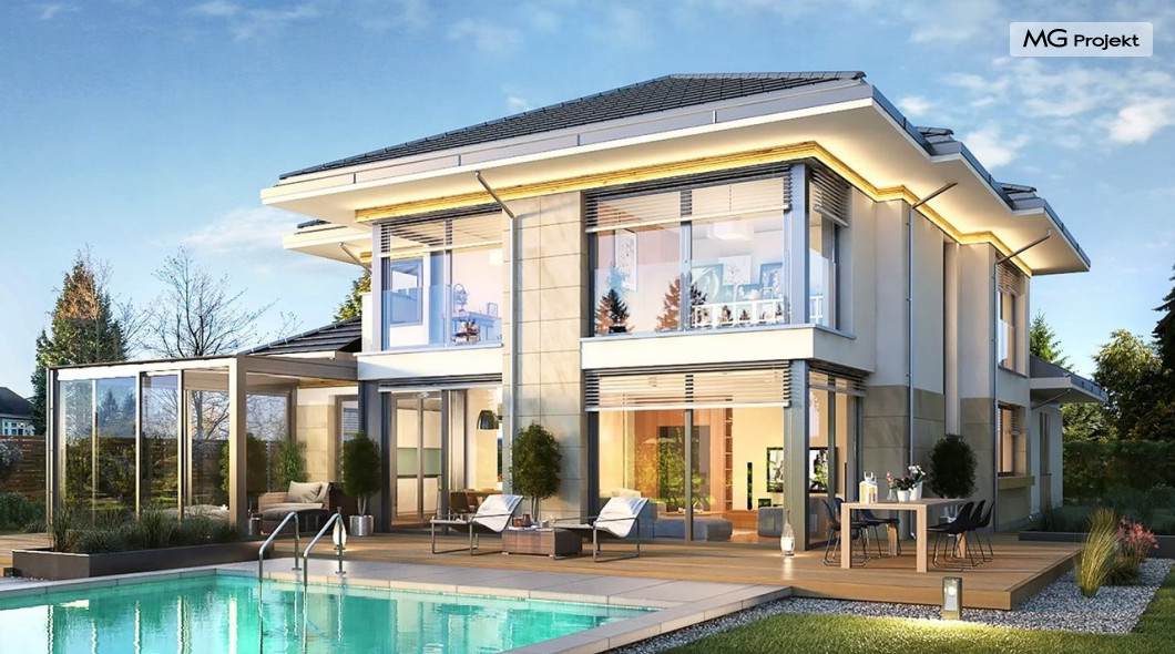 Projekt domu Dom z widokiem 6 B jest kolejną propozycją domu piętrowego z się serii „Domów z widokiem” z naszej pracowni. Prezentowany projekt to duży piętrowy dom dla 4-5 osobowej rodziny, z rozbudowanym programem użytkowym, oraz dodatkową - wymarzoną przez wielu Inwestorów oranżerią w części dziennej. Budynek został zaprojektowany na planie litery „T”, z główną piętrową bryłą, oraz dwiema dobudowanymi częściami parterowymi. Architektura projektu domu Dom z widokiem 6 B jest nowoczesna. Zastosowane materiały i detale tworzą wysmakowaną podmiejską willę.Podział elewacji na poziome pasy, oraz duże narożne przeszklenia, nadają sylwetce domu atrakcyjnego wyglądu. Wnętrze to otwarta jednoprzestrzenna część dzienna na parterze, cześć gospodarczo - garażowa, oraz sypialnie na piętrze. Zrezygnowano z pustki nad pokojem dziennym - która nie każdemu Inwestorowi odpowiada. Do domu wchodzimy przez dużą sień wprost do holu i salonu. Salon, jadalnia i kuchnia tworzą ogromną otwartą wspólną przestrzeń. Kuchnia, jak na skalę budynku jest bardzo duża - zmieści się w niej dowolnej wielkości wyspa. Przy kuchni mamy spiżarnię i przejście do ogrodu zimowego, gdzie domownicy w ogrzewanym green-hausie mogą zjeść posiłek, albo odpocząć. To prawdziwa dodatkowa atrakcja domu. Obok mamy salon z dużym stołem jadalnym i meblami wypoczynkowymi. W wersji bazowej projektu zrezygnowano z kominka - można go bez kłopotu dodać. Z holu i salonu widoczne są reprezentacyjne, ozdobne schody na piętro. Na parterze przewidziano jeszcze dodatkowy pokój - gabinet lub sypialnię gościnną. Na piętrze mamy dwie sypialnie dziecięce, łazienkę, pralnię, oraz apartament rodziców, z sypialnią, garderobą i łazienką, oraz dodatkowym dostępem do strychu nad garażem, który można zaadaptować jako kolejną garderobę, albo pokój rekreacyjny. Projekt domu Dom z widokiem 6 B to funkcjonalna, nowoczesna, racjonalnie zaprojektowana willa. W projekcie zastosowano energooszczędne rozwiązania. Budynek będzie niedrogi w późniejszej eksploatacji. To doskonała propozycja dla osób marzących o pięknym piętrowym praktycznym domu dla swojej rodziny. Zapraszamy do zapoznania się z pełną ofertą pracowni MG Projekt tej serii: Dom z widokiem, Dom z widokiem 2, Dom z widokiem 2C, Dom z widokiem 3, Dom z widokiem 3F, Dom z widokiem 4, Dom z widokiem 5, Dom z widokiem 6, Dom z widokiem B, Dom z widokiem E.