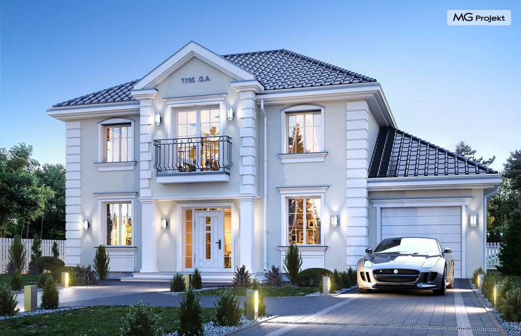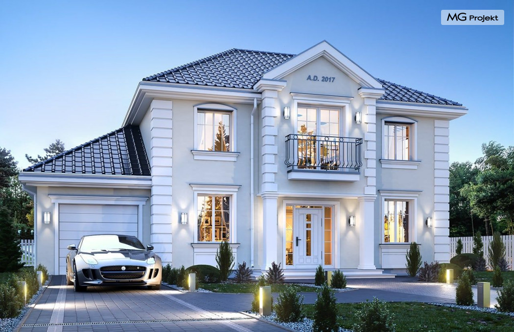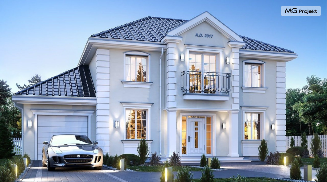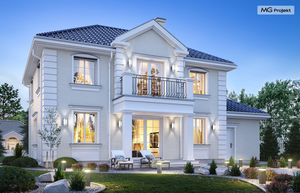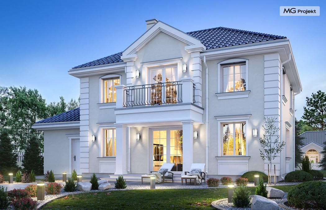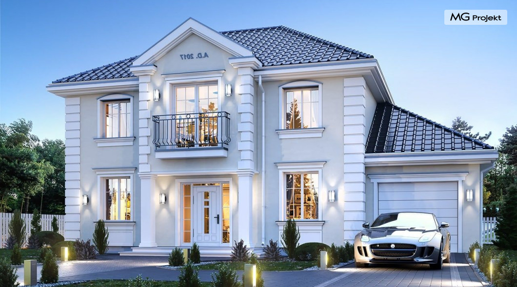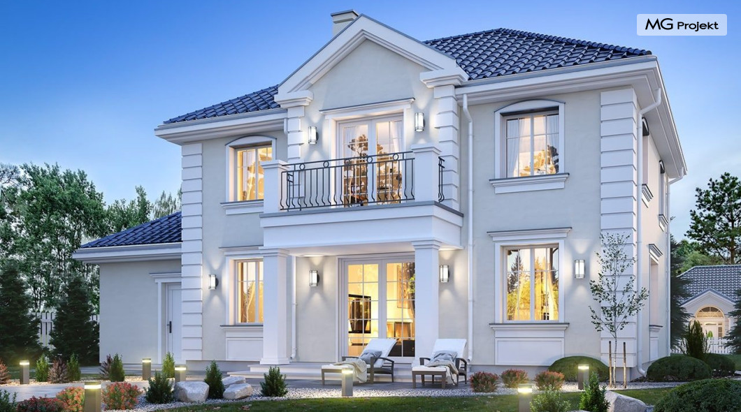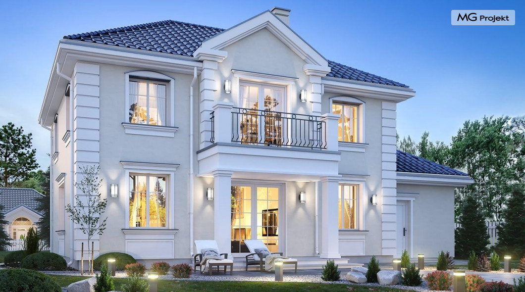 Projekt domu Magnat 3 jest kolejną wersją popularnego projektu z serii „Magnat” - tym razem mniejszy dom, o pomniejszonym rzucie, wymiarach zewnętrznych i powierzchni. Projekt domu Magnat 3 to stylowa willa przeznaczona dla 4-5 osobowej rodziny. Dom ma pełne dwie kondygnacje - parter i piętro. Budynek zaprojektowano nawiązując do przedwojennej architektury rezydencjonalnej Europy. Bryłę domu zaplanowano na planie prostokąta, z osią symetrii między reprezentacyjnym portykiem wejściowym i eleganckim wyjściem do ogrodu z salonu, przez zadaszony taras ze schodkami. Elewację frontową i ogrodową zdobią piękne okna z podziałami i sztukaterią. Całość bryły przykrywa czterospadowy łagodny dach. Z boku dodana jest bryła garażu. Projekt domu Magnat 3 to taka mała rezydencja - budynek o normalnej, niewyolbrzymionej skali, ubrany w elegancką stylową formę. Parter domu : z obszernego przedsionka przechodzimy do jednoprzestrzennego wnętrza salonu i jadalni, połączonego z holem, z pięknymi lekko zabiegowymi schodami. Salon łączy się z częściowo otwartą kuchnią ze spiżarnią. Od frontu mieści się też dodatkowy pokój - gabinet. Pozostałe pomieszczenia to łazienka, kotłownia, oraz część gospodarcza z garażem. Na piętrze zaprojektowano cztery sypialnie z dwiema łazienkami, w tym apartament rodziców z osobną łazienką, garderobą i balkonem otwartym na ogród. Projekt domu Magnat 3 to przykład ponadczasowej architektury, która przetrwa wszystkie tymczasowe mody. Jednocześnie dom nie jest duży, jest za to dość prosty w budowie, ma praktyczne i funkcjonalne wnętrze. Stanowi idealną propozycję dla osób marzących o stylowej willi, ale chcących trzymać koszty budowy w rozsądnych granicach. Zapraszamy do zapoznania się z pełną ofertą pracowni MG Projekt tej serii: Magnat, Magnat 2, Magnat 4. Zapraszamy!