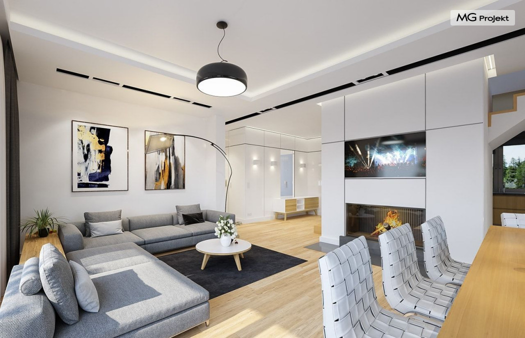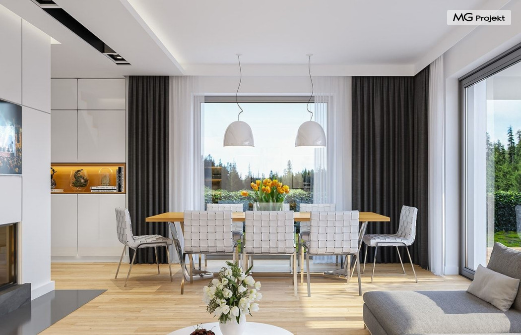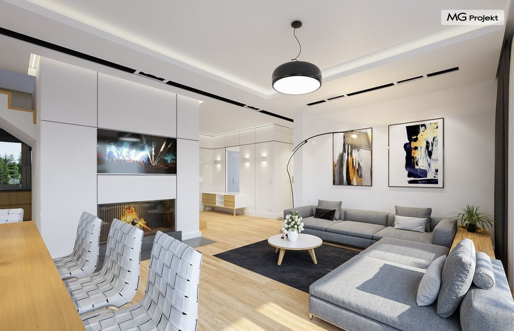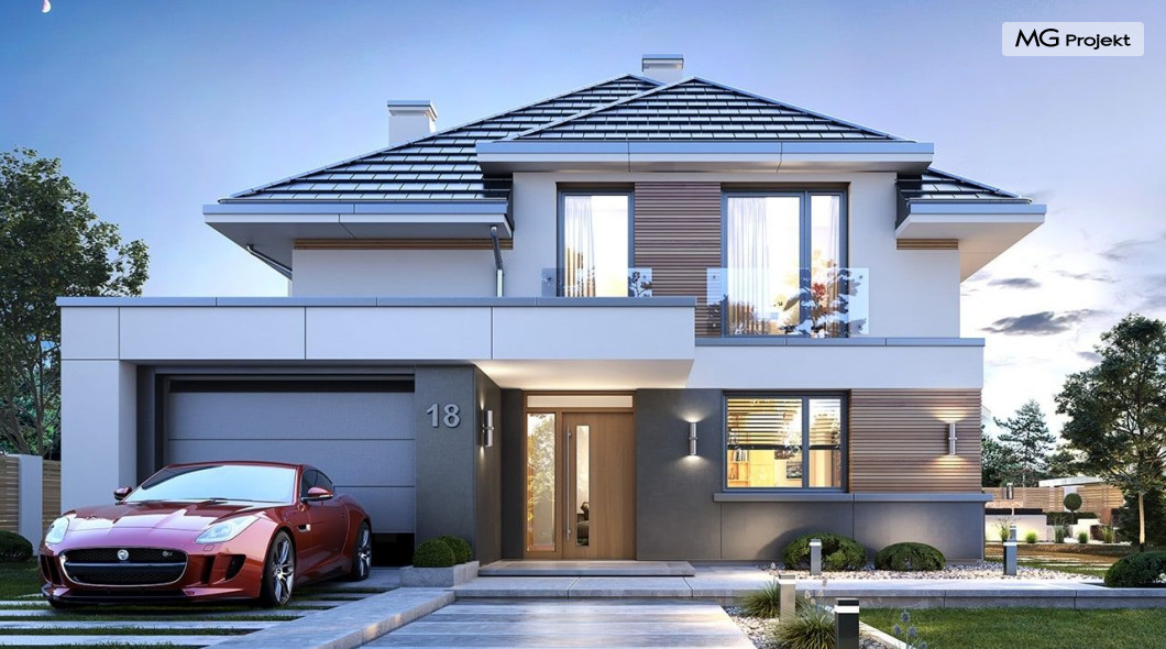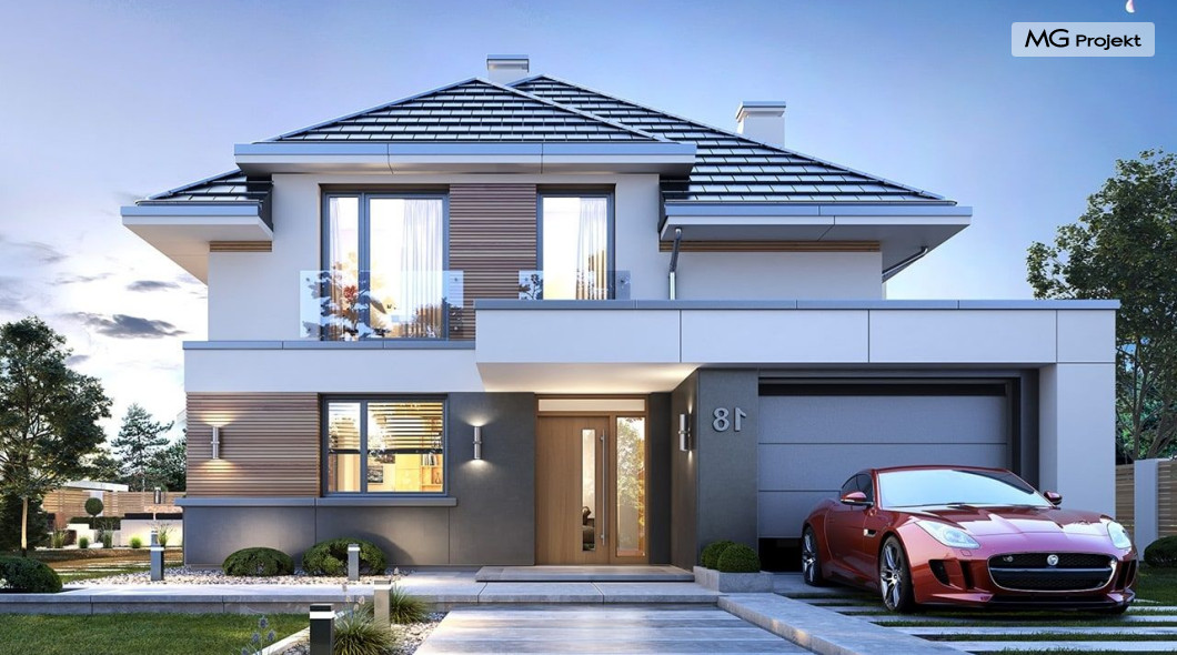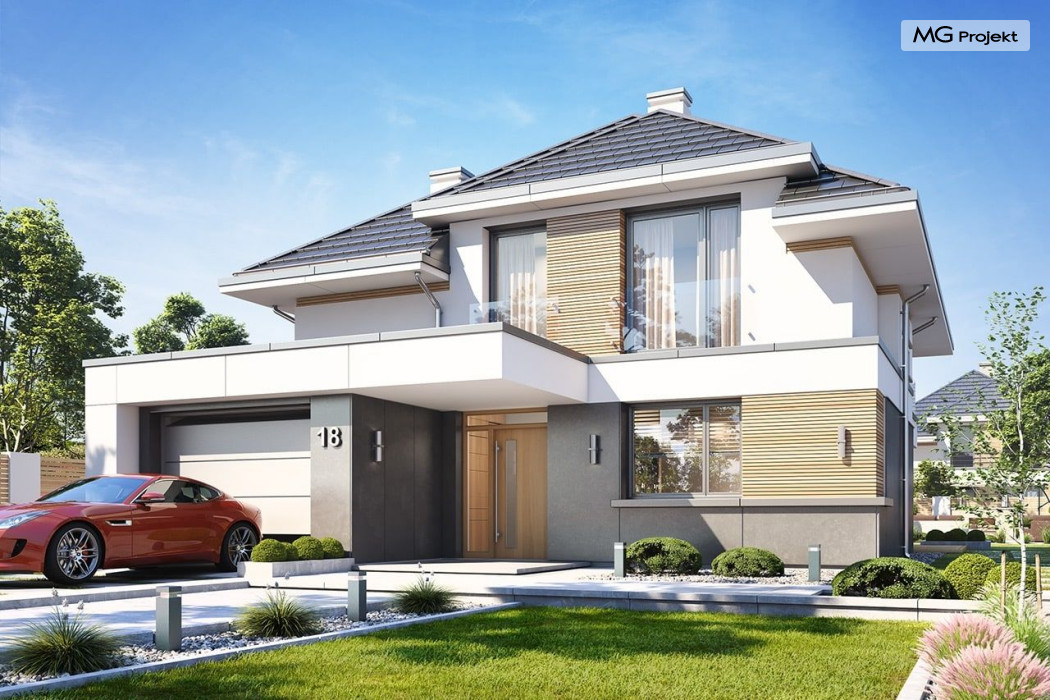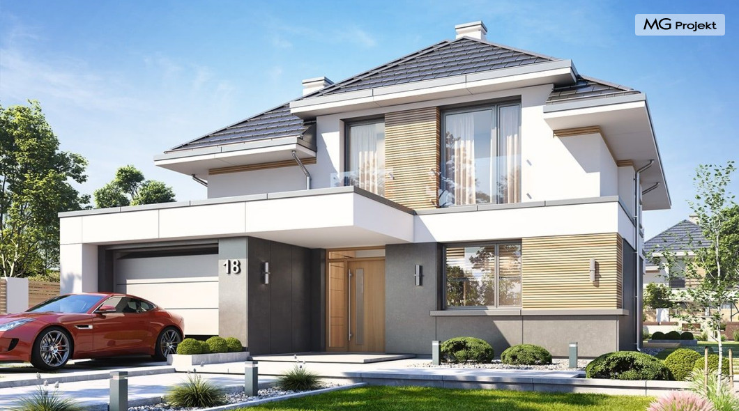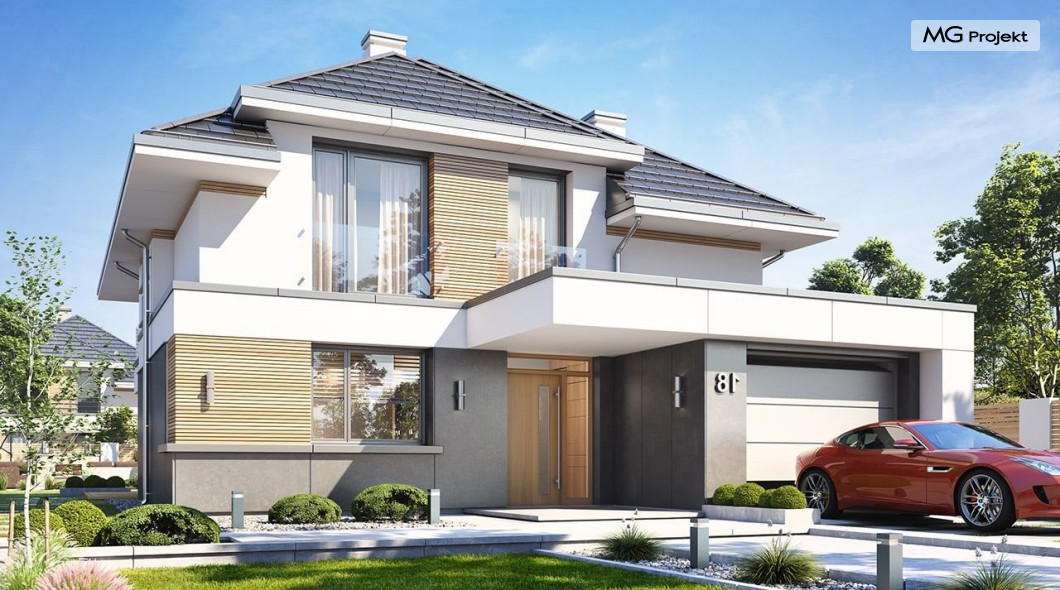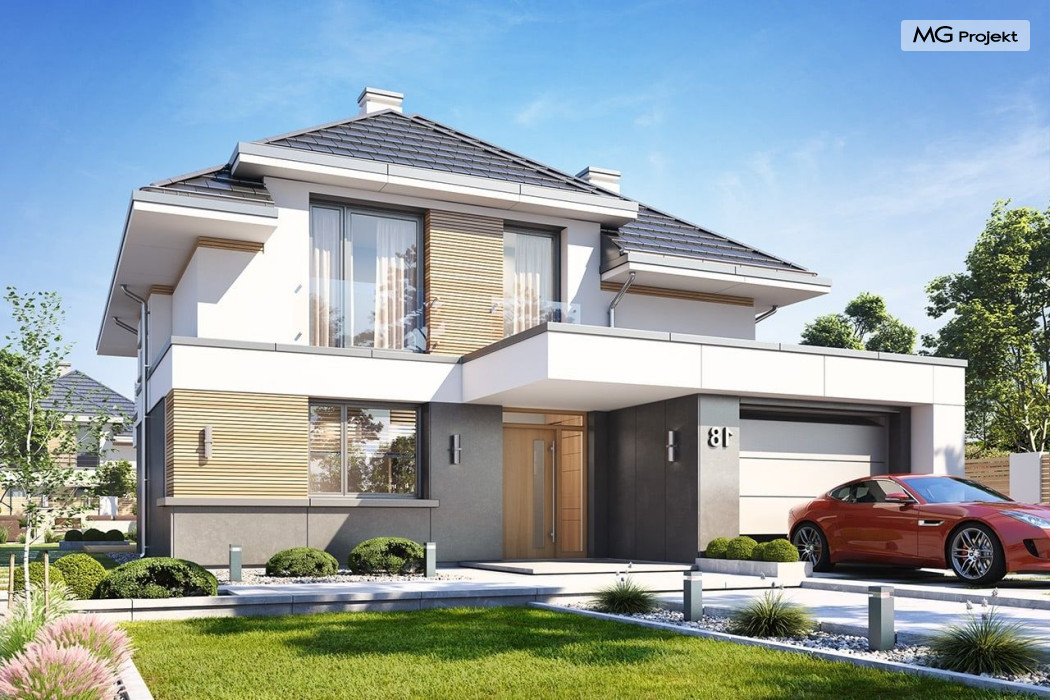 Projekt domu Oszust 2 jest wariantową wersją projektu Oszust - z mniejszą powierzchnią zabudowy, z pojedynczym garażem, oraz z węższą szerokością elewacji frontowej. Projekt jest propozycją dla Inwestorów chcących wybudować piętrowy dom, ale posiadających działkę, na której zapisy urbanistyczne wykluczają taką możliwość. Zatem projekt domu Oszust 2, choć wygląda prawie jak budynek piętrowy i ma górną kondygnację z pomieszczeniami praktycznie bez skosów, jest formalnie projektem domu z poddaszem użytkowym. Architektura domu Oszust 2 jest nowoczesna - łączą się tu w atrakcyjną całość duże przeszklenia, poziome pasy wykończeń elewacji w kontrastujących barwach, dobudowane parterowe bryły wystającego garażu i zadaszenia tarasu. Zwartą bryłę przykrywa czterospadowy dach. Dzięki różnicy w wysokości dachu, na piętrze mieszczą się normalne duże okna doświetlające pokoje górnej kondygnacji. Wnętrze domu : do domu wchodzimy przez wygodny przedsionek do holu i do jednoprzestrzennej części dziennej z wyeksponowaną na środku salonu ścianą kominkowo – telewizyjną, ze schodami na piętro w tle. Od frontu mamy wygodną kuchnię ze spiżarnią, a od ogrodu dodatkowy pokój – gabinet i wc. Z sieni przechodzimy też do garażu i kotłowni. Duże przeszklenia salonu otwierają wnętrze domu na zadaszony taras i otaczający ogród. Na górze mamy oddzielny apartament rodziców z własną łazienką i garderobą, oraz dwie sypialnie dziecięce z ogólną łazienką. Na poddaszu niemal na całej powierzchni uzyskano wysokość stania - nie ma tu skosów utrudniających poruszanie się. Projekt domu Oszust 2 mimo w sumie niedużej powierzchni użytkowej mieści w sobie cały potrzebny program funkcjonalny do w pełni komfortowego życia kilkuosobowej rodziny. Dom zaprojektowano z nowoczesnych i energooszczędnych materiałów. Będzie tani w eksploatacji, a jednocześnie niedrogi i nietrudny w budowie. Zapraszamy do zapoznania się z pełną ofertą pracowni MG Projekt: https://www.mgprojekt.com.pl/oszust, https://www.mgprojekt.com.pl/oszust-wariant-b, https://www.mgprojekt.com.pl/oszust-2.