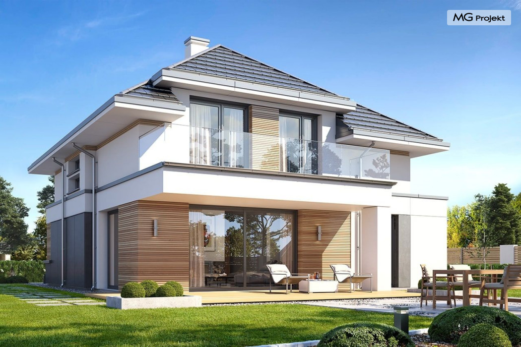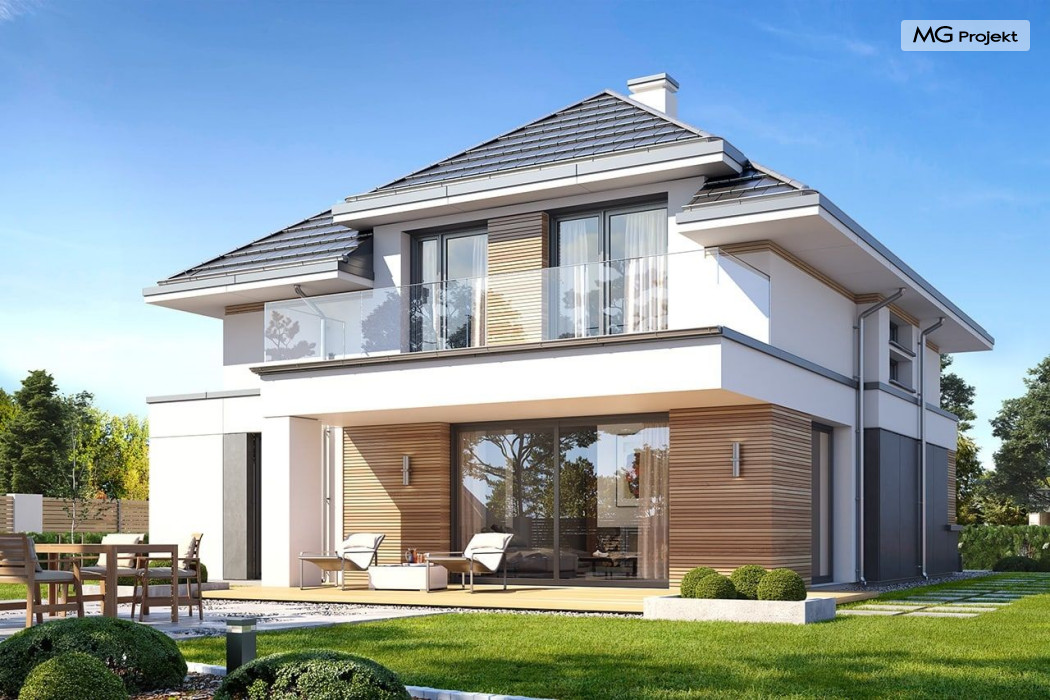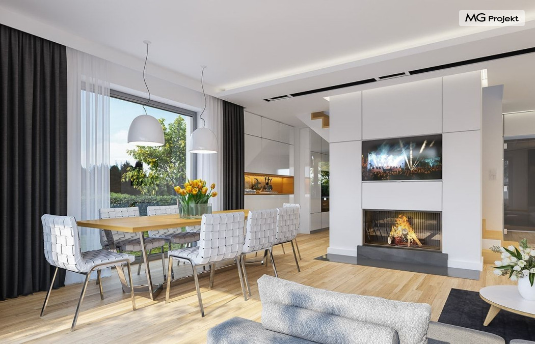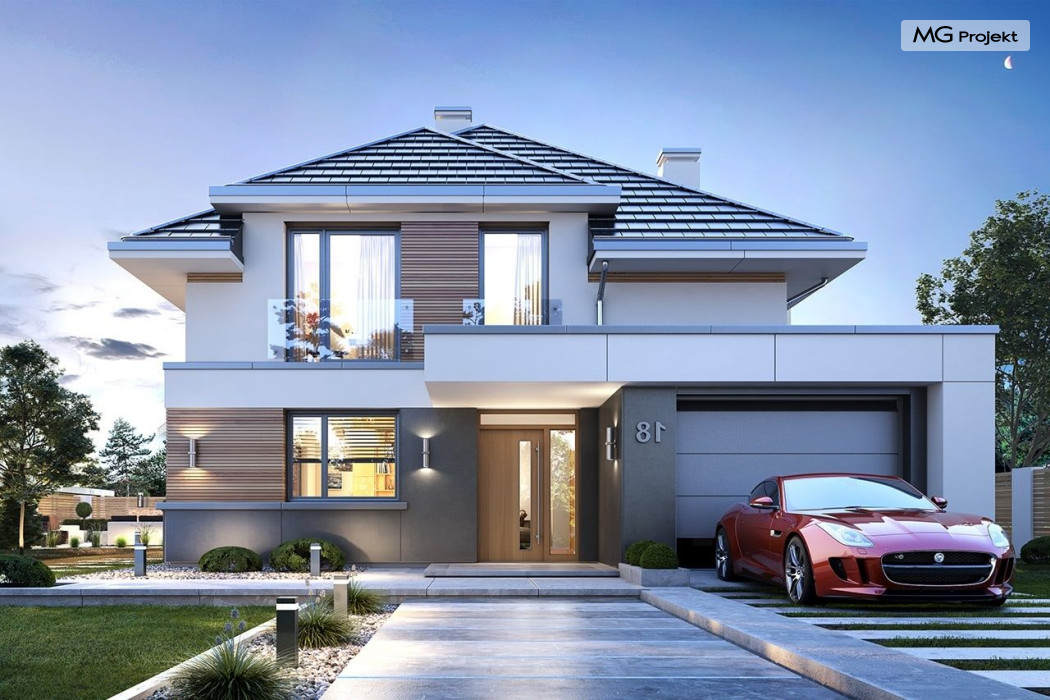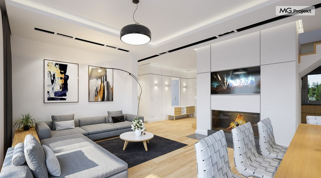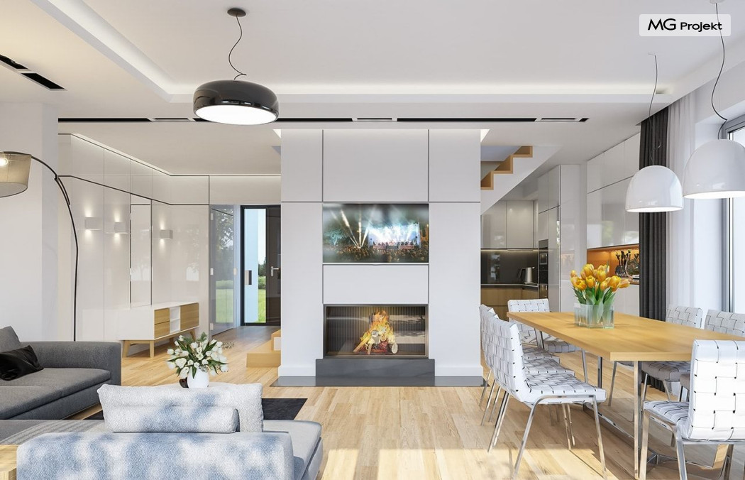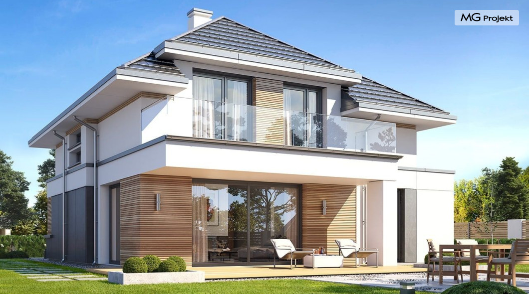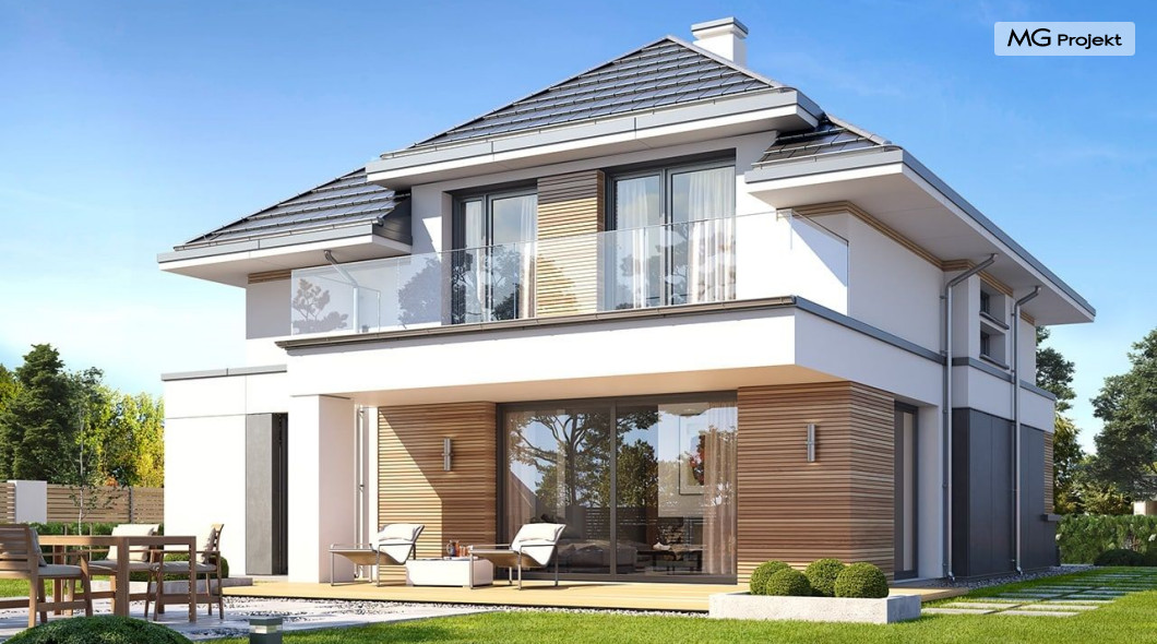 Projekt domu Oszust 2 jest wariantową wersją projektu Oszust - z mniejszą powierzchnią zabudowy, z pojedynczym garażem, oraz z węższą szerokością elewacji frontowej. Projekt jest propozycją dla Inwestorów chcących wybudować piętrowy dom, ale posiadających działkę, na której zapisy urbanistyczne wykluczają taką możliwość. Zatem projekt domu Oszust 2, choć wygląda prawie jak budynek piętrowy i ma górną kondygnację z pomieszczeniami praktycznie bez skosów, jest formalnie projektem domu z poddaszem użytkowym. Architektura domu Oszust 2 jest nowoczesna - łączą się tu w atrakcyjną całość duże przeszklenia, poziome pasy wykończeń elewacji w kontrastujących barwach, dobudowane parterowe bryły wystającego garażu i zadaszenia tarasu. Zwartą bryłę przykrywa czterospadowy dach. Dzięki różnicy w wysokości dachu, na piętrze mieszczą się normalne duże okna doświetlające pokoje górnej kondygnacji. Wnętrze domu : do domu wchodzimy przez wygodny przedsionek do holu i do jednoprzestrzennej części dziennej z wyeksponowaną na środku salonu ścianą kominkowo – telewizyjną, ze schodami na piętro w tle. Od frontu mamy wygodną kuchnię ze spiżarnią, a od ogrodu dodatkowy pokój – gabinet i wc. Z sieni przechodzimy też do garażu i kotłowni. Duże przeszklenia salonu otwierają wnętrze domu na zadaszony taras i otaczający ogród. Na górze mamy oddzielny apartament rodziców z własną łazienką i garderobą, oraz dwie sypialnie dziecięce z ogólną łazienką. Na poddaszu niemal na całej powierzchni uzyskano wysokość stania - nie ma tu skosów utrudniających poruszanie się. Projekt domu Oszust 2 mimo w sumie niedużej powierzchni użytkowej mieści w sobie cały potrzebny program funkcjonalny do w pełni komfortowego życia kilkuosobowej rodziny. Dom zaprojektowano z nowoczesnych i energooszczędnych materiałów. Będzie tani w eksploatacji, a jednocześnie niedrogi i nietrudny w budowie. Zapraszamy do zapoznania się z pełną ofertą pracowni MG Projekt: https://www.mgprojekt.com.pl/oszust, https://www.mgprojekt.com.pl/oszust-wariant-b, https://www.mgprojekt.com.pl/oszust-2.