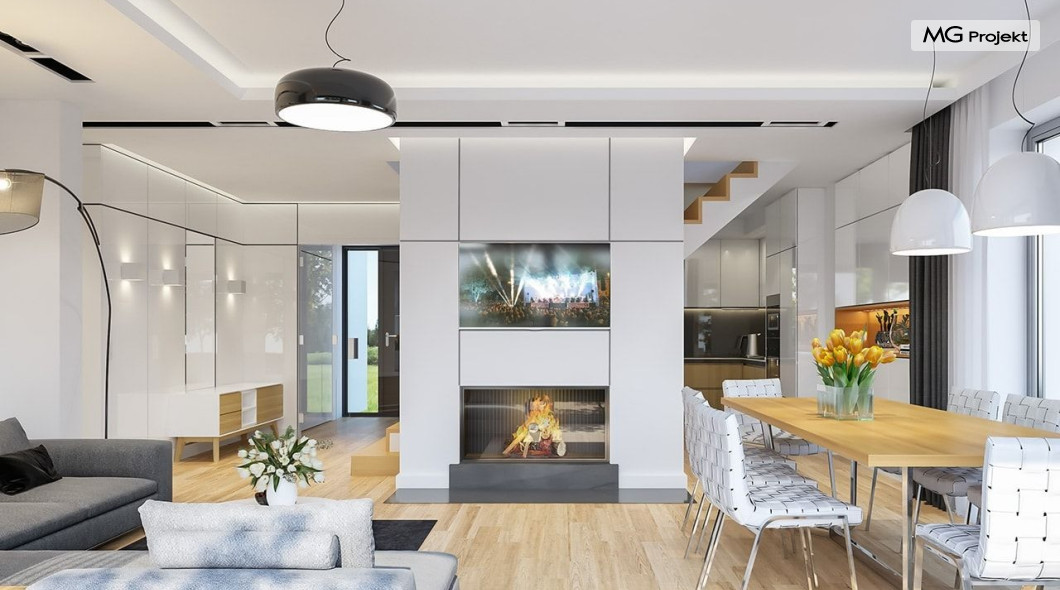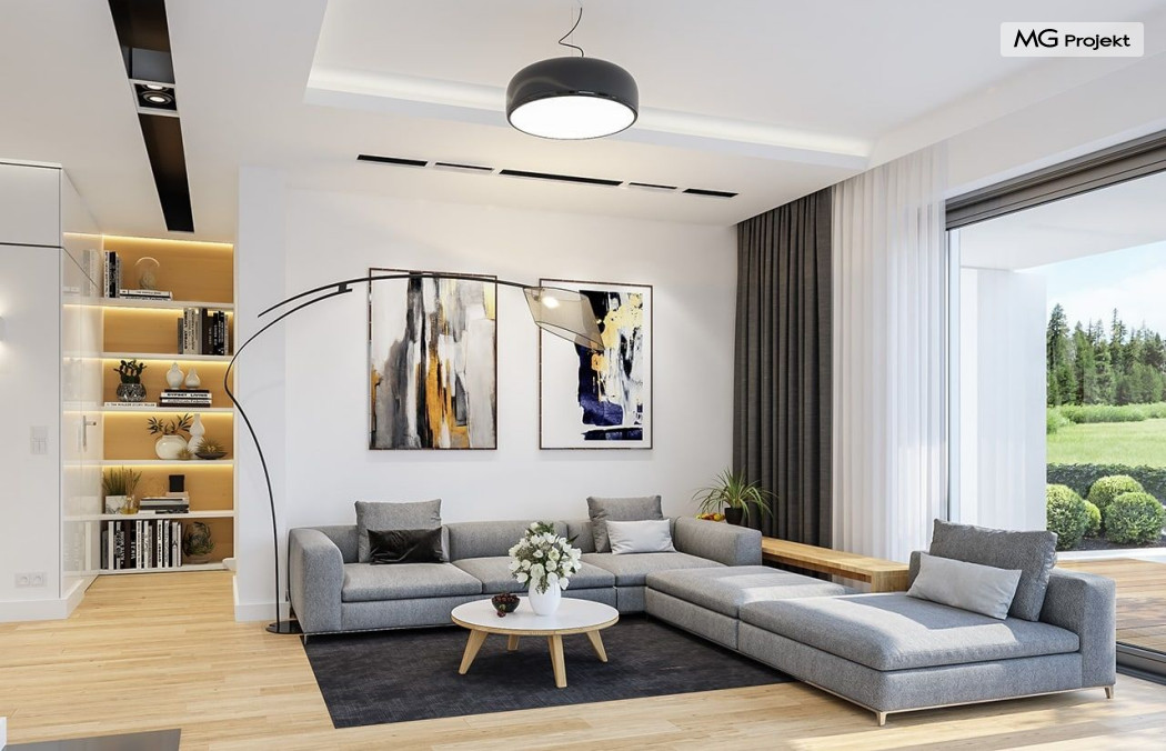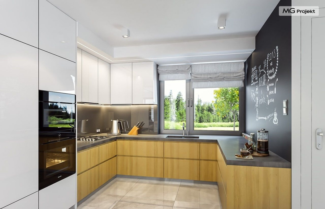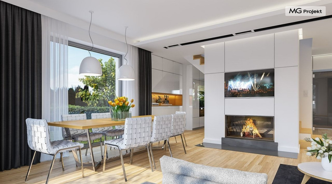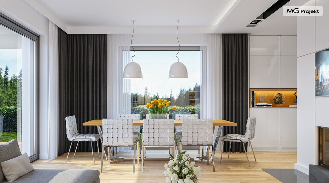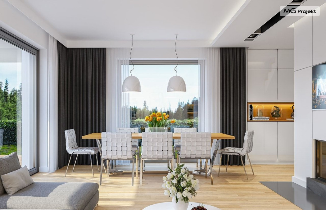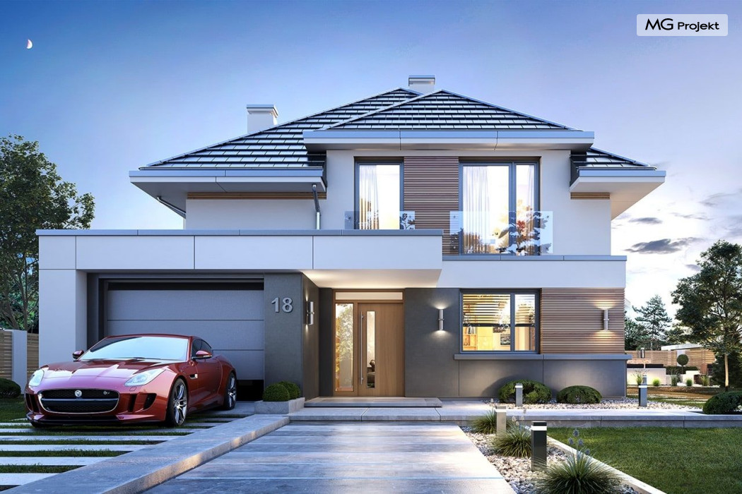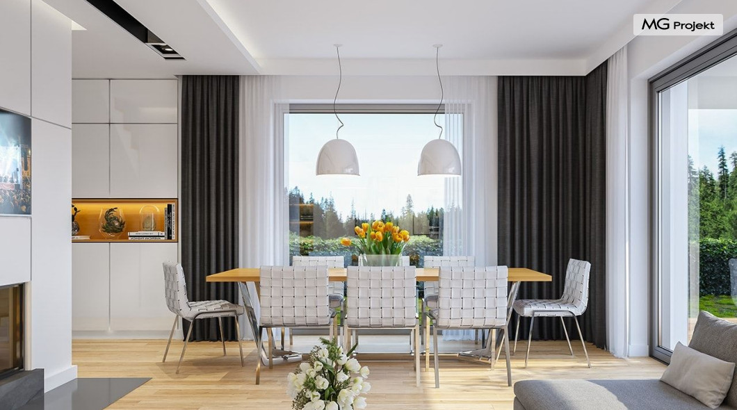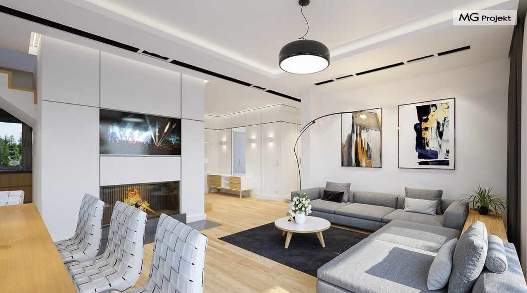 Projekt domu Oszust 2 jest wariantową wersją projektu Oszust - z mniejszą powierzchnią zabudowy, z pojedynczym garażem, oraz z węższą szerokością elewacji frontowej. Projekt jest propozycją dla Inwestorów chcących wybudować piętrowy dom, ale posiadających działkę, na której zapisy urbanistyczne wykluczają taką możliwość. Zatem projekt domu Oszust 2, choć wygląda prawie jak budynek piętrowy i ma górną kondygnację z pomieszczeniami praktycznie bez skosów, jest formalnie projektem domu z poddaszem użytkowym. Architektura domu Oszust 2 jest nowoczesna - łączą się tu w atrakcyjną całość duże przeszklenia, poziome pasy wykończeń elewacji w kontrastujących barwach, dobudowane parterowe bryły wystającego garażu i zadaszenia tarasu. Zwartą bryłę przykrywa czterospadowy dach. Dzięki różnicy w wysokości dachu, na piętrze mieszczą się normalne duże okna doświetlające pokoje górnej kondygnacji. Wnętrze domu : do domu wchodzimy przez wygodny przedsionek do holu i do jednoprzestrzennej części dziennej z wyeksponowaną na środku salonu ścianą kominkowo – telewizyjną, ze schodami na piętro w tle. Od frontu mamy wygodną kuchnię ze spiżarnią, a od ogrodu dodatkowy pokój – gabinet i wc. Z sieni przechodzimy też do garażu i kotłowni. Duże przeszklenia salonu otwierają wnętrze domu na zadaszony taras i otaczający ogród. Na górze mamy oddzielny apartament rodziców z własną łazienką i garderobą, oraz dwie sypialnie dziecięce z ogólną łazienką. Na poddaszu niemal na całej powierzchni uzyskano wysokość stania - nie ma tu skosów utrudniających poruszanie się. Projekt domu Oszust 2 mimo w sumie niedużej powierzchni użytkowej mieści w sobie cały potrzebny program funkcjonalny do w pełni komfortowego życia kilkuosobowej rodziny. Dom zaprojektowano z nowoczesnych i energooszczędnych materiałów. Będzie tani w eksploatacji, a jednocześnie niedrogi i nietrudny w budowie. Zapraszamy do zapoznania się z pełną ofertą pracowni MG Projekt: https://www.mgprojekt.com.pl/oszust, https://www.mgprojekt.com.pl/oszust-wariant-b, https://www.mgprojekt.com.pl/oszust-2.