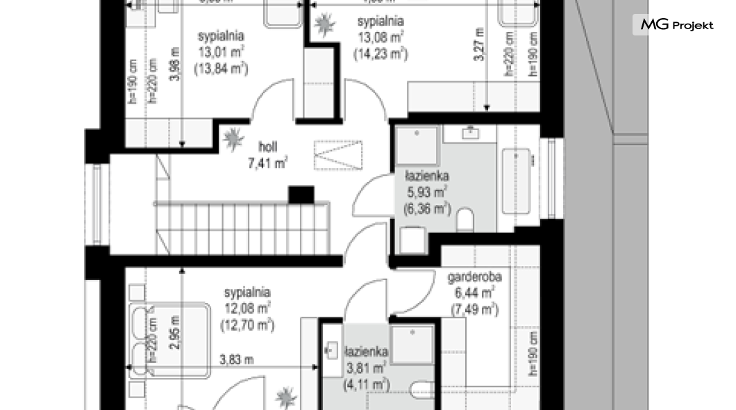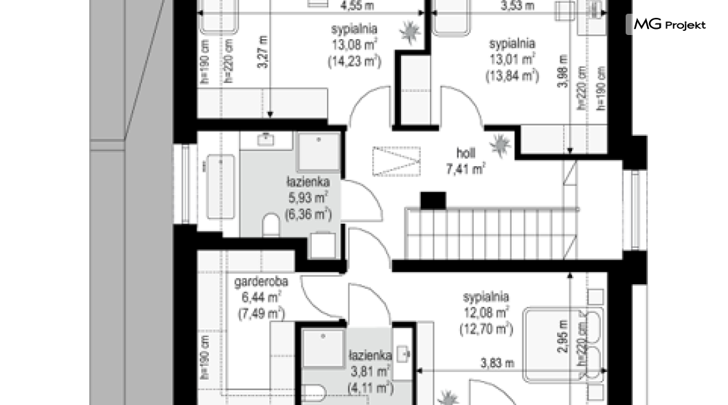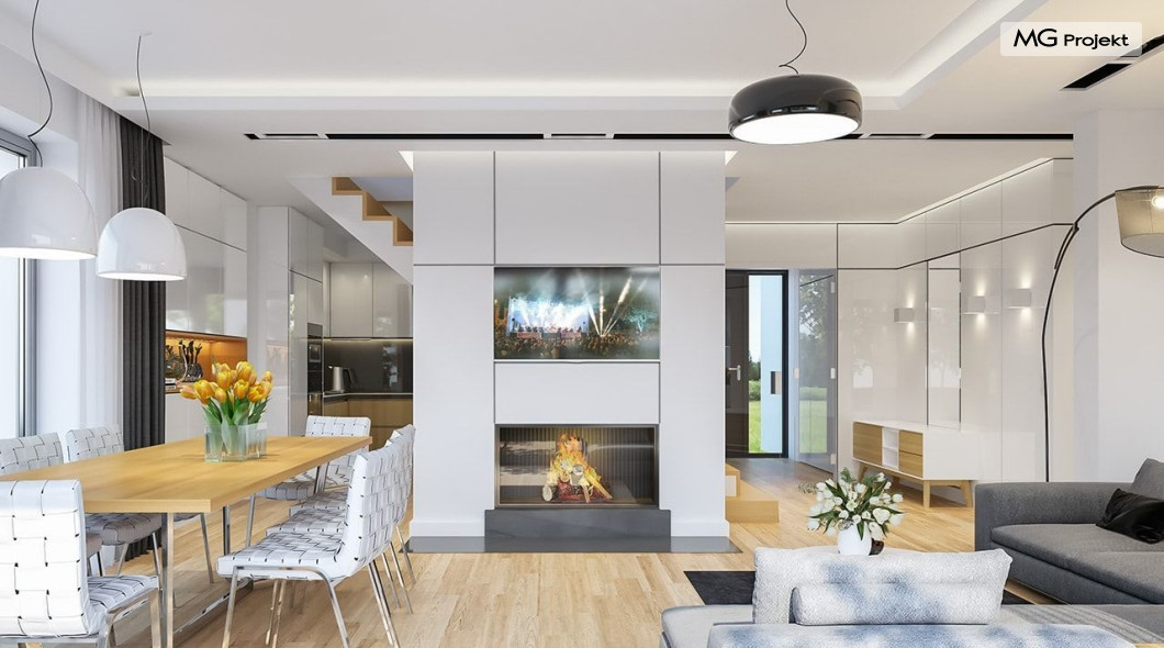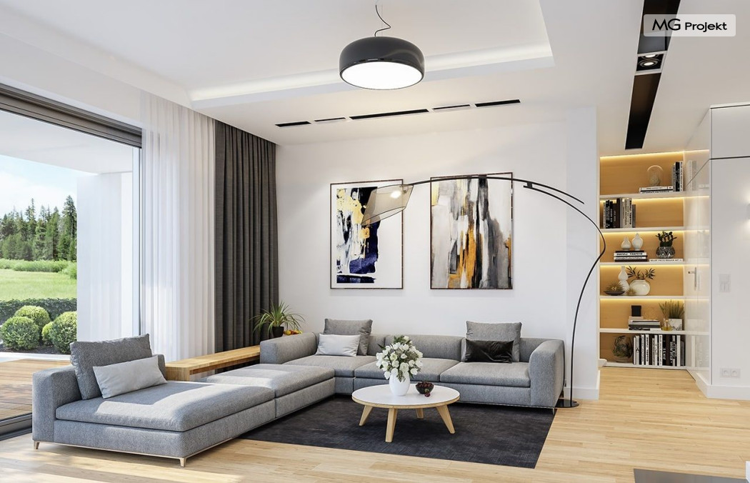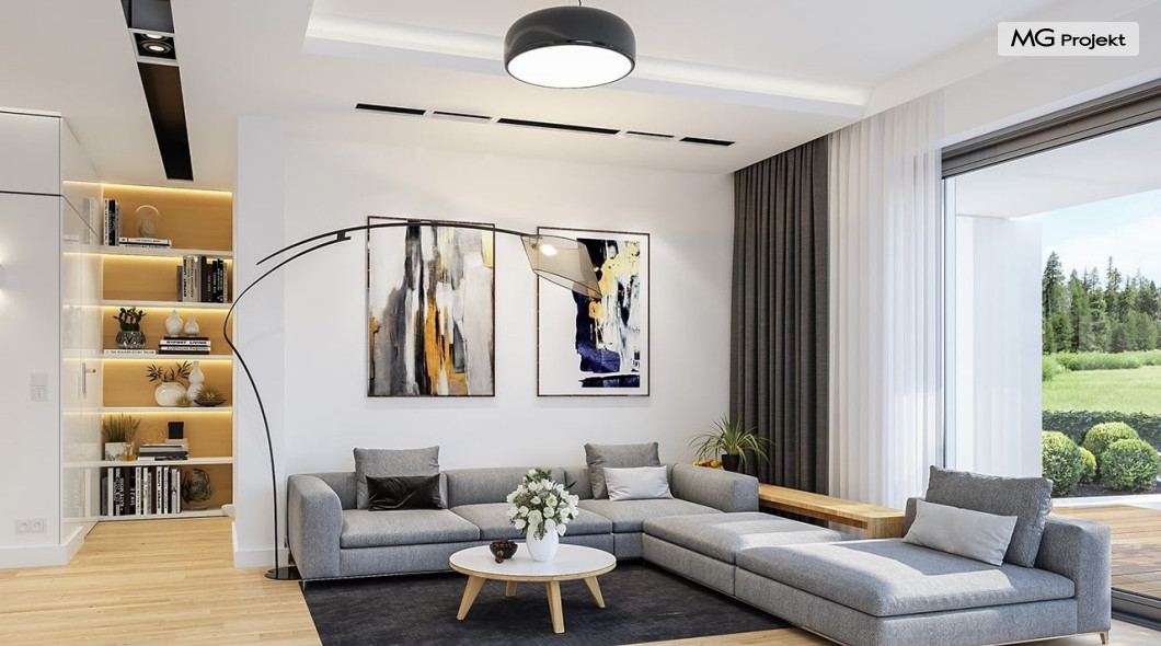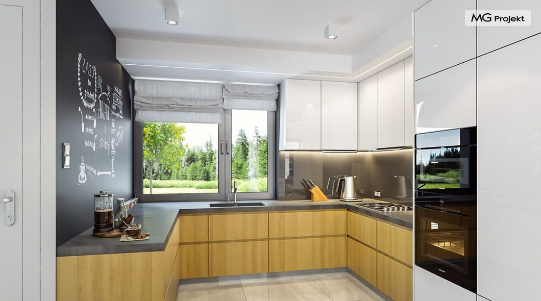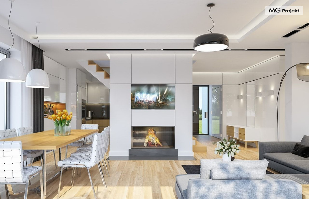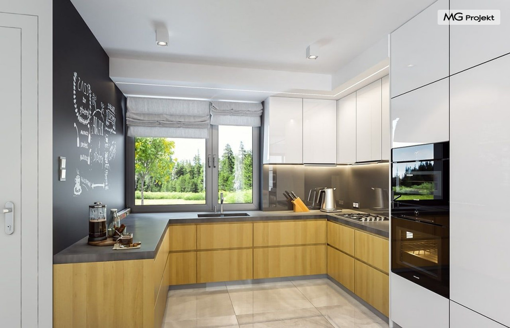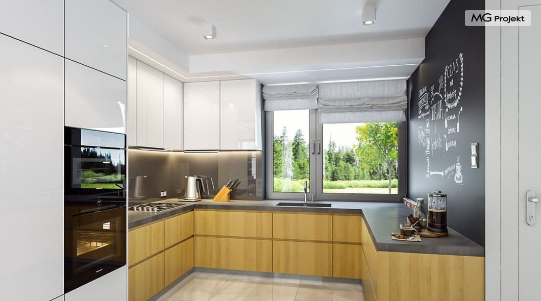 Projekt domu Oszust 2 jest wariantową wersją projektu Oszust - z mniejszą powierzchnią zabudowy, z pojedynczym garażem, oraz z węższą szerokością elewacji frontowej. Projekt jest propozycją dla Inwestorów chcących wybudować piętrowy dom, ale posiadających działkę, na której zapisy urbanistyczne wykluczają taką możliwość. Zatem projekt domu Oszust 2, choć wygląda prawie jak budynek piętrowy i ma górną kondygnację z pomieszczeniami praktycznie bez skosów, jest formalnie projektem domu z poddaszem użytkowym. Architektura domu Oszust 2 jest nowoczesna - łączą się tu w atrakcyjną całość duże przeszklenia, poziome pasy wykończeń elewacji w kontrastujących barwach, dobudowane parterowe bryły wystającego garażu i zadaszenia tarasu. Zwartą bryłę przykrywa czterospadowy dach. Dzięki różnicy w wysokości dachu, na piętrze mieszczą się normalne duże okna doświetlające pokoje górnej kondygnacji. Wnętrze domu : do domu wchodzimy przez wygodny przedsionek do holu i do jednoprzestrzennej części dziennej z wyeksponowaną na środku salonu ścianą kominkowo – telewizyjną, ze schodami na piętro w tle. Od frontu mamy wygodną kuchnię ze spiżarnią, a od ogrodu dodatkowy pokój – gabinet i wc. Z sieni przechodzimy też do garażu i kotłowni. Duże przeszklenia salonu otwierają wnętrze domu na zadaszony taras i otaczający ogród. Na górze mamy oddzielny apartament rodziców z własną łazienką i garderobą, oraz dwie sypialnie dziecięce z ogólną łazienką. Na poddaszu niemal na całej powierzchni uzyskano wysokość stania - nie ma tu skosów utrudniających poruszanie się. Projekt domu Oszust 2 mimo w sumie niedużej powierzchni użytkowej mieści w sobie cały potrzebny program funkcjonalny do w pełni komfortowego życia kilkuosobowej rodziny. Dom zaprojektowano z nowoczesnych i energooszczędnych materiałów. Będzie tani w eksploatacji, a jednocześnie niedrogi i nietrudny w budowie. Zapraszamy do zapoznania się z pełną ofertą pracowni MG Projekt: https://www.mgprojekt.com.pl/oszust, https://www.mgprojekt.com.pl/oszust-wariant-b, https://www.mgprojekt.com.pl/oszust-2.
