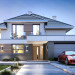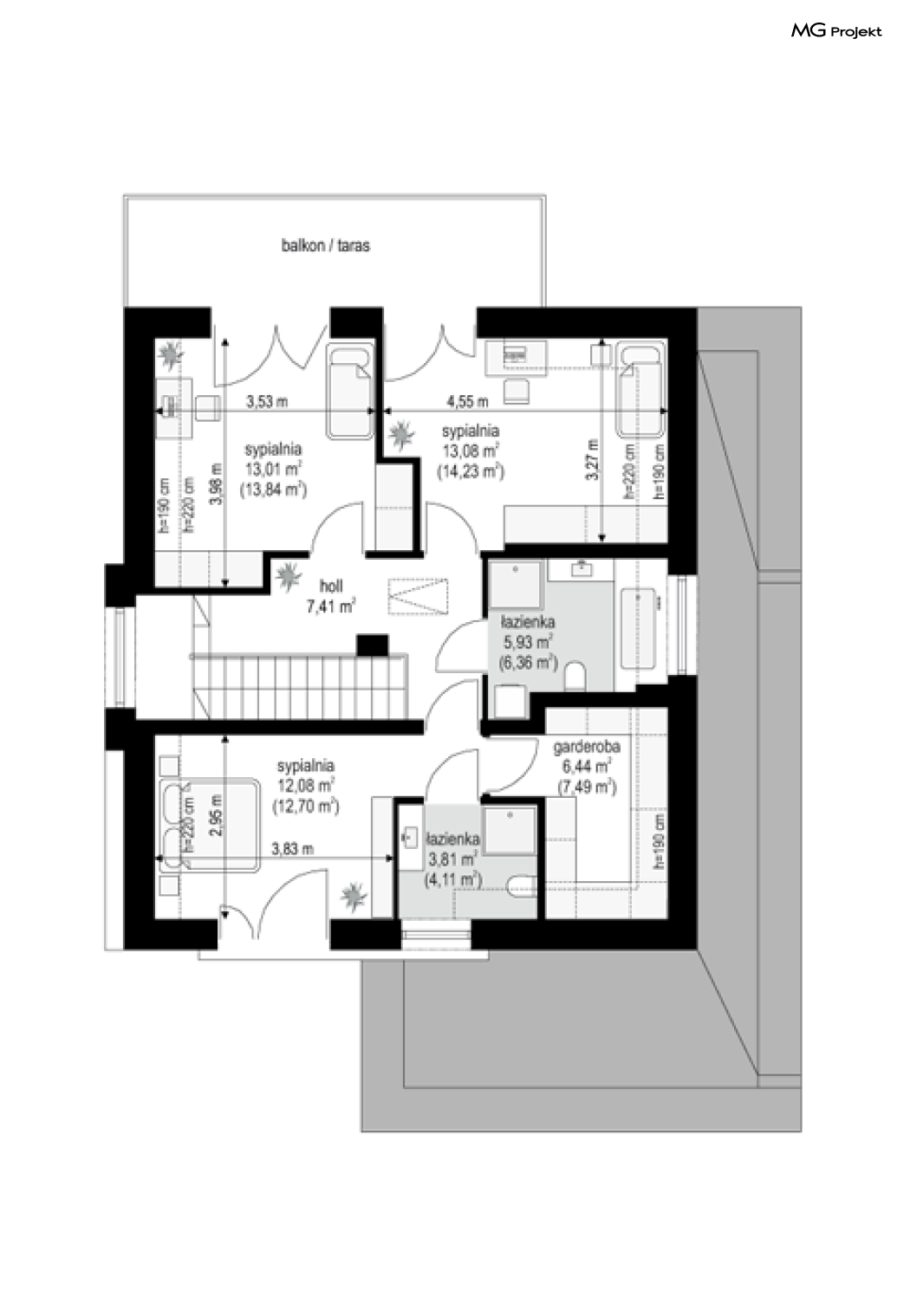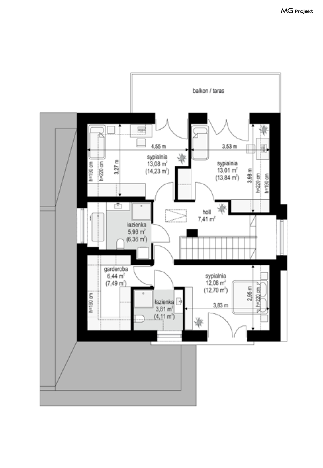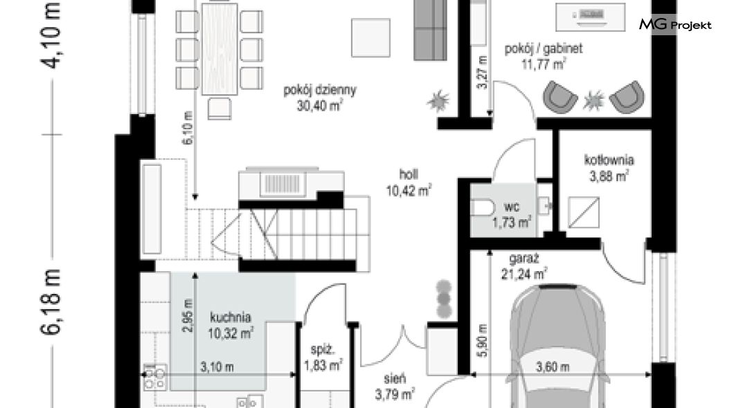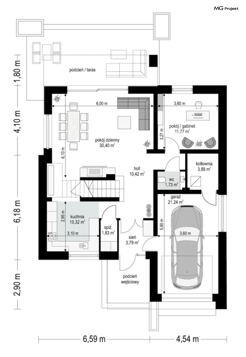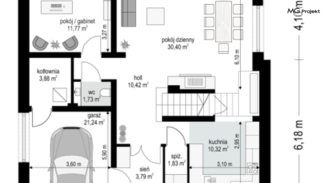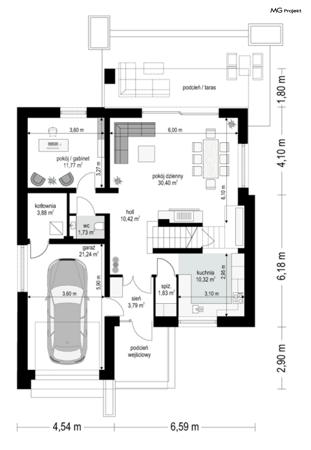 Projekt domu Oszust 2 jest wariantową wersją projektu Oszust - z mniejszą powierzchnią zabudowy, z pojedynczym garażem, oraz z węższą szerokością elewacji frontowej. Projekt jest propozycją dla Inwestorów chcących wybudować piętrowy dom, ale posiadających działkę, na której zapisy urbanistyczne wykluczają taką możliwość. Zatem projekt domu Oszust 2, choć wygląda prawie jak budynek piętrowy i ma górną kondygnację z pomieszczeniami praktycznie bez skosów, jest formalnie projektem domu z poddaszem użytkowym. Architektura domu Oszust 2 jest nowoczesna - łączą się tu w atrakcyjną całość duże przeszklenia, poziome pasy wykończeń elewacji w kontrastujących barwach, dobudowane parterowe bryły wystającego garażu i zadaszenia tarasu. Zwartą bryłę przykrywa czterospadowy dach. Dzięki różnicy w wysokości dachu, na piętrze mieszczą się normalne duże okna doświetlające pokoje górnej kondygnacji. Wnętrze domu : do domu wchodzimy przez wygodny przedsionek do holu i do jednoprzestrzennej części dziennej z wyeksponowaną na środku salonu ścianą kominkowo – telewizyjną, ze schodami na piętro w tle. Od frontu mamy wygodną kuchnię ze spiżarnią, a od ogrodu dodatkowy pokój – gabinet i wc. Z sieni przechodzimy też do garażu i kotłowni. Duże przeszklenia salonu otwierają wnętrze domu na zadaszony taras i otaczający ogród. Na górze mamy oddzielny apartament rodziców z własną łazienką i garderobą, oraz dwie sypialnie dziecięce z ogólną łazienką. Na poddaszu niemal na całej powierzchni uzyskano wysokość stania - nie ma tu skosów utrudniających poruszanie się. Projekt domu Oszust 2 mimo w sumie niedużej powierzchni użytkowej mieści w sobie cały potrzebny program funkcjonalny do w pełni komfortowego życia kilkuosobowej rodziny. Dom zaprojektowano z nowoczesnych i energooszczędnych materiałów. Będzie tani w eksploatacji, a jednocześnie niedrogi i nietrudny w budowie. Zapraszamy do zapoznania się z pełną ofertą pracowni MG Projekt: https://www.mgprojekt.com.pl/oszust, https://www.mgprojekt.com.pl/oszust-wariant-b, https://www.mgprojekt.com.pl/oszust-2.