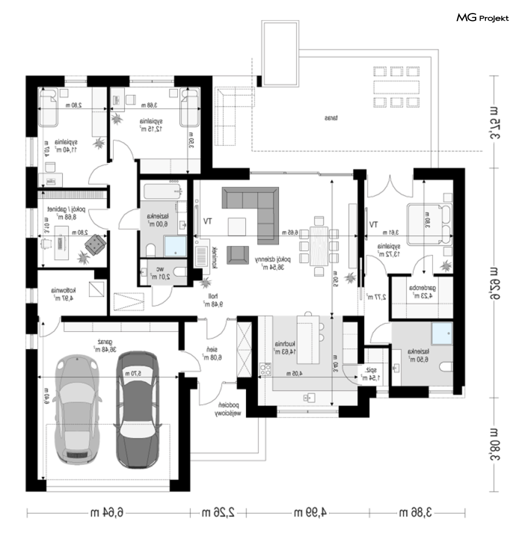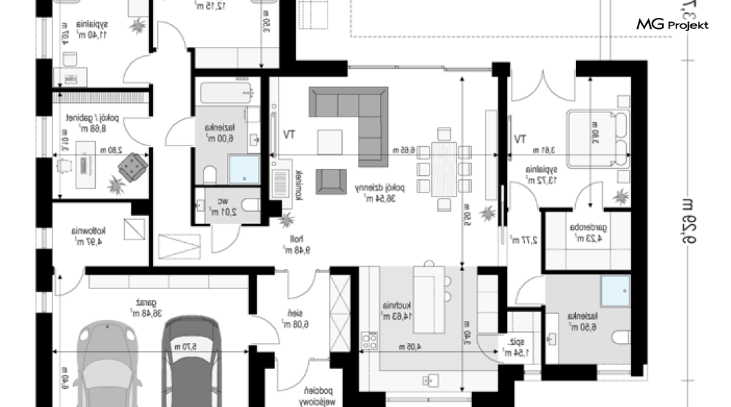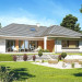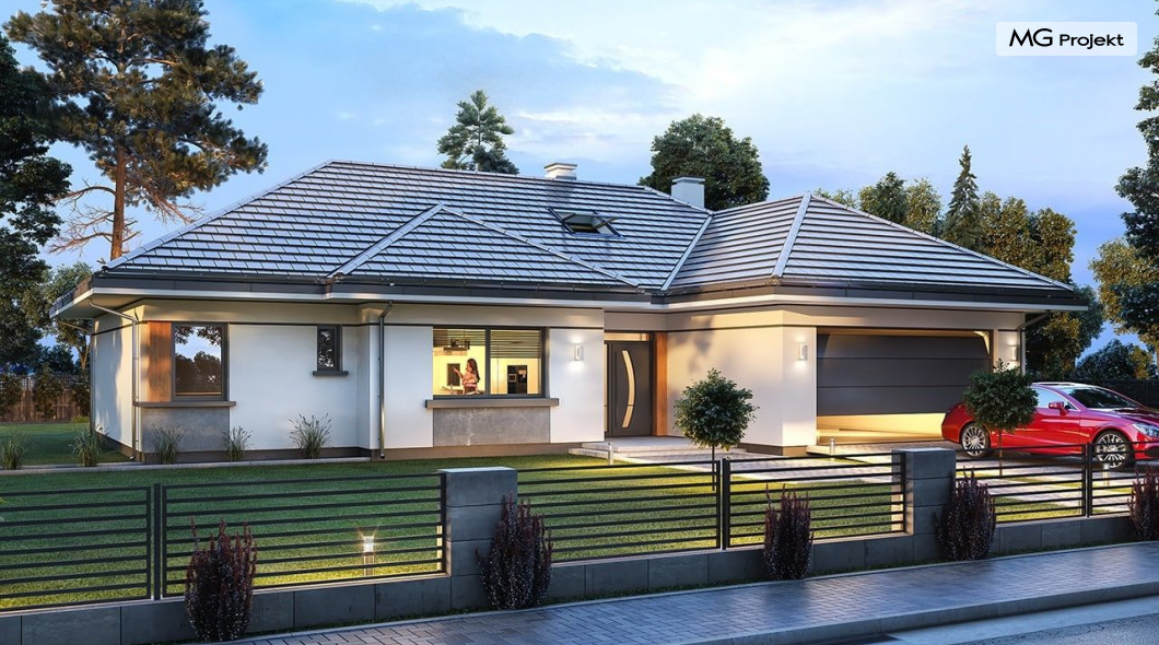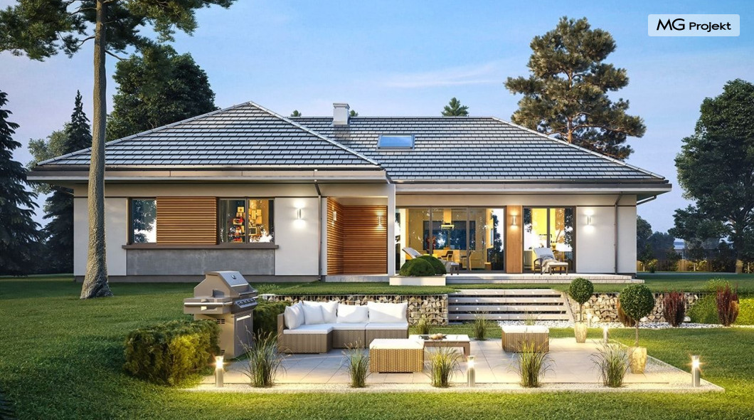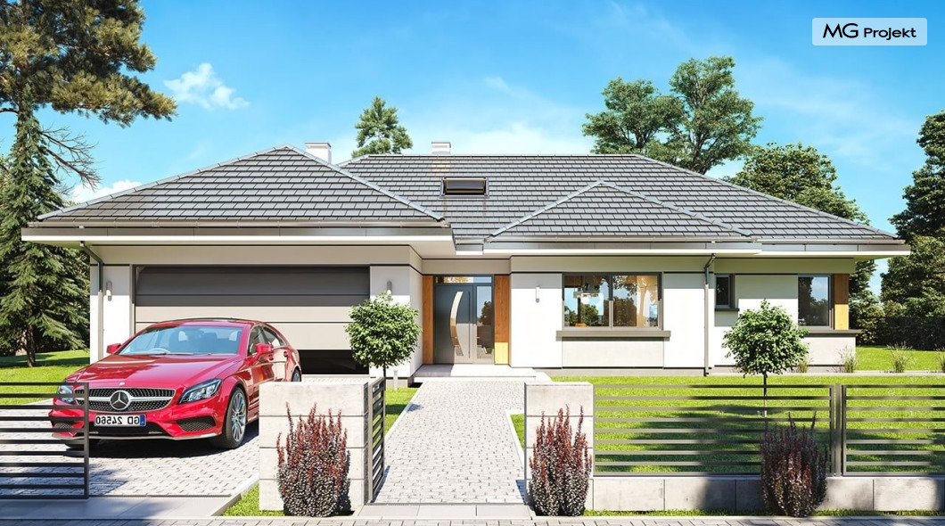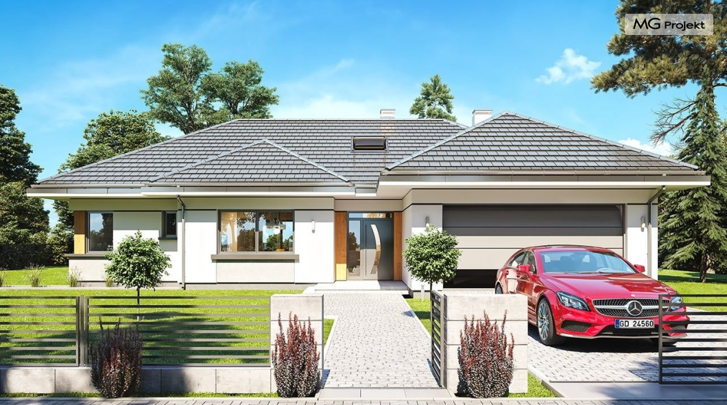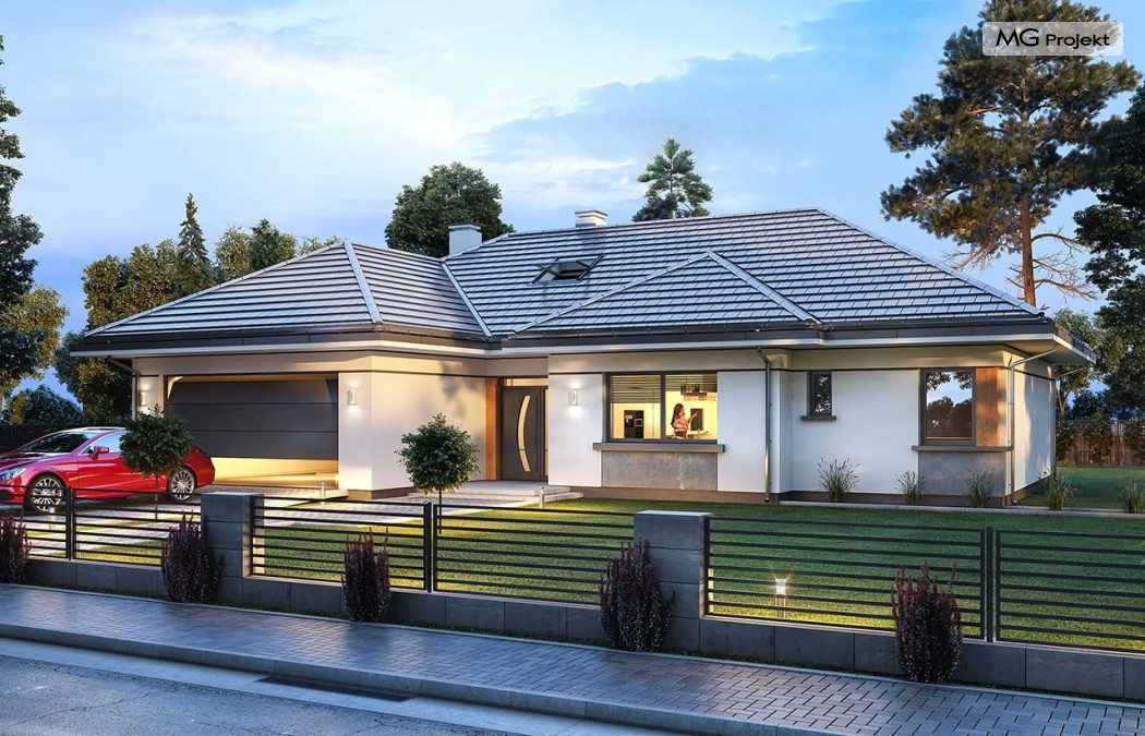 Projekt domu Willa parterowa 2 jest nieco mniejszą wersją projektu „Willa parterowa”, idealny dla Inwestorów zamierzających budować dom o powierzchni użytkowej do 140 m2 + garaż. Projekt jest przeznaczony dla 4-5 osobowej rodziny. Dom jest parterowy, zbudowany na planie litery T, przykryty czterospadowym dachem, z dobudówkami nad garażem i sypialniami. Architektura budynku jest nowoczesna, a zarazem powściągliwa w formie i logiczna. Poziomy podział elewacji oraz duże przeszklenia, połączone z wstawkami z kontrastującego tynku i okładzinami drewnianymi (lub imitującymi drewno) uatrakcyjniają sylwetkę domu. Do wnętrza wchodzimy pięknymi drzwiami wejściowymi z naświetlem - do przedsionka i od razu do centralnej części dziennej z salonem i kuchnią, a stamtąd na boki do części osobnej rodziców, oraz części z sypialniami dziecięcymi. Salon ze ścianą kominkowo – telewizyjną, miejscem na wygodny wypoczynek oraz dużym stołem jadalnym połączony jest przestrzennie z kuchnią z wyspą i spiżarnią. Salon doświetlony jest zarówno od strony ogrodu - szerokimi przeszklonymi drzwiami na taras, jak i pośrednio od frontu domu - przez duże okno kuchenne. Z boku części dziennej mamy apartament rodziców, z sypialnią z wyjściem na taras, oraz łazienką i garderobą. Z drugiej strony domu mamy trzy pokoje - sypialnie dziecięce i łazienkę. Z przedsionka przedostajemy się do dwustanowiskowego garażu i do kotłowni. Plan domu jest bardzo prosty i logiczny, a jednocześnie oryginalny, przełamujący utarty schemat wnętrza. Nad parterem znajduje się strych nieużytkowy, który można oczywiście zaadaptować na dodatkową powierzchnię użytkową po niewielkich modyfikacjach. Projekt domu Willa parterowa 2 jest świetną propozycją dla Inwestorów planujących budowę nowoczesnego, nie za dużego, ale komfortowego domu jednorodzinnego. Parterowego, w którym żyje się wygodnie na jednej kondygnacji, mając bezpośredni kontakt z ogrodem, otoczeniem, tarasami. Budynek ma prostą konstrukcję, jest energooszczędny. Będzie łatwy w budowie i niedrogi w późniejszej eksploatacji. Zapraszamy !